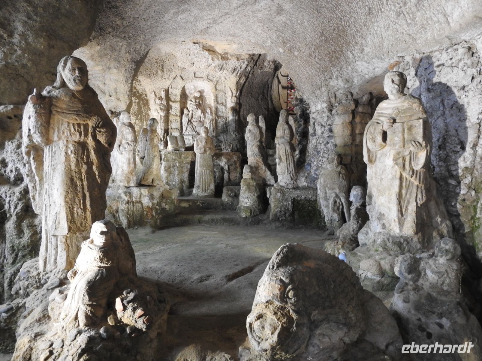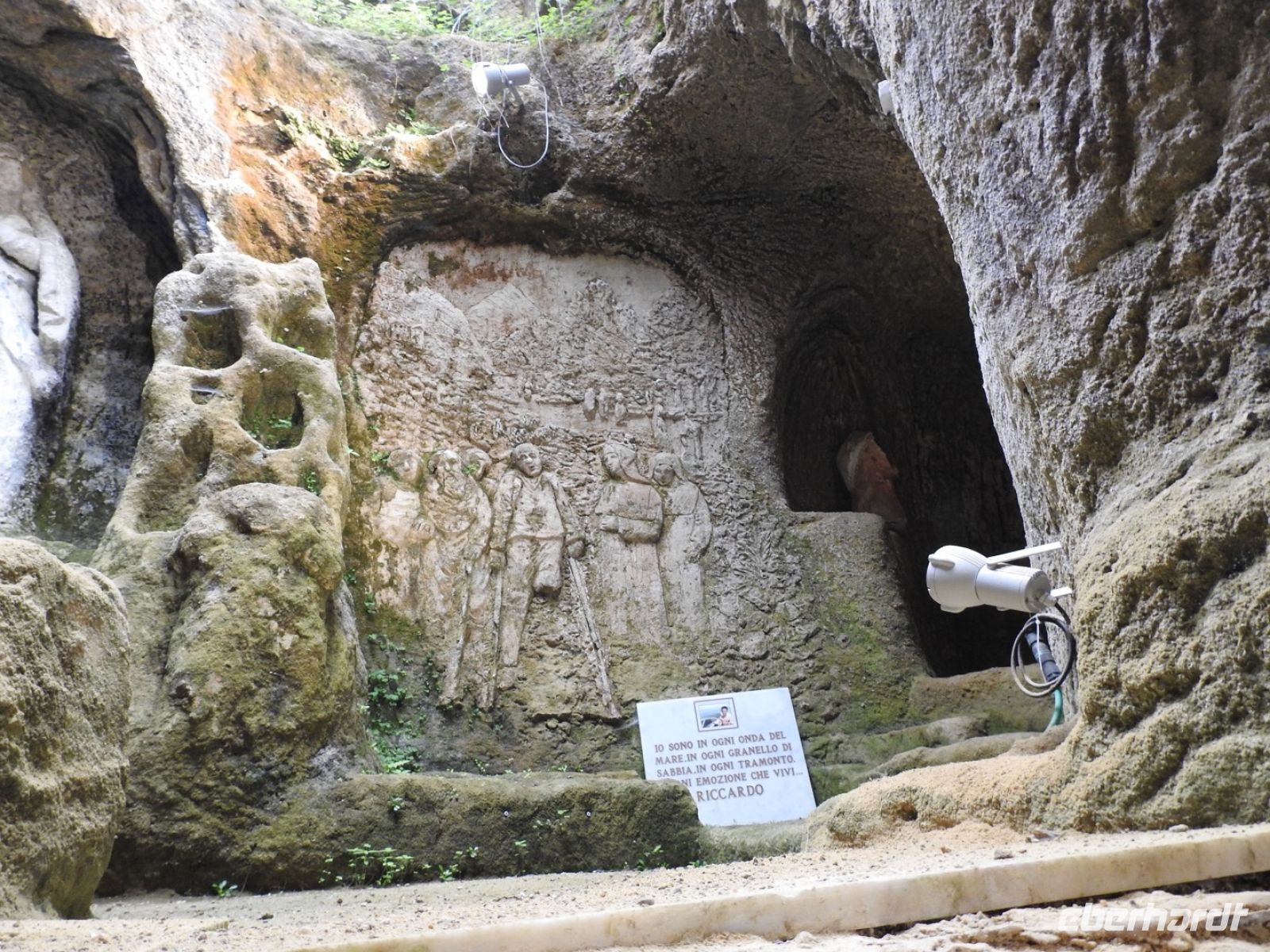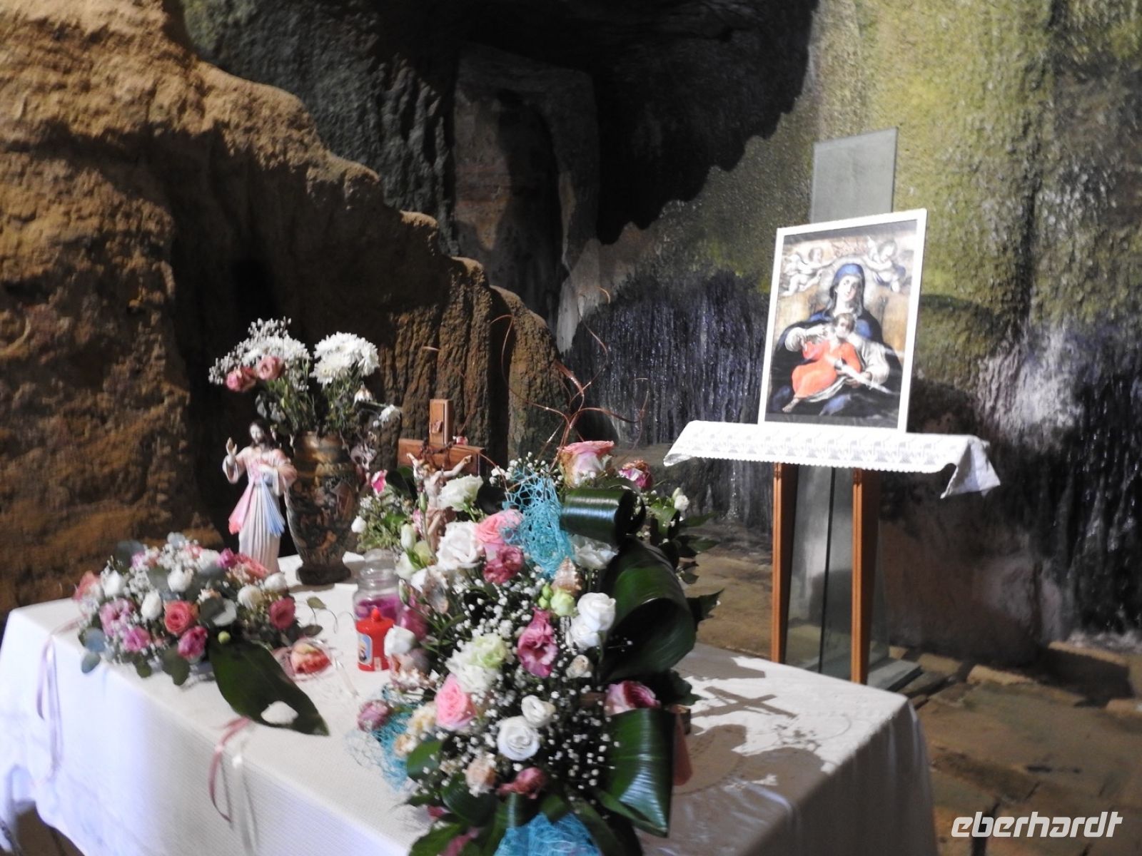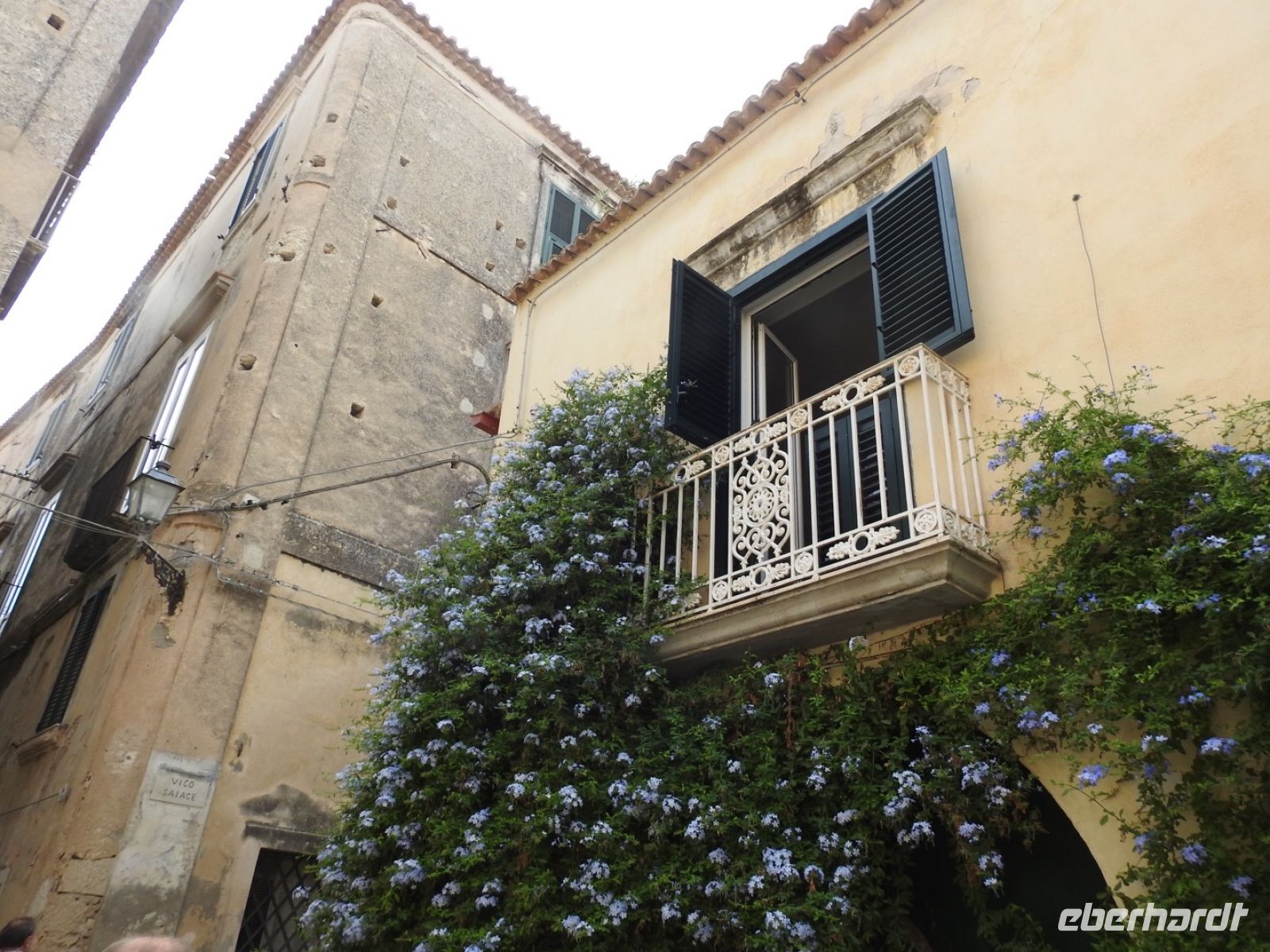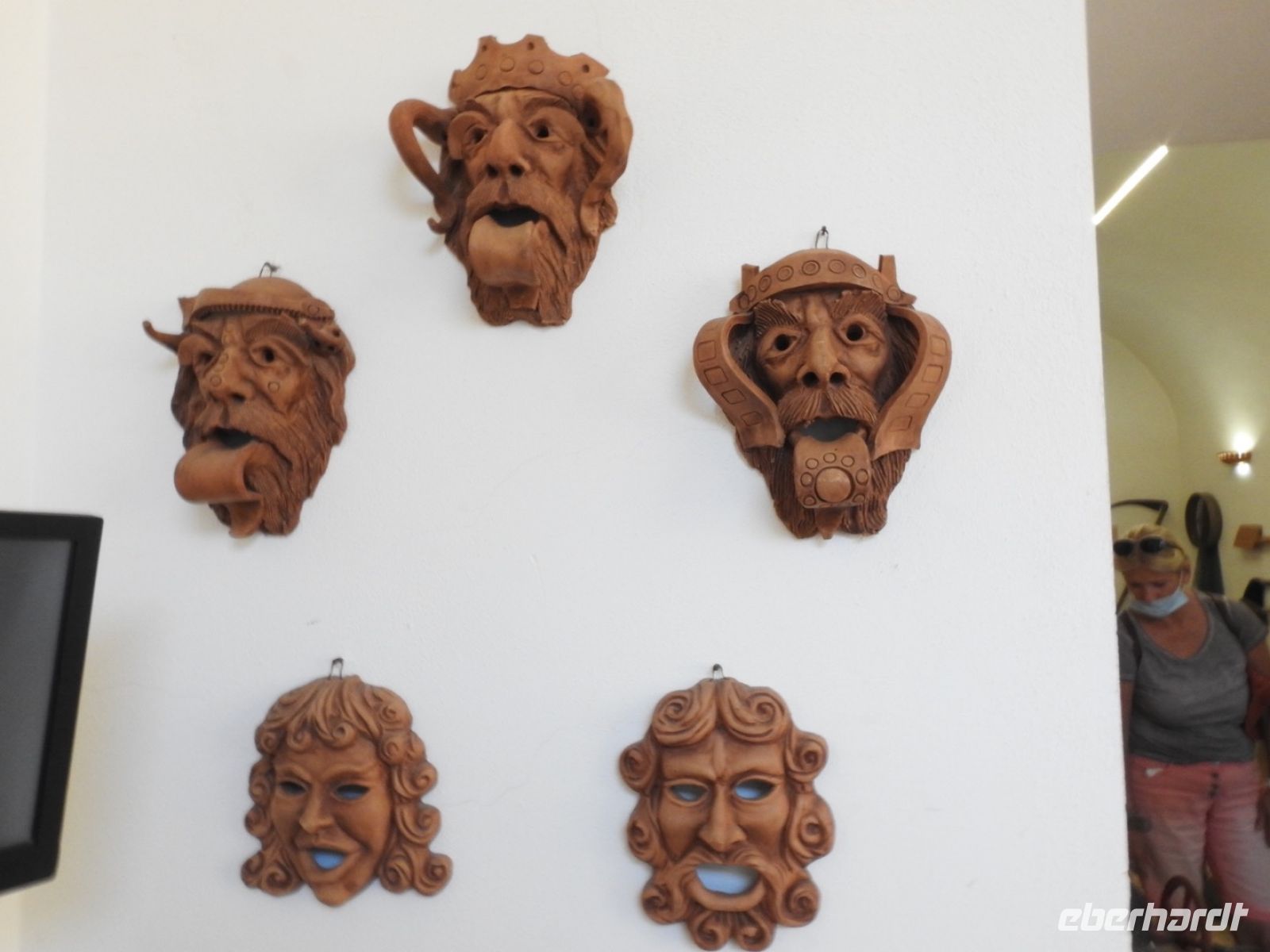 Nachdem geklärt ist, wohin uns der Shuttlebus bringen muss, lernen wir unsere örtliche Reiseleiterin Nadia und unseren Busfahrer kennen. Nadia erklärt uns anschaulich an einem Souvenirhandtuch wo wir uns befinden, dann versuchen wir einen Blick auf Sizilien zu erhaschen. Aber es ist zu dunstig. Die Küste der Götter zeigt sich uns nicht von ihrer strahlenden Seite. Am Capo Vaticano ist die Aussicht auf das türkisblaue Meer schon besser. Früher gab es hier ein Orakel, das von vielen Seefahrern besucht wurde. Daher stammt der Name: Kap der Prophezeiung. In Tropea kommen wir gleich an einem Laden vorbei, der die hier begehrte Ware, süße rote Zwiebeln, anbietet. Doch zunächst schauen wir nur. Ein Spaziergang führt uns zu den verschiedenen Balkonen, die die Stadt so spektakulär machen. Überall haben wir eine prächtige Aussicht auf das Meer und den weißen Sandstrand. Am schönsten ist der Blick auf die Wallfahrtskirche Santa Maria dell‘ Isola, die sich in strahlendem Weiß auf einem Sandsteinfelsen präsentiert. Unser Weg führt uns vorbei an ehemaligen Adelspalästen aus dem 15. Jahrhundert, manche sind noch bewohnt. Es gelingt uns, einen Blick in einen Innenhof zu werfen und das Adelswappen an der Decke zu bewundern. Gern hätten wir auch die Kathedrale besucht, jedoch bleibt dieser Besuch uns verwehrt, da gerade Gottesdienst stattfindet und Touristen nicht erwünscht sind. Nur klammheimlich können wir einen Blick auf die Bomben werfen, die am Eingang der Kathedrale befestigt sind. Grund ist, dass im 2. Weltkrieg sieben Bomben auf Tropea abgeworfen wurden, jedoch keine explodierte. Als Erinnerung daran, wurden zwei der Bomben in der Kathedrale angebracht. Wir haben nun eine Stunde Zeit, auf eigene Faust die Stadt zu erobern. Die verbringen wir mit Kaffee trinken und/oder einkaufen. Vor allem die verschiedenen Spaghettigewürze und die Njudawurst haben es uns angetan. Aber auch die italienischen Schuhläden und Bekleidungsgeschäfte laden zum Shoppen ein. Nach der Pause besuchen wir einen Laden, wo uns verschiedene Aufstriche, Wurst und Käse zum verkosten angeboten werden. Wir fahren weiter nach Pizzo, ein freundliches Städtchen, das auf einem Felsplateau hoch über dem Golf von Sant Eufemia thront. Wir besuchen das Castello, in dem der Schwager von Napoleon eingesperrt, zum Tode verurteilt und umgebracht wurde. Auf der Piazza della Repubblica kehren wir ein und Eberhardt Travel lädt uns auf einen Tartuffo ein. Das ist die Spezialität der Stadt - ein Eis mit flüssigem Schokoladenkern. Bei einer Präsentation können wir zusehen, wie die flüssige Schokolade in die Eiskugel kommt. Nach dieser Leckerei fahren wir zu einem Strand, an dem sich eine besonders sehenswerte Felsenkirche befindet. Ende des 18. Jahrhunderts gerieten neapolitanische Seeleute in Not. Nach ihrer glücklichen Rettung, errichteten sie diese Kirche. Zweihundert Jahre später entdeckte ein lokaler Künstler die Kirche für sich und schmückte sie mit Dutzenden Heiligenfiguren, die er mit einer Spitzhacke aus dem Sandstein schlug. So entstand ein wunderschönes Figurenensemble ganz versteckt in einer Grotte am Strand.