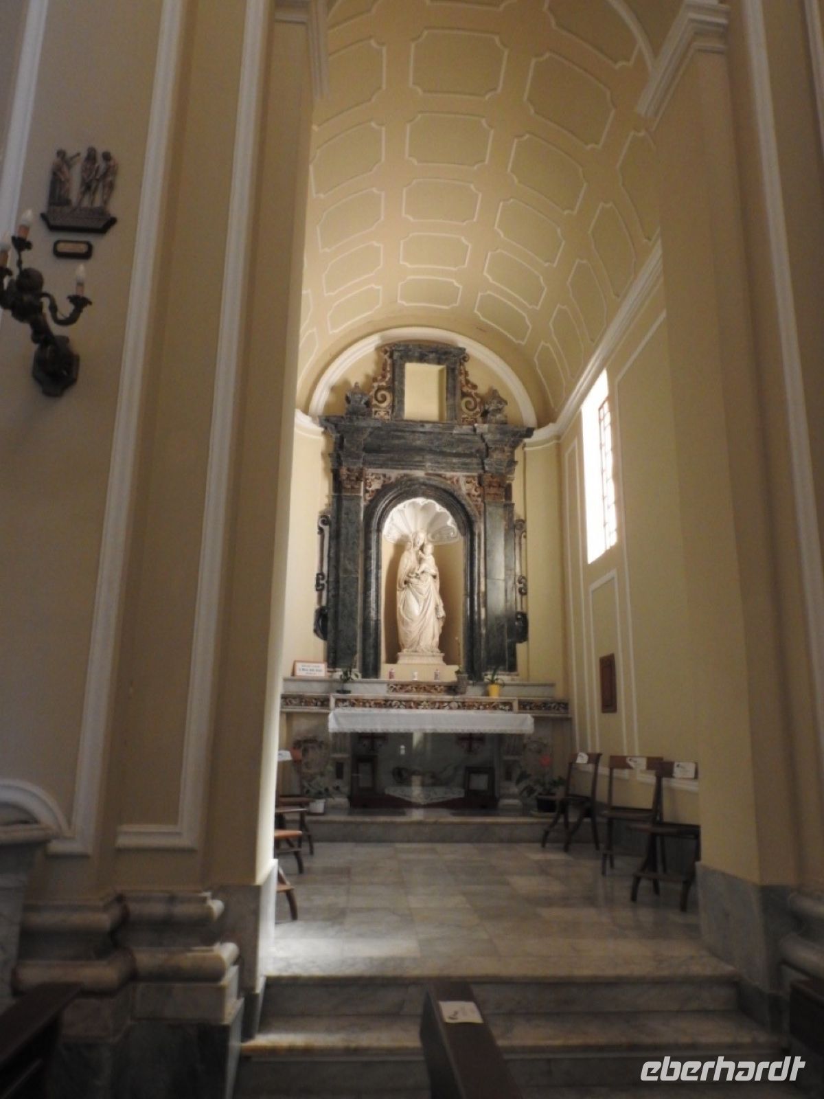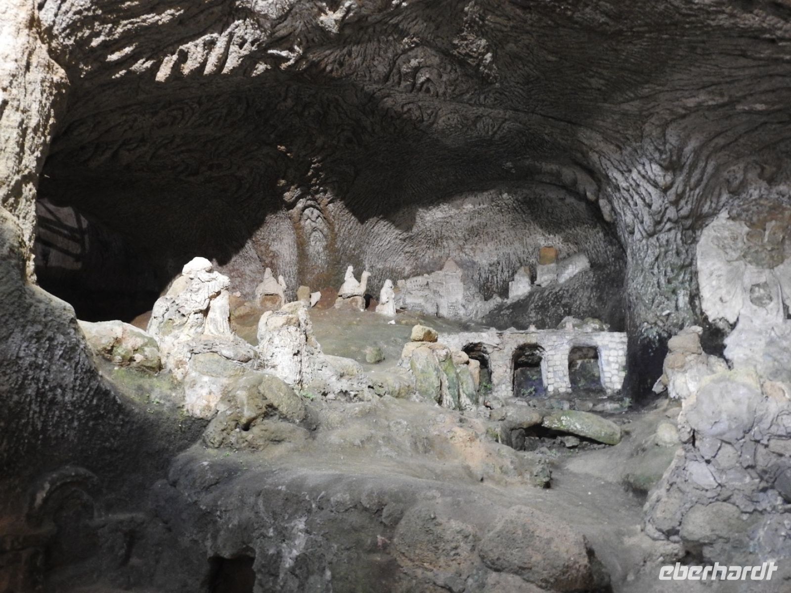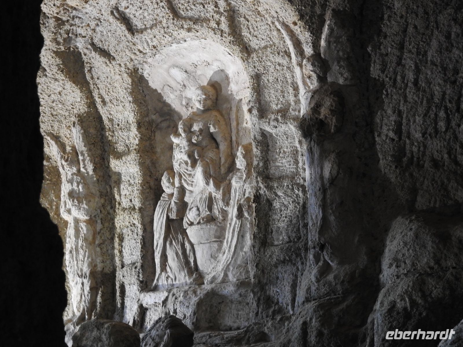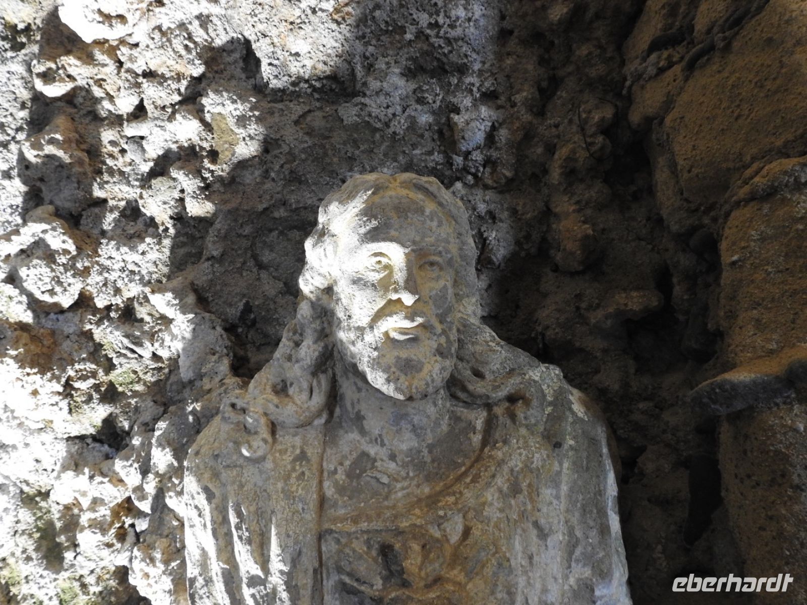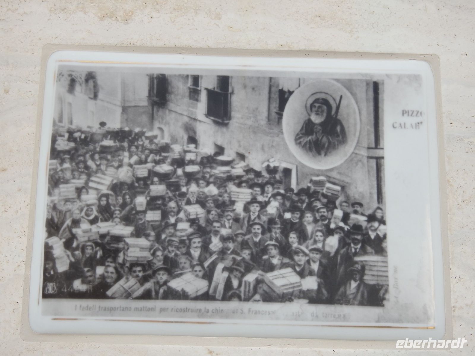 Nachdem geklärt ist, wohin uns der Shuttlebus bringen muss, lernen wir unsere örtliche Reiseleiterin Nadia und unseren Busfahrer kennen. Nadia erklärt uns anschaulich an einem Souvenirhandtuch wo wir uns befinden, dann versuchen wir einen Blick auf Sizilien zu erhaschen. Aber es ist zu dunstig. Die Küste der Götter zeigt sich uns nicht von ihrer strahlenden Seite. Am Capo Vaticano ist die Aussicht auf das türkisblaue Meer schon besser. Früher gab es hier ein Orakel, das von vielen Seefahrern besucht wurde. Daher stammt der Name: Kap der Prophezeiung. In Tropea kommen wir gleich an einem Laden vorbei, der die hier begehrte Ware, süße rote Zwiebeln, anbietet. Doch zunächst schauen wir nur. Ein Spaziergang führt uns zu den verschiedenen Balkonen, die die Stadt so spektakulär machen. Überall haben wir eine prächtige Aussicht auf das Meer und den weißen Sandstrand. Am schönsten ist der Blick auf die Wallfahrtskirche Santa Maria dell‘ Isola, die sich in strahlendem Weiß auf einem Sandsteinfelsen präsentiert. Unser Weg führt uns vorbei an ehemaligen Adelspalästen aus dem 15. Jahrhundert, manche sind noch bewohnt. Es gelingt uns, einen Blick in einen Innenhof zu werfen und das Adelswappen an der Decke zu bewundern. Gern hätten wir auch die Kathedrale besucht, jedoch bleibt dieser Besuch uns verwehrt, da gerade Gottesdienst stattfindet und Touristen nicht erwünscht sind. Nur klammheimlich können wir einen Blick auf die Bomben werfen, die am Eingang der Kathedrale befestigt sind. Grund ist, dass im 2. Weltkrieg sieben Bomben auf Tropea abgeworfen wurden, jedoch keine explodierte. Als Erinnerung daran, wurden zwei der Bomben in der Kathedrale angebracht. Wir haben nun eine Stunde Zeit, auf eigene Faust die Stadt zu erobern. Die verbringen wir mit Kaffee trinken und/oder einkaufen. Vor allem die verschiedenen Spaghettigewürze und die Njudawurst haben es uns angetan. Aber auch die italienischen Schuhläden und Bekleidungsgeschäfte laden zum Shoppen ein. Nach der Pause besuchen wir einen Laden, wo uns verschiedene Aufstriche, Wurst und Käse zum verkosten angeboten werden. Wir fahren weiter nach Pizzo, ein freundliches Städtchen, das auf einem Felsplateau hoch über dem Golf von Sant Eufemia thront. Wir besuchen das Castello, in dem der Schwager von Napoleon eingesperrt, zum Tode verurteilt und umgebracht wurde. Auf der Piazza della Repubblica kehren wir ein und Eberhardt Travel lädt uns auf einen Tartuffo ein. Das ist die Spezialität der Stadt - ein Eis mit flüssigem Schokoladenkern. Bei einer Präsentation können wir zusehen, wie die flüssige Schokolade in die Eiskugel kommt. Nach dieser Leckerei fahren wir zu einem Strand, an dem sich eine besonders sehenswerte Felsenkirche befindet. Ende des 18. Jahrhunderts gerieten neapolitanische Seeleute in Not. Nach ihrer glücklichen Rettung, errichteten sie diese Kirche. Zweihundert Jahre später entdeckte ein lokaler Künstler die Kirche für sich und schmückte sie mit Dutzenden Heiligenfiguren, die er mit einer Spitzhacke aus dem Sandstein schlug. So entstand ein wunderschönes Figurenensemble ganz versteckt in einer Grotte am Strand.
