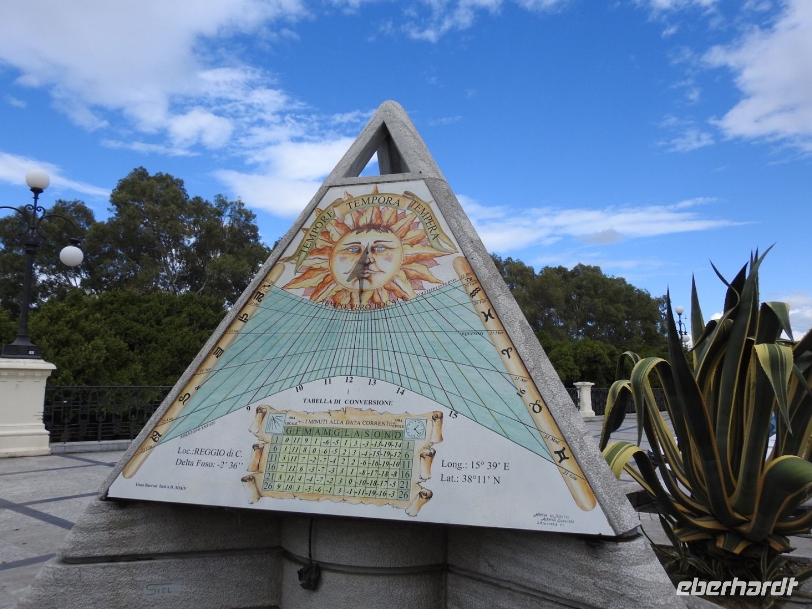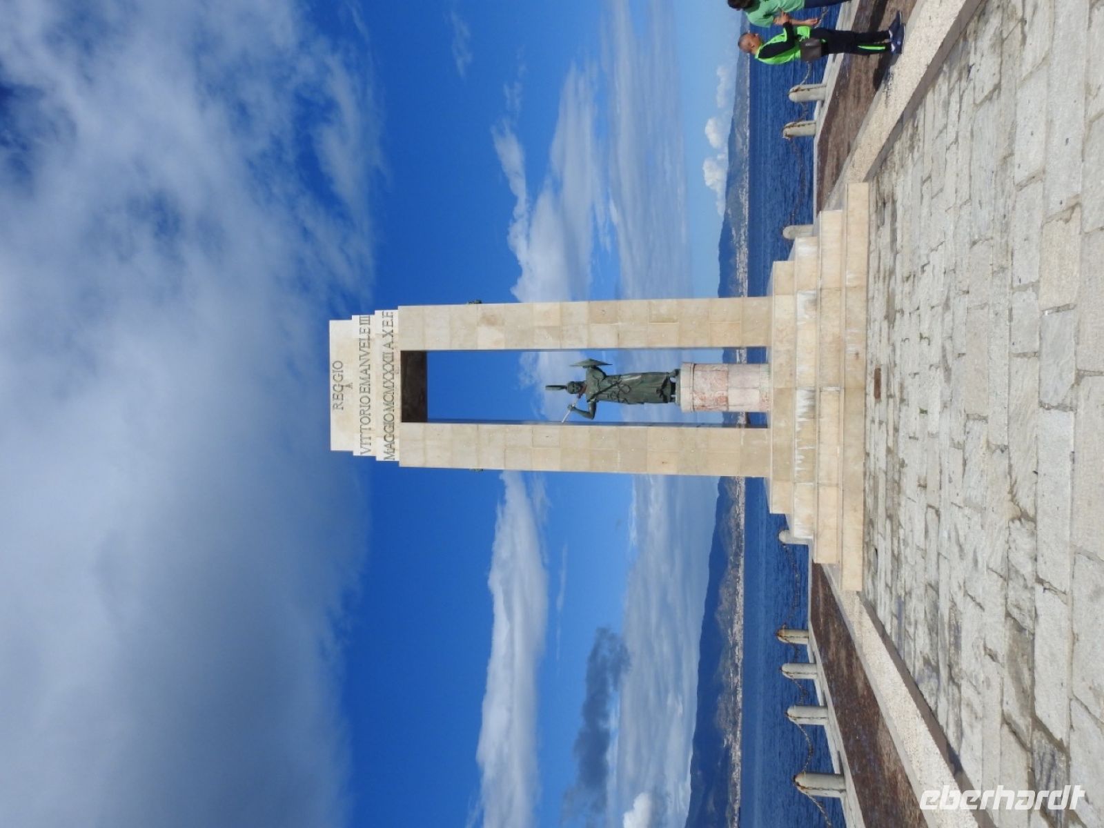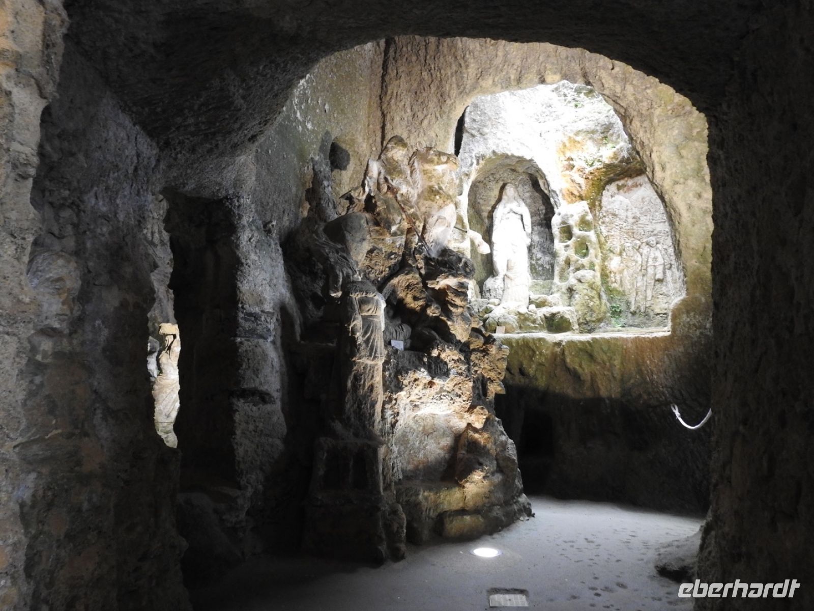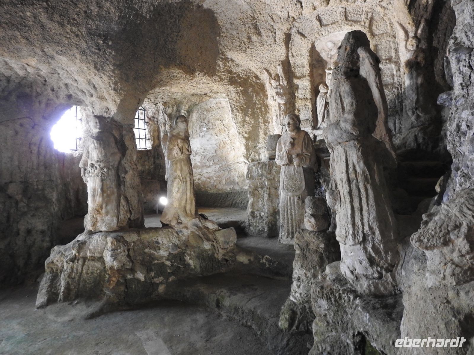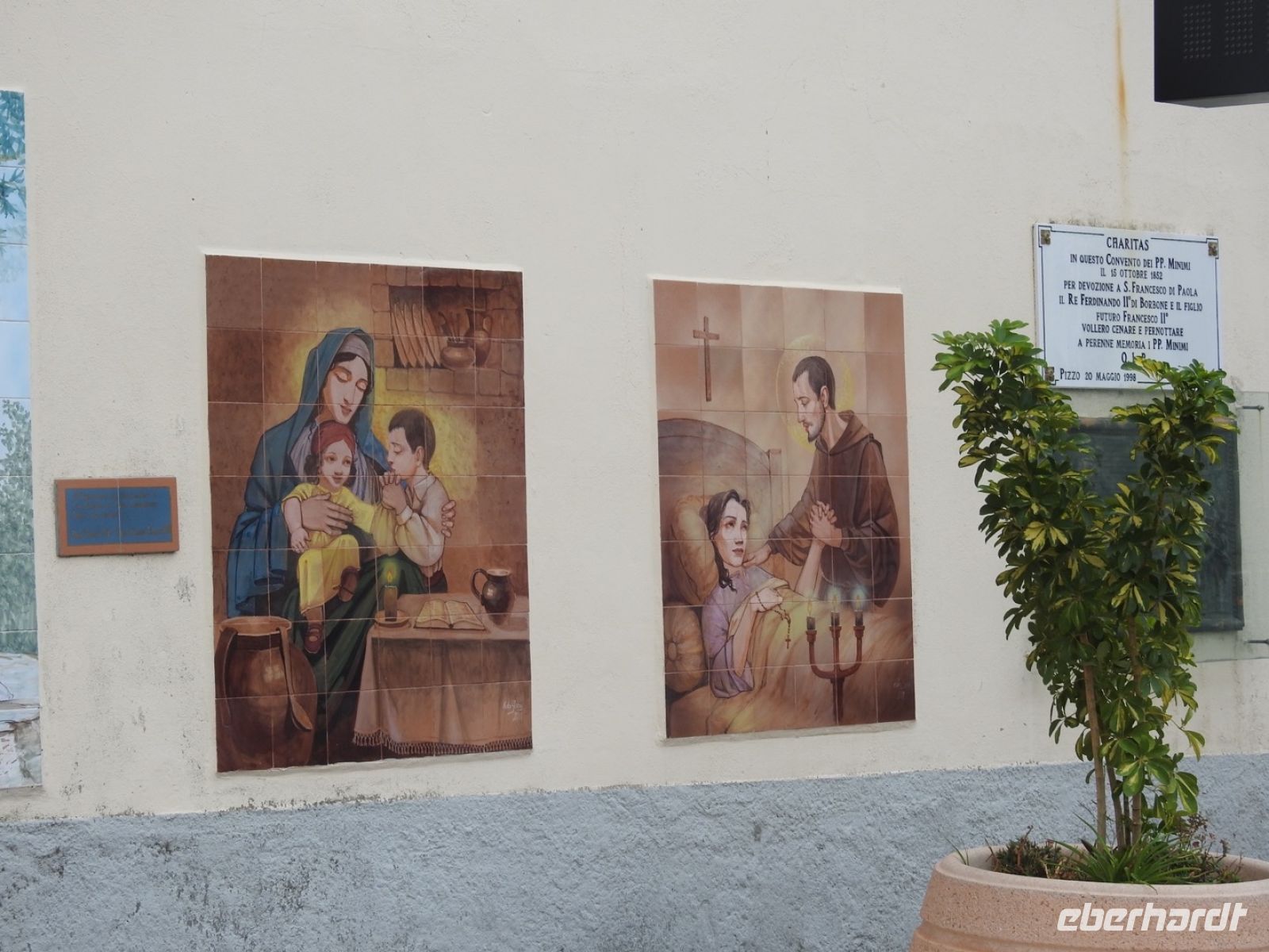 Nachdem geklärt ist, wohin uns der Shuttlebus bringen muss, lernen wir unsere örtliche Reiseleiterin Nadia und unseren Busfahrer kennen. Nadia erklärt uns anschaulich an einem Souvenirhandtuch wo wir uns befinden, dann versuchen wir einen Blick auf Sizilien zu erhaschen. Aber es ist zu dunstig. Die Küste der Götter zeigt sich uns nicht von ihrer strahlenden Seite. Am Capo Vaticano ist die Aussicht auf das türkisblaue Meer schon besser. Früher gab es hier ein Orakel, das von vielen Seefahrern besucht wurde. Daher stammt der Name: Kap der Prophezeiung. In Tropea kommen wir gleich an einem Laden vorbei, der die hier begehrte Ware, süße rote Zwiebeln, anbietet. Doch zunächst schauen wir nur. Ein Spaziergang führt uns zu den verschiedenen Balkonen, die die Stadt so spektakulär machen. Überall haben wir eine prächtige Aussicht auf das Meer und den weißen Sandstrand. Am schönsten ist der Blick auf die Wallfahrtskirche Santa Maria dell‘ Isola, die sich in strahlendem Weiß auf einem Sandsteinfelsen präsentiert. Unser Weg führt uns vorbei an ehemaligen Adelspalästen aus dem 15. Jahrhundert, manche sind noch bewohnt. Es gelingt uns, einen Blick in einen Innenhof zu werfen und das Adelswappen an der Decke zu bewundern. Gern hätten wir auch die Kathedrale besucht, jedoch bleibt dieser Besuch uns verwehrt, da gerade Gottesdienst stattfindet und Touristen nicht erwünscht sind. Nur klammheimlich können wir einen Blick auf die Bomben werfen, die am Eingang der Kathedrale befestigt sind. Grund ist, dass im 2. Weltkrieg sieben Bomben auf Tropea abgeworfen wurden, jedoch keine explodierte. Als Erinnerung daran, wurden zwei der Bomben in der Kathedrale angebracht. Wir haben nun eine Stunde Zeit, auf eigene Faust die Stadt zu erobern. Die verbringen wir mit Kaffee trinken und/oder einkaufen. Vor allem die verschiedenen Spaghettigewürze und die Njudawurst haben es uns angetan. Aber auch die italienischen Schuhläden und Bekleidungsgeschäfte laden zum Shoppen ein. Nach der Pause besuchen wir einen Laden, wo uns verschiedene Aufstriche, Wurst und Käse zum verkosten angeboten werden. Wir fahren weiter nach Pizzo, ein freundliches Städtchen, das auf einem Felsplateau hoch über dem Golf von Sant Eufemia thront. Wir besuchen das Castello, in dem der Schwager von Napoleon eingesperrt, zum Tode verurteilt und umgebracht wurde. Auf der Piazza della Repubblica kehren wir ein und Eberhardt Travel lädt uns auf einen Tartuffo ein. Das ist die Spezialität der Stadt - ein Eis mit flüssigem Schokoladenkern. Bei einer Präsentation können wir zusehen, wie die flüssige Schokolade in die Eiskugel kommt. Nach dieser Leckerei fahren wir zu einem Strand, an dem sich eine besonders sehenswerte Felsenkirche befindet. Ende des 18. Jahrhunderts gerieten neapolitanische Seeleute in Not. Nach ihrer glücklichen Rettung, errichteten sie diese Kirche. Zweihundert Jahre später entdeckte ein lokaler Künstler die Kirche für sich und schmückte sie mit Dutzenden Heiligenfiguren, die er mit einer Spitzhacke aus dem Sandstein schlug. So entstand ein wunderschönes Figurenensemble ganz versteckt in einer Grotte am Strand.