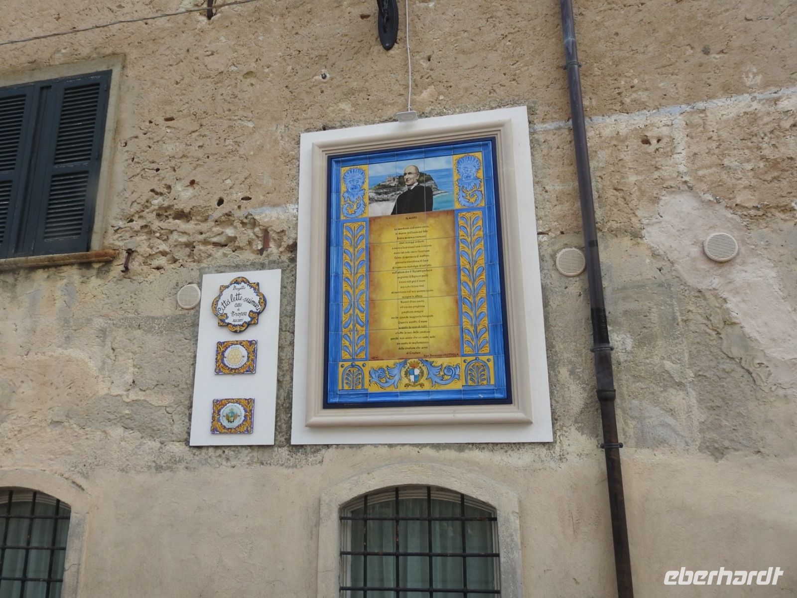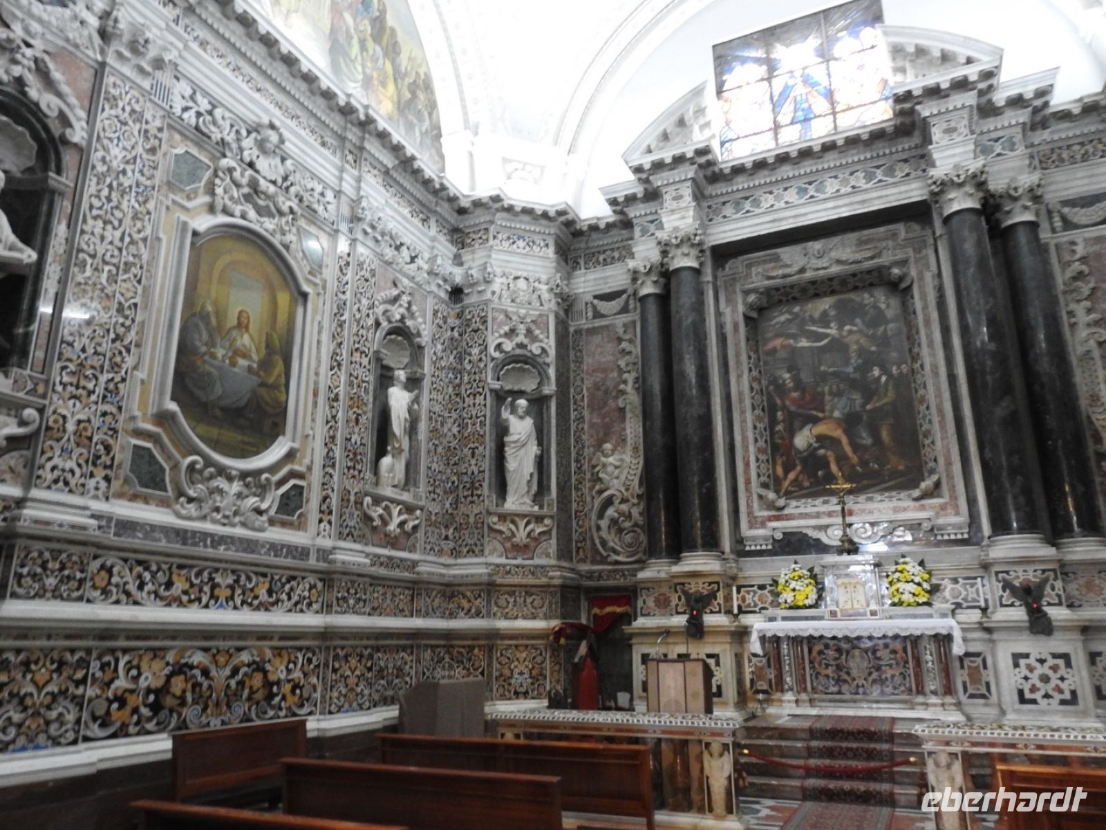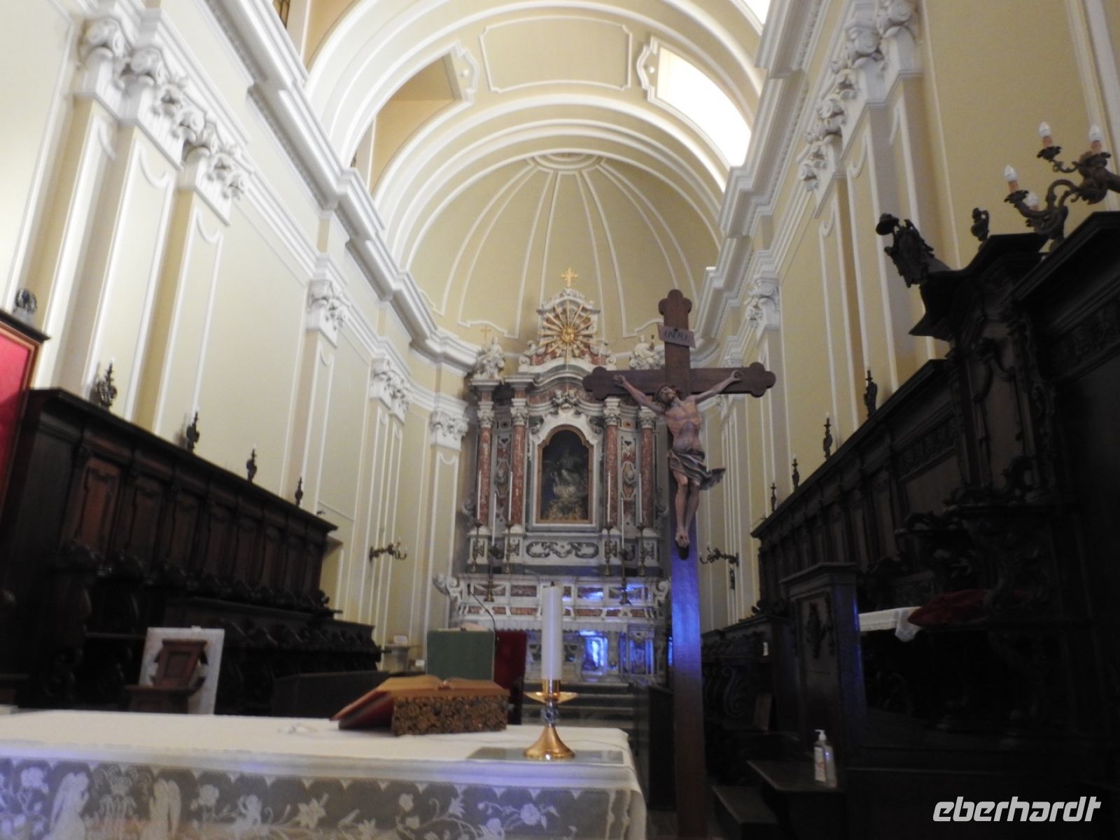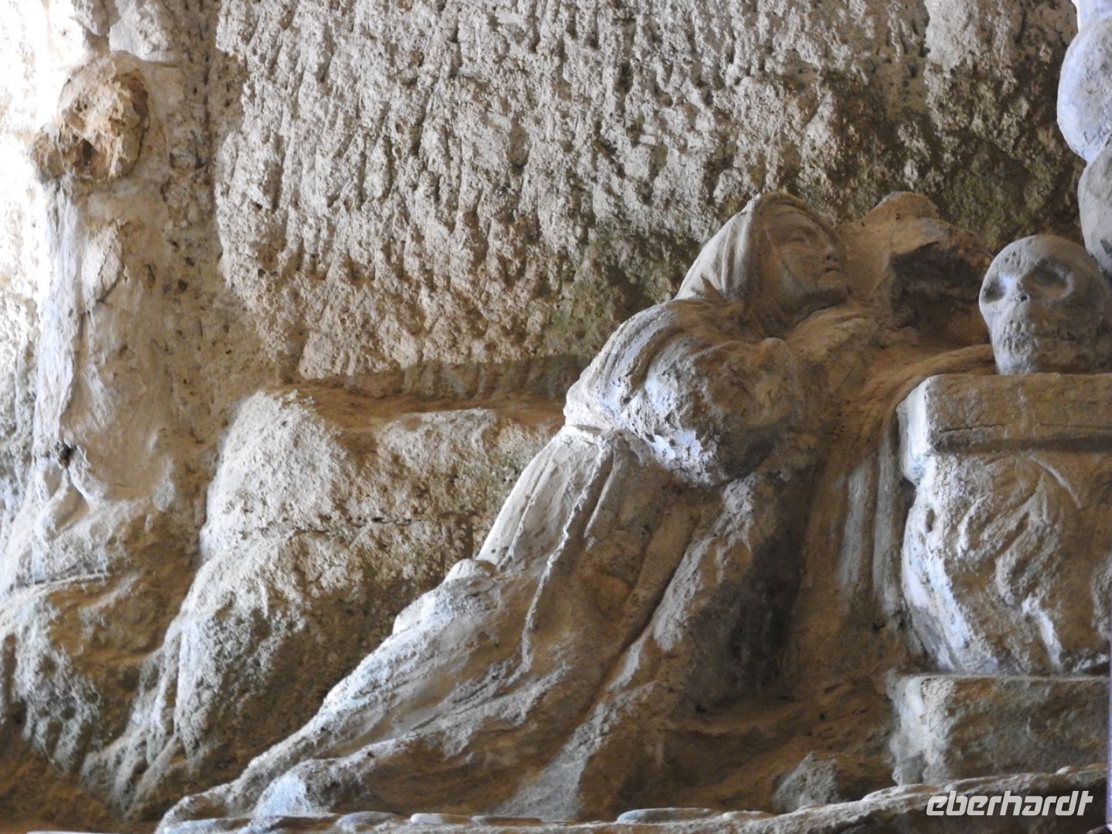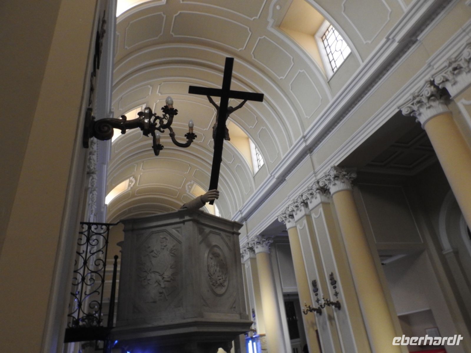 Nachdem geklärt ist, wohin uns der Shuttlebus bringen muss, lernen wir unsere örtliche Reiseleiterin Nadia und unseren Busfahrer kennen. Nadia erklärt uns anschaulich an einem Souvenirhandtuch wo wir uns befinden, dann versuchen wir einen Blick auf Sizilien zu erhaschen. Aber es ist zu dunstig. Die Küste der Götter zeigt sich uns nicht von ihrer strahlenden Seite. Am Capo Vaticano ist die Aussicht auf das türkisblaue Meer schon besser. Früher gab es hier ein Orakel, das von vielen Seefahrern besucht wurde. Daher stammt der Name: Kap der Prophezeiung. In Tropea kommen wir gleich an einem Laden vorbei, der die hier begehrte Ware, süße rote Zwiebeln, anbietet. Doch zunächst schauen wir nur. Ein Spaziergang führt uns zu den verschiedenen Balkonen, die die Stadt so spektakulär machen. Überall haben wir eine prächtige Aussicht auf das Meer und den weißen Sandstrand. Am schönsten ist der Blick auf die Wallfahrtskirche Santa Maria dell‘ Isola, die sich in strahlendem Weiß auf einem Sandsteinfelsen präsentiert. Unser Weg führt uns vorbei an ehemaligen Adelspalästen aus dem 15. Jahrhundert, manche sind noch bewohnt. Es gelingt uns, einen Blick in einen Innenhof zu werfen und das Adelswappen an der Decke zu bewundern. Gern hätten wir auch die Kathedrale besucht, jedoch bleibt dieser Besuch uns verwehrt, da gerade Gottesdienst stattfindet und Touristen nicht erwünscht sind. Nur klammheimlich können wir einen Blick auf die Bomben werfen, die am Eingang der Kathedrale befestigt sind. Grund ist, dass im 2. Weltkrieg sieben Bomben auf Tropea abgeworfen wurden, jedoch keine explodierte. Als Erinnerung daran, wurden zwei der Bomben in der Kathedrale angebracht. Wir haben nun eine Stunde Zeit, auf eigene Faust die Stadt zu erobern. Die verbringen wir mit Kaffee trinken und/oder einkaufen. Vor allem die verschiedenen Spaghettigewürze und die Njudawurst haben es uns angetan. Aber auch die italienischen Schuhläden und Bekleidungsgeschäfte laden zum Shoppen ein. Nach der Pause besuchen wir einen Laden, wo uns verschiedene Aufstriche, Wurst und Käse zum verkosten angeboten werden. Wir fahren weiter nach Pizzo, ein freundliches Städtchen, das auf einem Felsplateau hoch über dem Golf von Sant Eufemia thront. Wir besuchen das Castello, in dem der Schwager von Napoleon eingesperrt, zum Tode verurteilt und umgebracht wurde. Auf der Piazza della Repubblica kehren wir ein und Eberhardt Travel lädt uns auf einen Tartuffo ein. Das ist die Spezialität der Stadt - ein Eis mit flüssigem Schokoladenkern. Bei einer Präsentation können wir zusehen, wie die flüssige Schokolade in die Eiskugel kommt. Nach dieser Leckerei fahren wir zu einem Strand, an dem sich eine besonders sehenswerte Felsenkirche befindet. Ende des 18. Jahrhunderts gerieten neapolitanische Seeleute in Not. Nach ihrer glücklichen Rettung, errichteten sie diese Kirche. Zweihundert Jahre später entdeckte ein lokaler Künstler die Kirche für sich und schmückte sie mit Dutzenden Heiligenfiguren, die er mit einer Spitzhacke aus dem Sandstein schlug. So entstand ein wunderschönes Figurenensemble ganz versteckt in einer Grotte am Strand.