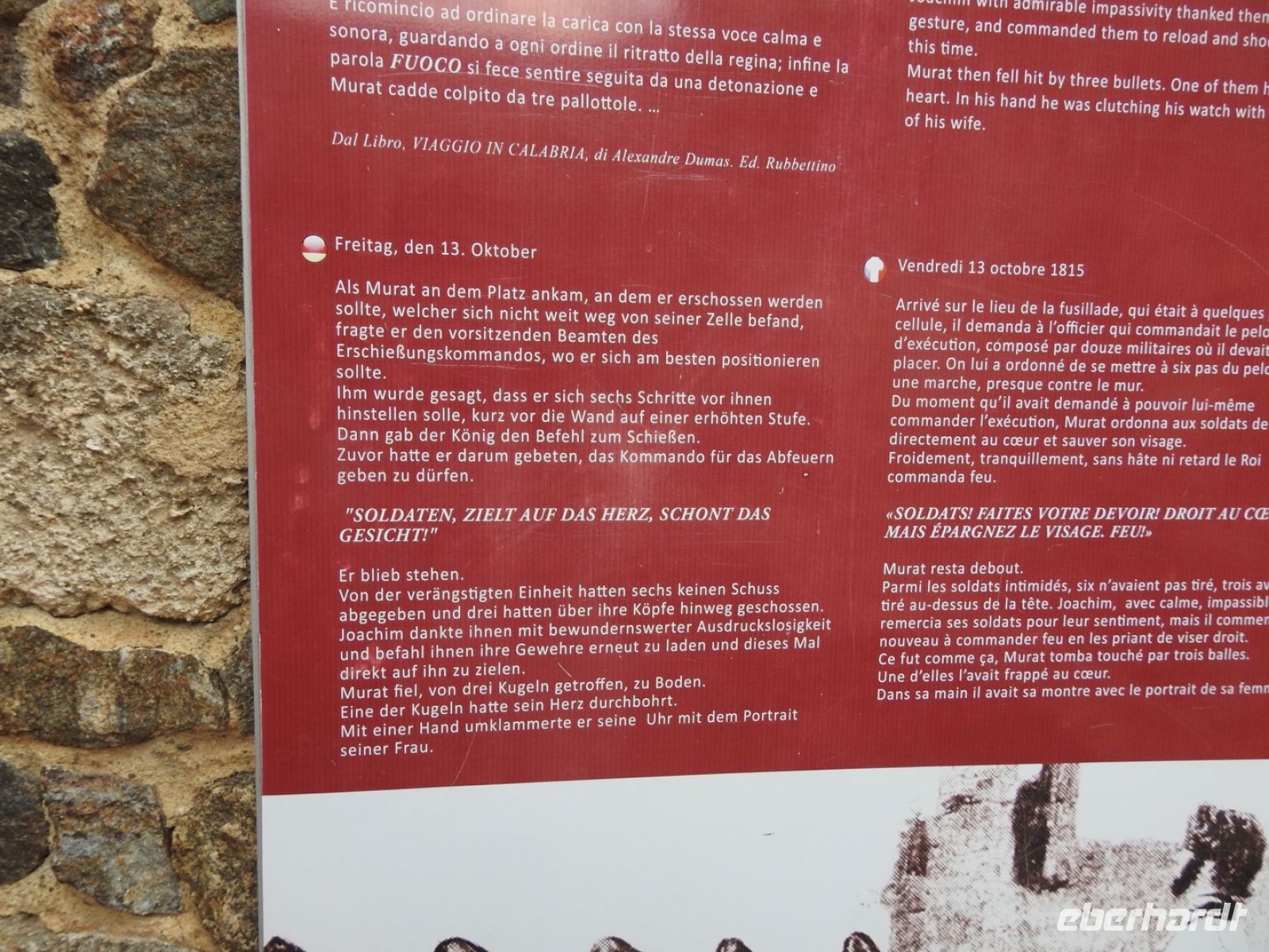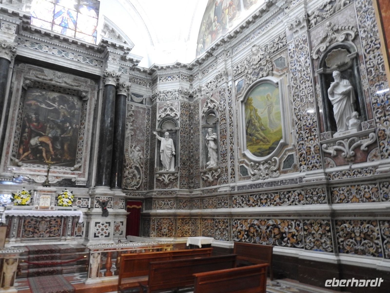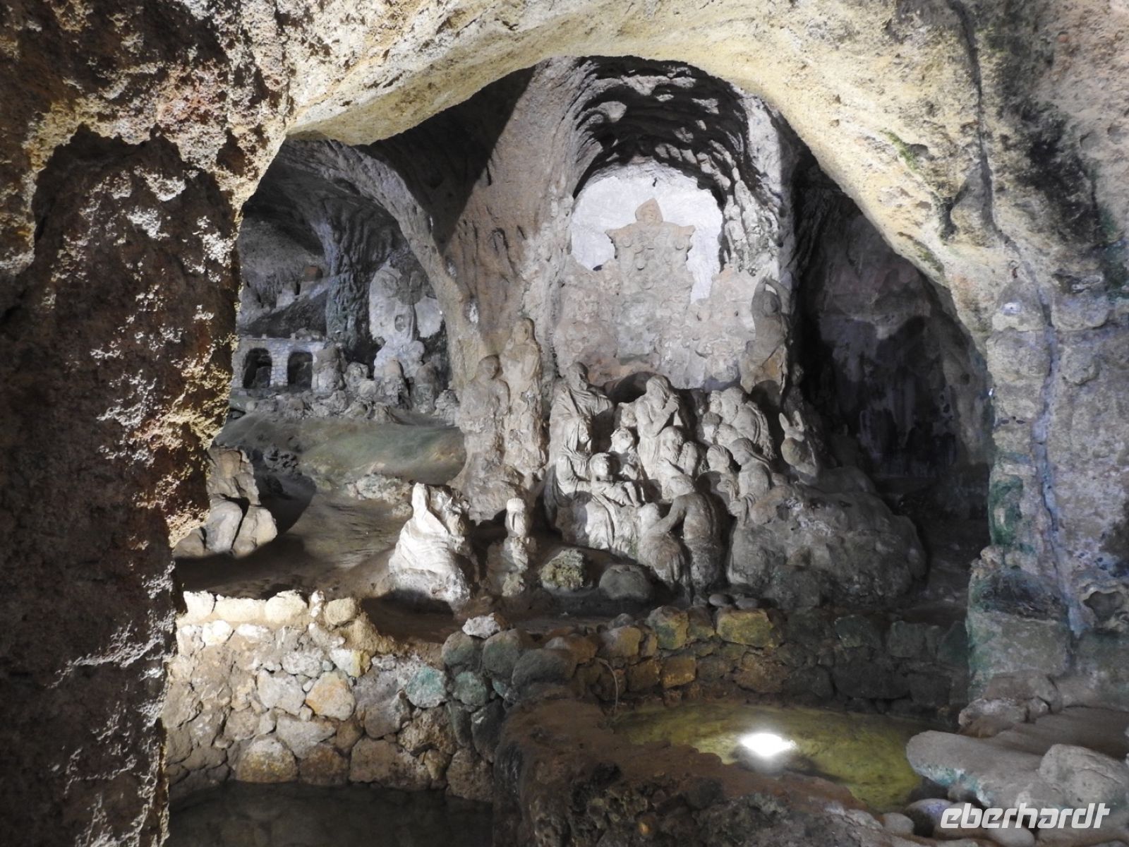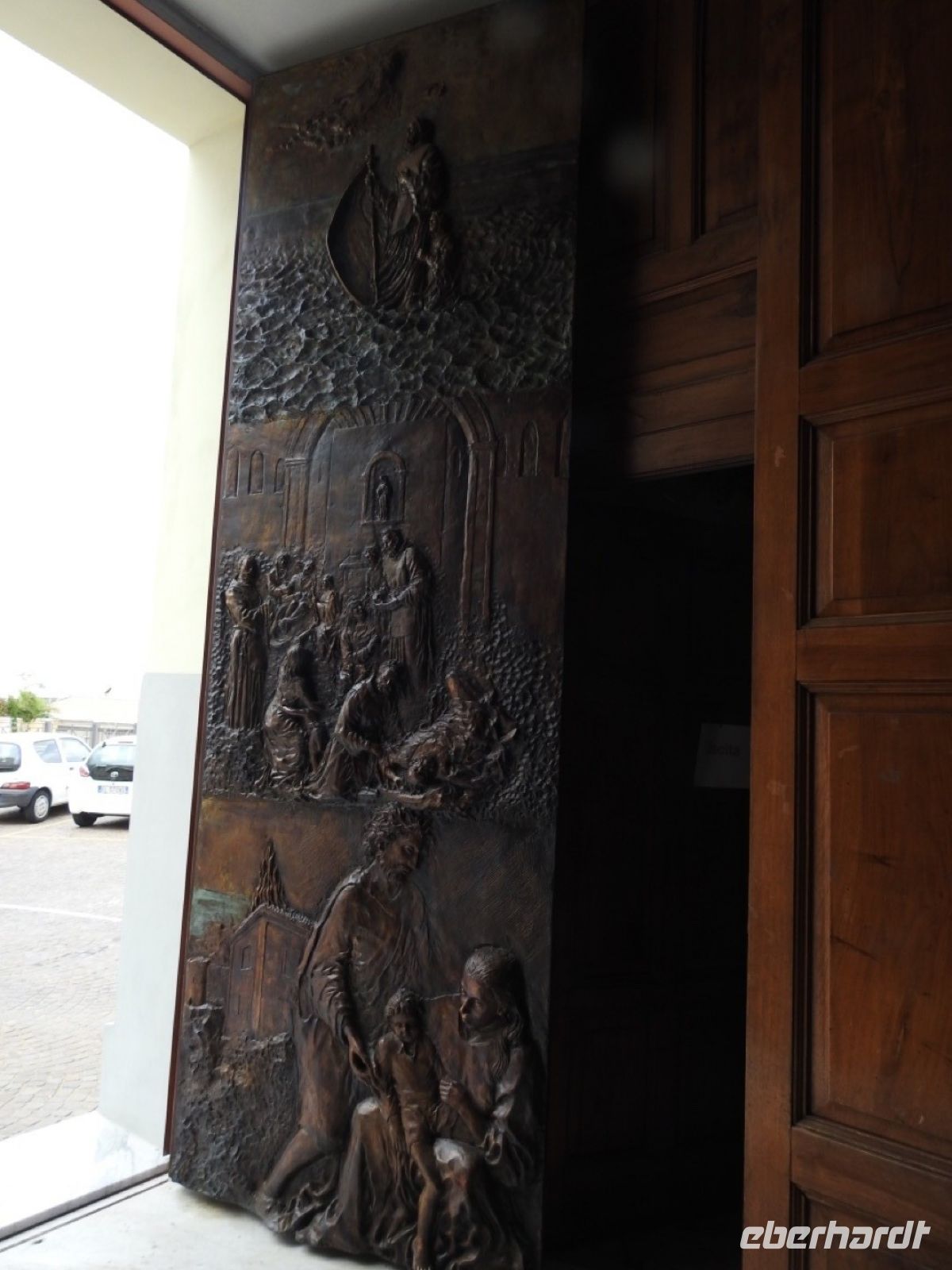 Nachdem geklärt ist, wohin uns der Shuttlebus bringen muss, lernen wir unsere örtliche Reiseleiterin Nadia und unseren Busfahrer kennen. Nadia erklärt uns anschaulich an einem Souvenirhandtuch wo wir uns befinden, dann versuchen wir einen Blick auf Sizilien zu erhaschen. Aber es ist zu dunstig. Die Küste der Götter zeigt sich uns nicht von ihrer strahlenden Seite. Am Capo Vaticano ist die Aussicht auf das türkisblaue Meer schon besser. Früher gab es hier ein Orakel, das von vielen Seefahrern besucht wurde. Daher stammt der Name: Kap der Prophezeiung. In Tropea kommen wir gleich an einem Laden vorbei, der die hier begehrte Ware, süße rote Zwiebeln, anbietet. Doch zunächst schauen wir nur. Ein Spaziergang führt uns zu den verschiedenen Balkonen, die die Stadt so spektakulär machen. Überall haben wir eine prächtige Aussicht auf das Meer und den weißen Sandstrand. Am schönsten ist der Blick auf die Wallfahrtskirche Santa Maria dell‘ Isola, die sich in strahlendem Weiß auf einem Sandsteinfelsen präsentiert. Unser Weg führt uns vorbei an ehemaligen Adelspalästen aus dem 15. Jahrhundert, manche sind noch bewohnt. Es gelingt uns, einen Blick in einen Innenhof zu werfen und das Adelswappen an der Decke zu bewundern. Gern hätten wir auch die Kathedrale besucht, jedoch bleibt dieser Besuch uns verwehrt, da gerade Gottesdienst stattfindet und Touristen nicht erwünscht sind. Nur klammheimlich können wir einen Blick auf die Bomben werfen, die am Eingang der Kathedrale befestigt sind. Grund ist, dass im 2. Weltkrieg sieben Bomben auf Tropea abgeworfen wurden, jedoch keine explodierte. Als Erinnerung daran, wurden zwei der Bomben in der Kathedrale angebracht. Wir haben nun eine Stunde Zeit, auf eigene Faust die Stadt zu erobern. Die verbringen wir mit Kaffee trinken und/oder einkaufen. Vor allem die verschiedenen Spaghettigewürze und die Njudawurst haben es uns angetan. Aber auch die italienischen Schuhläden und Bekleidungsgeschäfte laden zum Shoppen ein. Nach der Pause besuchen wir einen Laden, wo uns verschiedene Aufstriche, Wurst und Käse zum verkosten angeboten werden. Wir fahren weiter nach Pizzo, ein freundliches Städtchen, das auf einem Felsplateau hoch über dem Golf von Sant Eufemia thront. Wir besuchen das Castello, in dem der Schwager von Napoleon eingesperrt, zum Tode verurteilt und umgebracht wurde. Auf der Piazza della Repubblica kehren wir ein und Eberhardt Travel lädt uns auf einen Tartuffo ein. Das ist die Spezialität der Stadt - ein Eis mit flüssigem Schokoladenkern. Bei einer Präsentation können wir zusehen, wie die flüssige Schokolade in die Eiskugel kommt. Nach dieser Leckerei fahren wir zu einem Strand, an dem sich eine besonders sehenswerte Felsenkirche befindet. Ende des 18. Jahrhunderts gerieten neapolitanische Seeleute in Not. Nach ihrer glücklichen Rettung, errichteten sie diese Kirche. Zweihundert Jahre später entdeckte ein lokaler Künstler die Kirche für sich und schmückte sie mit Dutzenden Heiligenfiguren, die er mit einer Spitzhacke aus dem Sandstein schlug. So entstand ein wunderschönes Figurenensemble ganz versteckt in einer Grotte am Strand.