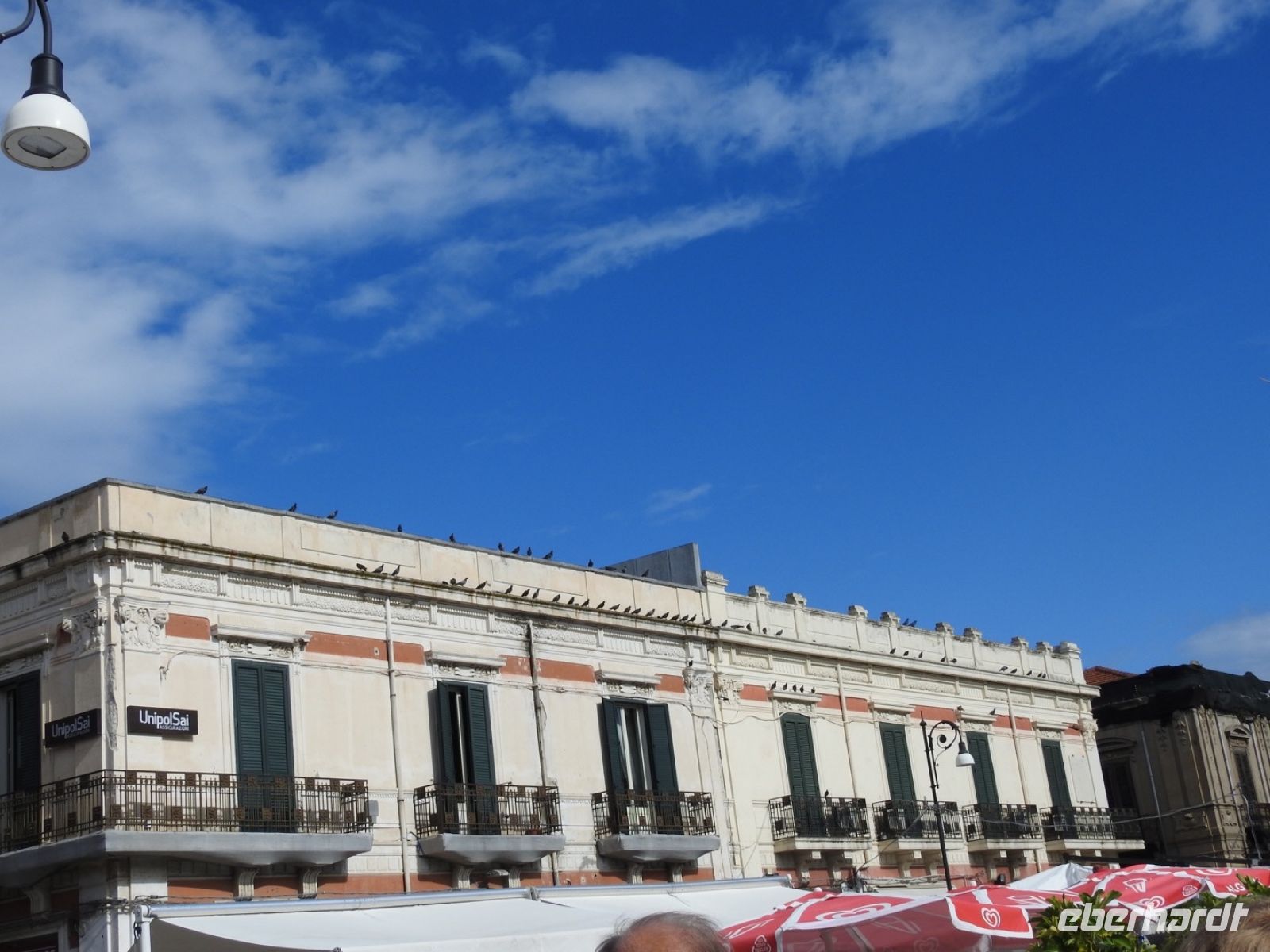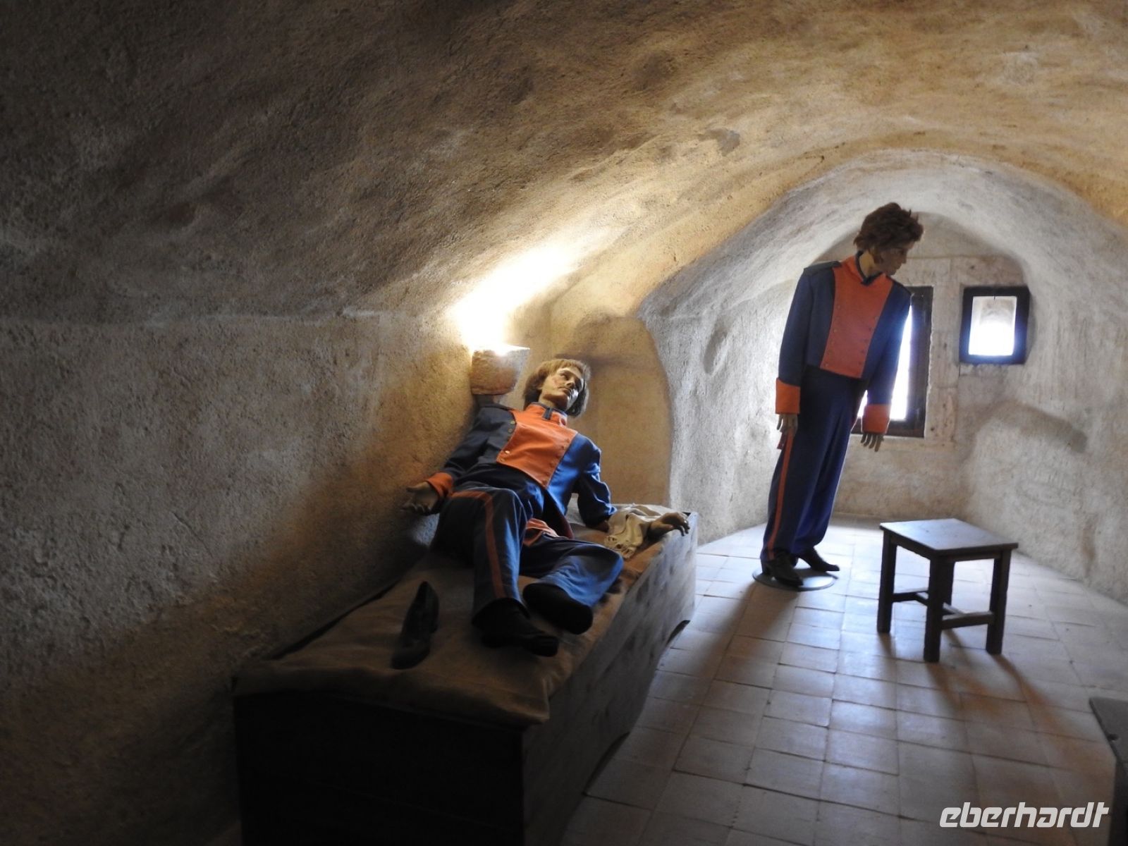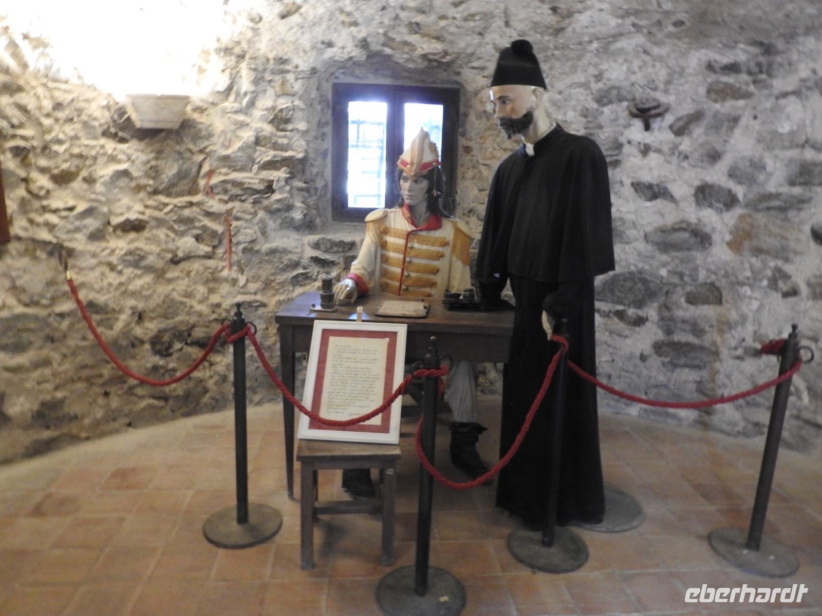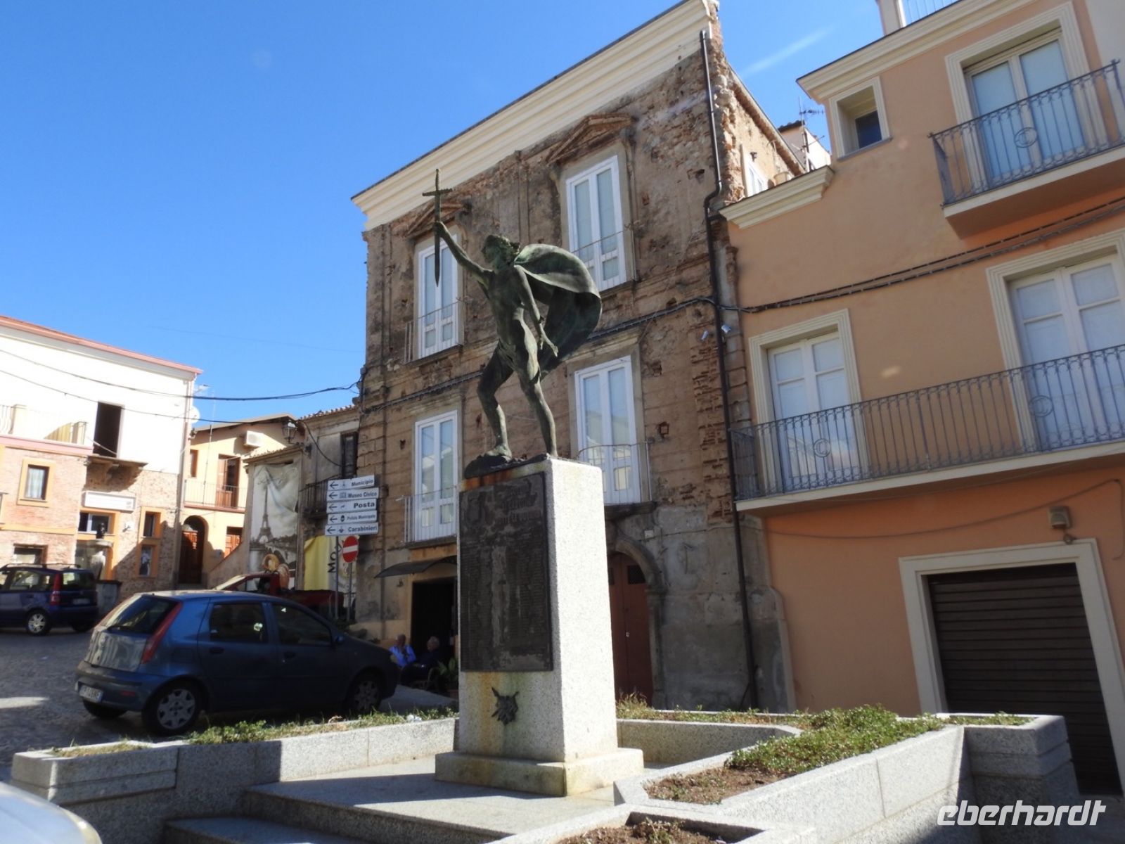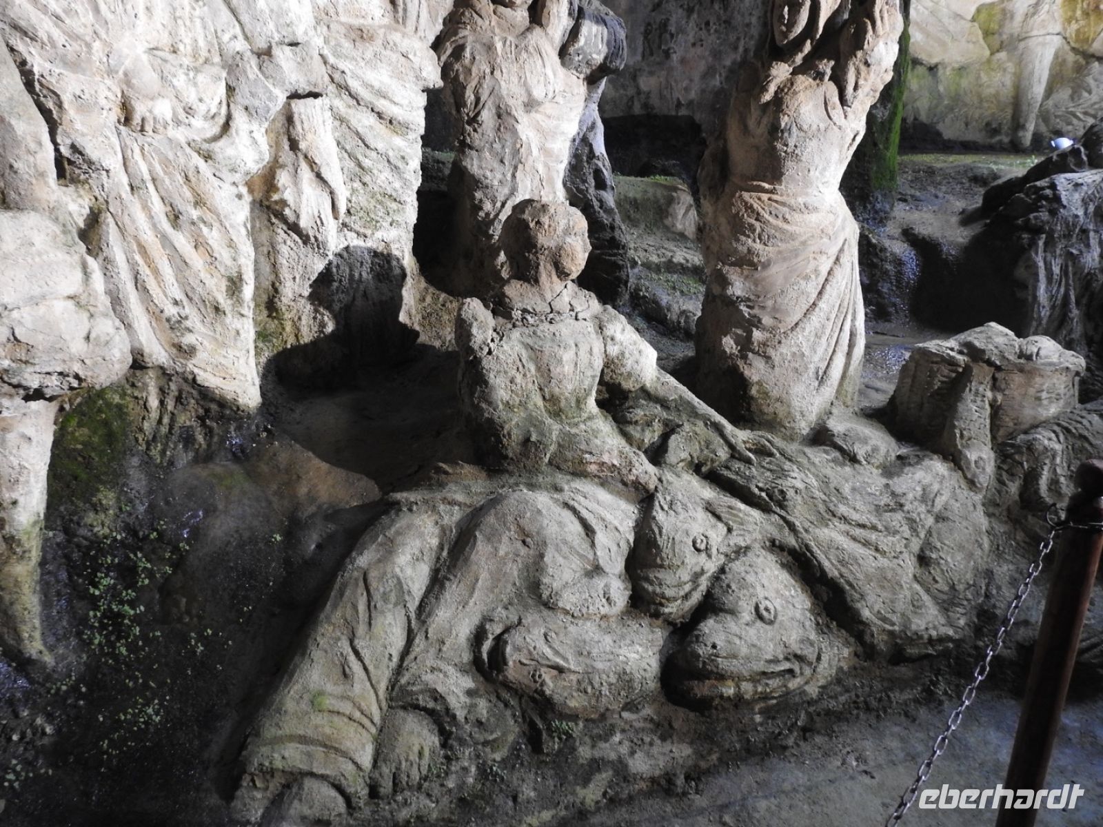 Nachdem geklärt ist, wohin uns der Shuttlebus bringen muss, lernen wir unsere örtliche Reiseleiterin Nadia und unseren Busfahrer kennen. Nadia erklärt uns anschaulich an einem Souvenirhandtuch wo wir uns befinden, dann versuchen wir einen Blick auf Sizilien zu erhaschen. Aber es ist zu dunstig. Die Küste der Götter zeigt sich uns nicht von ihrer strahlenden Seite. Am Capo Vaticano ist die Aussicht auf das türkisblaue Meer schon besser. Früher gab es hier ein Orakel, das von vielen Seefahrern besucht wurde. Daher stammt der Name: Kap der Prophezeiung. In Tropea kommen wir gleich an einem Laden vorbei, der die hier begehrte Ware, süße rote Zwiebeln, anbietet. Doch zunächst schauen wir nur. Ein Spaziergang führt uns zu den verschiedenen Balkonen, die die Stadt so spektakulär machen. Überall haben wir eine prächtige Aussicht auf das Meer und den weißen Sandstrand. Am schönsten ist der Blick auf die Wallfahrtskirche Santa Maria dell‘ Isola, die sich in strahlendem Weiß auf einem Sandsteinfelsen präsentiert. Unser Weg führt uns vorbei an ehemaligen Adelspalästen aus dem 15. Jahrhundert, manche sind noch bewohnt. Es gelingt uns, einen Blick in einen Innenhof zu werfen und das Adelswappen an der Decke zu bewundern. Gern hätten wir auch die Kathedrale besucht, jedoch bleibt dieser Besuch uns verwehrt, da gerade Gottesdienst stattfindet und Touristen nicht erwünscht sind. Nur klammheimlich können wir einen Blick auf die Bomben werfen, die am Eingang der Kathedrale befestigt sind. Grund ist, dass im 2. Weltkrieg sieben Bomben auf Tropea abgeworfen wurden, jedoch keine explodierte. Als Erinnerung daran, wurden zwei der Bomben in der Kathedrale angebracht. Wir haben nun eine Stunde Zeit, auf eigene Faust die Stadt zu erobern. Die verbringen wir mit Kaffee trinken und/oder einkaufen. Vor allem die verschiedenen Spaghettigewürze und die Njudawurst haben es uns angetan. Aber auch die italienischen Schuhläden und Bekleidungsgeschäfte laden zum Shoppen ein. Nach der Pause besuchen wir einen Laden, wo uns verschiedene Aufstriche, Wurst und Käse zum verkosten angeboten werden. Wir fahren weiter nach Pizzo, ein freundliches Städtchen, das auf einem Felsplateau hoch über dem Golf von Sant Eufemia thront. Wir besuchen das Castello, in dem der Schwager von Napoleon eingesperrt, zum Tode verurteilt und umgebracht wurde. Auf der Piazza della Repubblica kehren wir ein und Eberhardt Travel lädt uns auf einen Tartuffo ein. Das ist die Spezialität der Stadt - ein Eis mit flüssigem Schokoladenkern. Bei einer Präsentation können wir zusehen, wie die flüssige Schokolade in die Eiskugel kommt. Nach dieser Leckerei fahren wir zu einem Strand, an dem sich eine besonders sehenswerte Felsenkirche befindet. Ende des 18. Jahrhunderts gerieten neapolitanische Seeleute in Not. Nach ihrer glücklichen Rettung, errichteten sie diese Kirche. Zweihundert Jahre später entdeckte ein lokaler Künstler die Kirche für sich und schmückte sie mit Dutzenden Heiligenfiguren, die er mit einer Spitzhacke aus dem Sandstein schlug. So entstand ein wunderschönes Figurenensemble ganz versteckt in einer Grotte am Strand.