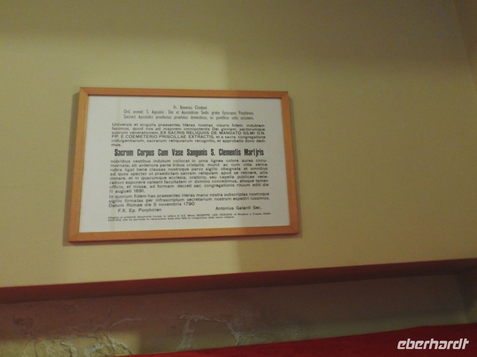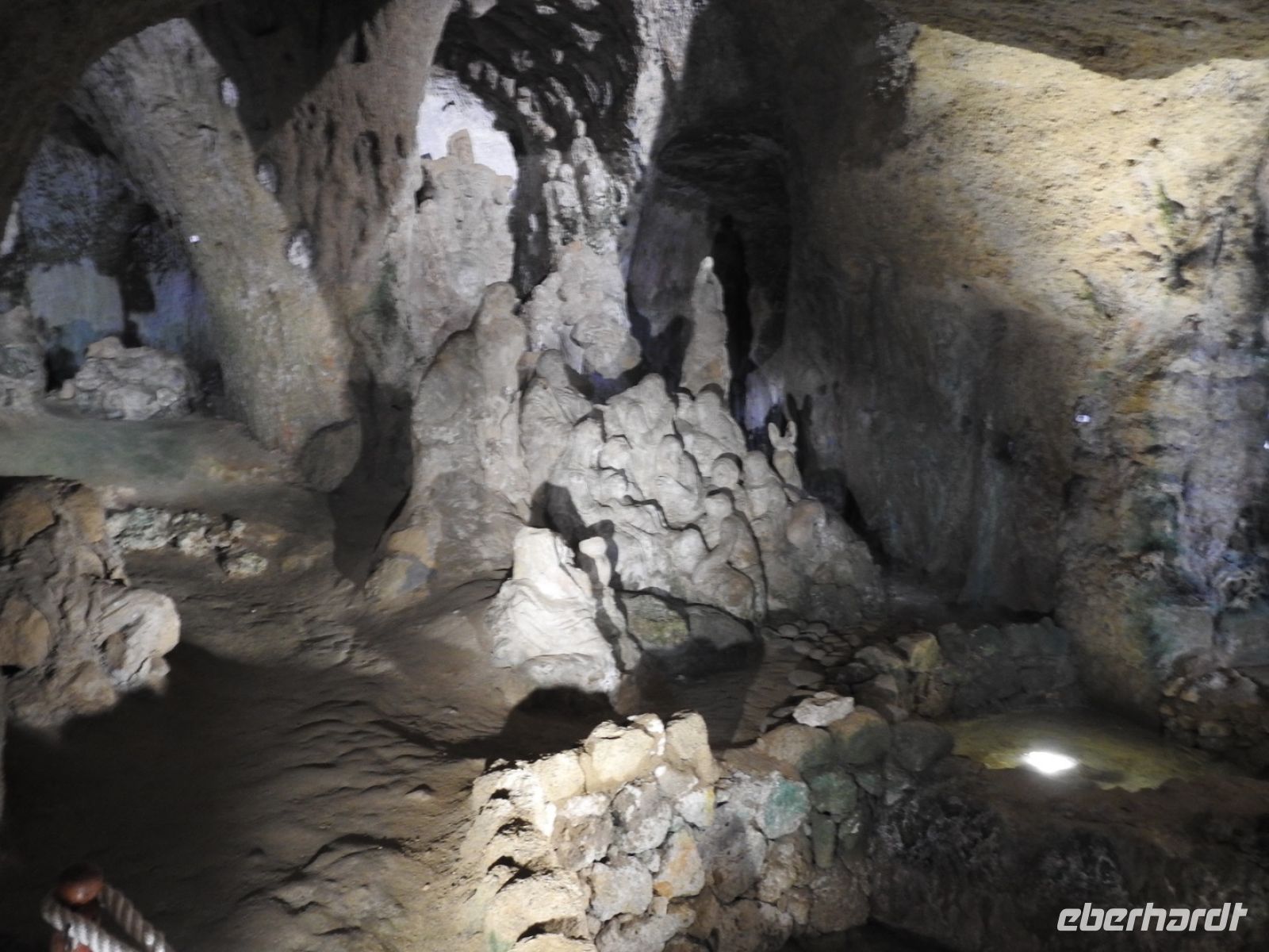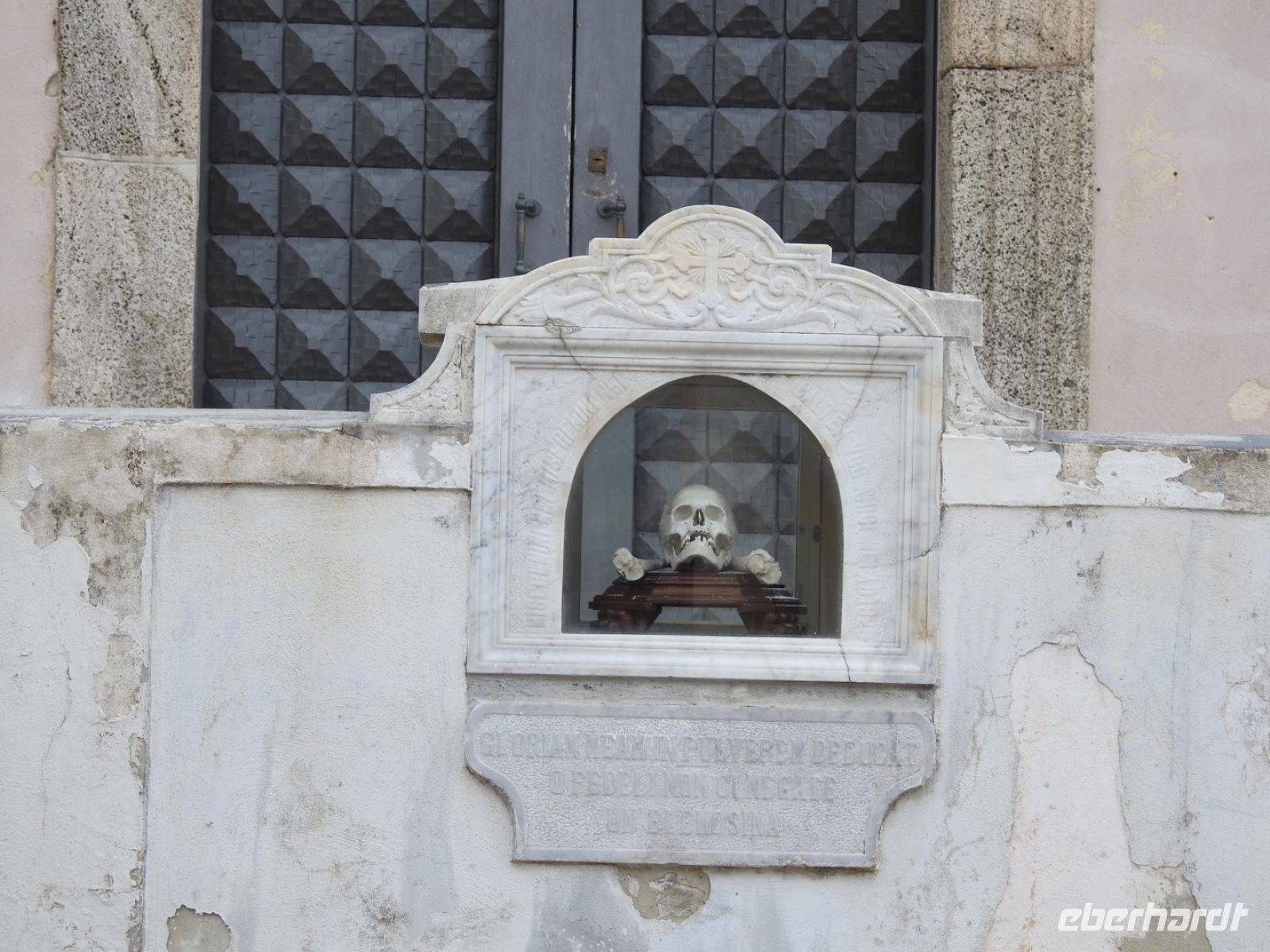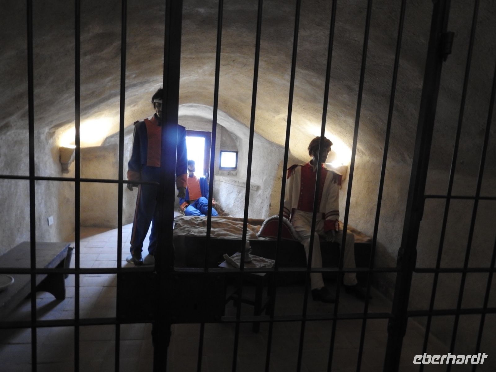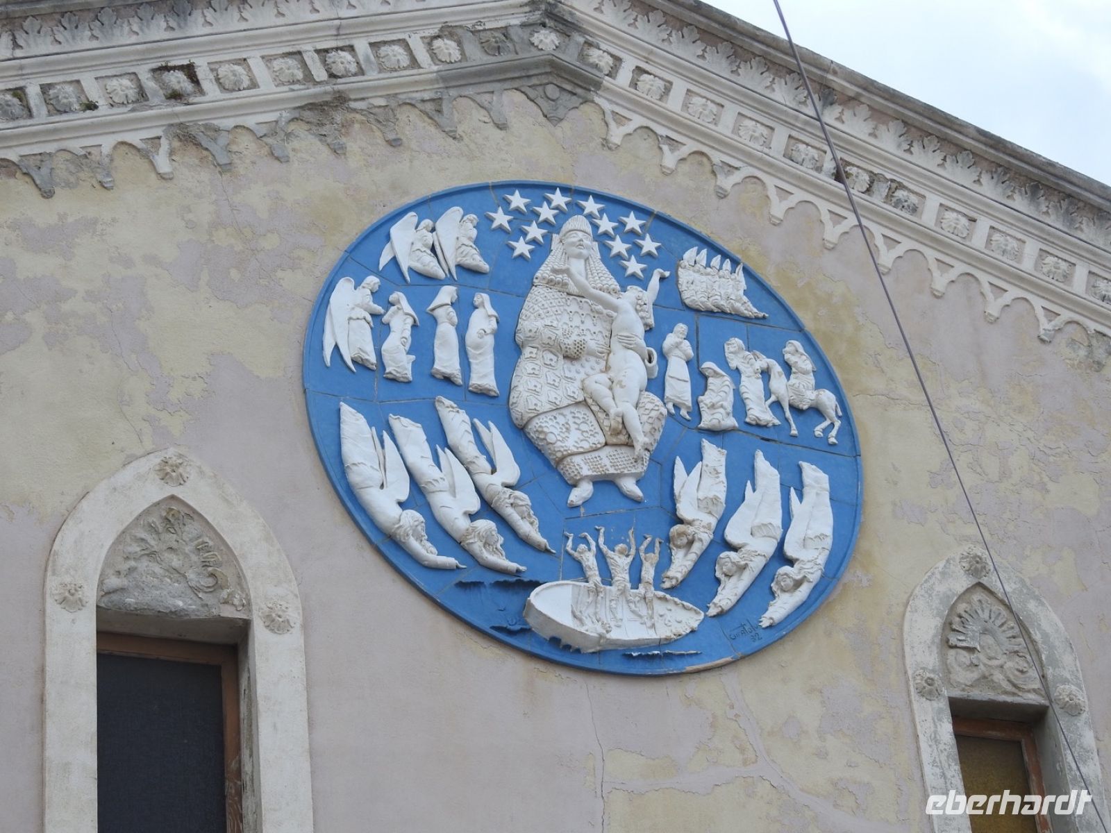 Nachdem geklärt ist, wohin uns der Shuttlebus bringen muss, lernen wir unsere örtliche Reiseleiterin Nadia und unseren Busfahrer kennen. Nadia erklärt uns anschaulich an einem Souvenirhandtuch wo wir uns befinden, dann versuchen wir einen Blick auf Sizilien zu erhaschen. Aber es ist zu dunstig. Die Küste der Götter zeigt sich uns nicht von ihrer strahlenden Seite. Am Capo Vaticano ist die Aussicht auf das türkisblaue Meer schon besser. Früher gab es hier ein Orakel, das von vielen Seefahrern besucht wurde. Daher stammt der Name: Kap der Prophezeiung. In Tropea kommen wir gleich an einem Laden vorbei, der die hier begehrte Ware, süße rote Zwiebeln, anbietet. Doch zunächst schauen wir nur. Ein Spaziergang führt uns zu den verschiedenen Balkonen, die die Stadt so spektakulär machen. Überall haben wir eine prächtige Aussicht auf das Meer und den weißen Sandstrand. Am schönsten ist der Blick auf die Wallfahrtskirche Santa Maria dell‘ Isola, die sich in strahlendem Weiß auf einem Sandsteinfelsen präsentiert. Unser Weg führt uns vorbei an ehemaligen Adelspalästen aus dem 15. Jahrhundert, manche sind noch bewohnt. Es gelingt uns, einen Blick in einen Innenhof zu werfen und das Adelswappen an der Decke zu bewundern. Gern hätten wir auch die Kathedrale besucht, jedoch bleibt dieser Besuch uns verwehrt, da gerade Gottesdienst stattfindet und Touristen nicht erwünscht sind. Nur klammheimlich können wir einen Blick auf die Bomben werfen, die am Eingang der Kathedrale befestigt sind. Grund ist, dass im 2. Weltkrieg sieben Bomben auf Tropea abgeworfen wurden, jedoch keine explodierte. Als Erinnerung daran, wurden zwei der Bomben in der Kathedrale angebracht. Wir haben nun eine Stunde Zeit, auf eigene Faust die Stadt zu erobern. Die verbringen wir mit Kaffee trinken und/oder einkaufen. Vor allem die verschiedenen Spaghettigewürze und die Njudawurst haben es uns angetan. Aber auch die italienischen Schuhläden und Bekleidungsgeschäfte laden zum Shoppen ein. Nach der Pause besuchen wir einen Laden, wo uns verschiedene Aufstriche, Wurst und Käse zum verkosten angeboten werden. Wir fahren weiter nach Pizzo, ein freundliches Städtchen, das auf einem Felsplateau hoch über dem Golf von Sant Eufemia thront. Wir besuchen das Castello, in dem der Schwager von Napoleon eingesperrt, zum Tode verurteilt und umgebracht wurde. Auf der Piazza della Repubblica kehren wir ein und Eberhardt Travel lädt uns auf einen Tartuffo ein. Das ist die Spezialität der Stadt - ein Eis mit flüssigem Schokoladenkern. Bei einer Präsentation können wir zusehen, wie die flüssige Schokolade in die Eiskugel kommt. Nach dieser Leckerei fahren wir zu einem Strand, an dem sich eine besonders sehenswerte Felsenkirche befindet. Ende des 18. Jahrhunderts gerieten neapolitanische Seeleute in Not. Nach ihrer glücklichen Rettung, errichteten sie diese Kirche. Zweihundert Jahre später entdeckte ein lokaler Künstler die Kirche für sich und schmückte sie mit Dutzenden Heiligenfiguren, die er mit einer Spitzhacke aus dem Sandstein schlug. So entstand ein wunderschönes Figurenensemble ganz versteckt in einer Grotte am Strand.