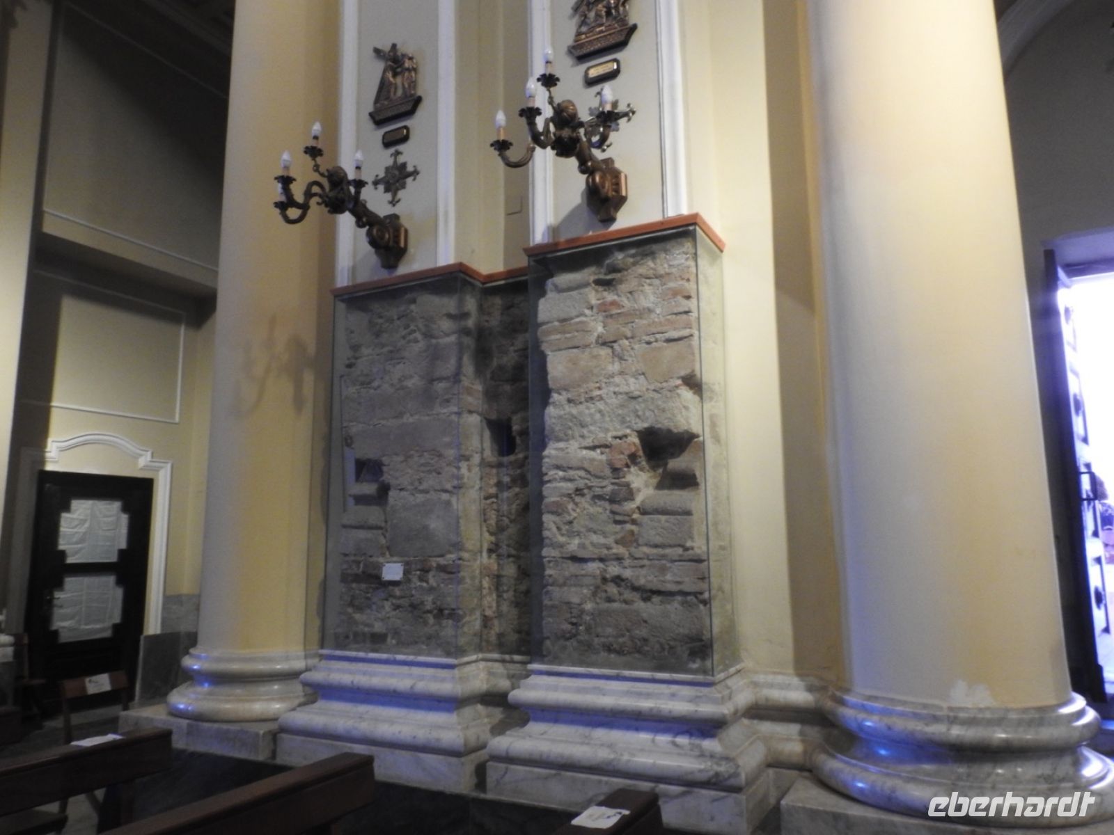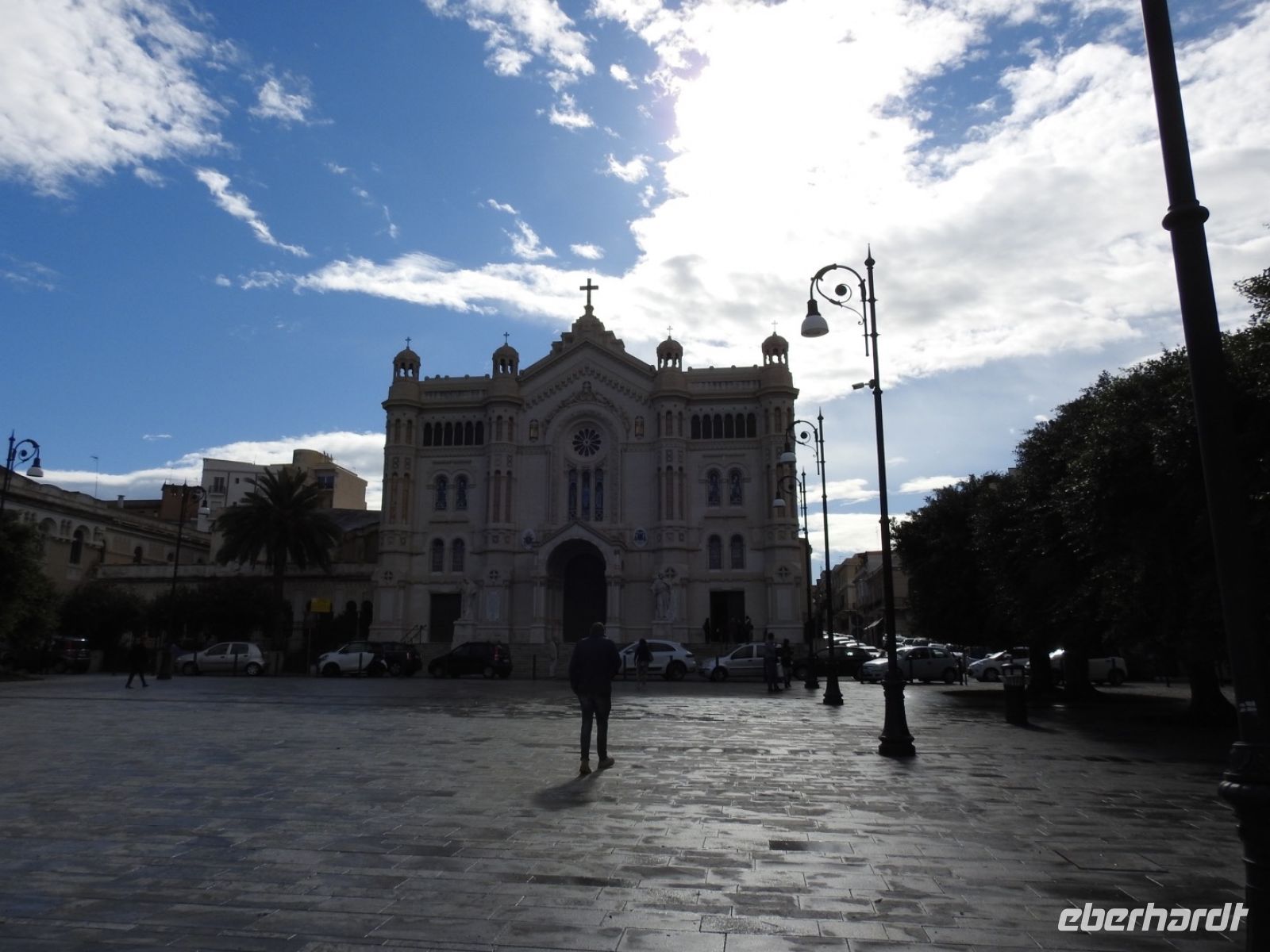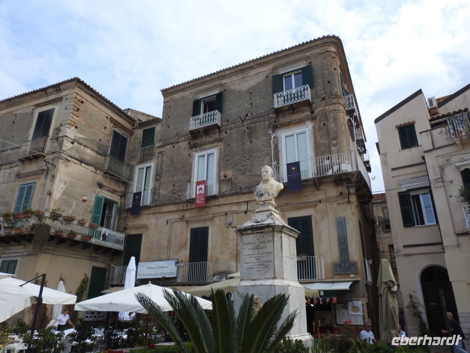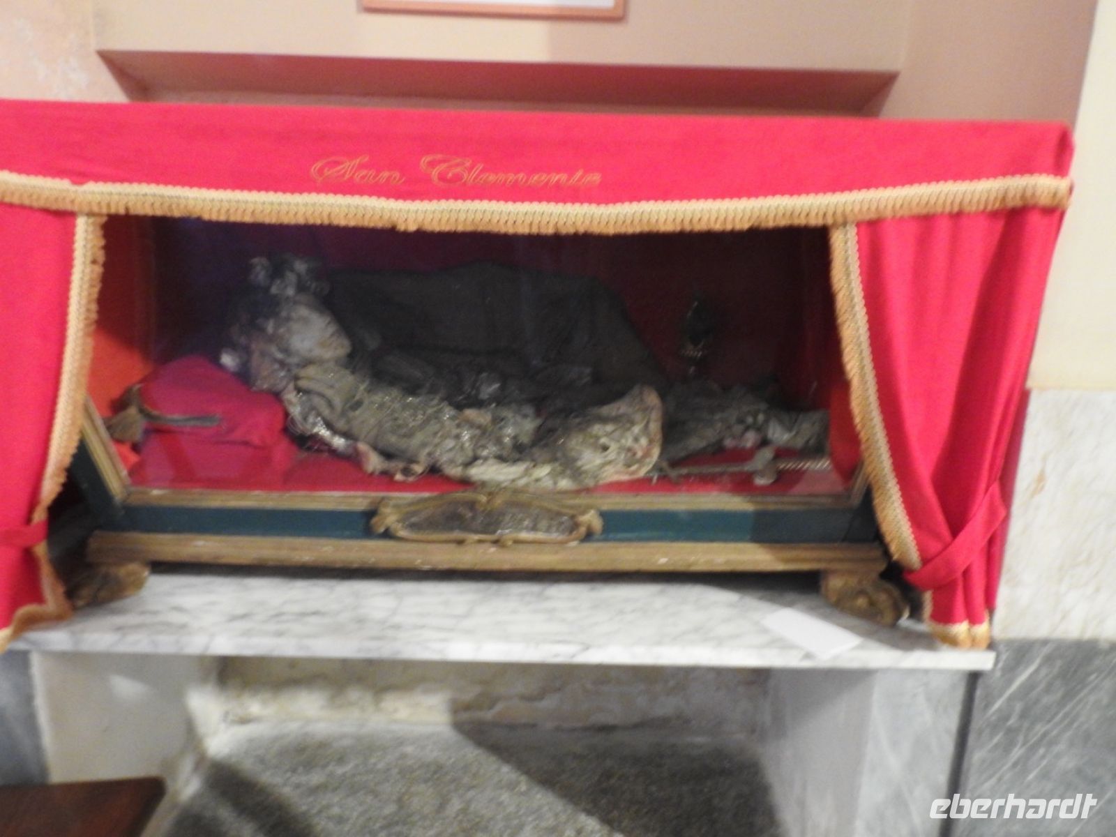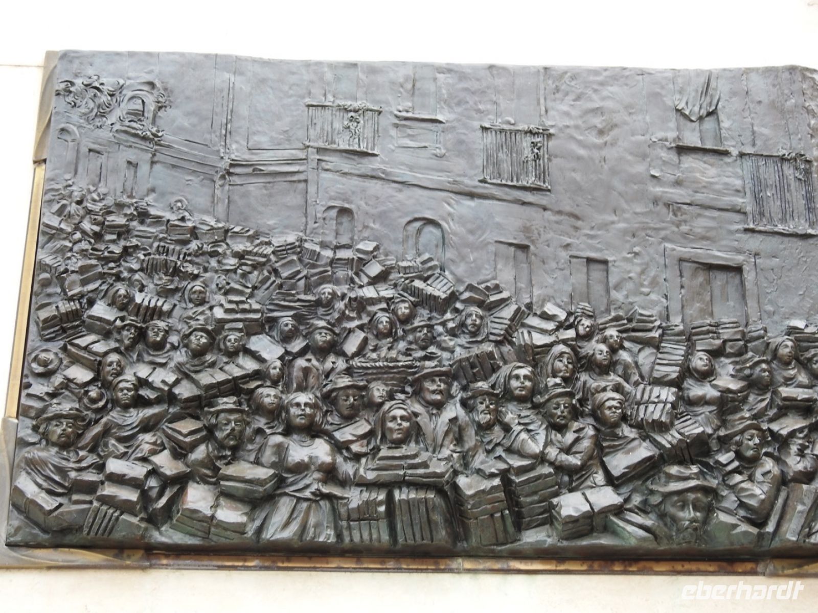 Nachdem geklärt ist, wohin uns der Shuttlebus bringen muss, lernen wir unsere örtliche Reiseleiterin Nadia und unseren Busfahrer kennen. Nadia erklärt uns anschaulich an einem Souvenirhandtuch wo wir uns befinden, dann versuchen wir einen Blick auf Sizilien zu erhaschen. Aber es ist zu dunstig. Die Küste der Götter zeigt sich uns nicht von ihrer strahlenden Seite. Am Capo Vaticano ist die Aussicht auf das türkisblaue Meer schon besser. Früher gab es hier ein Orakel, das von vielen Seefahrern besucht wurde. Daher stammt der Name: Kap der Prophezeiung. In Tropea kommen wir gleich an einem Laden vorbei, der die hier begehrte Ware, süße rote Zwiebeln, anbietet. Doch zunächst schauen wir nur. Ein Spaziergang führt uns zu den verschiedenen Balkonen, die die Stadt so spektakulär machen. Überall haben wir eine prächtige Aussicht auf das Meer und den weißen Sandstrand. Am schönsten ist der Blick auf die Wallfahrtskirche Santa Maria dell‘ Isola, die sich in strahlendem Weiß auf einem Sandsteinfelsen präsentiert. Unser Weg führt uns vorbei an ehemaligen Adelspalästen aus dem 15. Jahrhundert, manche sind noch bewohnt. Es gelingt uns, einen Blick in einen Innenhof zu werfen und das Adelswappen an der Decke zu bewundern. Gern hätten wir auch die Kathedrale besucht, jedoch bleibt dieser Besuch uns verwehrt, da gerade Gottesdienst stattfindet und Touristen nicht erwünscht sind. Nur klammheimlich können wir einen Blick auf die Bomben werfen, die am Eingang der Kathedrale befestigt sind. Grund ist, dass im 2. Weltkrieg sieben Bomben auf Tropea abgeworfen wurden, jedoch keine explodierte. Als Erinnerung daran, wurden zwei der Bomben in der Kathedrale angebracht. Wir haben nun eine Stunde Zeit, auf eigene Faust die Stadt zu erobern. Die verbringen wir mit Kaffee trinken und/oder einkaufen. Vor allem die verschiedenen Spaghettigewürze und die Njudawurst haben es uns angetan. Aber auch die italienischen Schuhläden und Bekleidungsgeschäfte laden zum Shoppen ein. Nach der Pause besuchen wir einen Laden, wo uns verschiedene Aufstriche, Wurst und Käse zum verkosten angeboten werden. Wir fahren weiter nach Pizzo, ein freundliches Städtchen, das auf einem Felsplateau hoch über dem Golf von Sant Eufemia thront. Wir besuchen das Castello, in dem der Schwager von Napoleon eingesperrt, zum Tode verurteilt und umgebracht wurde. Auf der Piazza della Repubblica kehren wir ein und Eberhardt Travel lädt uns auf einen Tartuffo ein. Das ist die Spezialität der Stadt - ein Eis mit flüssigem Schokoladenkern. Bei einer Präsentation können wir zusehen, wie die flüssige Schokolade in die Eiskugel kommt. Nach dieser Leckerei fahren wir zu einem Strand, an dem sich eine besonders sehenswerte Felsenkirche befindet. Ende des 18. Jahrhunderts gerieten neapolitanische Seeleute in Not. Nach ihrer glücklichen Rettung, errichteten sie diese Kirche. Zweihundert Jahre später entdeckte ein lokaler Künstler die Kirche für sich und schmückte sie mit Dutzenden Heiligenfiguren, die er mit einer Spitzhacke aus dem Sandstein schlug. So entstand ein wunderschönes Figurenensemble ganz versteckt in einer Grotte am Strand.