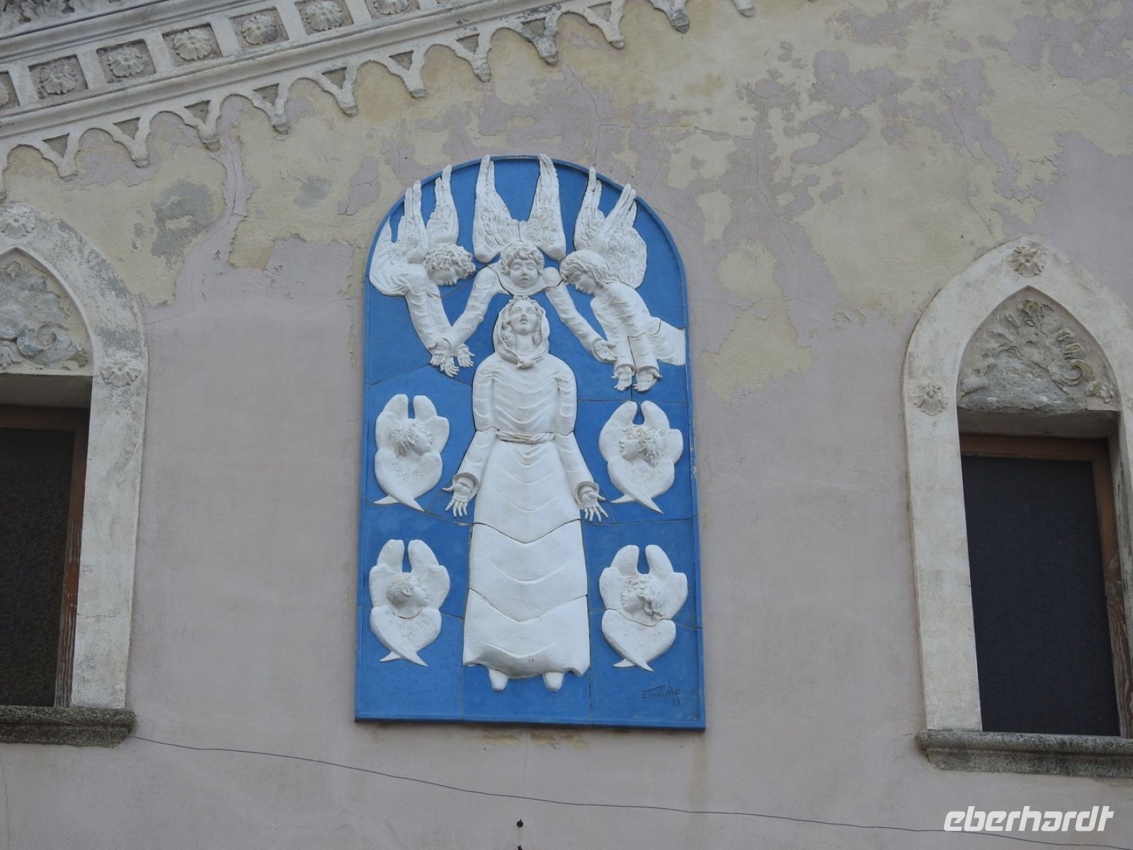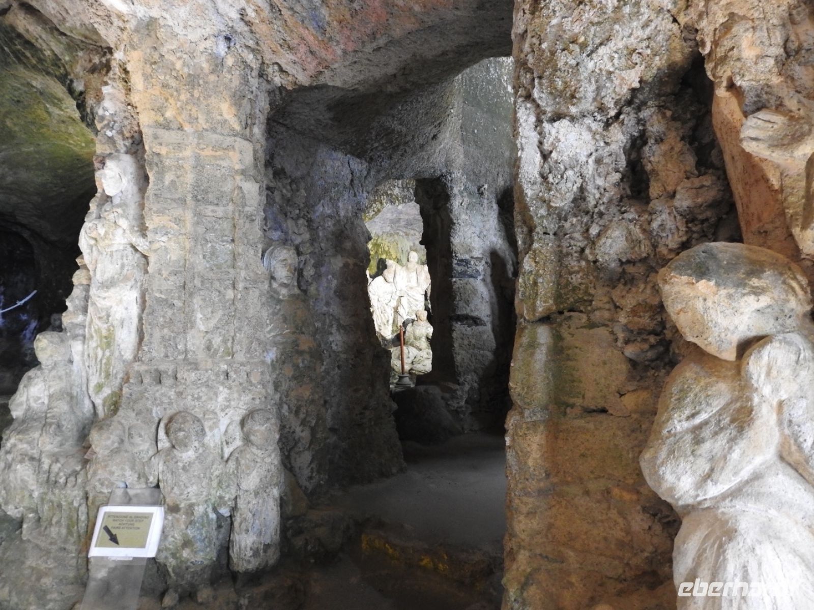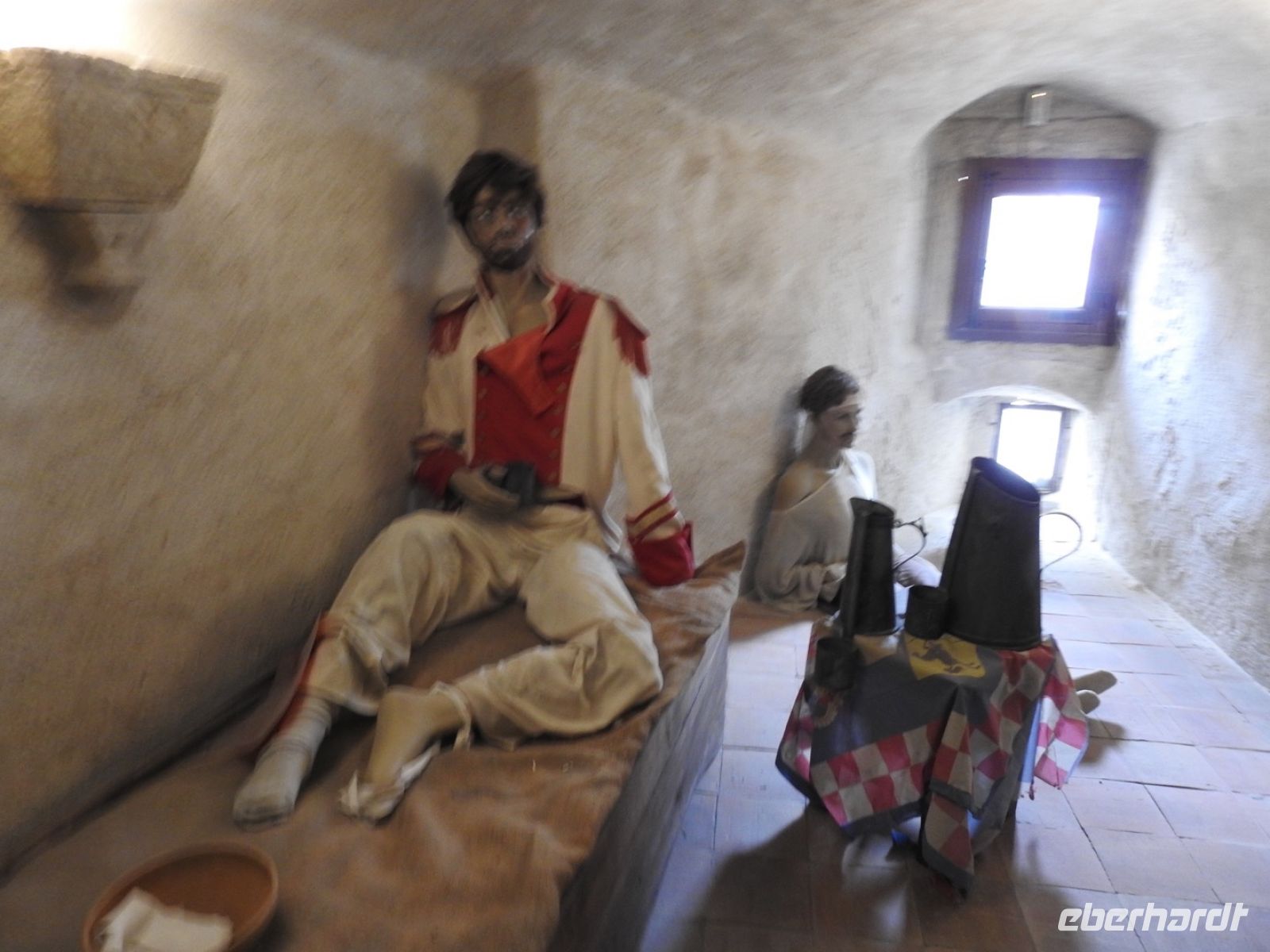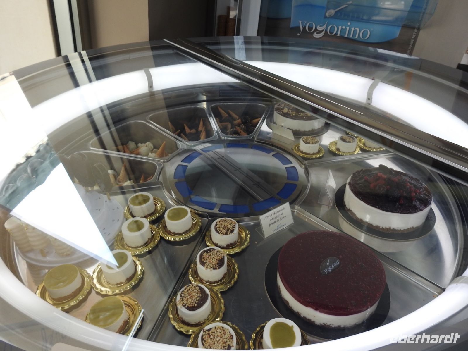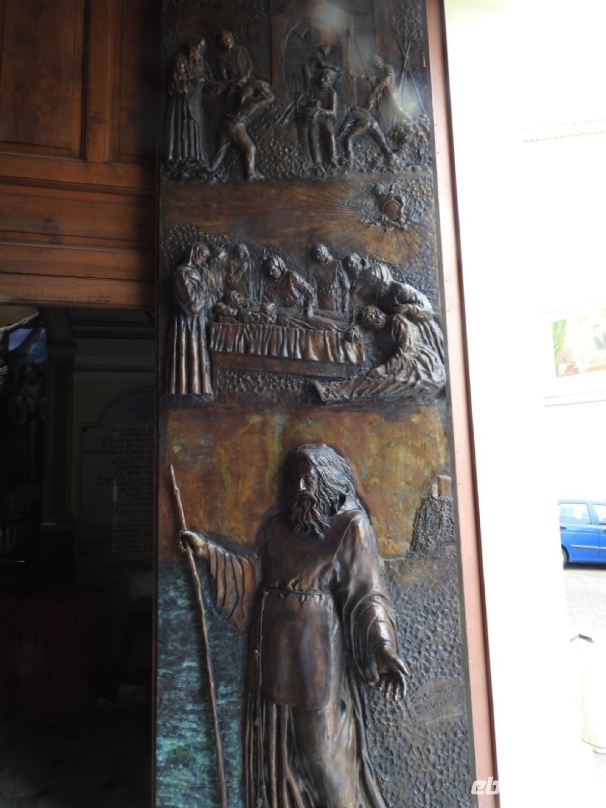 Nachdem geklärt ist, wohin uns der Shuttlebus bringen muss, lernen wir unsere örtliche Reiseleiterin Nadia und unseren Busfahrer kennen. Nadia erklärt uns anschaulich an einem Souvenirhandtuch wo wir uns befinden, dann versuchen wir einen Blick auf Sizilien zu erhaschen. Aber es ist zu dunstig. Die Küste der Götter zeigt sich uns nicht von ihrer strahlenden Seite. Am Capo Vaticano ist die Aussicht auf das türkisblaue Meer schon besser. Früher gab es hier ein Orakel, das von vielen Seefahrern besucht wurde. Daher stammt der Name: Kap der Prophezeiung. In Tropea kommen wir gleich an einem Laden vorbei, der die hier begehrte Ware, süße rote Zwiebeln, anbietet. Doch zunächst schauen wir nur. Ein Spaziergang führt uns zu den verschiedenen Balkonen, die die Stadt so spektakulär machen. Überall haben wir eine prächtige Aussicht auf das Meer und den weißen Sandstrand. Am schönsten ist der Blick auf die Wallfahrtskirche Santa Maria dell‘ Isola, die sich in strahlendem Weiß auf einem Sandsteinfelsen präsentiert. Unser Weg führt uns vorbei an ehemaligen Adelspalästen aus dem 15. Jahrhundert, manche sind noch bewohnt. Es gelingt uns, einen Blick in einen Innenhof zu werfen und das Adelswappen an der Decke zu bewundern. Gern hätten wir auch die Kathedrale besucht, jedoch bleibt dieser Besuch uns verwehrt, da gerade Gottesdienst stattfindet und Touristen nicht erwünscht sind. Nur klammheimlich können wir einen Blick auf die Bomben werfen, die am Eingang der Kathedrale befestigt sind. Grund ist, dass im 2. Weltkrieg sieben Bomben auf Tropea abgeworfen wurden, jedoch keine explodierte. Als Erinnerung daran, wurden zwei der Bomben in der Kathedrale angebracht. Wir haben nun eine Stunde Zeit, auf eigene Faust die Stadt zu erobern. Die verbringen wir mit Kaffee trinken und/oder einkaufen. Vor allem die verschiedenen Spaghettigewürze und die Njudawurst haben es uns angetan. Aber auch die italienischen Schuhläden und Bekleidungsgeschäfte laden zum Shoppen ein. Nach der Pause besuchen wir einen Laden, wo uns verschiedene Aufstriche, Wurst und Käse zum verkosten angeboten werden. Wir fahren weiter nach Pizzo, ein freundliches Städtchen, das auf einem Felsplateau hoch über dem Golf von Sant Eufemia thront. Wir besuchen das Castello, in dem der Schwager von Napoleon eingesperrt, zum Tode verurteilt und umgebracht wurde. Auf der Piazza della Repubblica kehren wir ein und Eberhardt Travel lädt uns auf einen Tartuffo ein. Das ist die Spezialität der Stadt - ein Eis mit flüssigem Schokoladenkern. Bei einer Präsentation können wir zusehen, wie die flüssige Schokolade in die Eiskugel kommt. Nach dieser Leckerei fahren wir zu einem Strand, an dem sich eine besonders sehenswerte Felsenkirche befindet. Ende des 18. Jahrhunderts gerieten neapolitanische Seeleute in Not. Nach ihrer glücklichen Rettung, errichteten sie diese Kirche. Zweihundert Jahre später entdeckte ein lokaler Künstler die Kirche für sich und schmückte sie mit Dutzenden Heiligenfiguren, die er mit einer Spitzhacke aus dem Sandstein schlug. So entstand ein wunderschönes Figurenensemble ganz versteckt in einer Grotte am Strand.