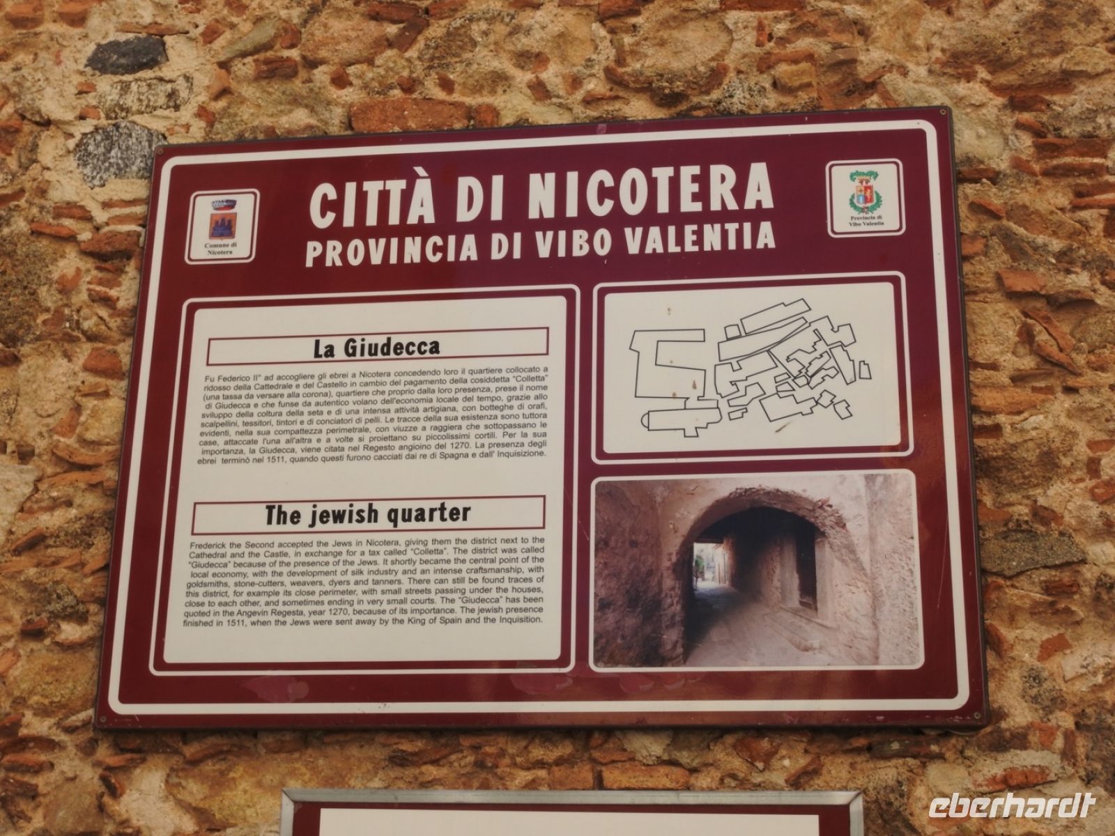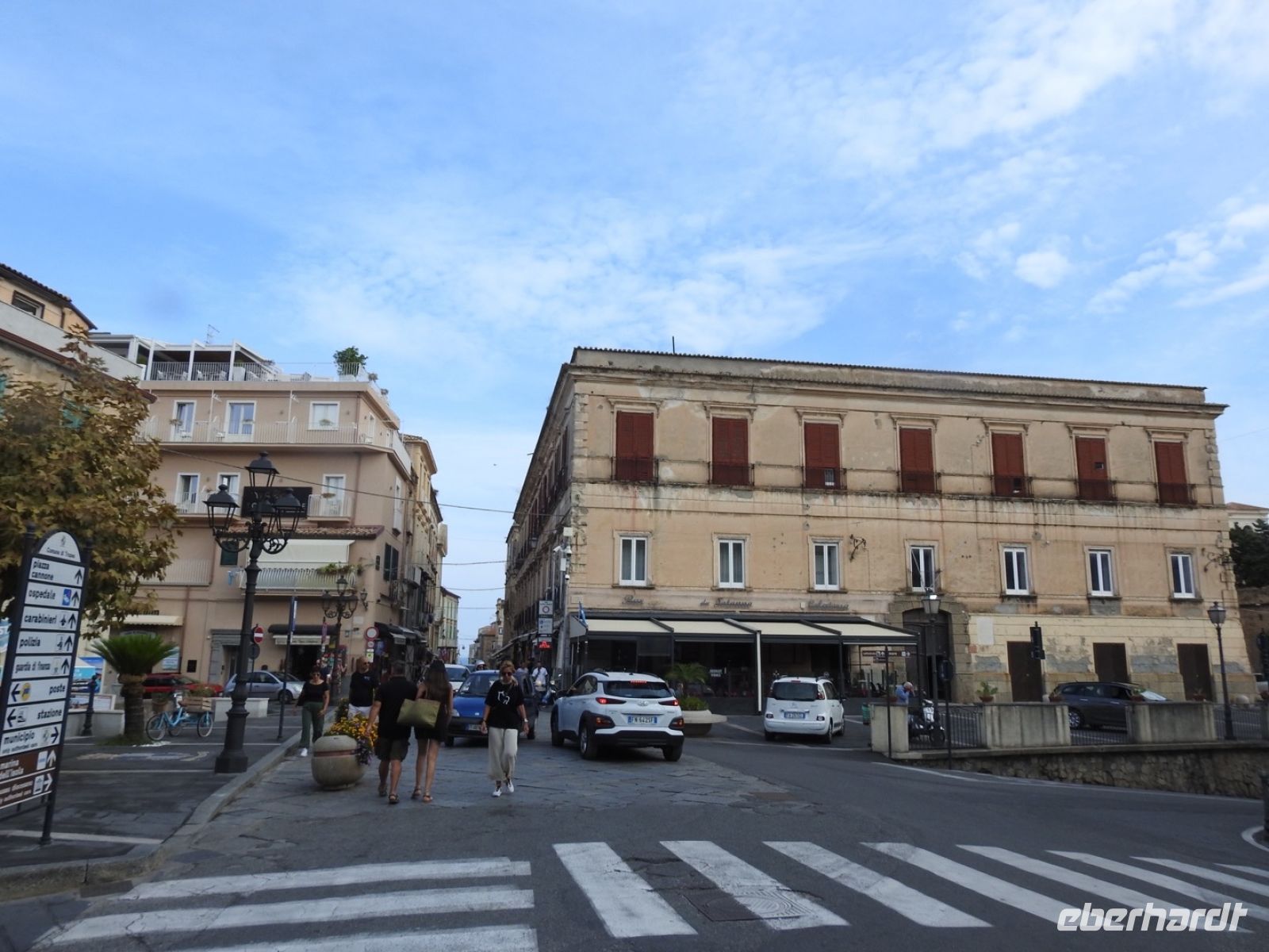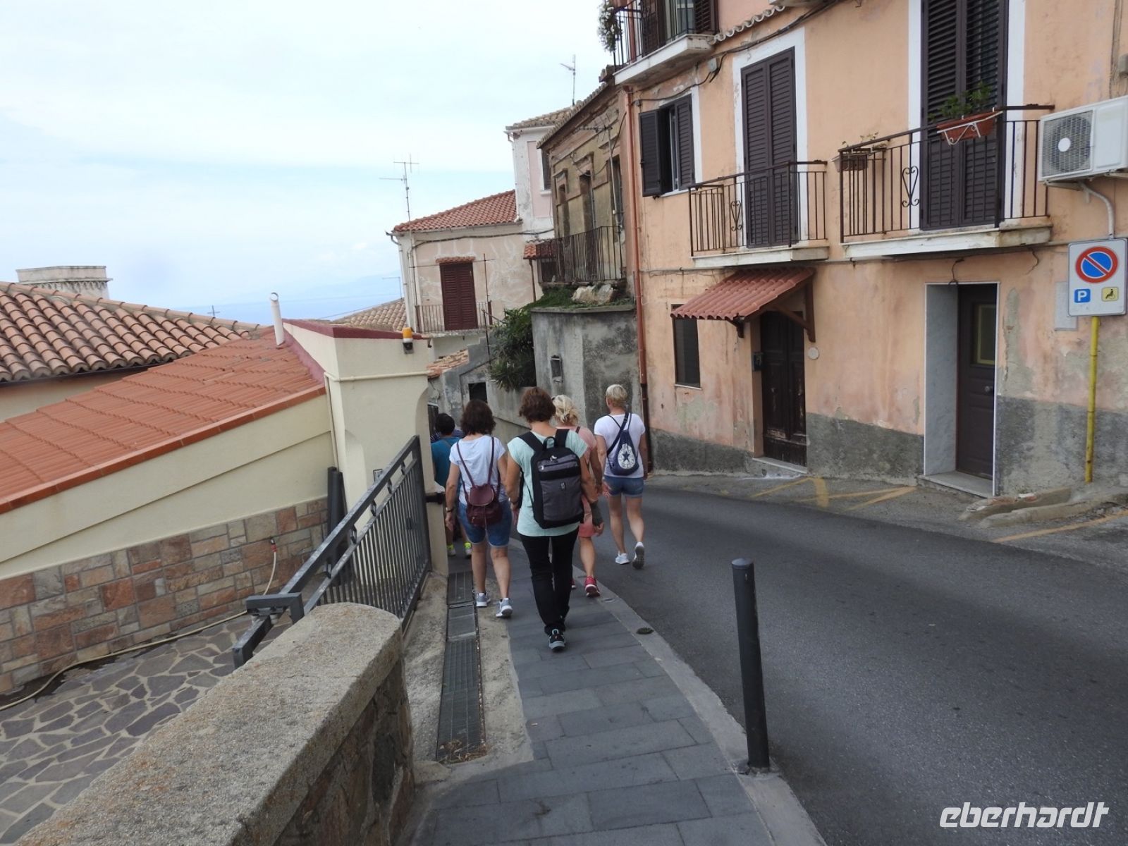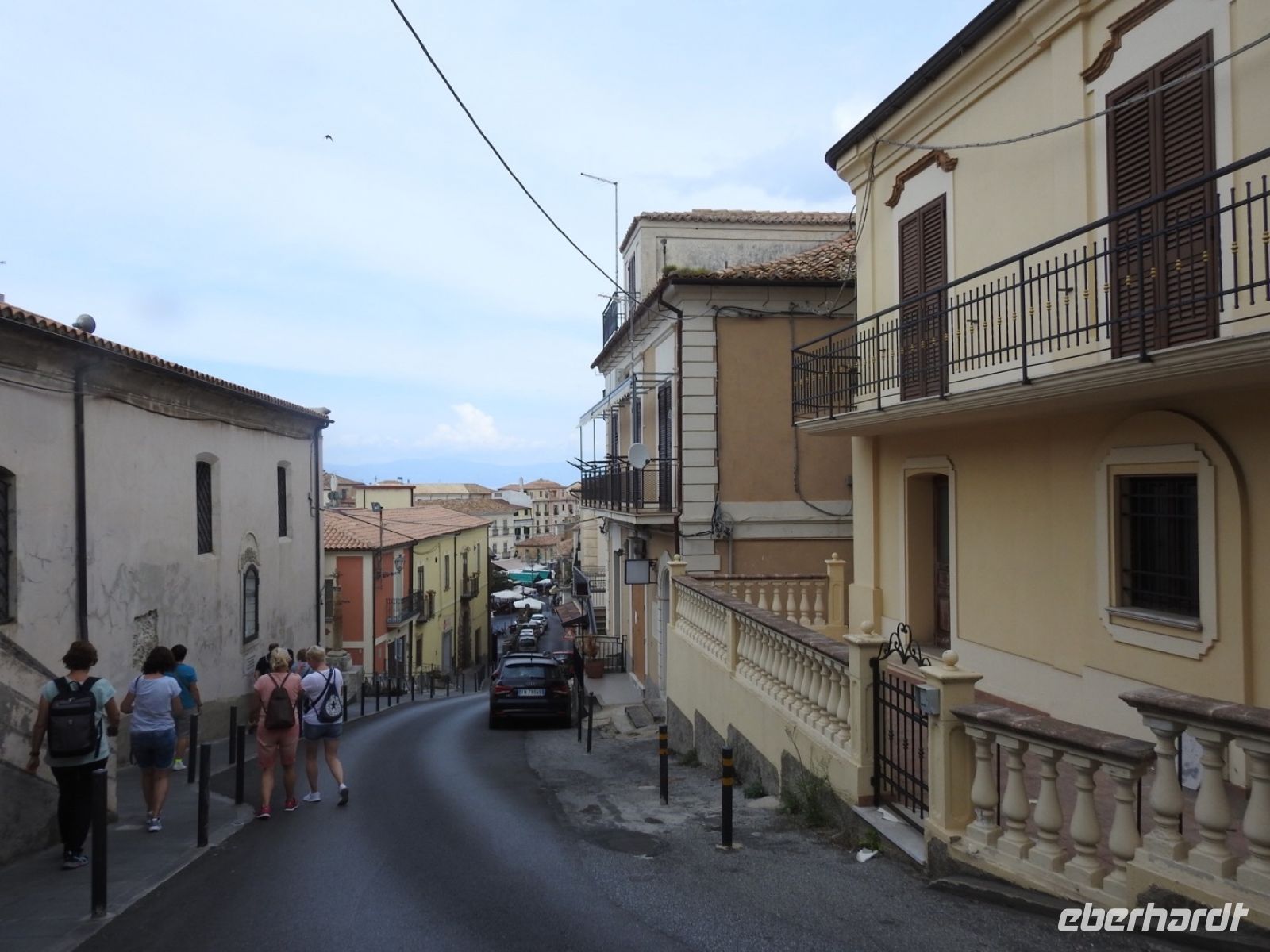 Nicotera erblicken wir zunächst von oben. Ein kilometerlanger Sandstrand säumt die Küste. Im Städtchen angekommen, erwartet uns eine normannische Burg - das Castello Ruffo, welches jedoch nur von außen besichtigt werden kann. Weiter spazieren wir durch das ehemalige jüdische Viertel. Viele verwinkelte Gassen zeugen von einstigem regen Leben. Heute ist es still hier. Seit der Pandemie ist der Montag ein Ruhetag und alle Läden sind geschlossen. So verwundert es nicht, dass die eineinhalb Stunden Freizeit, die uns Nadia einräumt, nicht willkommen sind. Wir entdecken eine geöffnete Post. Es dauert eine gefühlte Ewigkeit, bis wir zu den gewünschten Briefmarken kommen. Wir schlendern weiter durch die Gassen, besuchen zwei Kirchen und entdecken, dass die bäuerliche Ausstellung im Rathaus zu besichtigen ist. Anschließend kehren wir zurück zum zentralen Platz und ein in das einzig vorhandene Café. Eberhardt lädt uns ein, die lokale Spezialität Cremolata di Fragole zu verkosten. Hierbei handelt es sich um ein kaltes Getränk mit gestoßenem Eis und Erdbeergeschmack. Die Hungrigen bestellen sich Panini dazu.