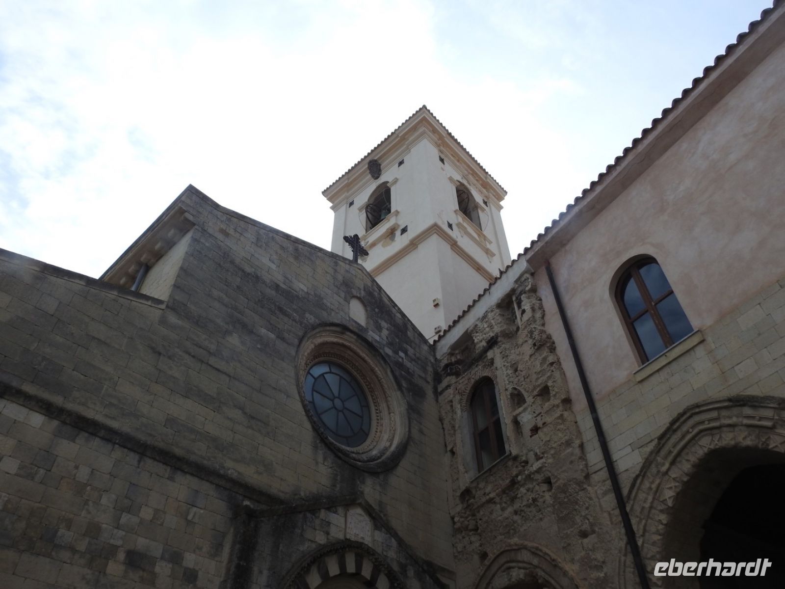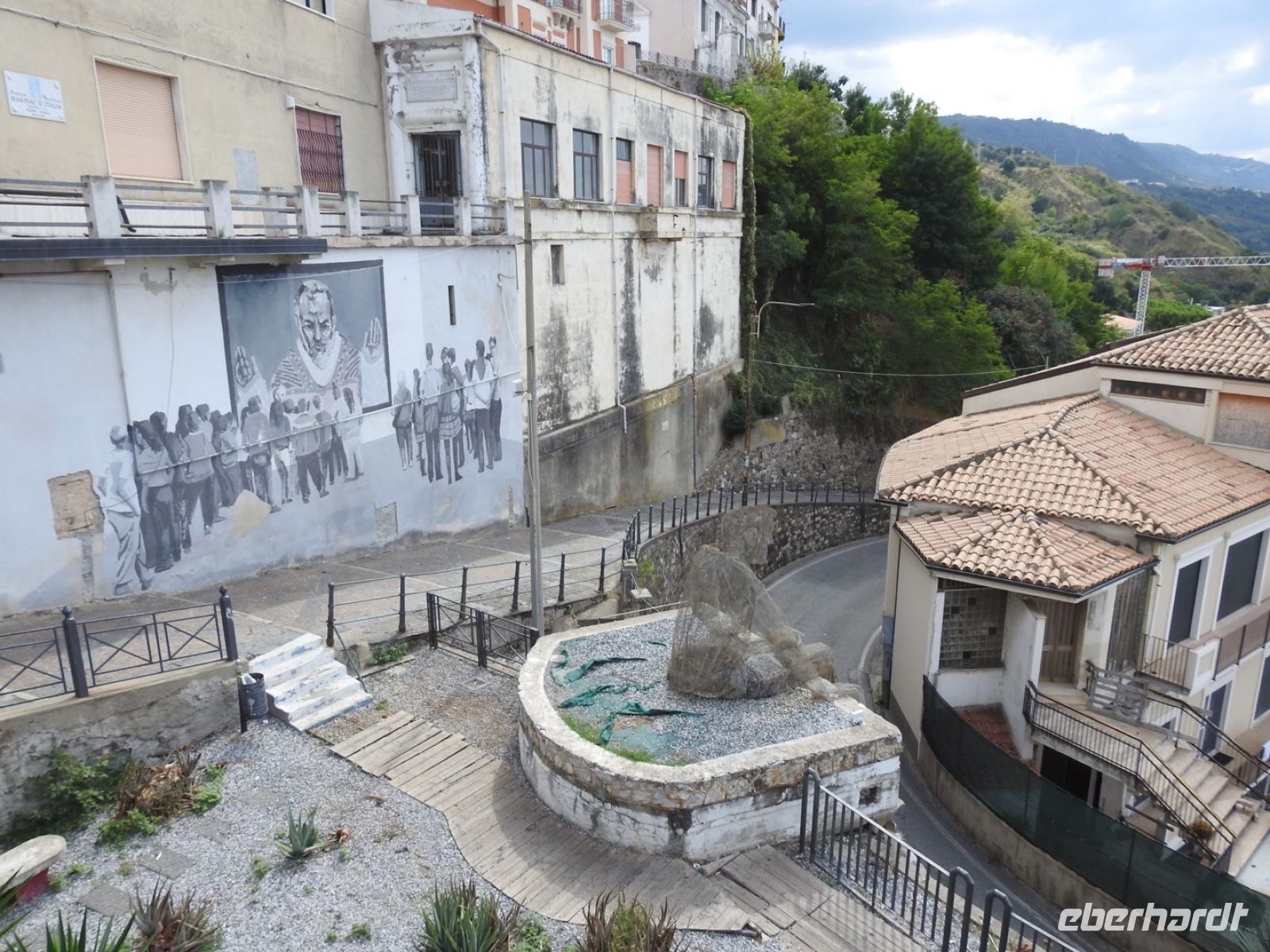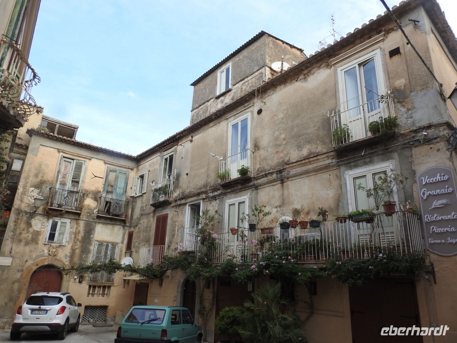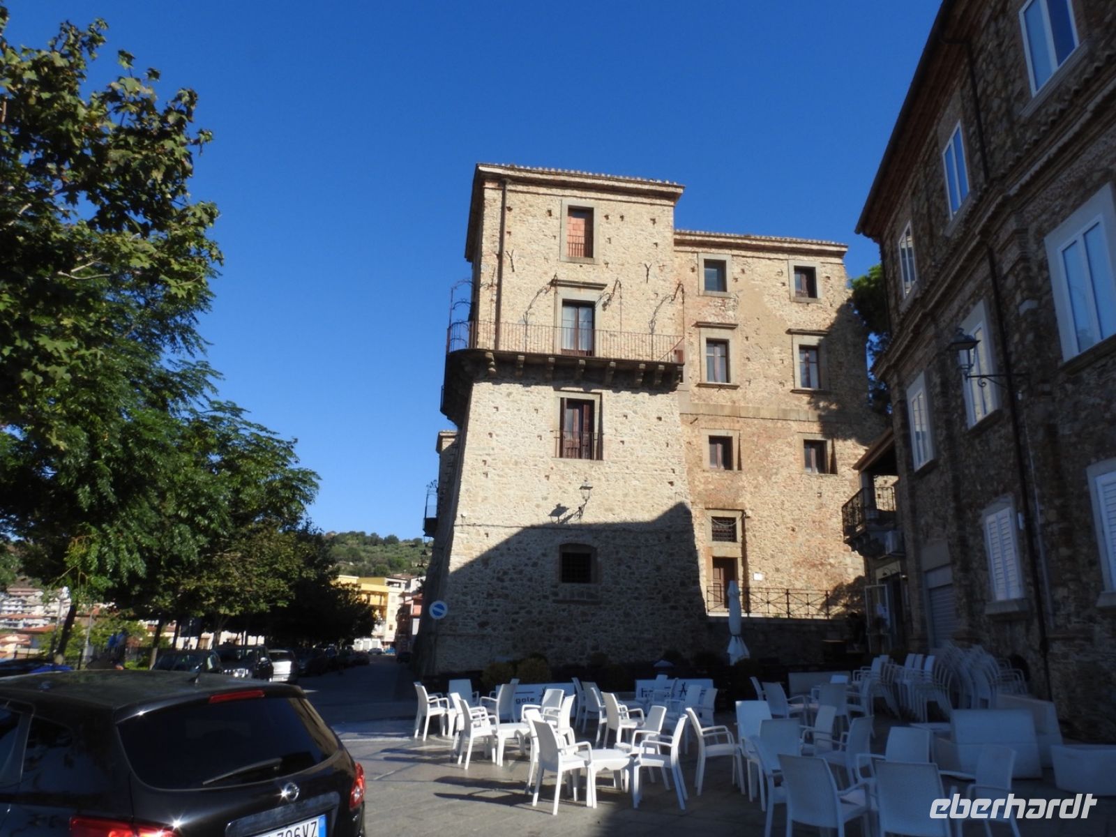 Nicotera erblicken wir zunächst von oben. Ein kilometerlanger Sandstrand säumt die Küste. Im Städtchen angekommen, erwartet uns eine normannische Burg - das Castello Ruffo, welches jedoch nur von außen besichtigt werden kann. Weiter spazieren wir durch das ehemalige jüdische Viertel. Viele verwinkelte Gassen zeugen von einstigem regen Leben. Heute ist es still hier. Seit der Pandemie ist der Montag ein Ruhetag und alle Läden sind geschlossen. So verwundert es nicht, dass die eineinhalb Stunden Freizeit, die uns Nadia einräumt, nicht willkommen sind. Wir entdecken eine geöffnete Post. Es dauert eine gefühlte Ewigkeit, bis wir zu den gewünschten Briefmarken kommen. Wir schlendern weiter durch die Gassen, besuchen zwei Kirchen und entdecken, dass die bäuerliche Ausstellung im Rathaus zu besichtigen ist. Anschließend kehren wir zurück zum zentralen Platz und ein in das einzig vorhandene Café. Eberhardt lädt uns ein, die lokale Spezialität Cremolata di Fragole zu verkosten. Hierbei handelt es sich um ein kaltes Getränk mit gestoßenem Eis und Erdbeergeschmack. Die Hungrigen bestellen sich Panini dazu.
