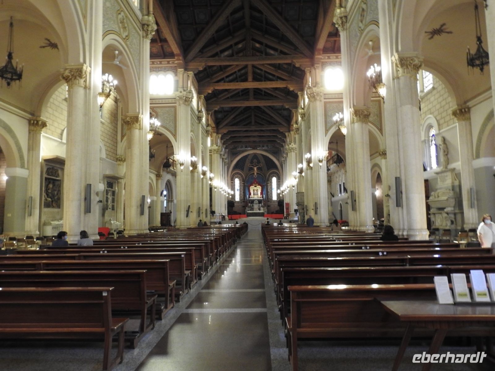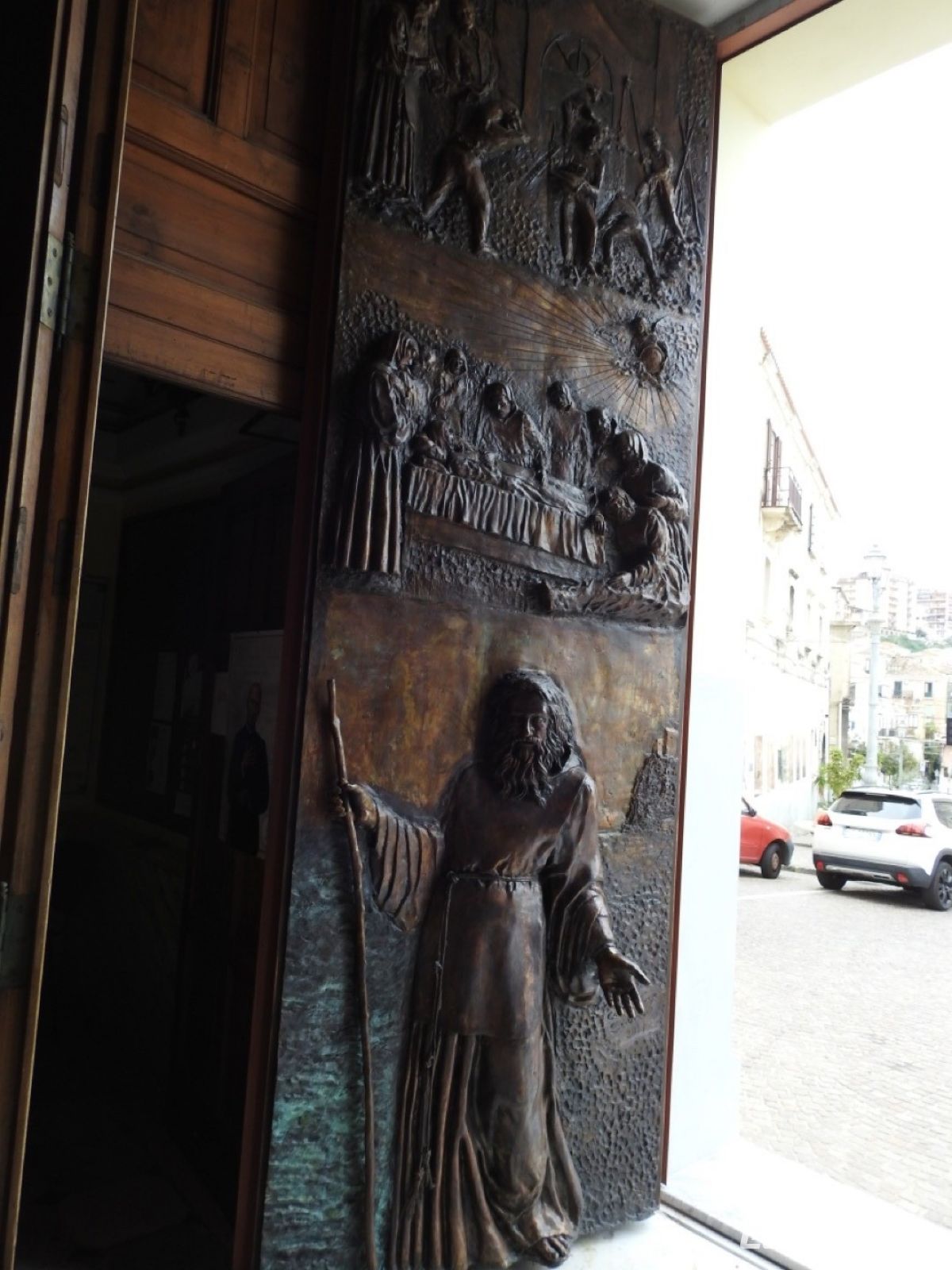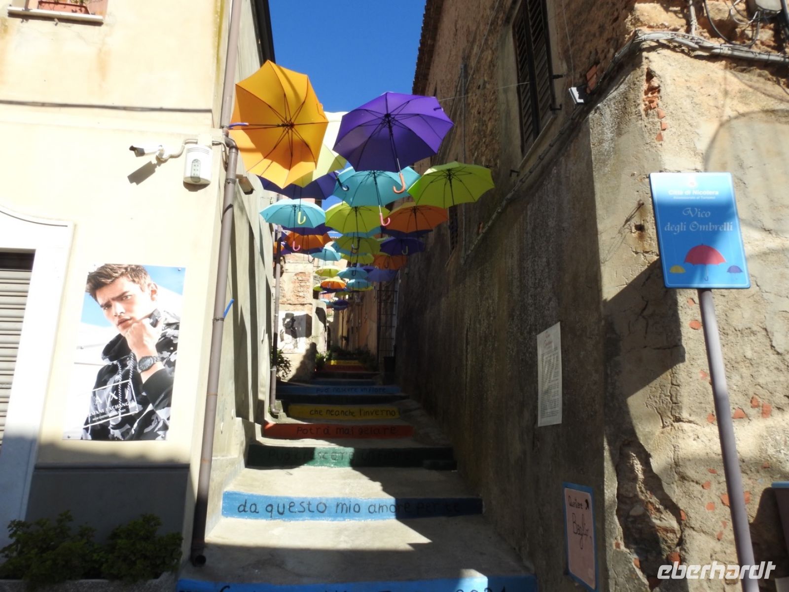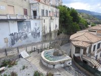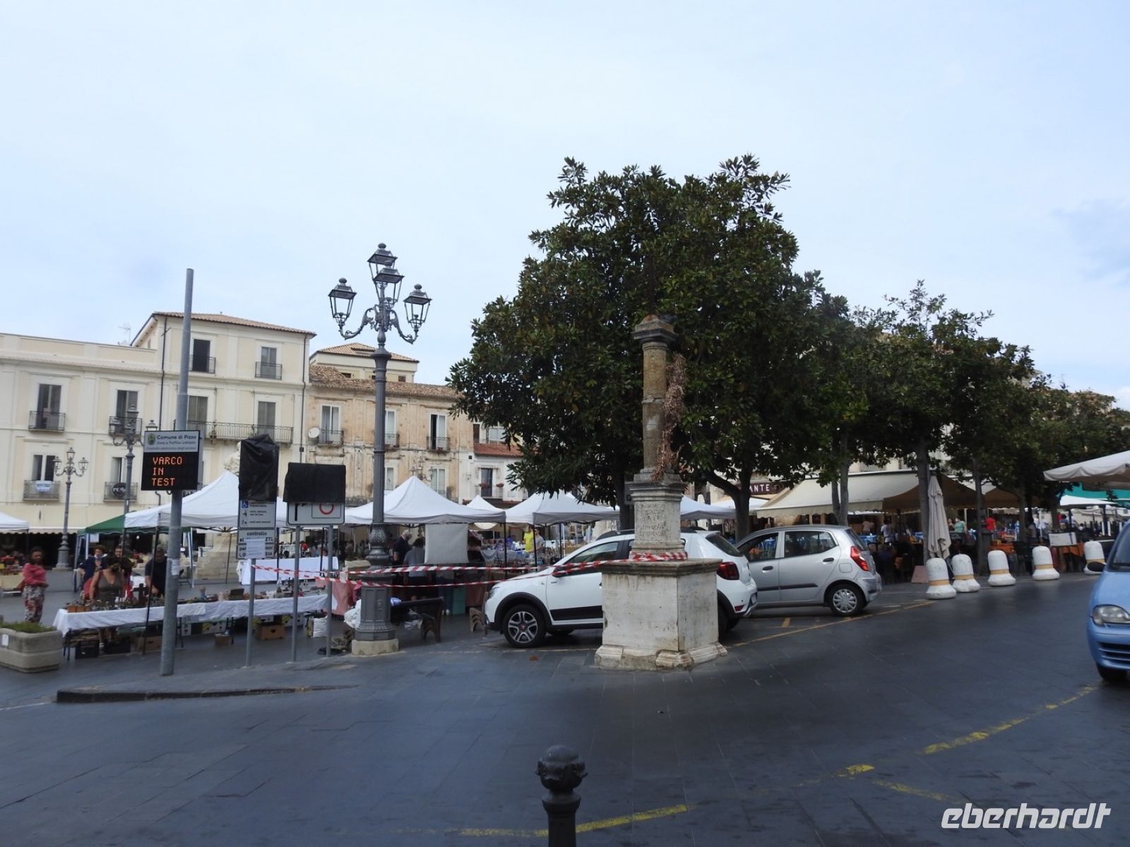 Nicotera erblicken wir zunächst von oben. Ein kilometerlanger Sandstrand säumt die Küste. Im Städtchen angekommen, erwartet uns eine normannische Burg - das Castello Ruffo, welches jedoch nur von außen besichtigt werden kann. Weiter spazieren wir durch das ehemalige jüdische Viertel. Viele verwinkelte Gassen zeugen von einstigem regen Leben. Heute ist es still hier. Seit der Pandemie ist der Montag ein Ruhetag und alle Läden sind geschlossen. So verwundert es nicht, dass die eineinhalb Stunden Freizeit, die uns Nadia einräumt, nicht willkommen sind. Wir entdecken eine geöffnete Post. Es dauert eine gefühlte Ewigkeit, bis wir zu den gewünschten Briefmarken kommen. Wir schlendern weiter durch die Gassen, besuchen zwei Kirchen und entdecken, dass die bäuerliche Ausstellung im Rathaus zu besichtigen ist. Anschließend kehren wir zurück zum zentralen Platz und ein in das einzig vorhandene Café. Eberhardt lädt uns ein, die lokale Spezialität Cremolata di Fragole zu verkosten. Hierbei handelt es sich um ein kaltes Getränk mit gestoßenem Eis und Erdbeergeschmack. Die Hungrigen bestellen sich Panini dazu.