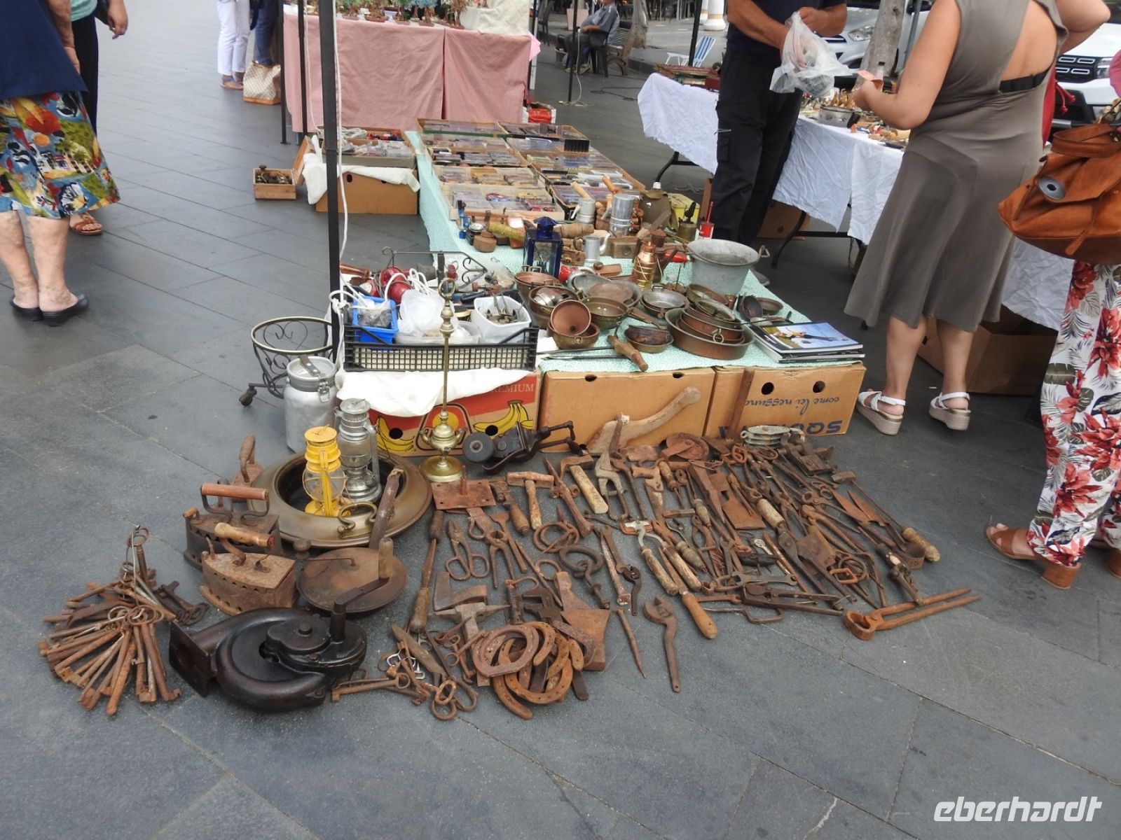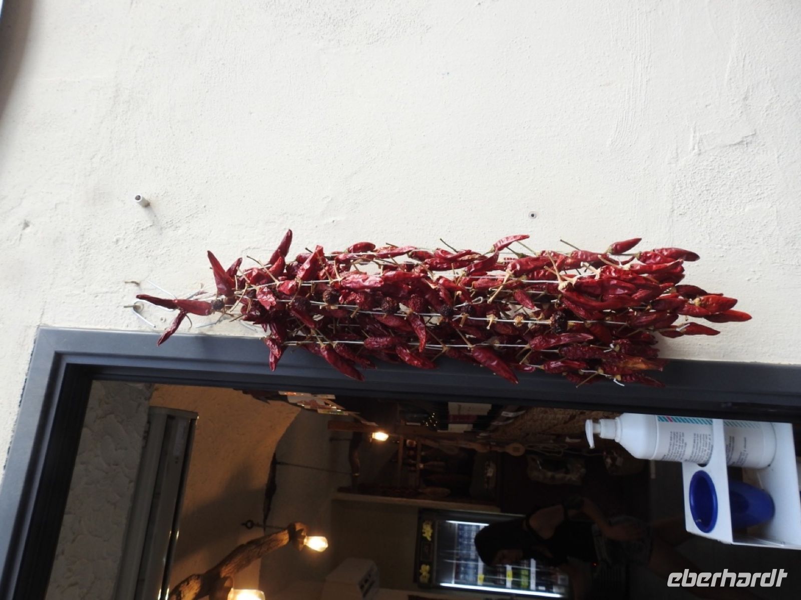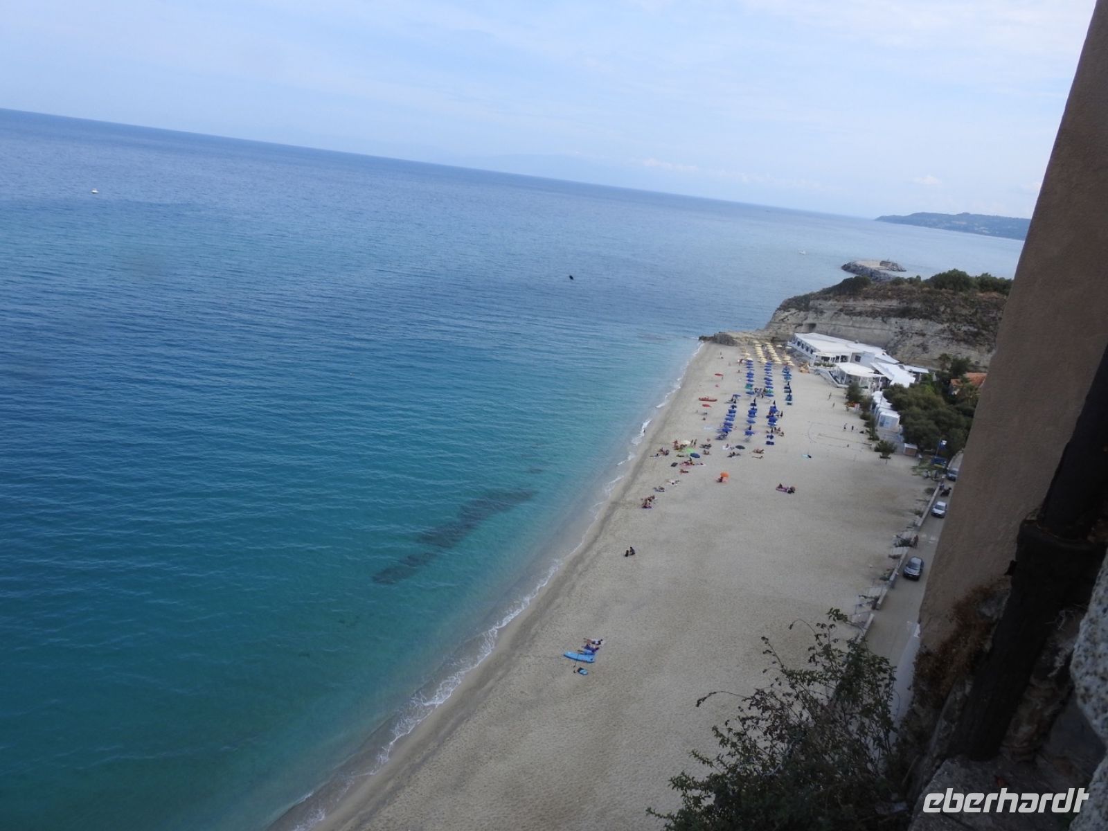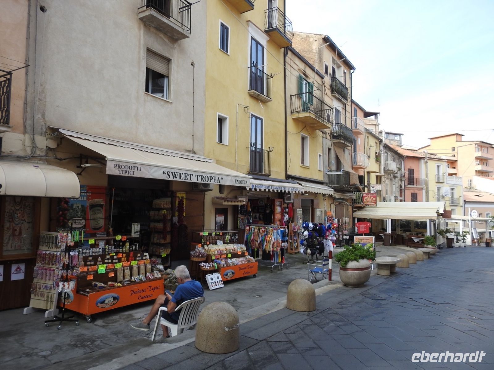 Da die geplante Wanderung nicht stattfindet, haben wir beschlossen, noch einmal nach Tropea zu fahren. Erst einmal heißt es ausschlafen, es regnet und nichts zieht uns nach draußen. Optimistisch treffen wir uns halb elf an der Rezeption und als wir nach einer Viertel Stunde Tropea erreichen, hat der Regen nachgelassen und hört schließlich ganz auf. Wir schlendern durch die Gassen und schnuppern in jeden Laden. Tücher, Blusen, lokale Lebensmittel und diverse Souvenire wandern in unsere Taschen. Mittags treffen wir uns und kehren gemeinsam in eine Pizzeria ein. Die Nudelportionen sind übersichtlich, der Mann am Nachbartisch bekommt eine größere Portion. Warum, wissen wir nicht. Die große Überraschung kommt beim Bezahlen. Wir bekommen eine gemeinsame Rechnung und nachdem alle (ehrlich) ihr Geld bereit gelegt haben, fehlen über zehn Euro. Wie kann das sein? Des Rätsels Lösung ist italienisch. Früher, als noch Pilger durch die Raststätten zogen, brachten diese ihr eigenes Essen mit, das sie von gutwilligen Leuten gespendet bekamen. Damit aber die Gasthöfe überhaupt etwas verdienen konnten, wurde eingeführt, Geld für das Besteck in Rechnung zu stellen. Und diese Tradition hat sich in einigen Gaststätten bis heute erhalten. Nadia hatte uns davon erzählt und so können wir schnell herausfinden, warum in unserer Bezahlung das Geld fehlt. Also, jeder nochmal 2 € und die Sache ist erledigt.
