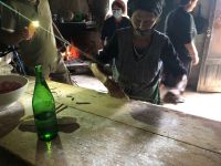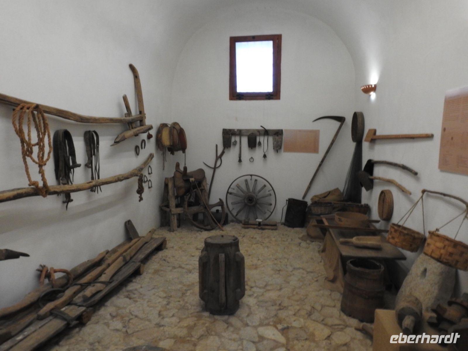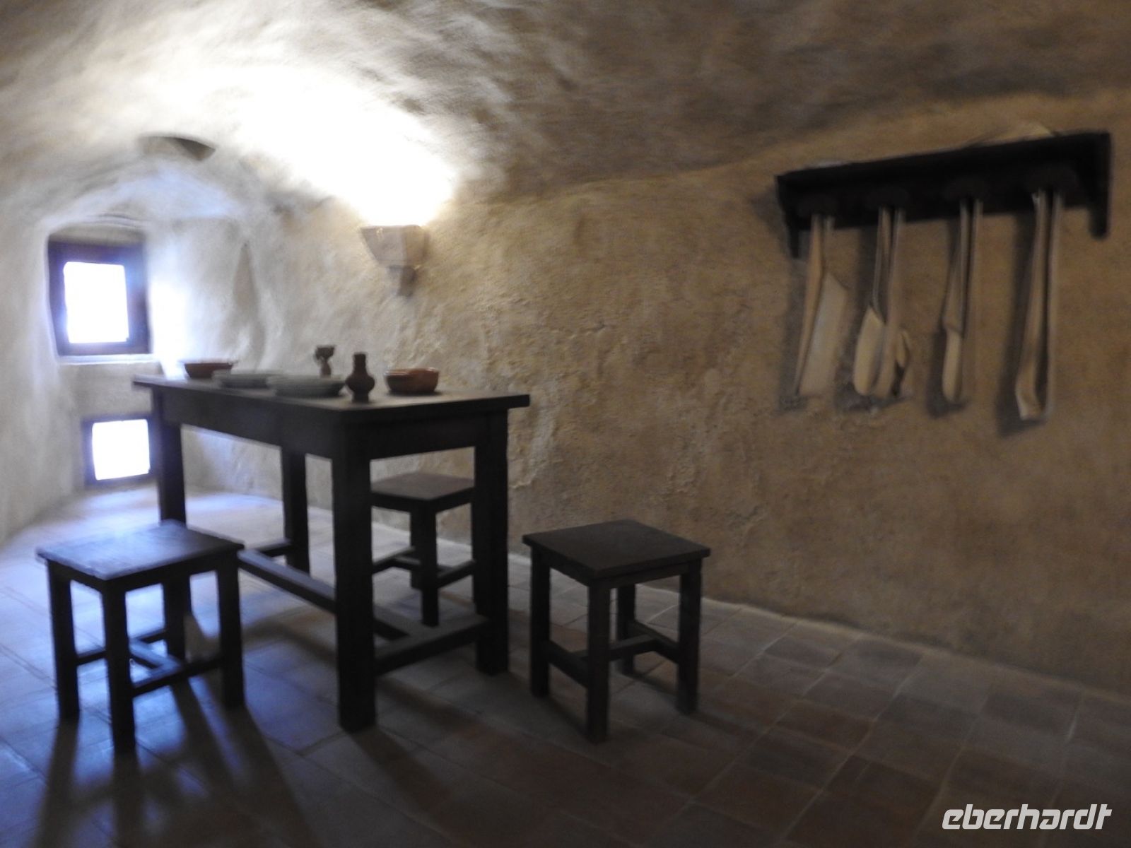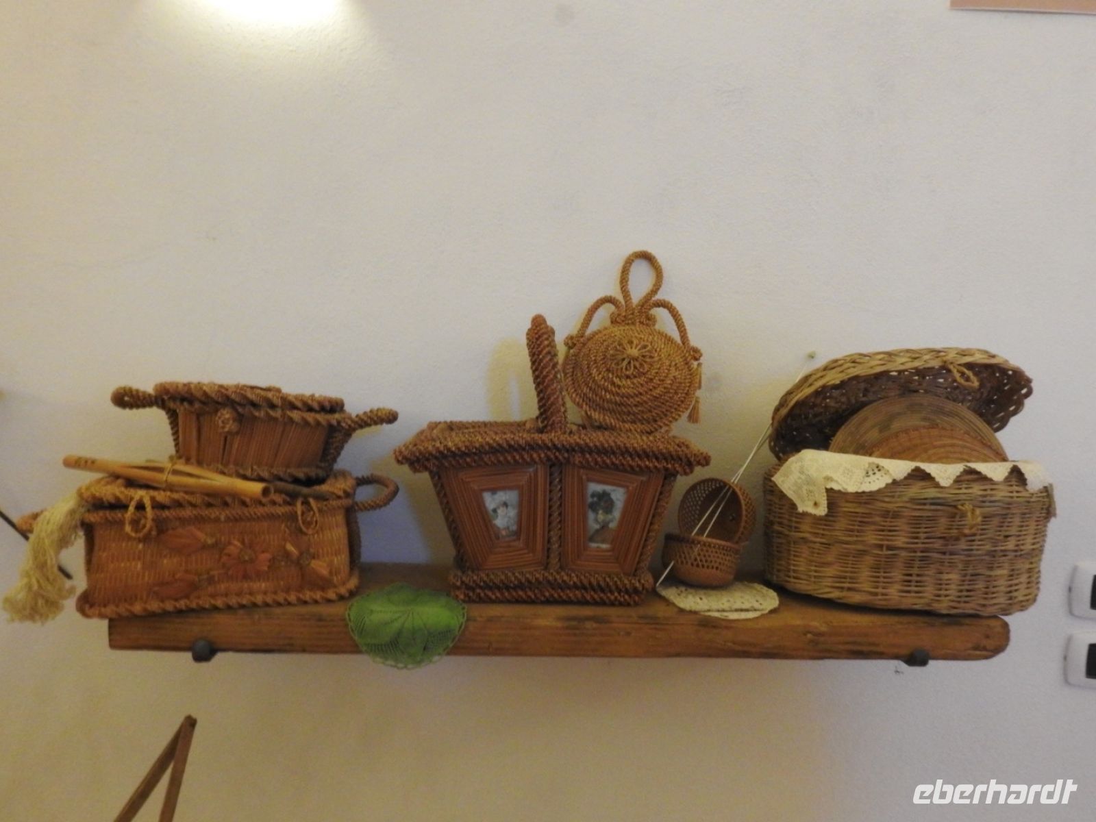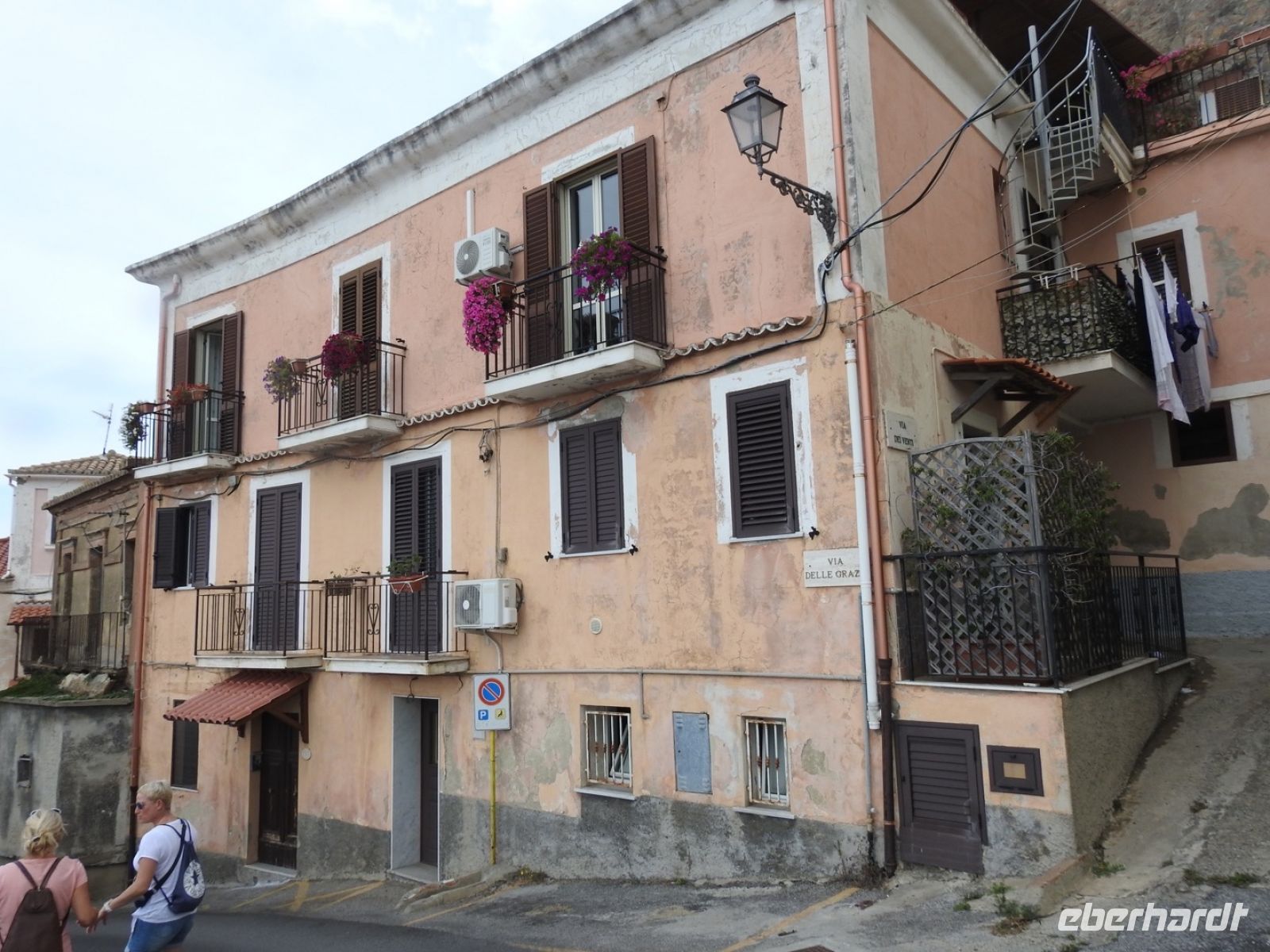 Das Wetter meint es in dieser Woche nicht so gut mit uns. Besser gesagt, die Wettervorhersage. Für heute sind 100 Prozent Regen angesagt. Und wie es hier regnen kann, davon haben wir schon an manchem Abend einen Vorgeschmack bekommen. So entscheiden wir, schweren Herzens, auch diese Wanderung abzusagen. Eberhardt TRAVEL und die örtliche Agentur haben aber einen Plan B für uns vorbereitet. Unser Guide heute ist Mimmo, ein sympathischer lustiger Kalabrese. Wir sind kaum eine Viertel Stunde unterwegs, da legen wir bereits die erste technische Pause ein. In Italien ist es (wie übrigens auch in anderen Ländern) nicht üblich, dass man einfach in ein Restaurant oder Café geht und dort die Toilette benutzt, auch nicht gegen Bezahlung. Sondern man bestellt einen Espresso oder ein anderes Getränk oder was man möchte und dann ist es auch kein Problem. Wir kehren also in eine kleine Konditorei ein, bestellen Cappuccino und Espresso und bekommen sogar einen Teller Kekse spendiert. Der Besuch des Örtchens ist damit inklusive. Mimmo kennt hier scheinbar alle. Jeder wird gegrüßt und in ein Schwätzchen verwickelt. Wir erreichen einen Laden, in dem bereits Häppchen vorbereitet sind. Oh! Aber noch ist es nicht so weit. Erst steht ein Spaziergang durch Zungri auf dem Programm. Zungri ist eine kleine Stadt im kalabresischen Hinterland. Die Häuser haben süditalienischen Charme, soll heißen, eher nicht renoviert, zumindest nicht von außen. Dafür sind hier die Häuser allerdings mit Figuren geschmückt. Vögel, Schmetterlinge, Pilze... Also ein Kind würde sich hier nicht verlaufen. Hübsch. Der Spaziergang endet am Eingang zur Höhlenstadt. Bis ins 14. Jahrhundert wohnten Menschen in diesen in den Sandstein gehauenen Höhlen. Zum Glück müssen wir nicht mehr auf den ursprünglichen Treppenstufen hinunter- und wieder hinaufbalancieren. Für Besucher der Neuzeit ist eine touristenfreundliche Metalltreppe gebaut. Am Ein- bzw. Ausgang befindet sich ein Museum. Mimmo erläutert uns die einzelnen Ausstellungsstücke, die den Alltag der Bewohner der Region nachempfinden lassen. Nun erwartet uns der Höhepunkt des Tages. Wir sind bei Anna zum Nudelessen eingeladen. Fileya ist eine spezielle Nudelsorte der Region und nach dem Essen zeigt uns Anna, wie die Nudeln hergestellt werden.