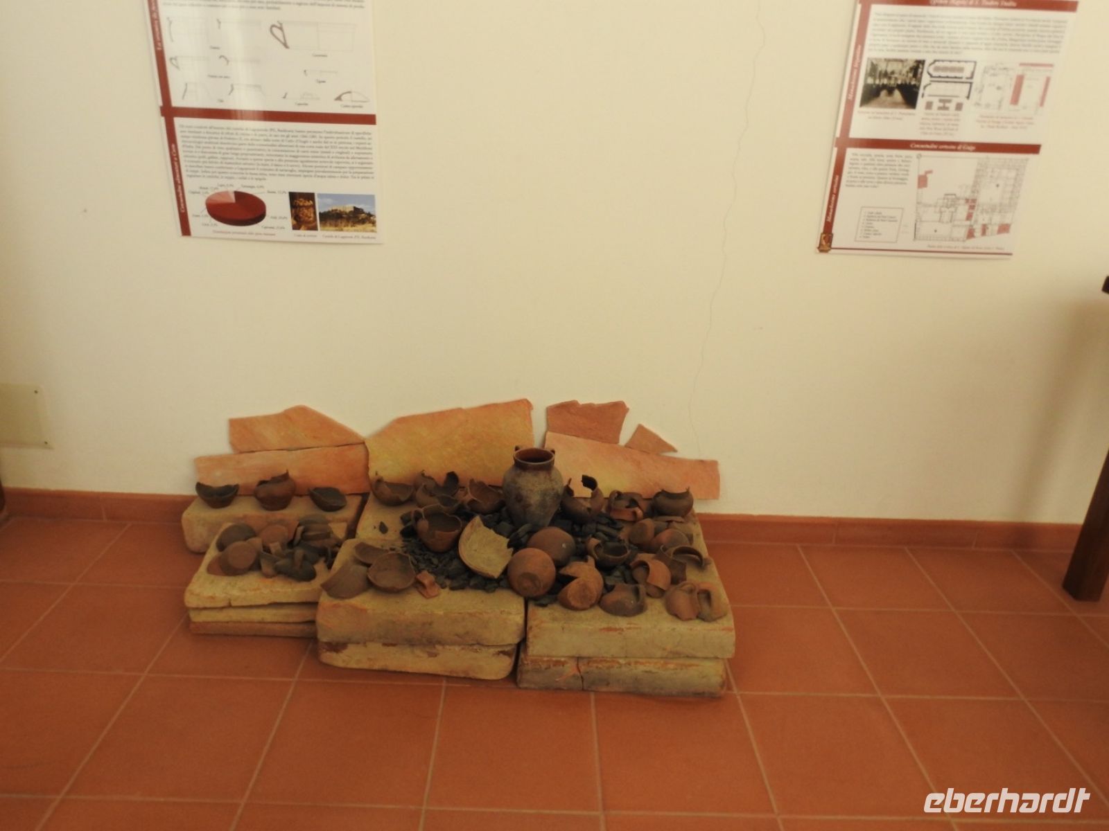 Und was gibt es noch Besonderes zu sehen? Die berühmten Pinakes von Locri. Hierbei handelt es sich um Tontafeln aus dem 7. bis 4. Jahrhundert vor unserer Zeit. Auf den Tafeln sind Alltagsszenen der Menschen und/oder der Götter dargestellt. Die Tafeln wurden an Bäumen aufgehängt und galten als Glücksbringer. Am Ende einer Saison oder eines Jahres wurden sie zerschlagen und vergraben. Eine Pinax konnte nicht zweimal verwendet werden. Achttausend Stück wurden bei Ausgrabungen gefunden. Nur wenige sind davon übrig. Warum? Das weiß Nadia zu erzählen.