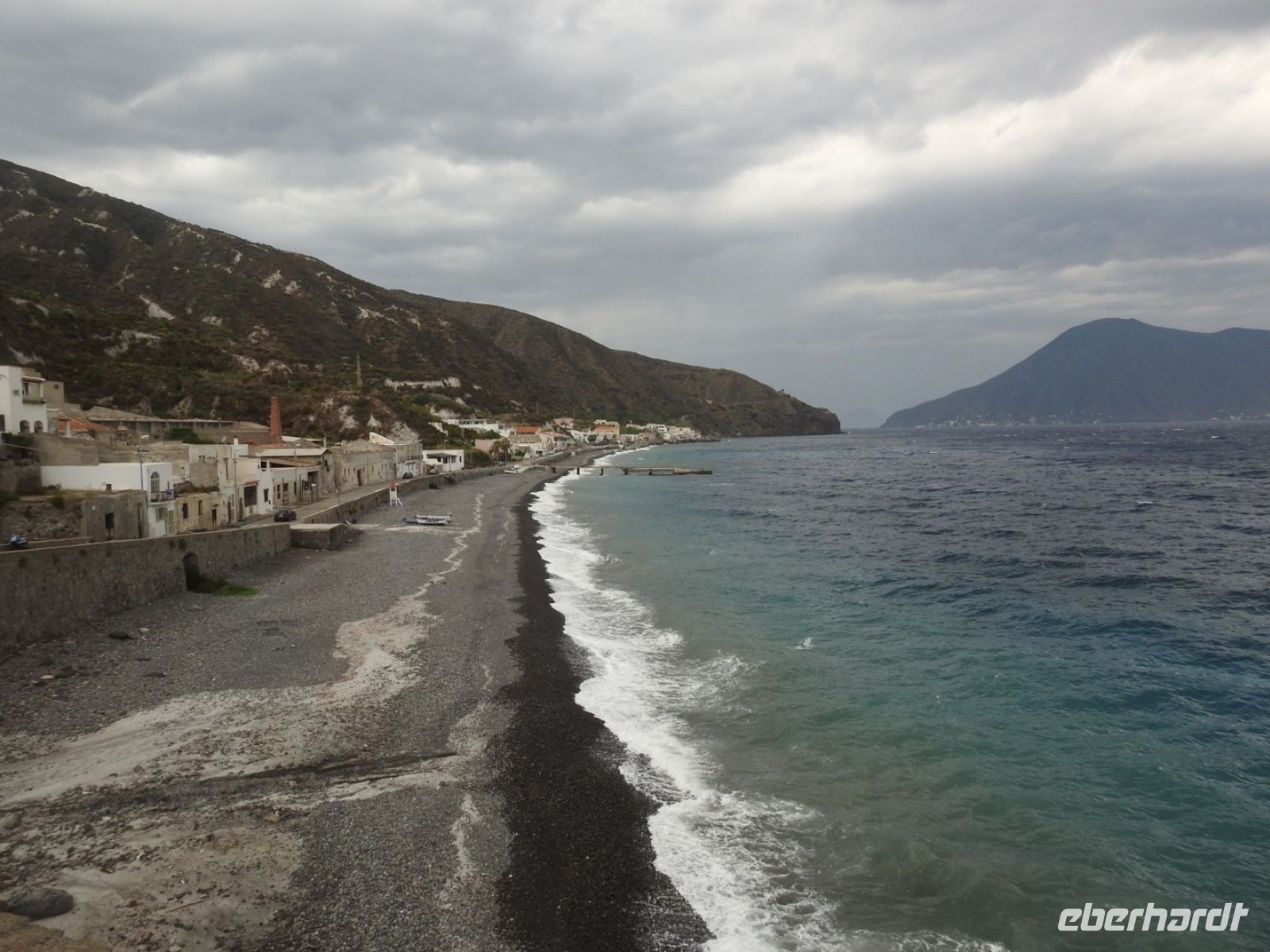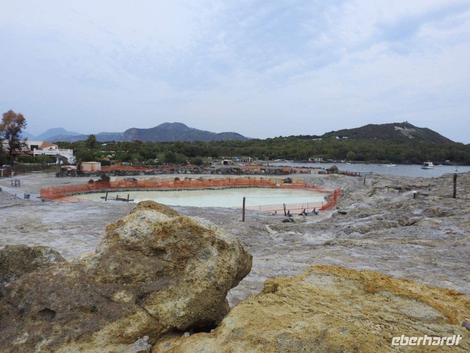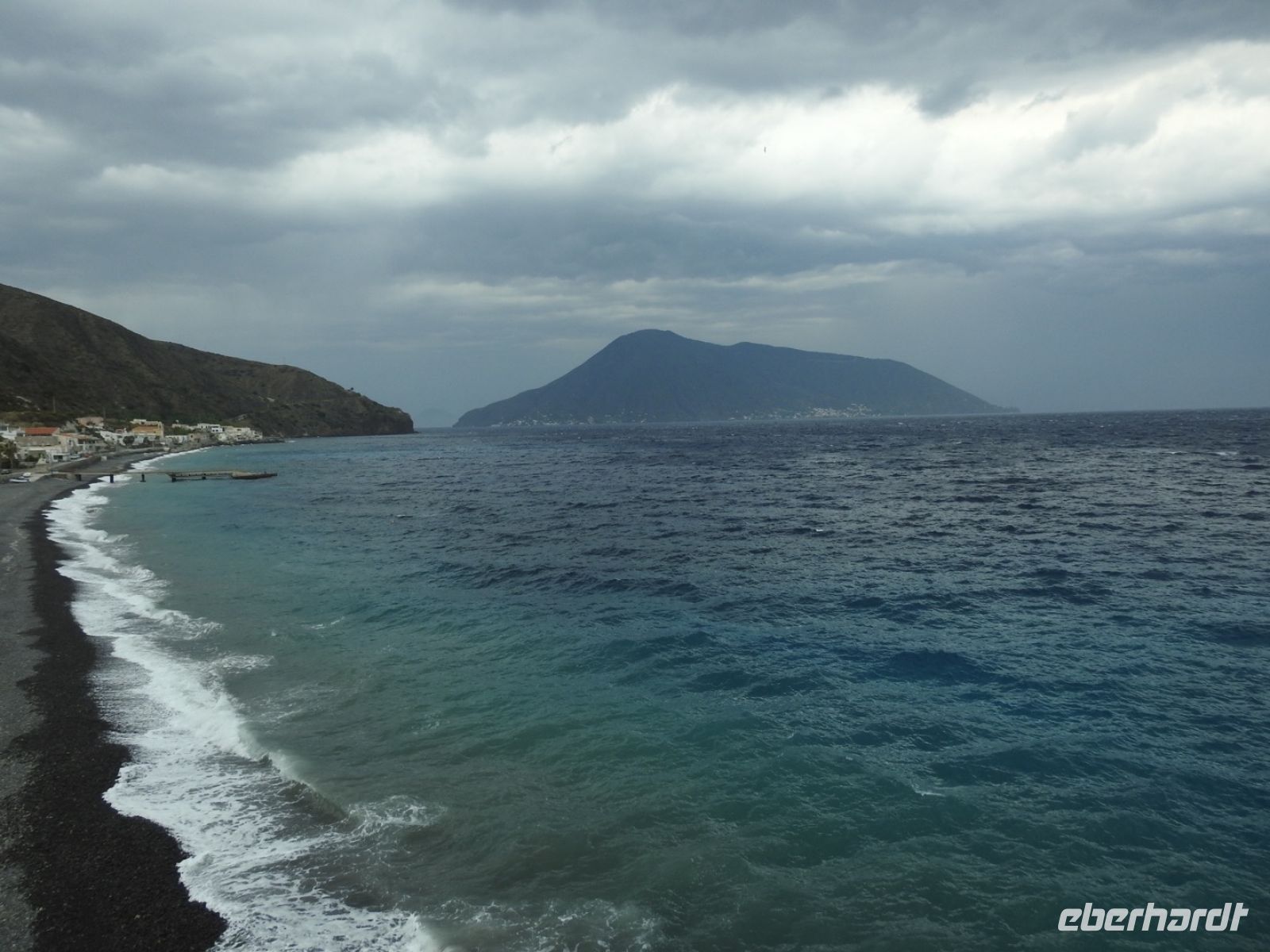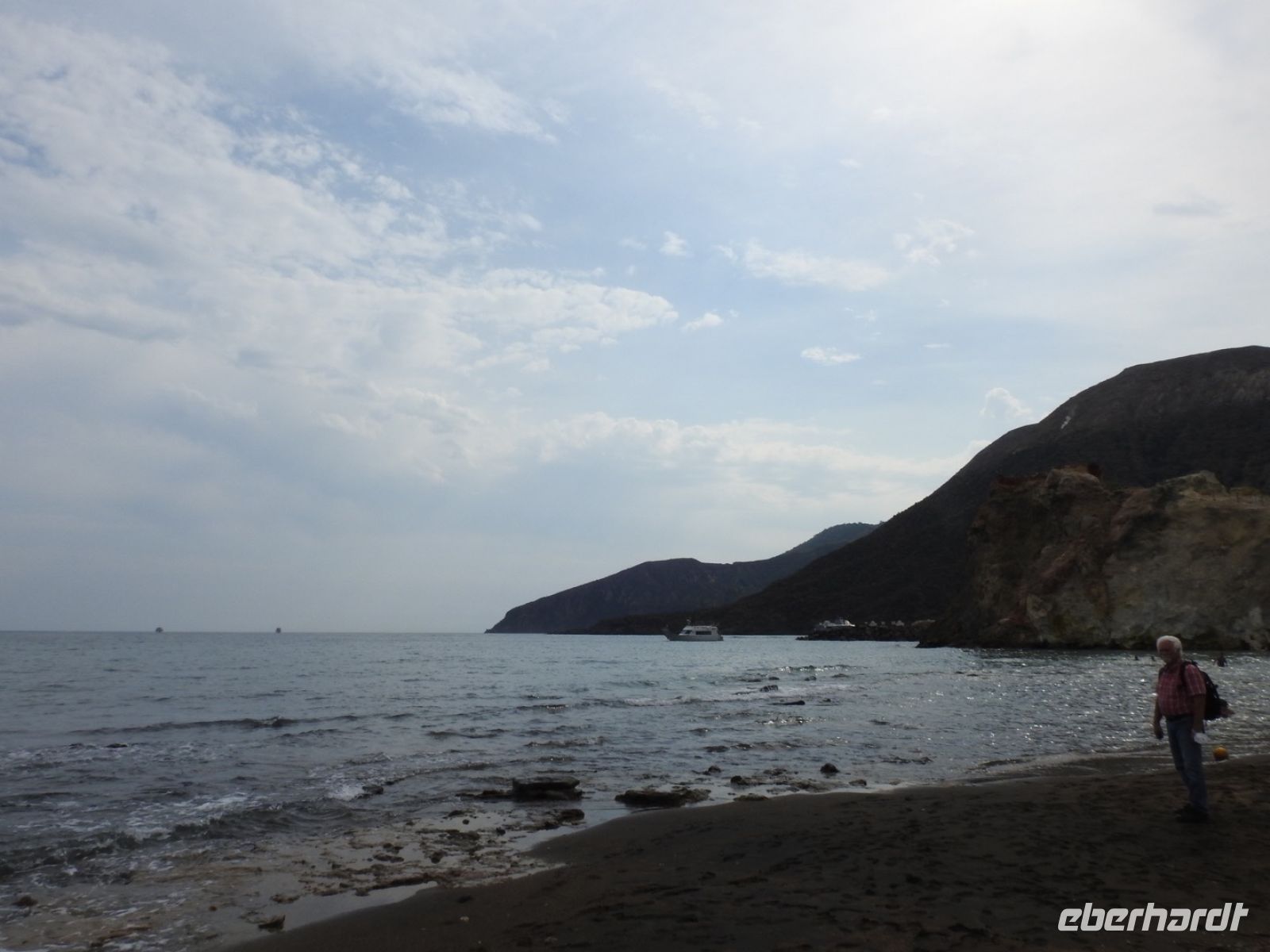 Heute müssen wir zeitig los. Bereits um 6.00 Uhr wird das Frühstücksbuffet für uns eröffnet. Eine halbe Stunde später bringt uns der Shuttlebus hinauf zur Straße. Von hier aus fahren wir mit anderen Gästen zum Hafen. Das Schiff, die Prinzess II ist bereits gut besetzt, wir finden nur noch Platz im Innenraum. Das dies nicht zu unserem Nachteil ist, zeigt sich später, als pitschnasse Gäste vom Oberdeck nach unten flüchten. Die See ist rau und nicht allen geht es gut. Bis Vulcano benötigen wir fast drei Stunden. Dort angekommen, können wir entweder rechts lang zu den Schwefelschlammbädern und zum schwarzen Sandstrand gehen oder aber nach links, an Souvernirständen vorbei bis zum Zentrum, wo es ein einziges Café gibt. Letztendlich ist es egal, es ist ein Rundweg, der so oder so zurück zum Hafen führt. Für die Wanderung auf den Vulkan reicht die Zeit nicht. Wir bummeln also bis zum Café, unterwegs werden Badeschuhe und Ansichtskarten gekauft. Im Café führt ein Missverständnis dazu, dass wir anstatt der bestellten Eiscreme, eine lokale Art von Eiskaffee - namens Granita - verkauft bekommen, die wir schließlich auch verkosten (sehr kalt und sehr süß).