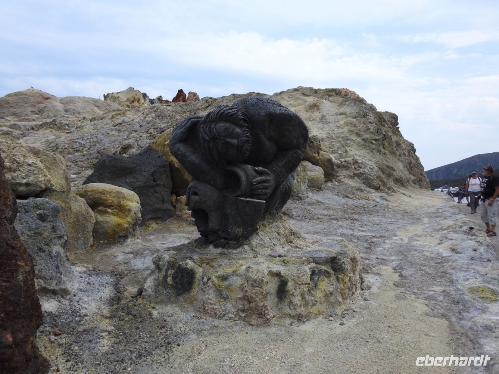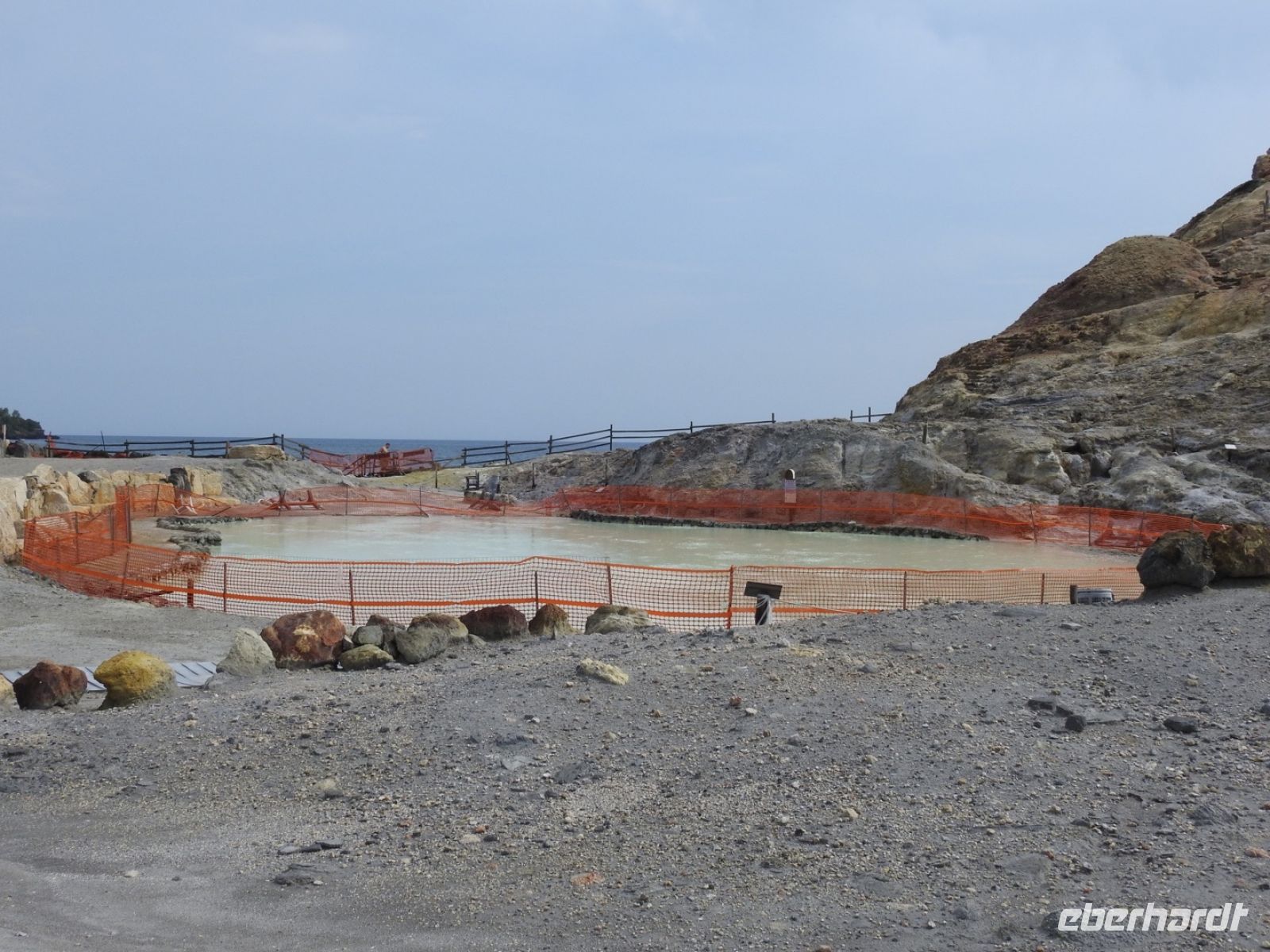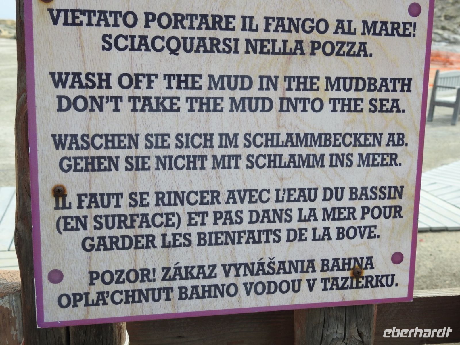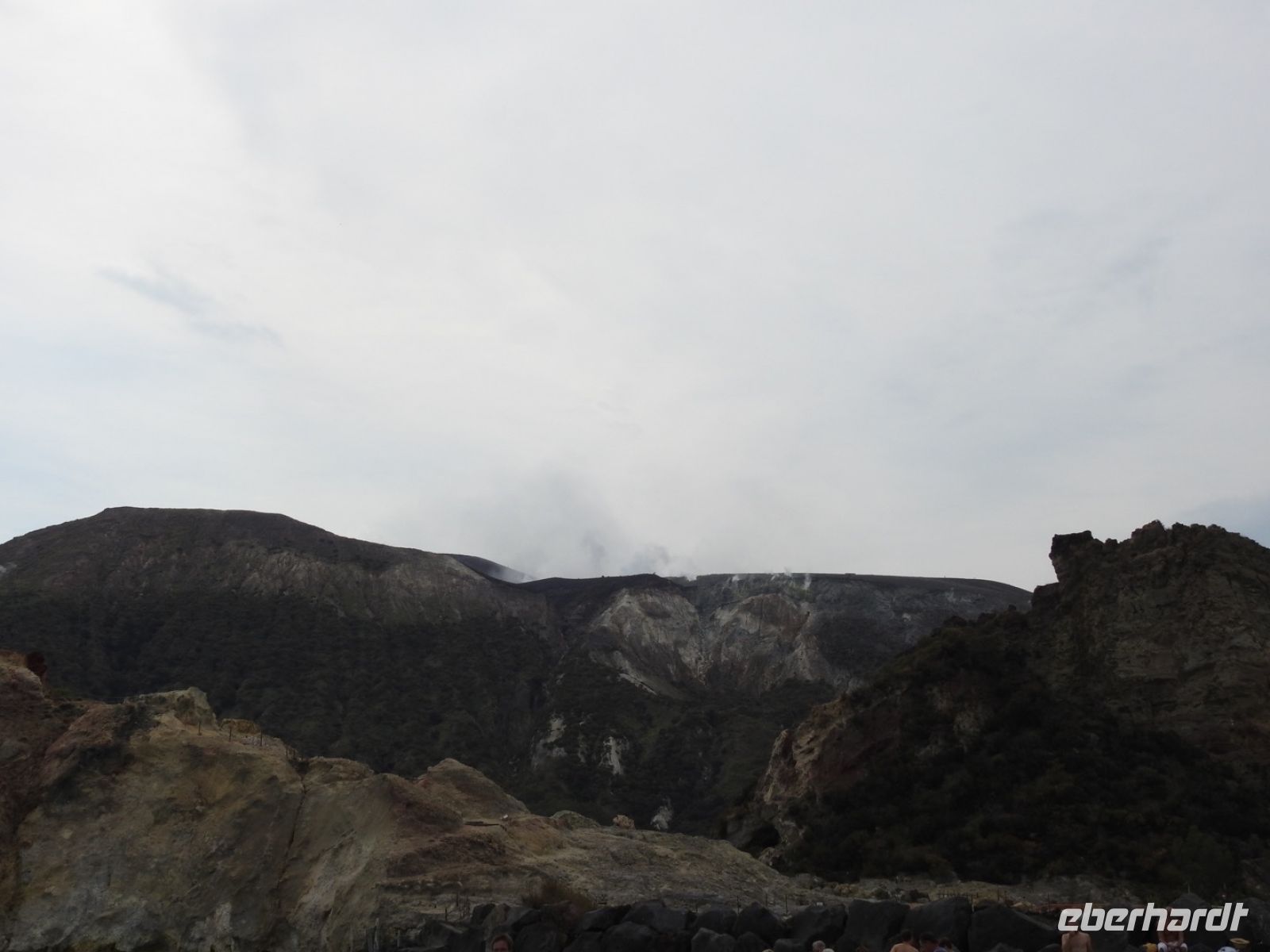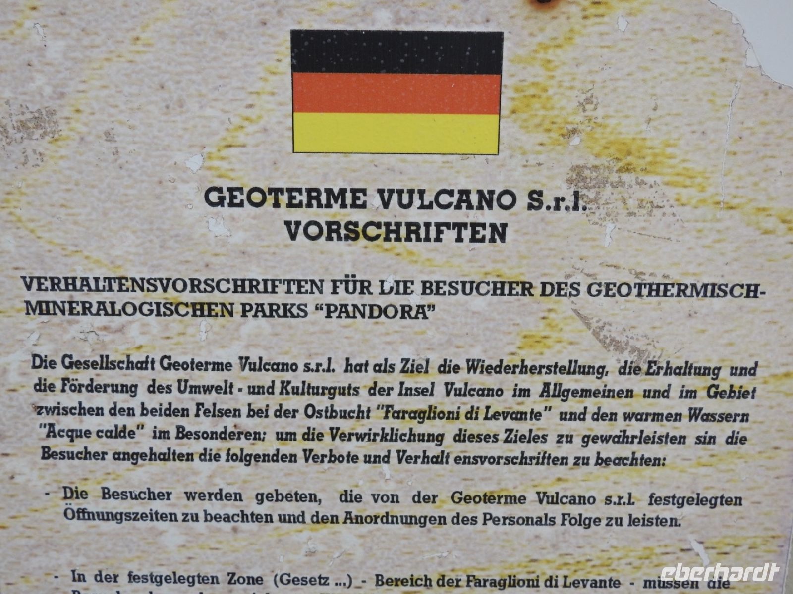 Heute müssen wir zeitig los. Bereits um 6.00 Uhr wird das Frühstücksbuffet für uns eröffnet. Eine halbe Stunde später bringt uns der Shuttlebus hinauf zur Straße. Von hier aus fahren wir mit anderen Gästen zum Hafen. Das Schiff, die Prinzess II ist bereits gut besetzt, wir finden nur noch Platz im Innenraum. Das dies nicht zu unserem Nachteil ist, zeigt sich später, als pitschnasse Gäste vom Oberdeck nach unten flüchten. Die See ist rau und nicht allen geht es gut. Bis Vulcano benötigen wir fast drei Stunden. Dort angekommen, können wir entweder rechts lang zu den Schwefelschlammbädern und zum schwarzen Sandstrand gehen oder aber nach links, an Souvernirständen vorbei bis zum Zentrum, wo es ein einziges Café gibt. Letztendlich ist es egal, es ist ein Rundweg, der so oder so zurück zum Hafen führt. Für die Wanderung auf den Vulkan reicht die Zeit nicht. Wir bummeln also bis zum Café, unterwegs werden Badeschuhe und Ansichtskarten gekauft. Im Café führt ein Missverständnis dazu, dass wir anstatt der bestellten Eiscreme, eine lokale Art von Eiskaffee - namens Granita - verkauft bekommen, die wir schließlich auch verkosten (sehr kalt und sehr süß).