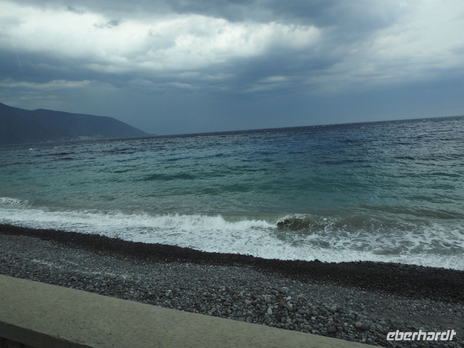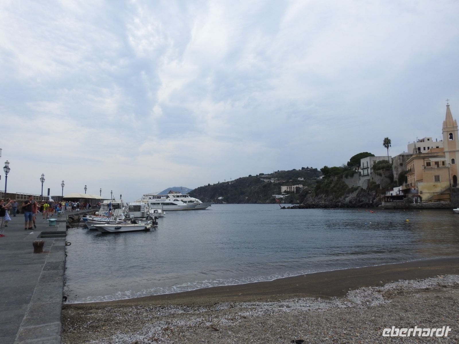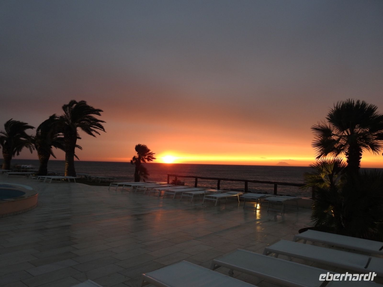 Gegen 17.30 Uhr erreichen wir unseren Ausgangshafen. Inzwischen tobt ein kleiner Sandsturm, der uns trockene Kiefernnadeln und losen Sand in die Augen treibt. Endlich kommt auch unser Transferbus und etwas erleichtert, aber doch ein bisschen traurig, ob der verpassten Chance, Stromboli zu besuchen, fahren wir zurück zum Hotel.