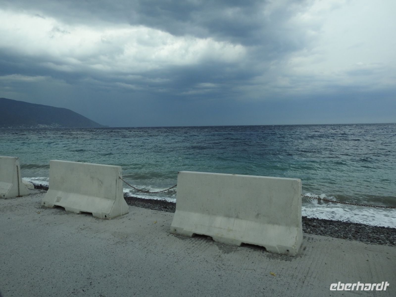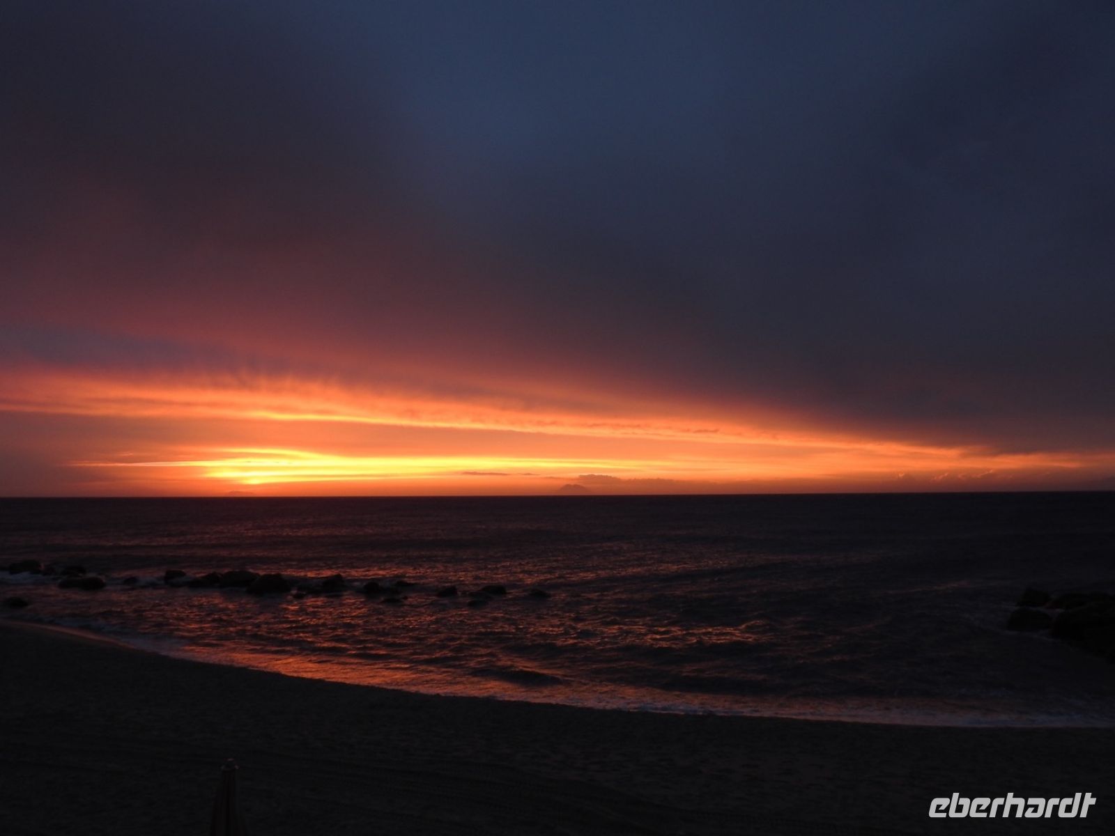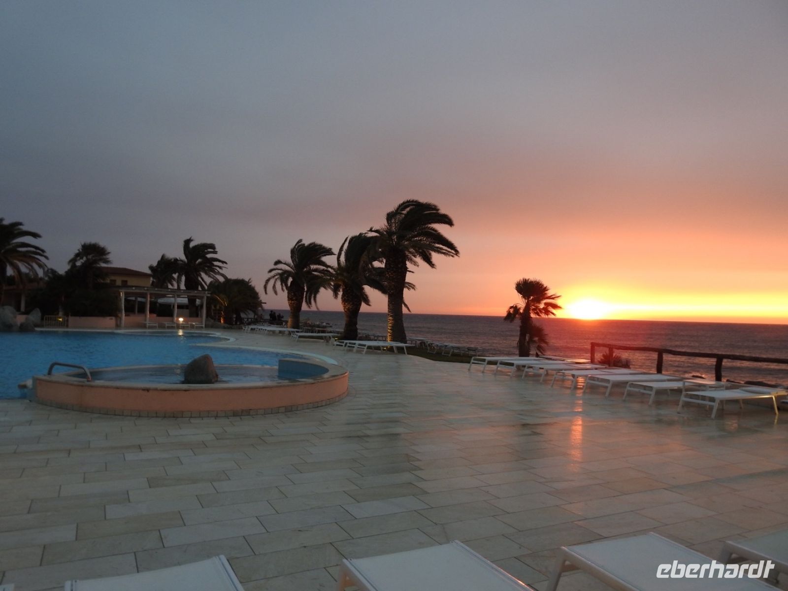Gegen 17.30 Uhr erreichen wir unseren Ausgangshafen. Inzwischen tobt ein kleiner Sandsturm, der uns trockene Kiefernnadeln und losen Sand in die Augen treibt. Endlich kommt auch unser Transferbus und etwas erleichtert, aber doch ein bisschen traurig, ob der verpassten Chance, Stromboli zu besuchen, fahren wir zurück zum Hotel.