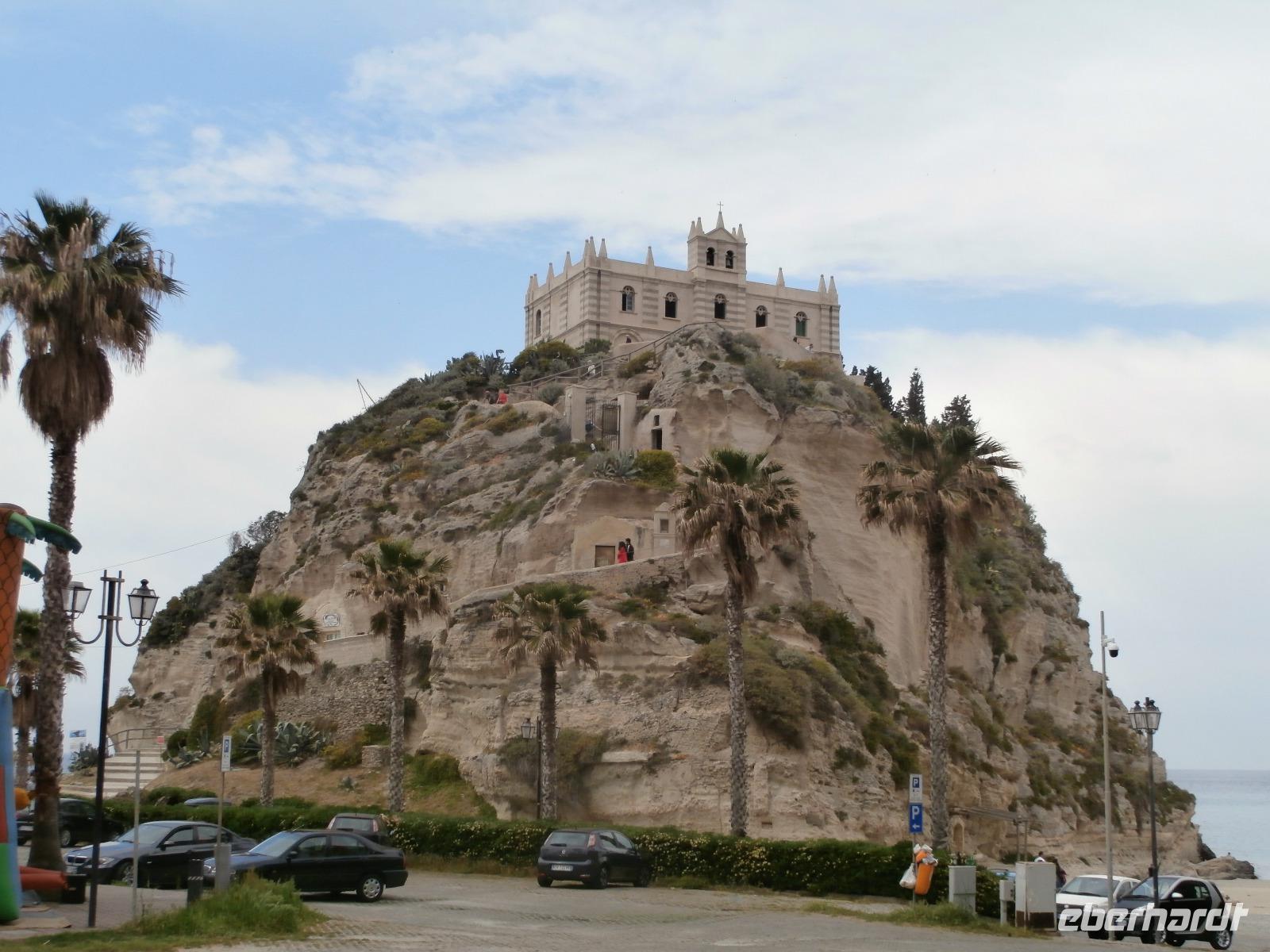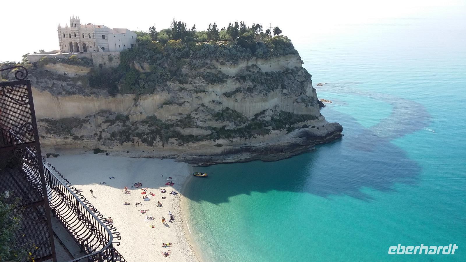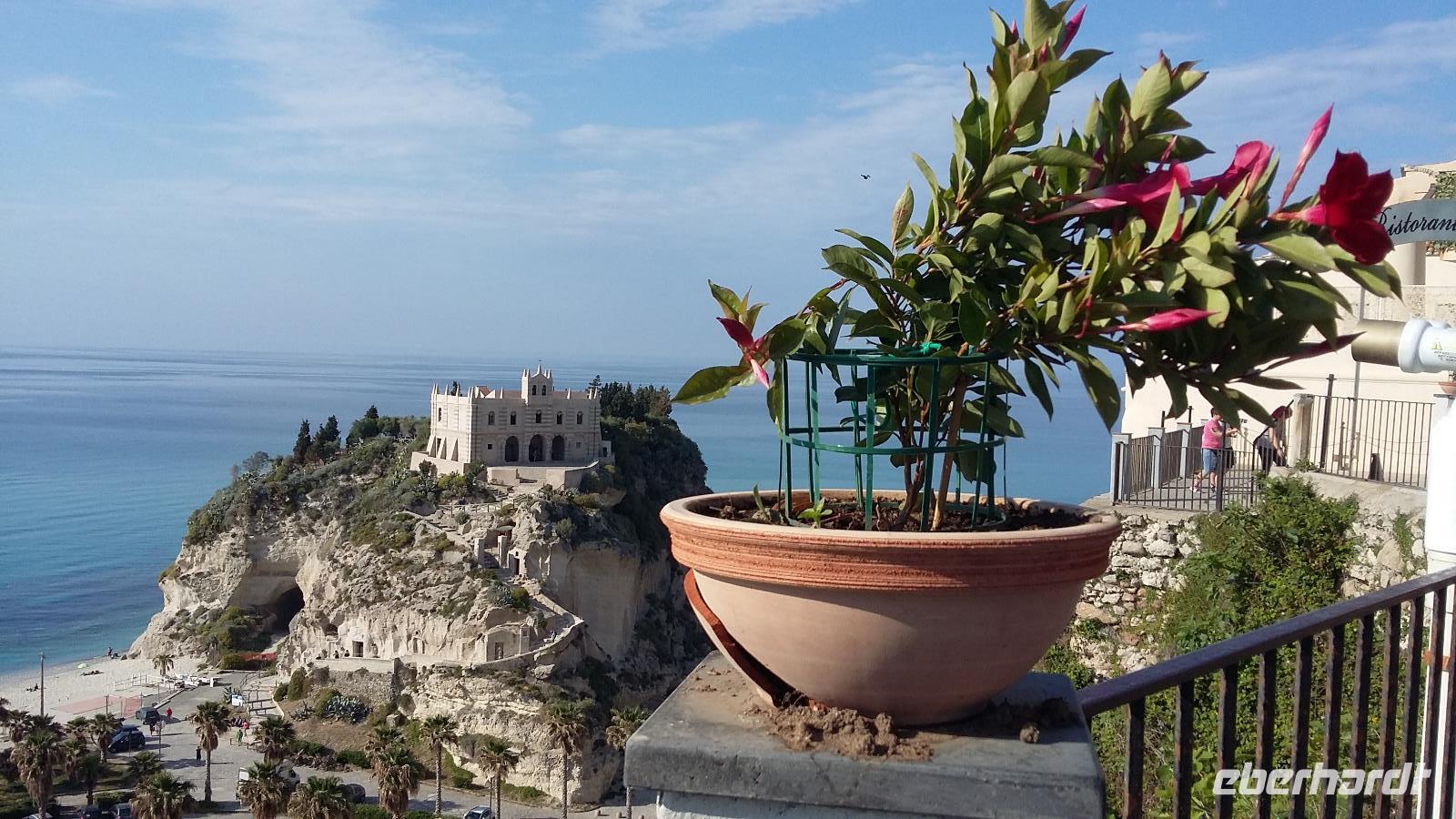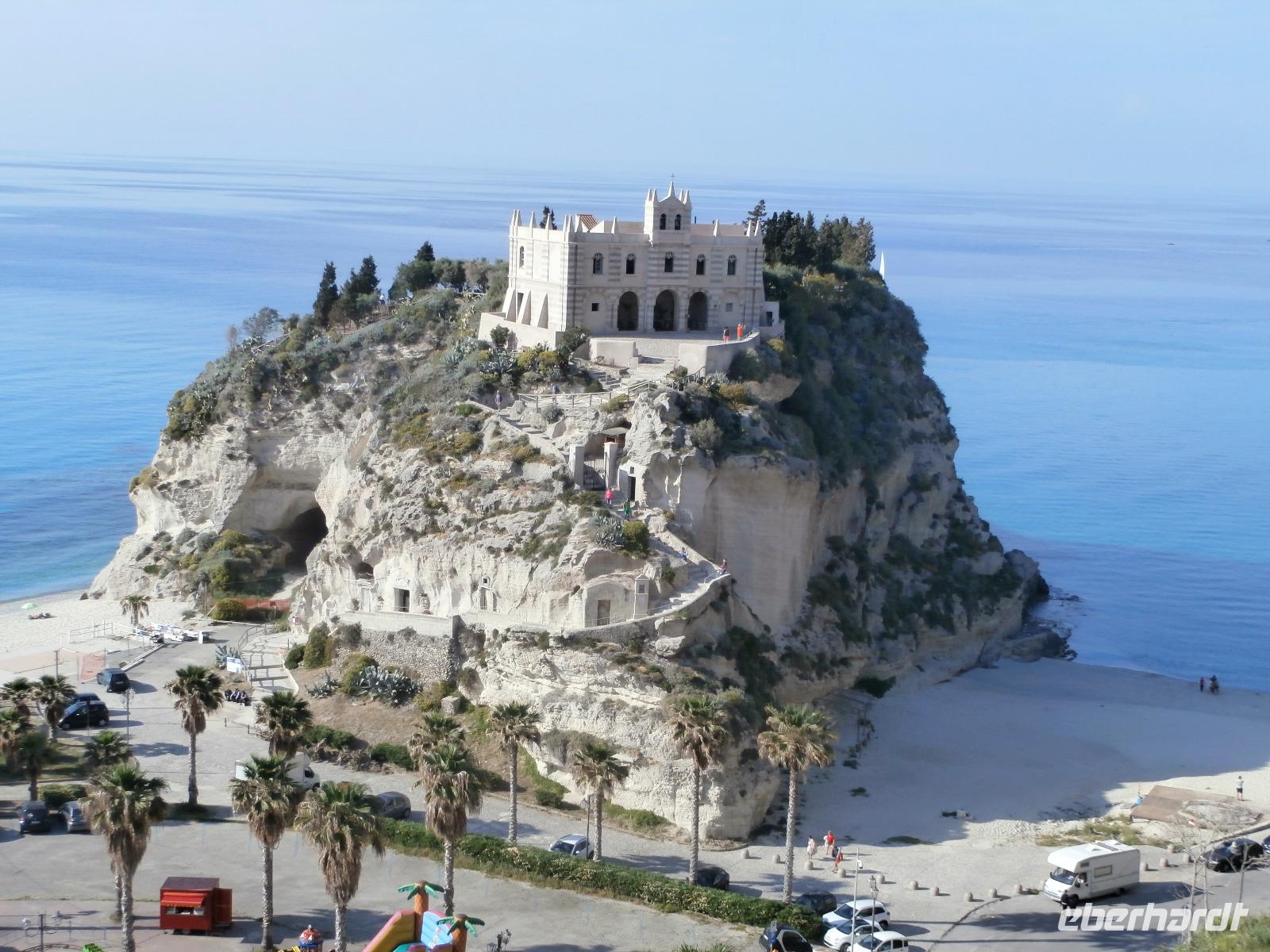 Gemeinsam starten wir unsere Exkursion mit dem Bus und der örtlichen Reiseleitung Claudia, sie ist eine gebürtige Schweizerin. Das Capo Vaticano bietet feine, weiße Sandstrände in den verschiedenen Buchten und ist auch ein Tauchrevier. Wir genießen die Aussicht auf Kalabriens schönstes Küstengebiet. Von hier ist die Straße von Messina nur ca. 60 km entfernt und bei klarem Wetter auch sichtbar. Der Name des Cap's geht vermutlich auf die vati( Propheten) zurück, sie sollen an diesem besonderen Platz gelebt haben, den Seefahrern ihre Zukunft geweissagt und auch Wettervorhersage betrieben haben. Zurück am Hotel verlassen wir den Bus und begeben uns zu Fuß zum Stadtrundgang in Tropea. Durch viele, kleine und sehr schmale Gassen führt uns Claudia in Tropea, Sonntagmittag ist in der Stadt einiges los, viele Einheimische bummeln durch den Ort. Eine Verkostung landestypischer Spezialitäten mit Zwiebelmarmelade, feiner Salami und auch eingelegtem Brot in Olivenöl erleben wir mit Claudia. Sie präsentiert uns Produkte der Bergamotte, im Laden verkosten wir Limoncello und Likör der Bergamotte. Man hat festgestellt, dass an keinem anderen Ort der Welt die Bergamottefrucht in derselben Qualität und Menge wie in Kalabrien wächst. Am Aussichtspunkt blicken wir hinüber zur Kirche Madonna Santa Maria dell'Isola, sie werden wir später besuchen, viele Stufen führen zu ihr hinauf. Nach einem gemeinsamen Mittagsstopp verabschieden wir uns in die Freizeit, der Dom wartet auf Besichtigung, öffnet aber erst wieder gegen 16.30 Uhr. Die Siesta mit Schließung von Geschäften und Kirchen muss eingehalten werden.