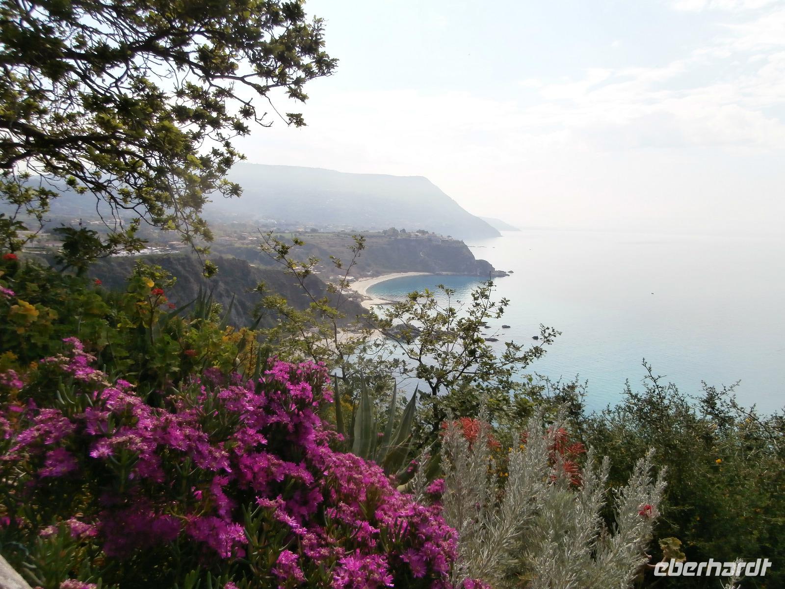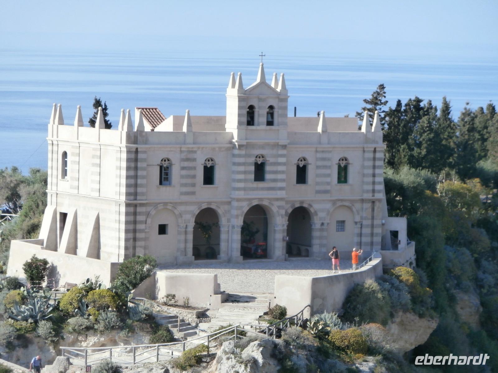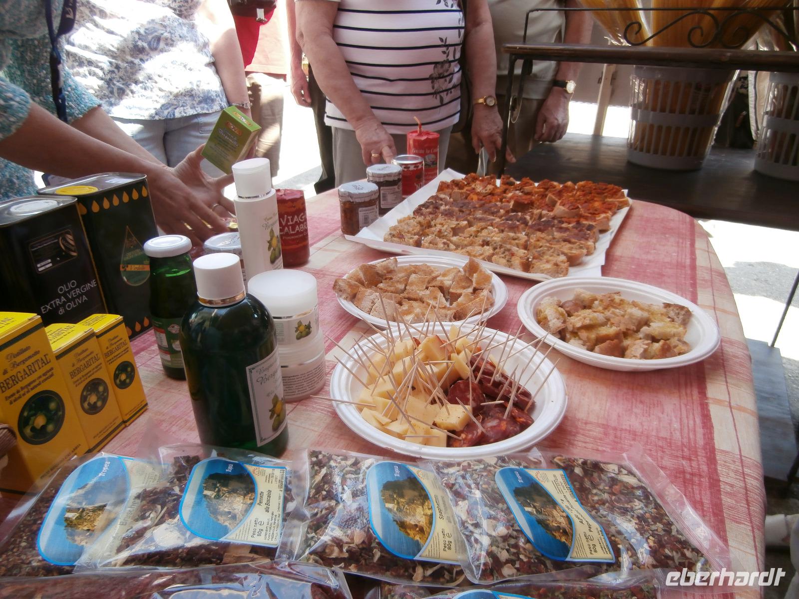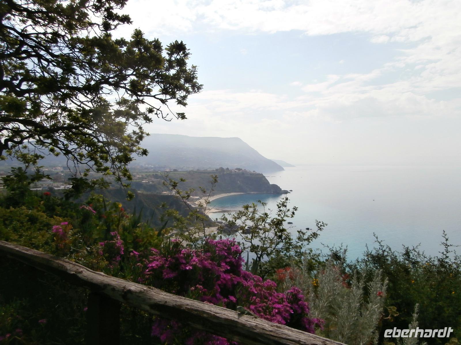 Gemeinsam starten wir unsere Exkursion mit dem Bus und der örtlichen Reiseleitung Claudia, sie ist eine gebürtige Schweizerin. Das Capo Vaticano bietet feine, weiße Sandstrände in den verschiedenen Buchten und ist auch ein Tauchrevier. Wir genießen die Aussicht auf Kalabriens schönstes Küstengebiet. Von hier ist die Straße von Messina nur ca. 60 km entfernt und bei klarem Wetter auch sichtbar. Der Name des Cap's geht vermutlich auf die vati( Propheten) zurück, sie sollen an diesem besonderen Platz gelebt haben, den Seefahrern ihre Zukunft geweissagt und auch Wettervorhersage betrieben haben. Zurück am Hotel verlassen wir den Bus und begeben uns zu Fuß zum Stadtrundgang in Tropea. Durch viele, kleine und sehr schmale Gassen führt uns Claudia in Tropea, Sonntagmittag ist in der Stadt einiges los, viele Einheimische bummeln durch den Ort. Eine Verkostung landestypischer Spezialitäten mit Zwiebelmarmelade, feiner Salami und auch eingelegtem Brot in Olivenöl erleben wir mit Claudia. Sie präsentiert uns Produkte der Bergamotte, im Laden verkosten wir Limoncello und Likör der Bergamotte. Man hat festgestellt, dass an keinem anderen Ort der Welt die Bergamottefrucht in derselben Qualität und Menge wie in Kalabrien wächst. Am Aussichtspunkt blicken wir hinüber zur Kirche Madonna Santa Maria dell'Isola, sie werden wir später besuchen, viele Stufen führen zu ihr hinauf. Nach einem gemeinsamen Mittagsstopp verabschieden wir uns in die Freizeit, der Dom wartet auf Besichtigung, öffnet aber erst wieder gegen 16.30 Uhr. Die Siesta mit Schließung von Geschäften und Kirchen muss eingehalten werden.