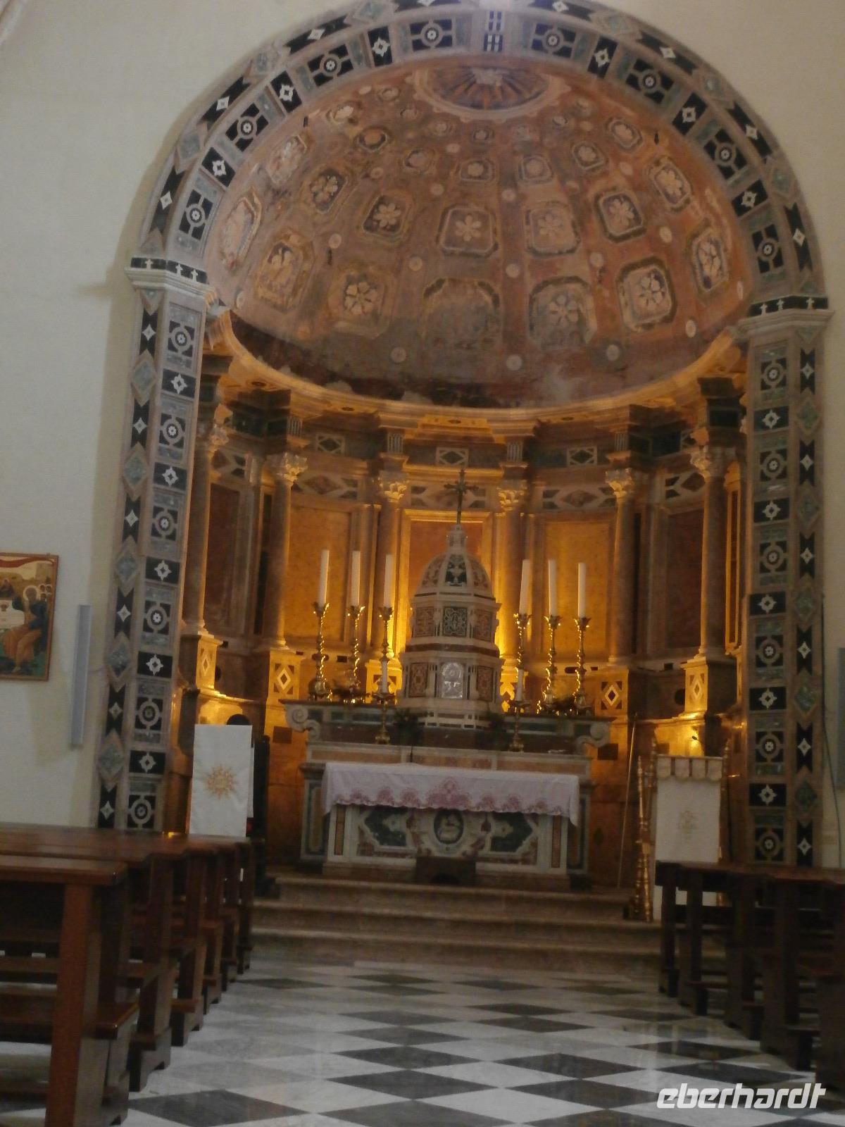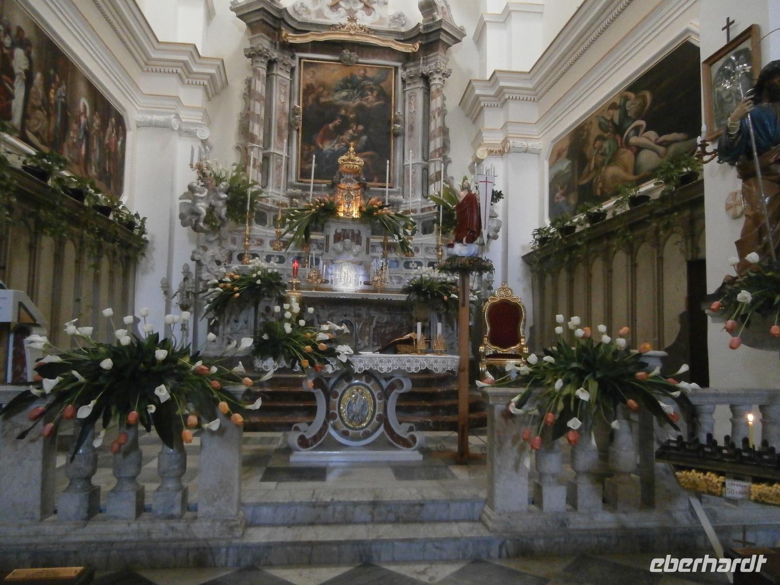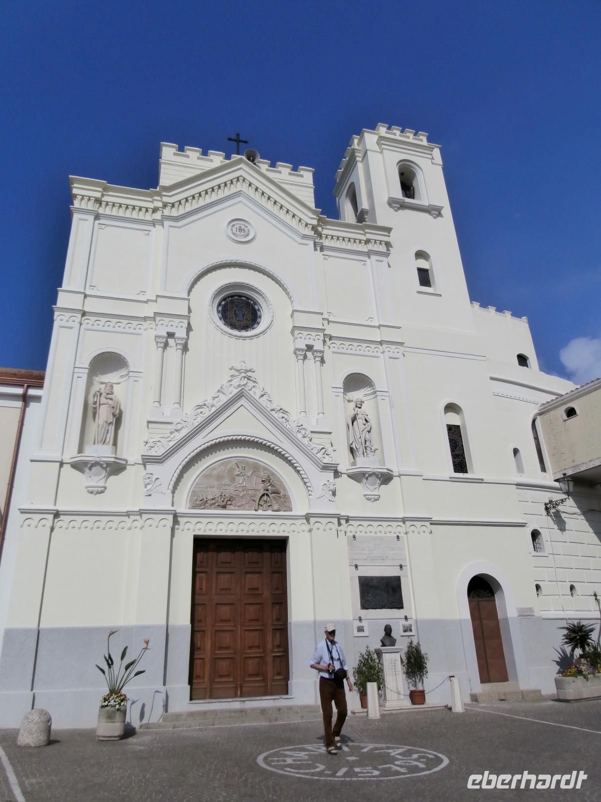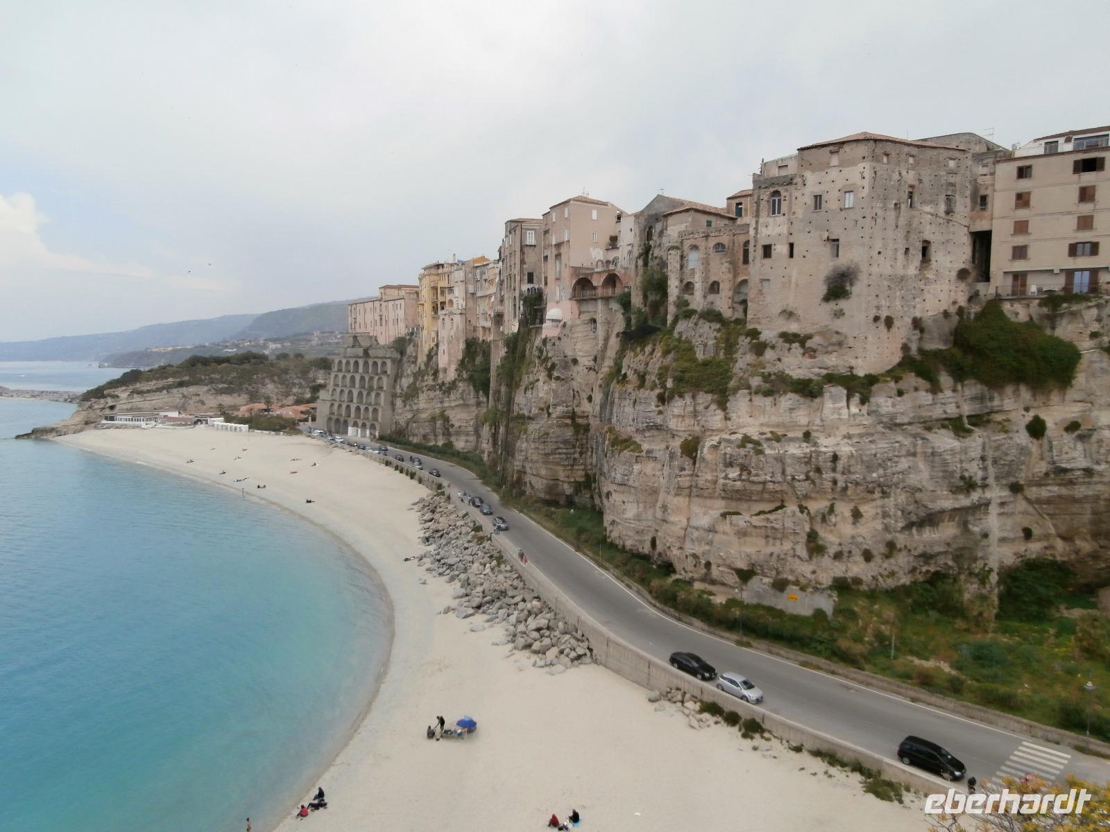 Gemeinsam starten wir unsere Exkursion mit dem Bus und der örtlichen Reiseleitung Claudia, sie ist eine gebürtige Schweizerin. Das Capo Vaticano bietet feine, weiße Sandstrände in den verschiedenen Buchten und ist auch ein Tauchrevier. Wir genießen die Aussicht auf Kalabriens schönstes Küstengebiet. Von hier ist die Straße von Messina nur ca. 60 km entfernt und bei klarem Wetter auch sichtbar. Der Name des Cap's geht vermutlich auf die vati( Propheten) zurück, sie sollen an diesem besonderen Platz gelebt haben, den Seefahrern ihre Zukunft geweissagt und auch Wettervorhersage betrieben haben. Zurück am Hotel verlassen wir den Bus und begeben uns zu Fuß zum Stadtrundgang in Tropea. Durch viele, kleine und sehr schmale Gassen führt uns Claudia in Tropea, Sonntagmittag ist in der Stadt einiges los, viele Einheimische bummeln durch den Ort. Eine Verkostung landestypischer Spezialitäten mit Zwiebelmarmelade, feiner Salami und auch eingelegtem Brot in Olivenöl erleben wir mit Claudia. Sie präsentiert uns Produkte der Bergamotte, im Laden verkosten wir Limoncello und Likör der Bergamotte. Man hat festgestellt, dass an keinem anderen Ort der Welt die Bergamottefrucht in derselben Qualität und Menge wie in Kalabrien wächst. Am Aussichtspunkt blicken wir hinüber zur Kirche Madonna Santa Maria dell'Isola, sie werden wir später besuchen, viele Stufen führen zu ihr hinauf. Nach einem gemeinsamen Mittagsstopp verabschieden wir uns in die Freizeit, der Dom wartet auf Besichtigung, öffnet aber erst wieder gegen 16.30 Uhr. Die Siesta mit Schließung von Geschäften und Kirchen muss eingehalten werden.