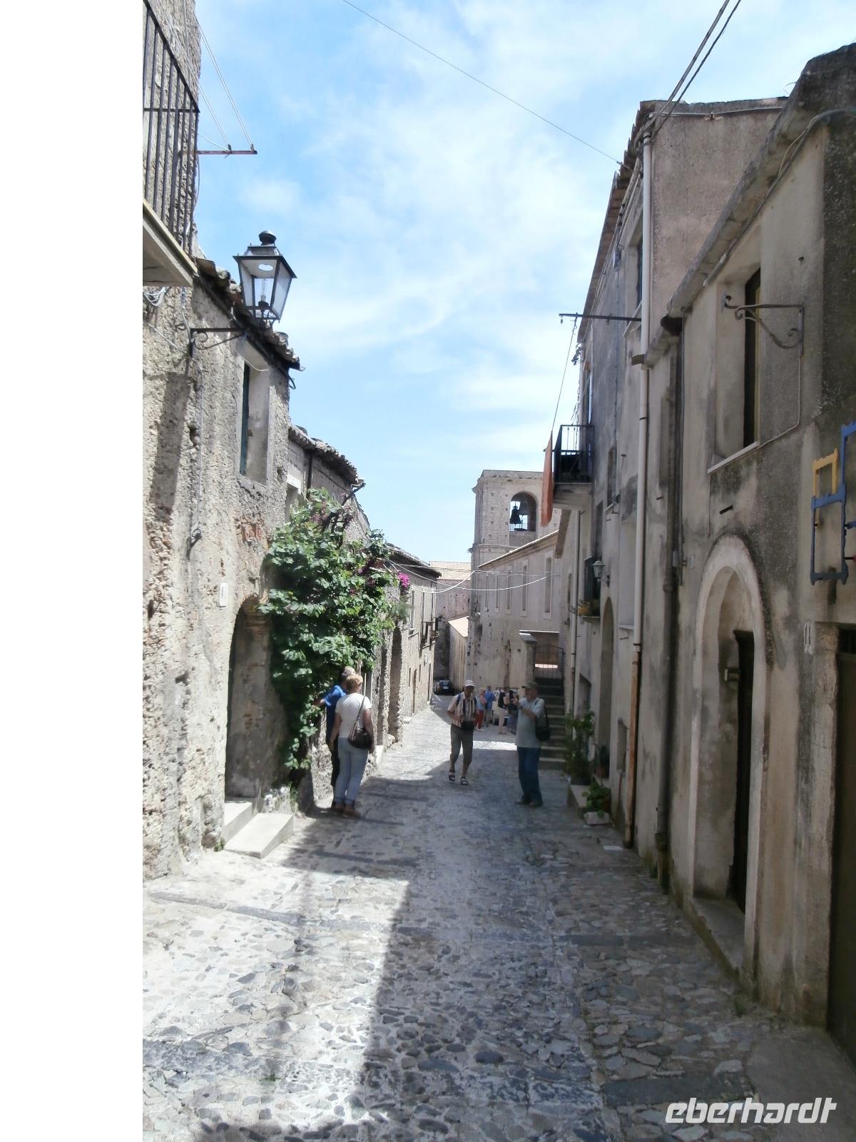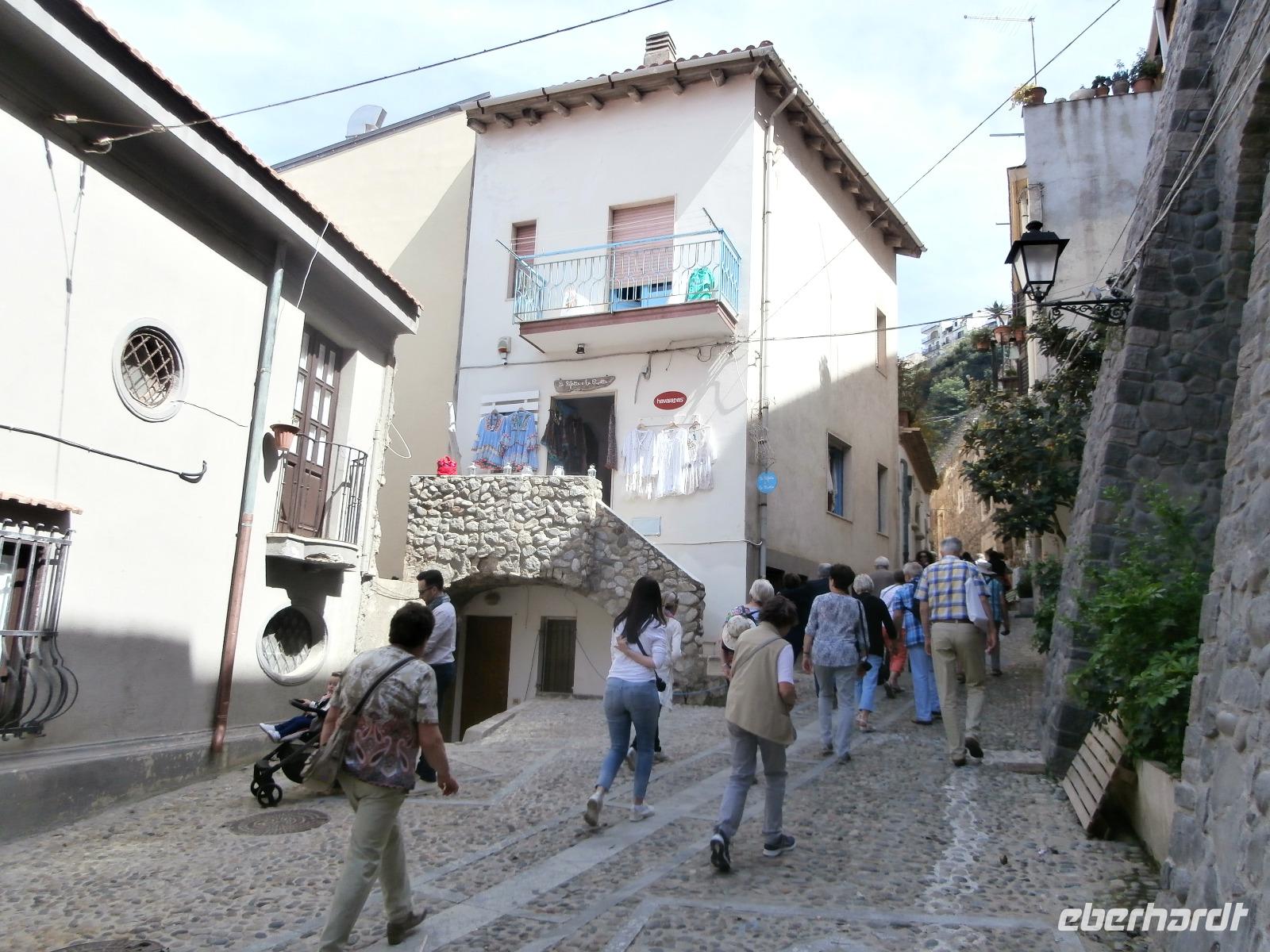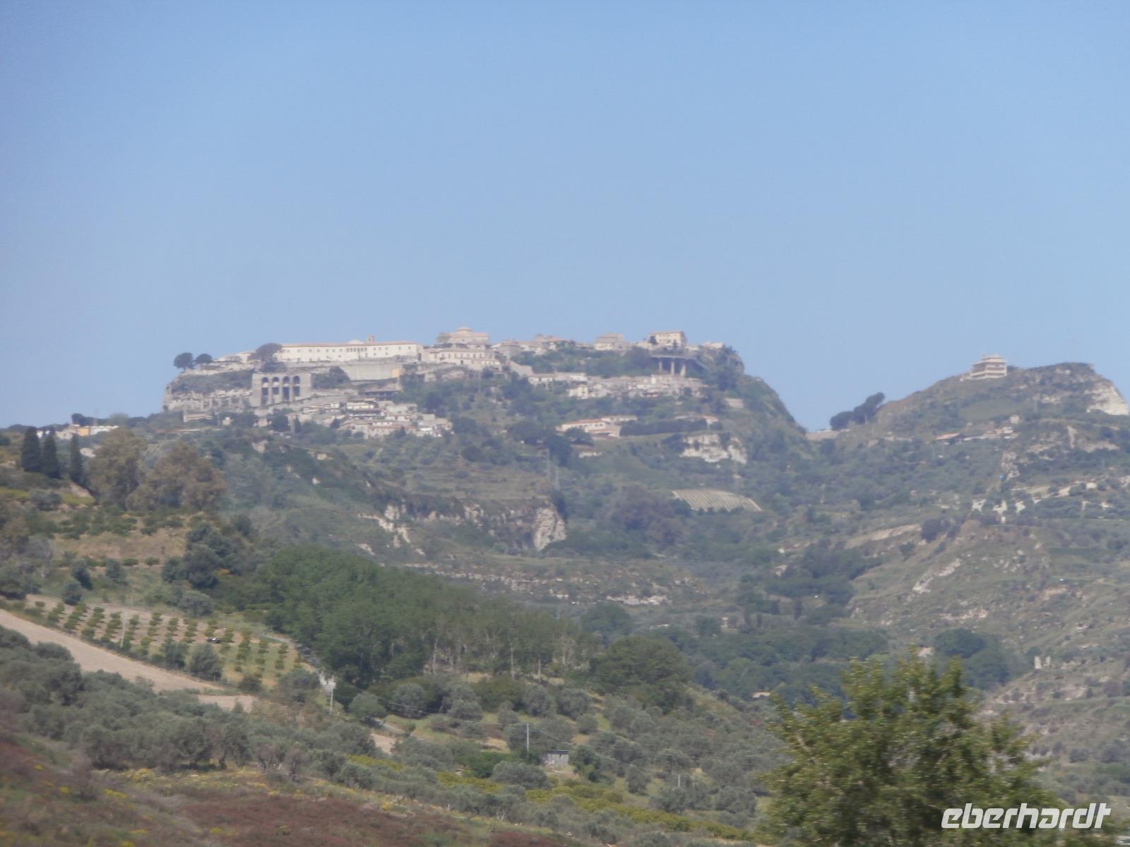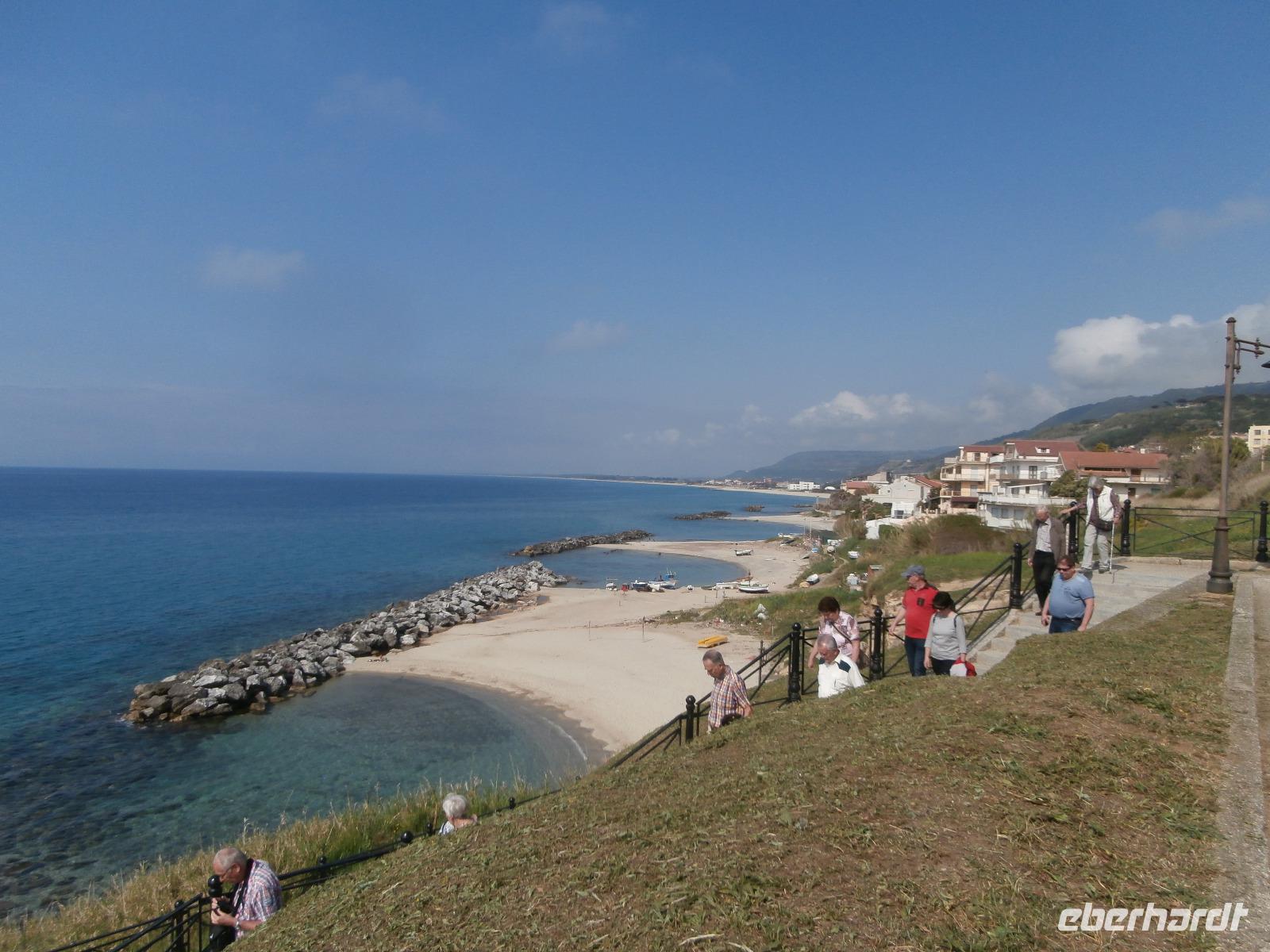 Claudia sagt am Morgen zu uns: „Der heutige Tag ist den Frauen gewidmet." Unsere Fahrt geht heute hinüber auf die Ionische Seite der Stiefelspitze Kalabriens. Durch das Landesinnere, das Gebiet des Aspromonte und vorbei an der sehr fruchtbaren Ebene von Rosarno, gelangen wir nach Locri. Der Ort liegt direkt am Meer, wurde im 7. Jahrhundert vor Christus von den Lokrern gegründet. Wir besuchen die Ausgrabungsstätte Locri Epizefyrii mit Relikten aus der griechischen Zeit. Den berühmten Tempel von Marasa bekommen wir bei einer Führung mit Claudia gezeigt und erklärt. Die kleine Ortschaft Gerace ist herrlich gelegen, hoch oben auf Tuffstein ragen in fast 500 m Höhe die Ruinen der Normannischen Burg. Mit einem Bimmel Bähnchen setzen wir die Fahrt hinauf in den Mittelalterlichen Ort vom Bus aus fort. Imposant erhebt sich die Kathedrale von Gerace, die Größte von Süditalien, auf dem Felsen. Wir bummeln durch die Gassen und haben wunderbare Aussicht hinunter in die Landschaft bis hin zum Meer. Bei einem gemeinsamen Mittagsimbiss können wir einen Teller mit kalabrischen Buscetta Spezialitäten verkosten. Dazu wird uns Wein, Wasser und auch Eis serviert.