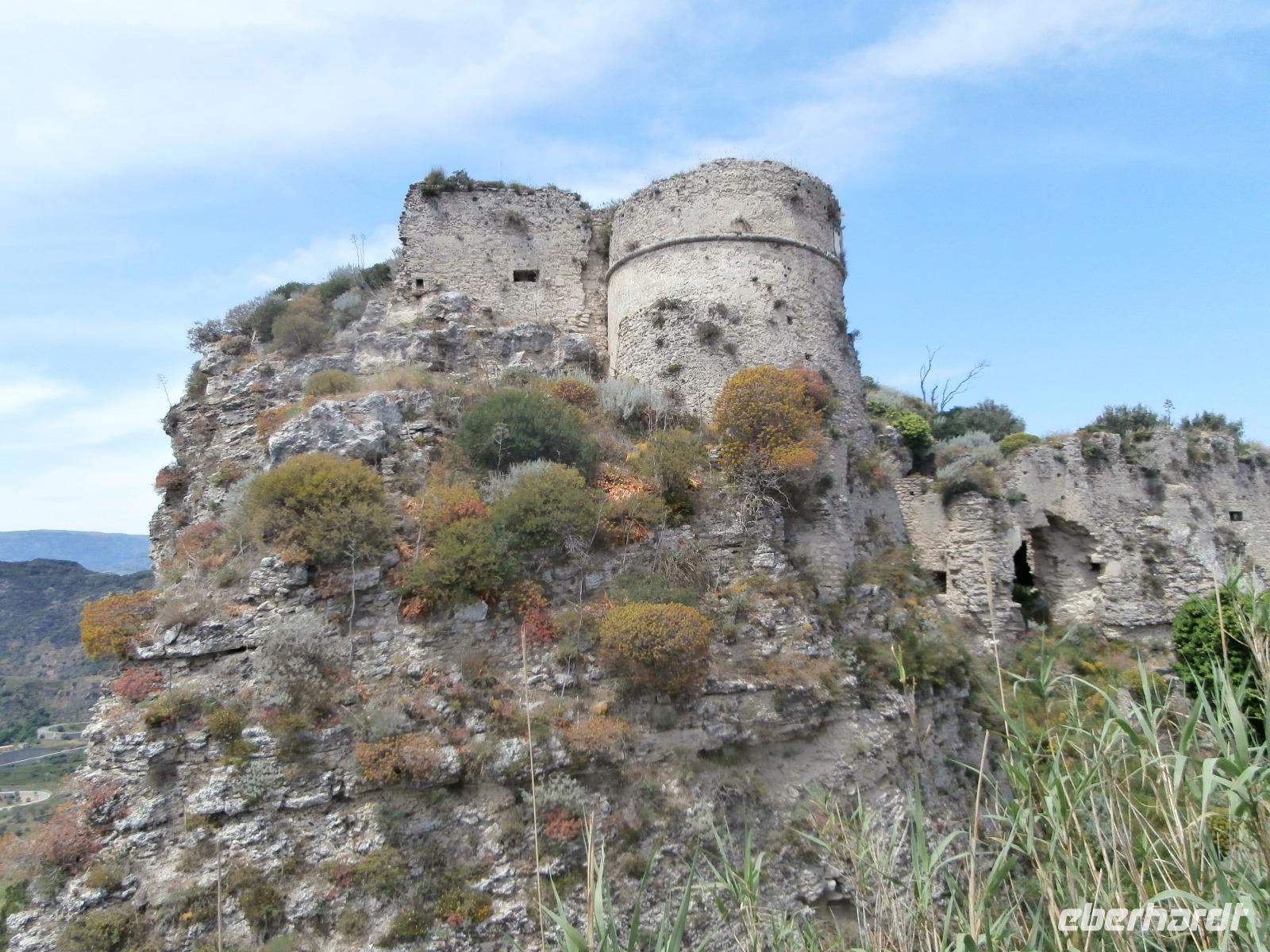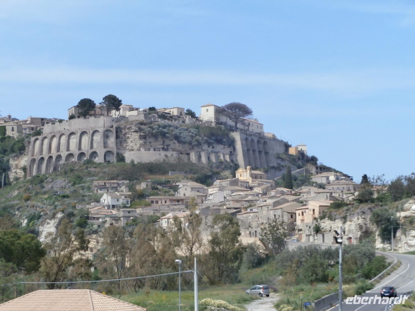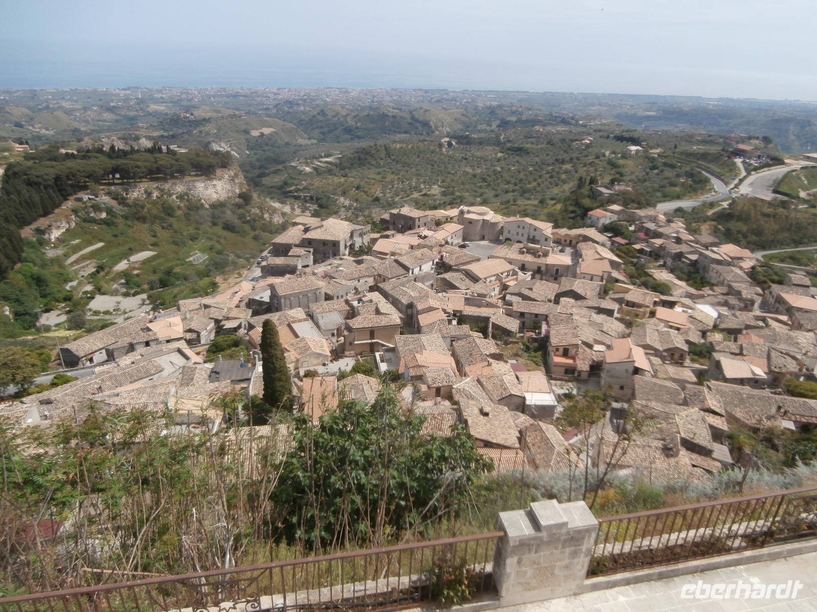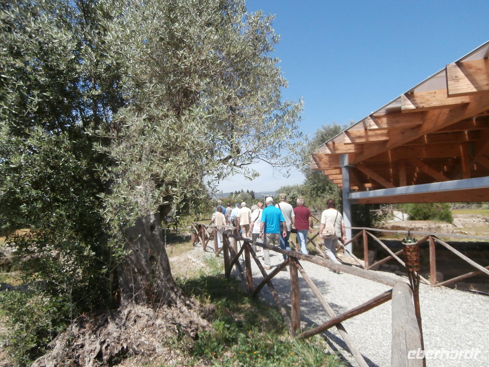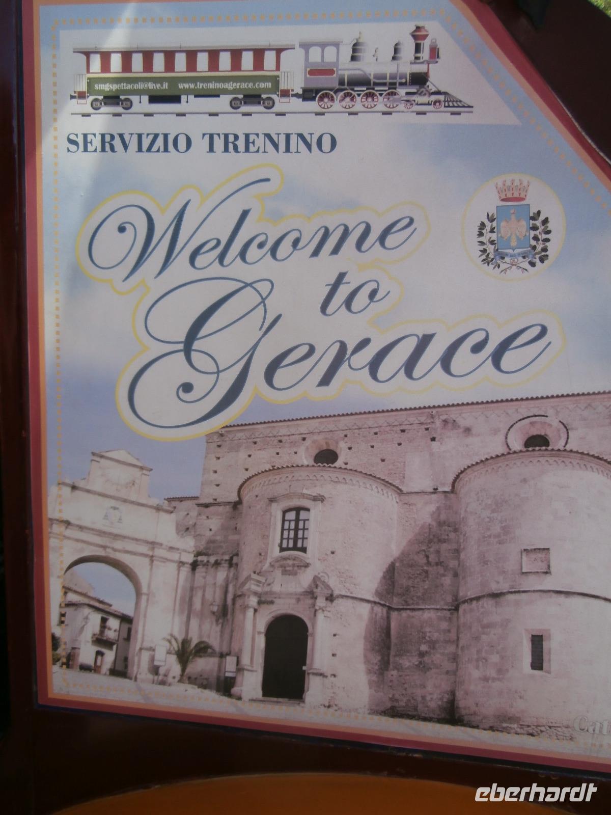 Claudia sagt am Morgen zu uns: „Der heutige Tag ist den Frauen gewidmet." Unsere Fahrt geht heute hinüber auf die Ionische Seite der Stiefelspitze Kalabriens. Durch das Landesinnere, das Gebiet des Aspromonte und vorbei an der sehr fruchtbaren Ebene von Rosarno, gelangen wir nach Locri. Der Ort liegt direkt am Meer, wurde im 7. Jahrhundert vor Christus von den Lokrern gegründet. Wir besuchen die Ausgrabungsstätte Locri Epizefyrii mit Relikten aus der griechischen Zeit. Den berühmten Tempel von Marasa bekommen wir bei einer Führung mit Claudia gezeigt und erklärt. Die kleine Ortschaft Gerace ist herrlich gelegen, hoch oben auf Tuffstein ragen in fast 500 m Höhe die Ruinen der Normannischen Burg. Mit einem Bimmel Bähnchen setzen wir die Fahrt hinauf in den Mittelalterlichen Ort vom Bus aus fort. Imposant erhebt sich die Kathedrale von Gerace, die Größte von Süditalien, auf dem Felsen. Wir bummeln durch die Gassen und haben wunderbare Aussicht hinunter in die Landschaft bis hin zum Meer. Bei einem gemeinsamen Mittagsimbiss können wir einen Teller mit kalabrischen Buscetta Spezialitäten verkosten. Dazu wird uns Wein, Wasser und auch Eis serviert.