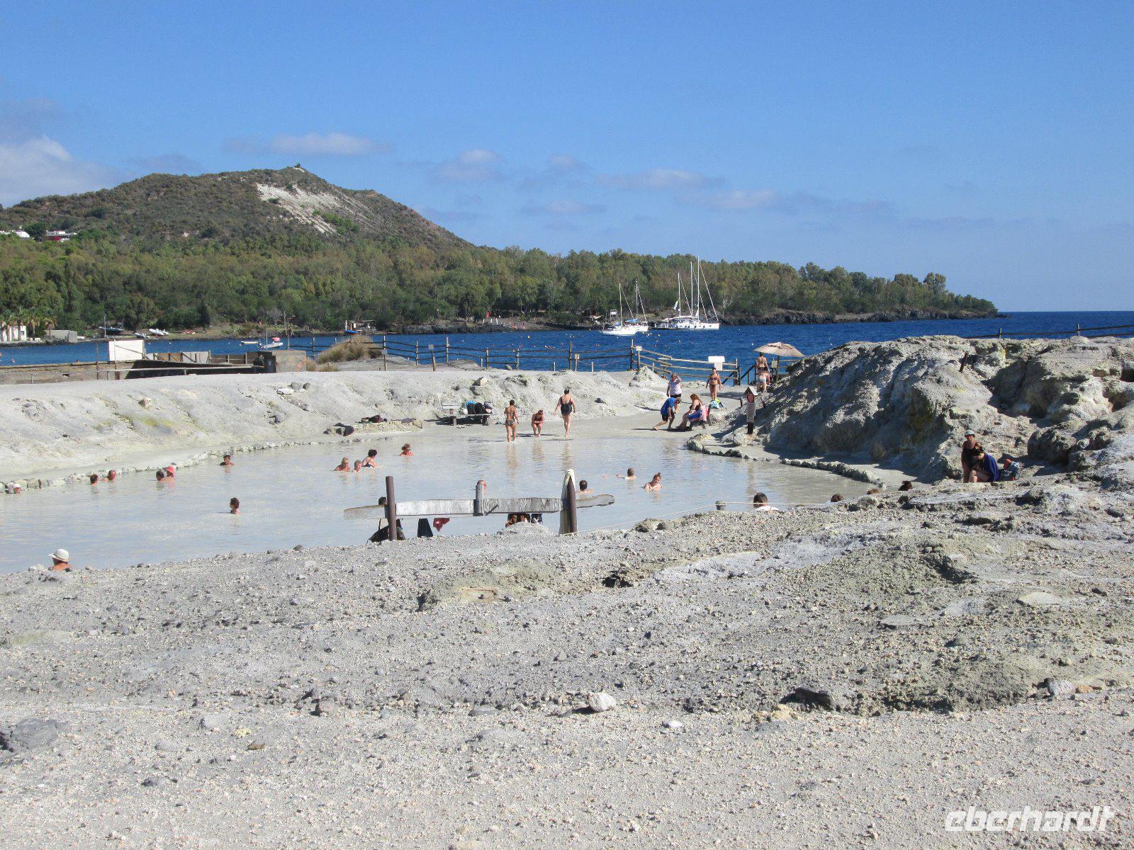 Man sieht nahe des Hafens den natürlichen See mit den warmen Schlammbädern, die schon in römischer Zeit für die Behandlung von Rheuma, Arthrose und Hautkrankheiten bekannt waren. Trotz der bestehenden Möglichkeit ging von unserer Gruppe niemand in das Schlammbad, statt dessen aber ins Meer am schwarzen Strand. Erfrischend und einfach schön-hatten wir doch an diesem Vormittag auf Vulcano Temperaturen von 29 Grad.