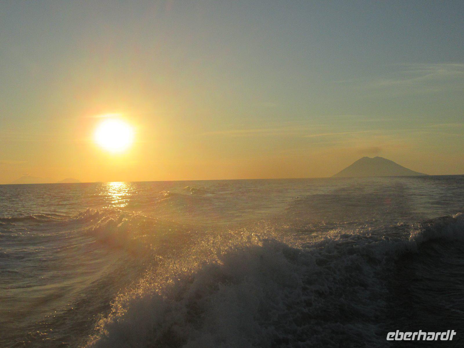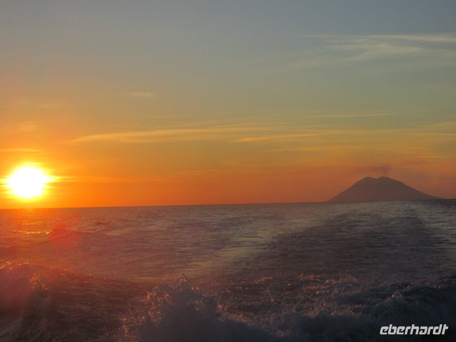 Die Insel Stromboli bildete den Abschluss unserer "Minikreuzfahrt". Der Vulkankegel mit seinem weithin sichtbaren Gipfel und seinen explosionsartigen Ausbrüchen ist für die Seefahrer wie ein Leuchtturm. In der Dunkelheit sieht man die Flammen, wir konnten am Tag die Rauchsäulen sehen. Dieser Vulkan ist aufgrund seiner ständig aktiven Krater wohl einmalig auf der Welt. Vom Meeresgrund bis zur Spitze gemessen ist er über 2000 Meter hoch. Für uns sind aber nur etwa 900 Meter sichtbar.
