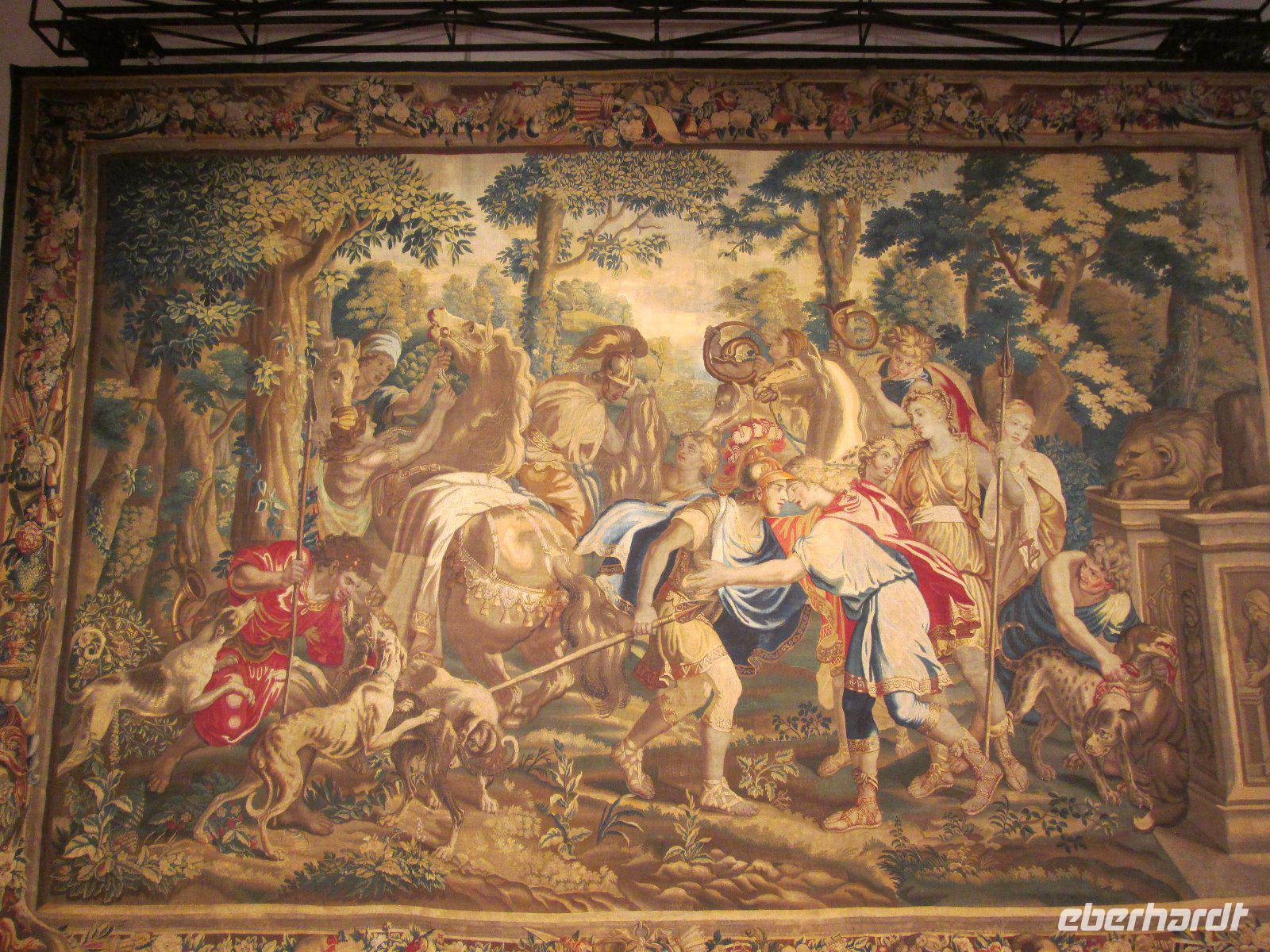 Ein besonderer Schatz ist wohl der 3,80 x 5,60 Meter große Wandteppich. Es zeigt die "Umarmung von Meleagro und Castor".