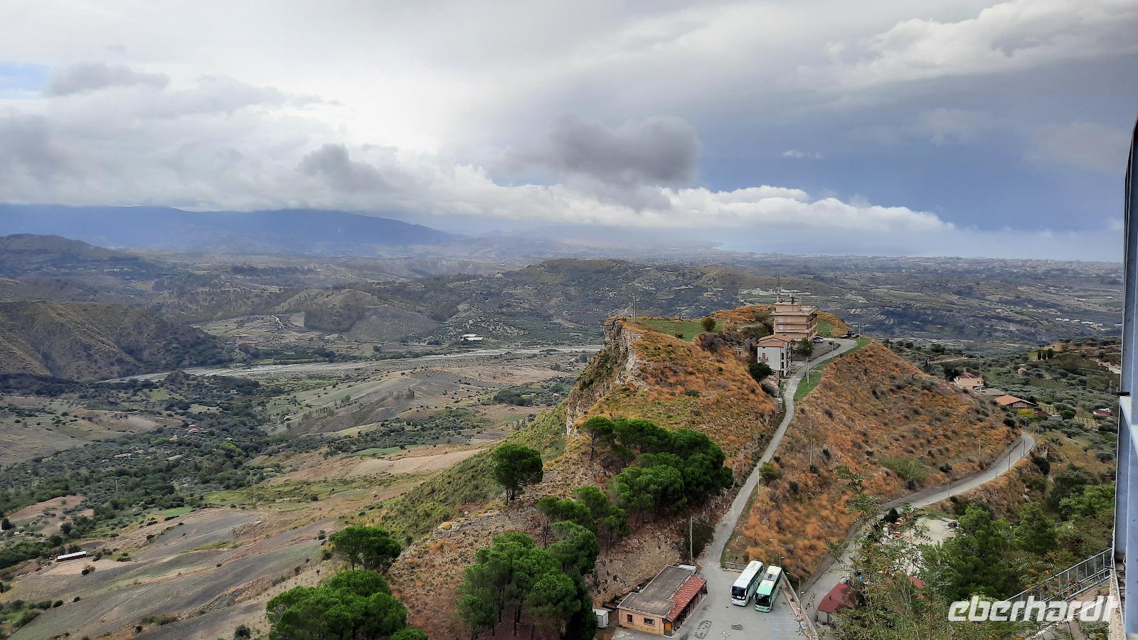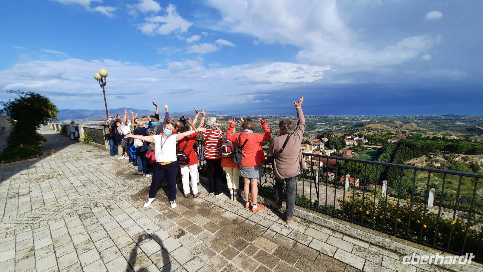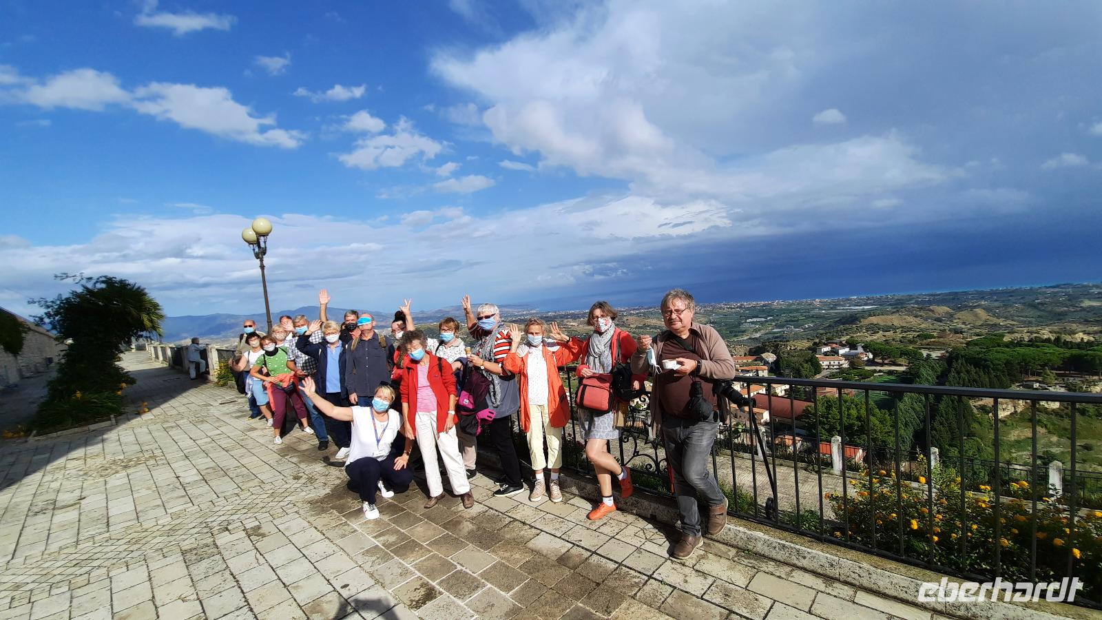 Unser heutiges Tagesziel war die traumhafte südliche Riviera Kalabriens. Wir fuhren wieder durch das Landesinnere und erheiterten uns an den Geschichten und Gepflogenheiten, die uns Claudia näher brachte. Aber es wurde noch interessanter, denn sie erzählte über die italienische Mafia. Wir erreichten die einzigartige Jasminküste, wie sie auch genannt wird, und wie sollte es anders sein: ein Regenguss hieß uns in Locri willkommen. Tapfer stiegen wir trotzdem aus und erkundeten die Ausgrabungsstätte. Der Ort, welcher im 7. Jahrhundert vor Christus von den Lokrern gegründet wurde, liegt direkt am Meer und spielte bereits zu Zeiten von Großgriechenland eine wichtige Rolle. Bildhaft führte uns Claudia durch die antike Ausgrabungsstätte Locri Epizephyrii und zeigte uns den berühmten Tempel von Marasà. Wir fuhren weiter Richtung Gerace. Mit einer Bimmelbahn erreichten wir den mittelalterlichen Ort auf einer Hochebene, der auch die Stadt der 100 Kirchen genannt wird. Gemeinsam bummelten wir durch die schmalen Gassen und besichtigten die gotische Kirche San Francescodie sowie die Kathedrale Mariä Himmelfahrt. Als wir die Ruinen der Normannischen Burg auf 480 Meter Höhe erreichten, konnten wir einen traumhaften Blick bis zur Küste Kalabriens genießen. Nach einem echten italienischen Mittagessen aus Antipasti oder Nudeln, spazierten wir weiter durch die urigen Gassen. So verwinkelt sie waren, musste man wirklich aufpassen, dass man nicht den Anschluss an die Gruppe verlor. Wir genossen abermals einmalige Panoramablicke, die wir natürlich auf den Kameras festhalten wollten und probierten italienisches Eis. Ein toller Besichtigungstag neigte sich dem Ende entgegen und wir fuhren mit italienischer Musik im Ohr zum Hotel zurück. Wir bedankten uns bei Thomaso für seine vertrauensvollen Fahrtkünste, schließlich war der Ausflug recht kurvig.