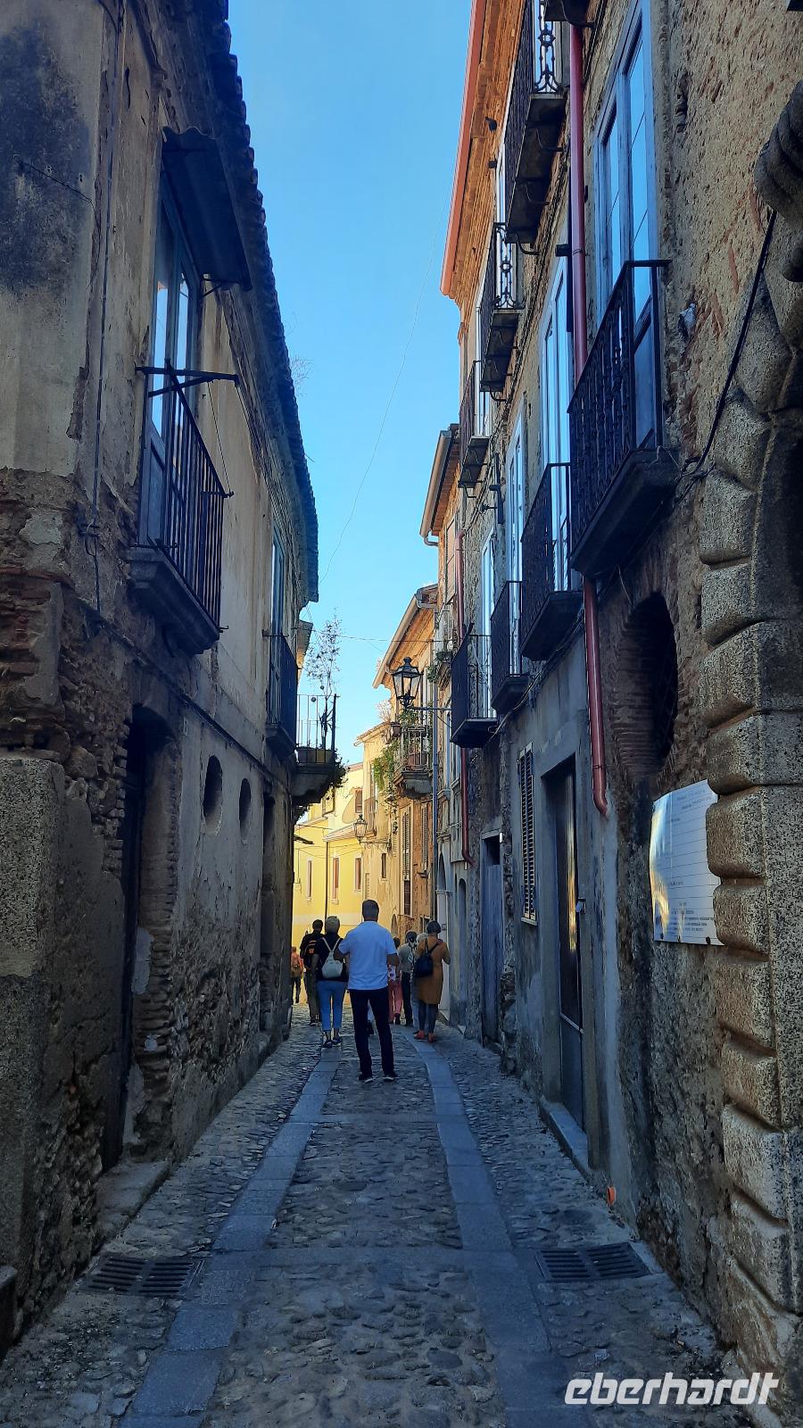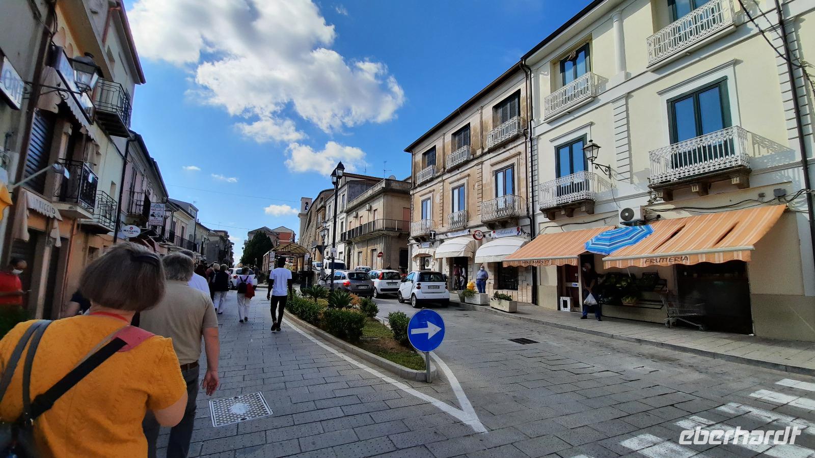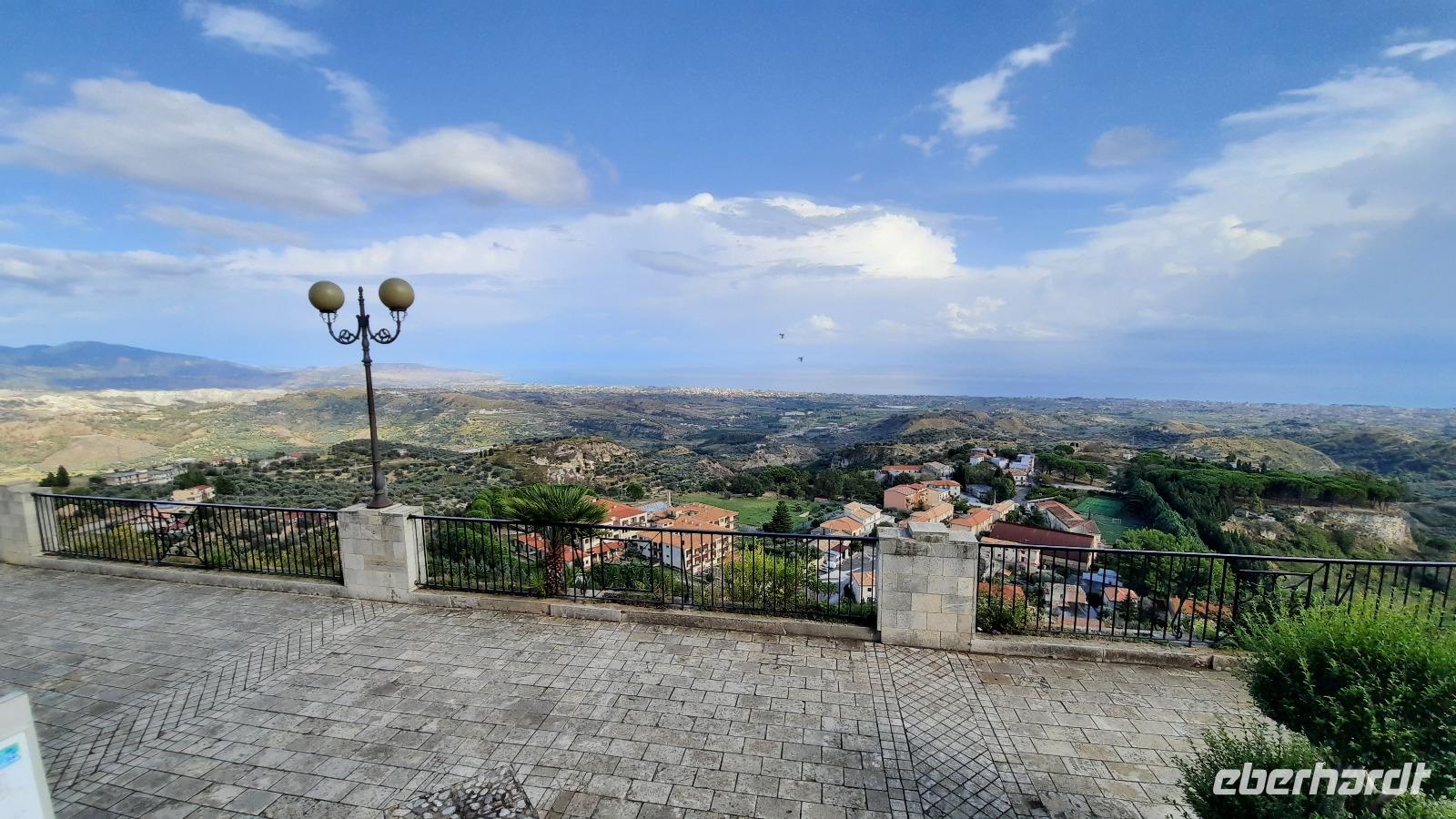 Unser heutiges Tagesziel war die traumhafte südliche Riviera Kalabriens. Wir fuhren wieder durch das Landesinnere und erheiterten uns an den Geschichten und Gepflogenheiten, die uns Claudia näher brachte. Aber es wurde noch interessanter, denn sie erzählte über die italienische Mafia. Wir erreichten die einzigartige Jasminküste, wie sie auch genannt wird, und wie sollte es anders sein: ein Regenguss hieß uns in Locri willkommen. Tapfer stiegen wir trotzdem aus und erkundeten die Ausgrabungsstätte. Der Ort, welcher im 7. Jahrhundert vor Christus von den Lokrern gegründet wurde, liegt direkt am Meer und spielte bereits zu Zeiten von Großgriechenland eine wichtige Rolle. Bildhaft führte uns Claudia durch die antike Ausgrabungsstätte Locri Epizephyrii und zeigte uns den berühmten Tempel von Marasà. Wir fuhren weiter Richtung Gerace. Mit einer Bimmelbahn erreichten wir den mittelalterlichen Ort auf einer Hochebene, der auch die Stadt der 100 Kirchen genannt wird. Gemeinsam bummelten wir durch die schmalen Gassen und besichtigten die gotische Kirche San Francescodie sowie die Kathedrale Mariä Himmelfahrt. Als wir die Ruinen der Normannischen Burg auf 480 Meter Höhe erreichten, konnten wir einen traumhaften Blick bis zur Küste Kalabriens genießen. Nach einem echten italienischen Mittagessen aus Antipasti oder Nudeln, spazierten wir weiter durch die urigen Gassen. So verwinkelt sie waren, musste man wirklich aufpassen, dass man nicht den Anschluss an die Gruppe verlor. Wir genossen abermals einmalige Panoramablicke, die wir natürlich auf den Kameras festhalten wollten und probierten italienisches Eis. Ein toller Besichtigungstag neigte sich dem Ende entgegen und wir fuhren mit italienischer Musik im Ohr zum Hotel zurück. Wir bedankten uns bei Thomaso für seine vertrauensvollen Fahrtkünste, schließlich war der Ausflug recht kurvig.