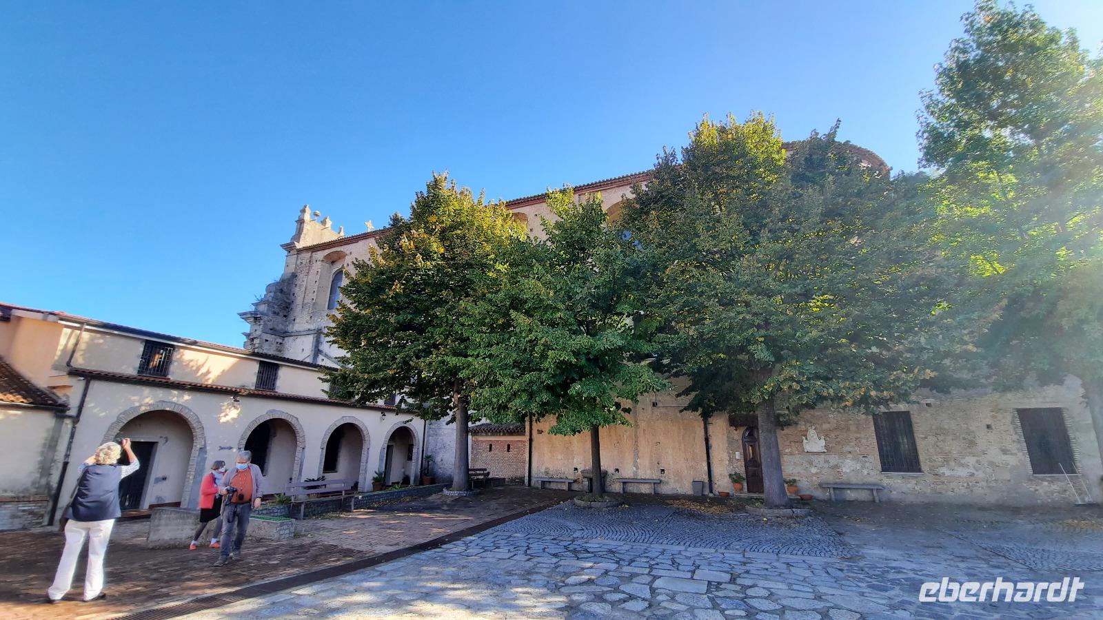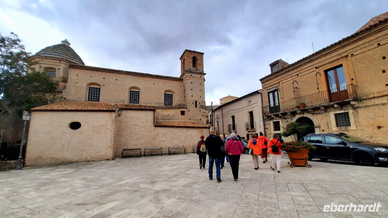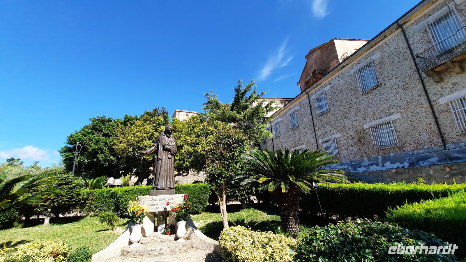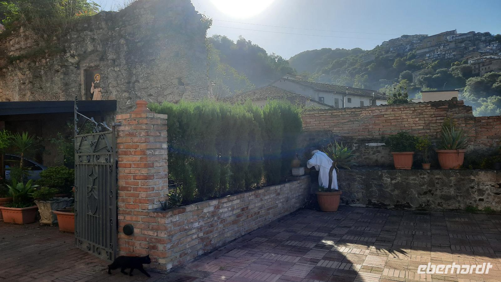 Nach dem Frühstück starteten wir in den sonnigen Tag. Wir fuhren durch wunderschöne Olivenhaine und Buchenwälder ins malerische Dorf Soriano Calabro und erhielten bei der Besichtigung der Klosterkirche des Klosters San Domenico spontan eine Führung von Pater Rosario. Begeistert folgten wir ihm, denn wir erkundeten das gesamte Gelände und bekamen Ecken zu Gesicht, die wir ohne ihn nie gesehen hätten. Im Anschluss bedankten wir uns bei ihm und erhielten eine Postkarte als Andenken.