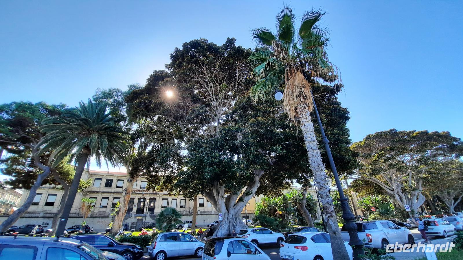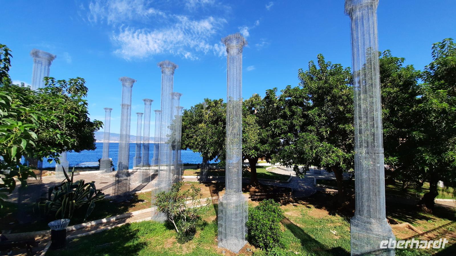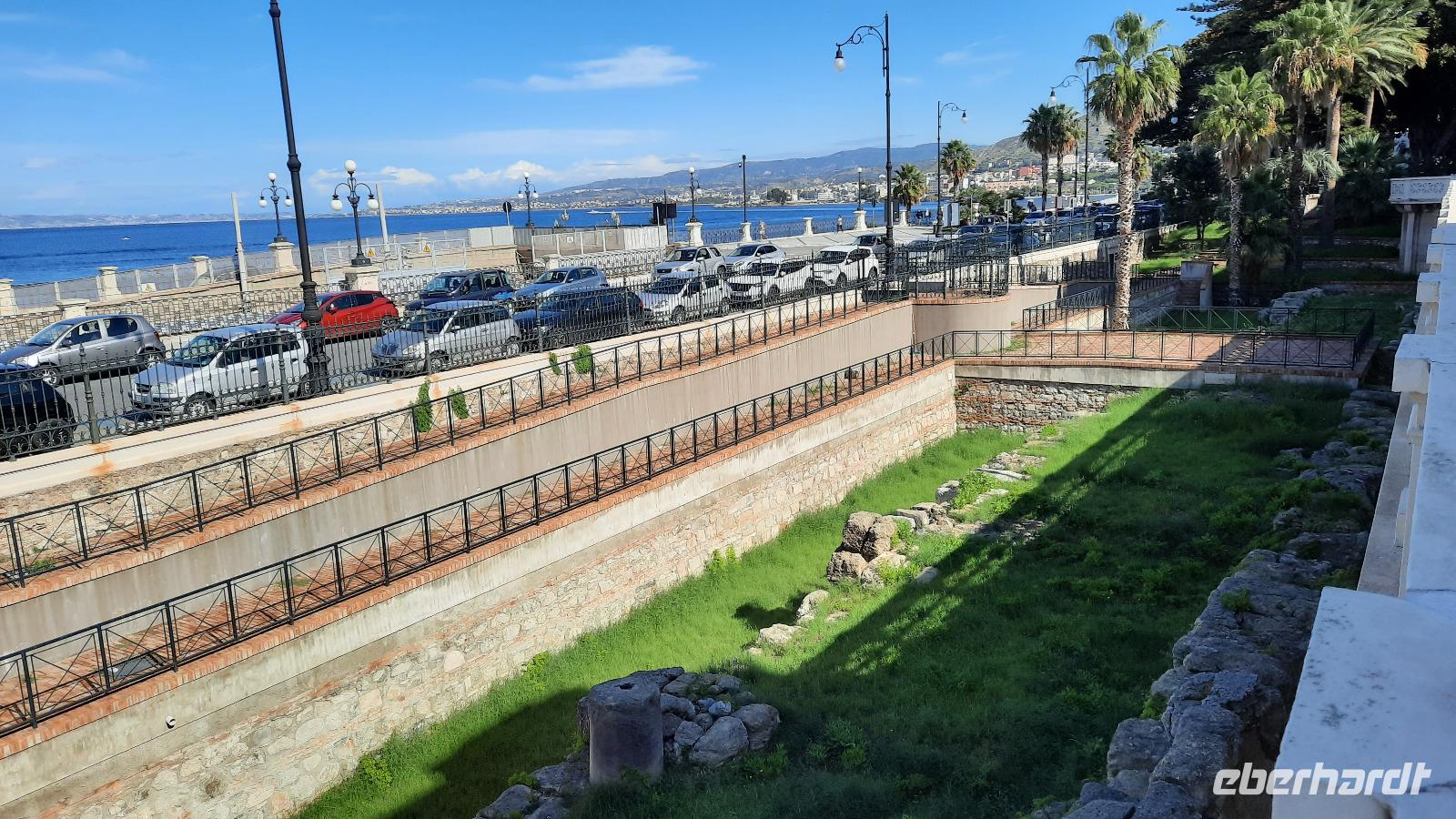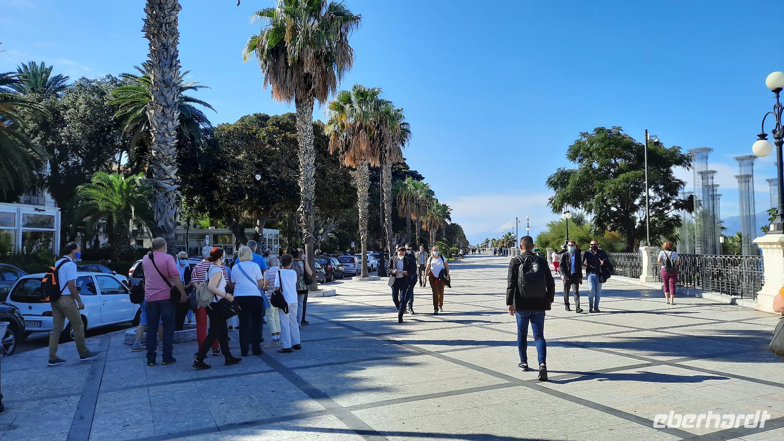 Wir spazierten entlang des "schönsten Kilometers in ganz Italien", dem Lungomare Falcomata und bewunderten nicht nur den Blick zum Ätna, welcher sich besser zeigte, als am Tag zuvor. Wir bewunderten auch die zahlreichen Jugendstilbauten, überdimensionale bunte Skulpturen, eine vielfältige Pflanzenwelt, den Mamorbogen der Arena dello Stretto und archäologische Überreste römischer Bäder. Unser Spaziergang führte uns zur neoklassizistischen Kathedrale, die auf Ruinen eines griechischen Apollon-Tempels erbaut und 1928 eingeweiht wurde. Nachdem wir eine interessante Innenführung von Claudia erhielten, konnte jeder nache eigener Facon Reggio erkunden. Einige spazierten entlang der Corso Giuseppe Garibaldi, einer Einkaufsstraße mit unzähligen Boutiquen und Shops, andere besuchten die "hübschen Männer" im National-Museum. Die aus dem 5. Jahrhundert stammenden zwei Bronzestatuen von Riace wurden Anfang der 70er-Jahre auf dem Meeresboden gefunden und sind hervorragende Zeugnisse einer Meisterleistung der griechischen Bildhauerkunst.