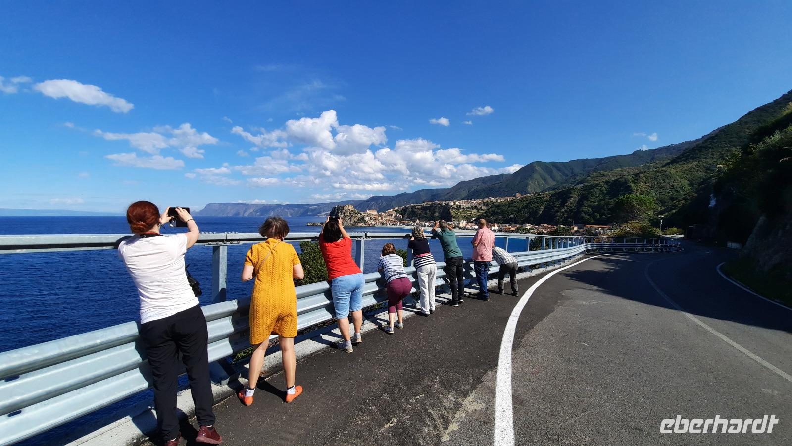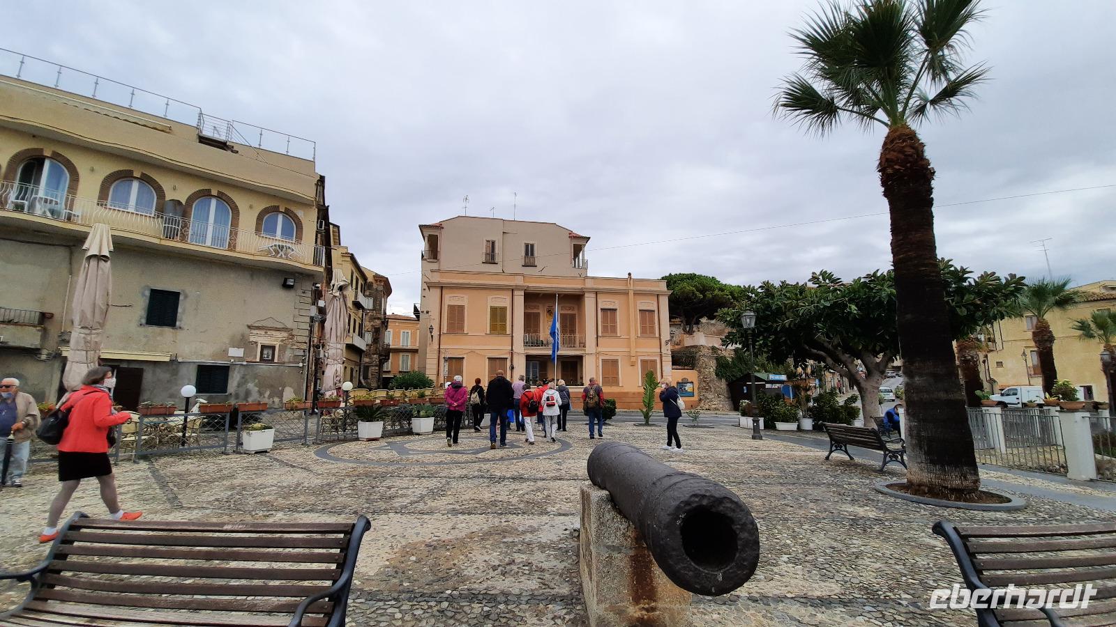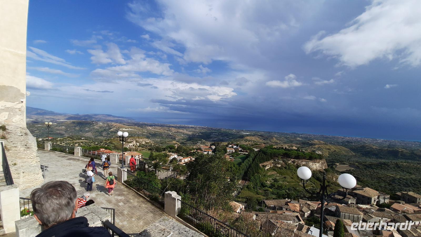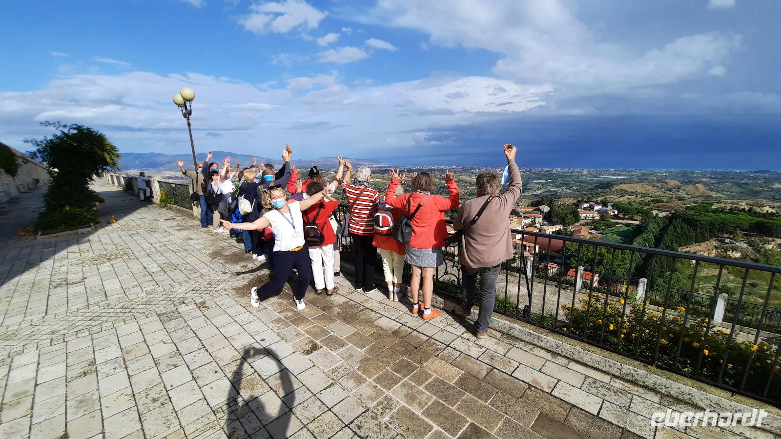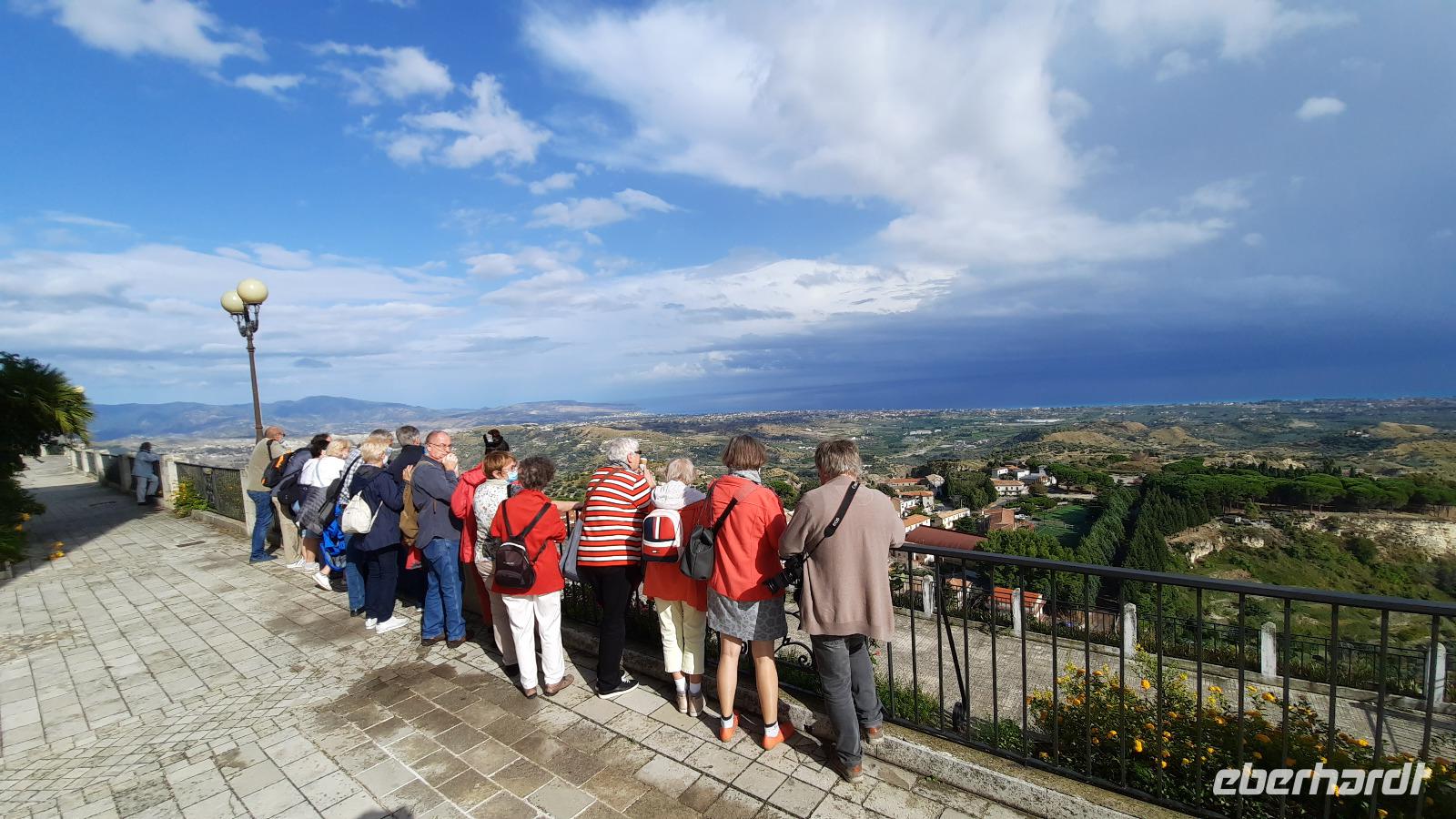 Nach dem Frühstück starteten wir mit Claudia und Thomaso, das angrenzende Tropea zu erkunden. Die wunderbar wärmende Sonne vom Vortag hatte dicken Regenwolken Platz gemacht. Aber das störte uns kaum. Vorerst. Claudia spazierte mit und in der Altstadt von Tropea. Angefangen vom Platz Piazza del Cannone, von dem man aus einen unglaublich schönen Blick auf die Benediktinerwallfahrtskirche Santa Maria dell'Isola genießen konnte. Diese befindet sich auf der Spitze eines Sandsteinfelsens, der Altstadt Tropeas vorgelagert. Wir spazierten weiter durch schmale Gassen, vorbei an zahlreichen Cafés und Restaurants, besuchten die Jesuitenkirche von Gesu, sahen prächtige Portale, versteckte kleine Plätze und besuchten schließlich die Kathedrale von Tropea. Diese schlichte Kathedrale aus dem 12. Jahrhundert wurde ursprünglich auf einem byzantinischen Friedhof erbaut und beherbergt einen Sarkophag aus Marmor sowie ein weltbekanntes Bildnis der Maria von Romania, der Schutzpatronin der Stadt. In der anschließenden Freizeit, konnte jeder nach Lust und Laune die Altstadt erkunden oder sich bei einem italienischen Kaffee vor dem Regen schützen. Da es mittlerweile in Strömen regnete, beschlossen wir, eine längere Mittagspause im Hotel einzulegen. Kurz vorher erhielten wir auch die Nachricht, dass der geplante Ausflug zu den Liparischen Inseln wegen schlechten Wetters ausfallen würde. Eine Alternative musste jetzt gefunden werden. Claudia schlug uns einen Ausflug nach Sizilien vor. Nach dem Ende der Mittagspause sagten alle Eberhardt-Reisegäste der Alternative zu. Wir freuten uns sehr! Nun führten wir unsere Besichtigungstour weiter fort und wir erreichten die Höhlenkirche Piedigrotta, die bereits im 17. Jahrhundert als Dank neapolitanischer Schiffbrüchiger einen Altar aufgestellt bekam. Während wir den Erläuterungen Claudias lauschten, erkundeten wir die mystisch anmutende Höhle mit ihren biblischen Figuren, die alle durch das einstrahlende Licht verschieden angeleuchtet wurden. Wir steigen die Treppen wieder empor und Thomaso brachte uns weiter nach Pizzo. Der Regen holte uns erneut ein, daher besichtigten wir das Museum der Festung Murat, in dem der Schwager Napoleons und König von Neapel, Joachim Murat, 1815 hingerichtet wurde. Wir schlenderten weiter, sahen uns die Kathedrale von San Giorgio a Pizzo an und beschlossen, eine mächtig dunkle Regenwand auf uns zusteuern sehend, ein typisches Tartufo-Eis zu probieren. Wir besuchten das Eiscafé von Morino und kosteten das „Tarufo Moro" während draußen der Regen niederprasselte. Nachdem der Regen nachgelassen hatteund wir wieder den Bus erreichten, erzählte uns Claudia auf dem Rückweg mehr über Vulkanismus und das Leben mit Ausbrüchen des Stromboli.
