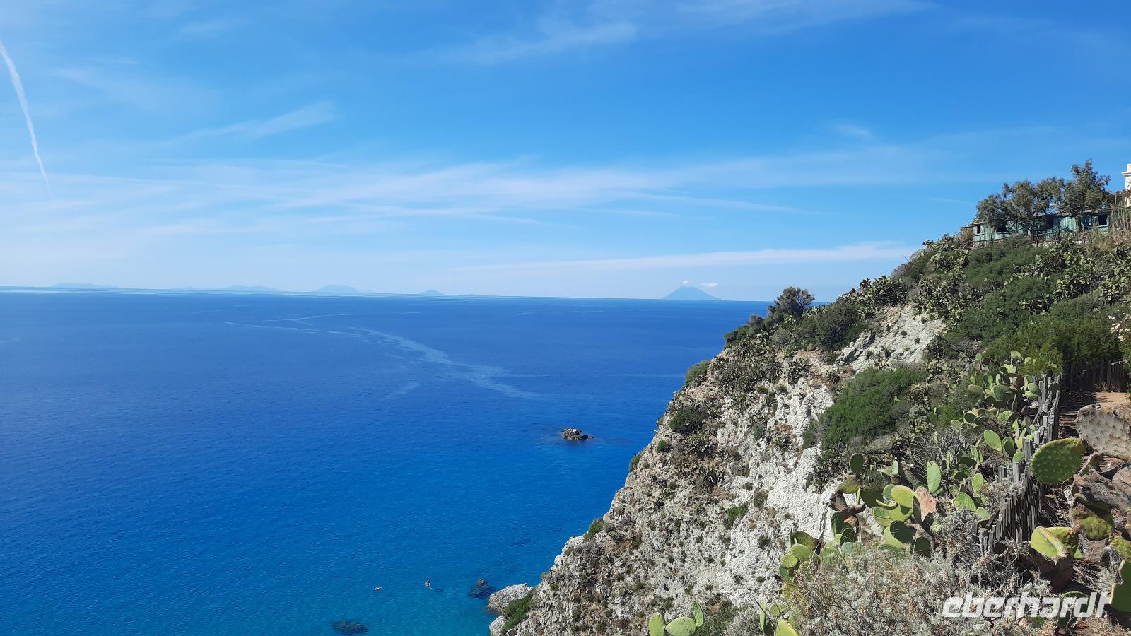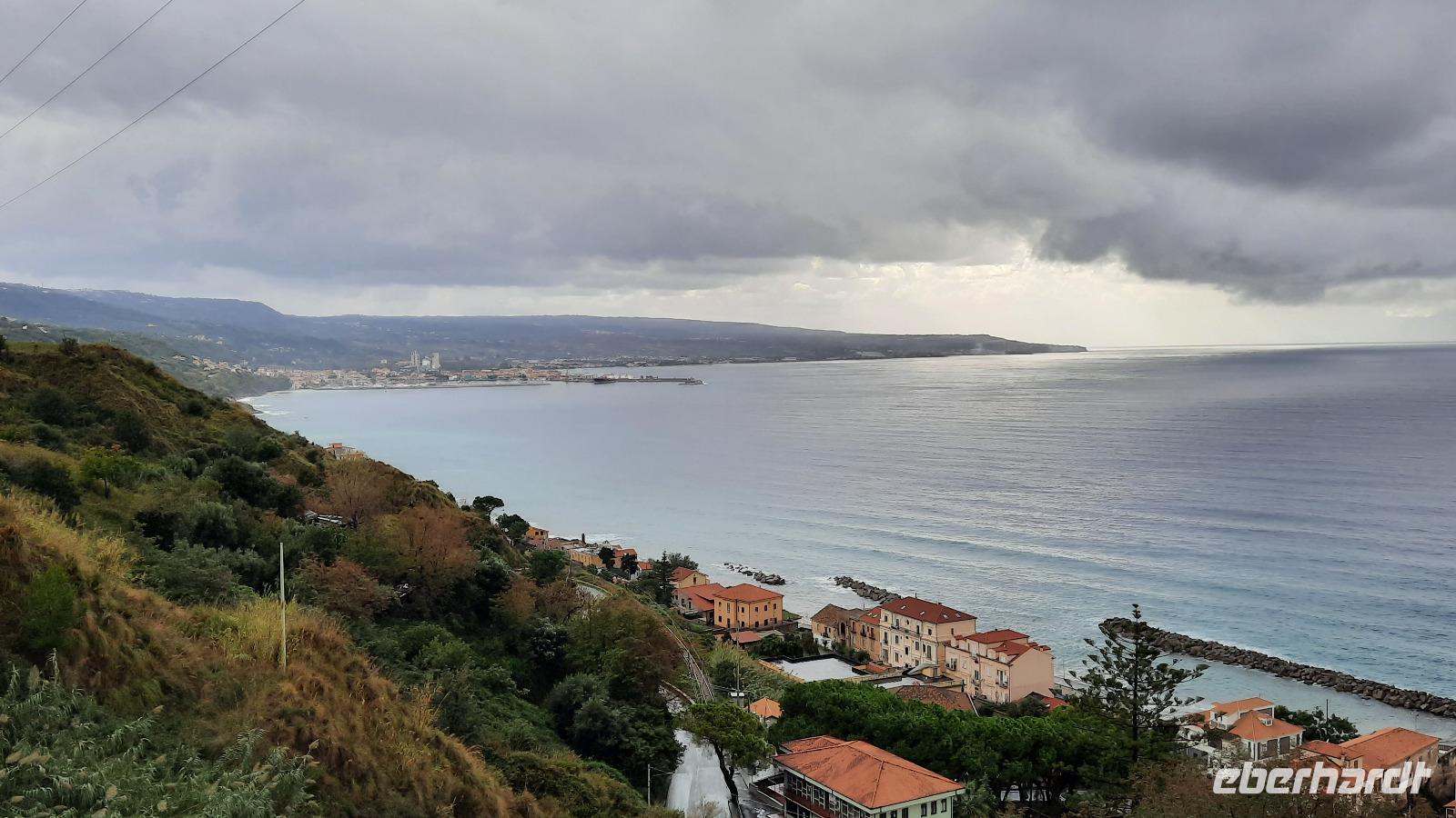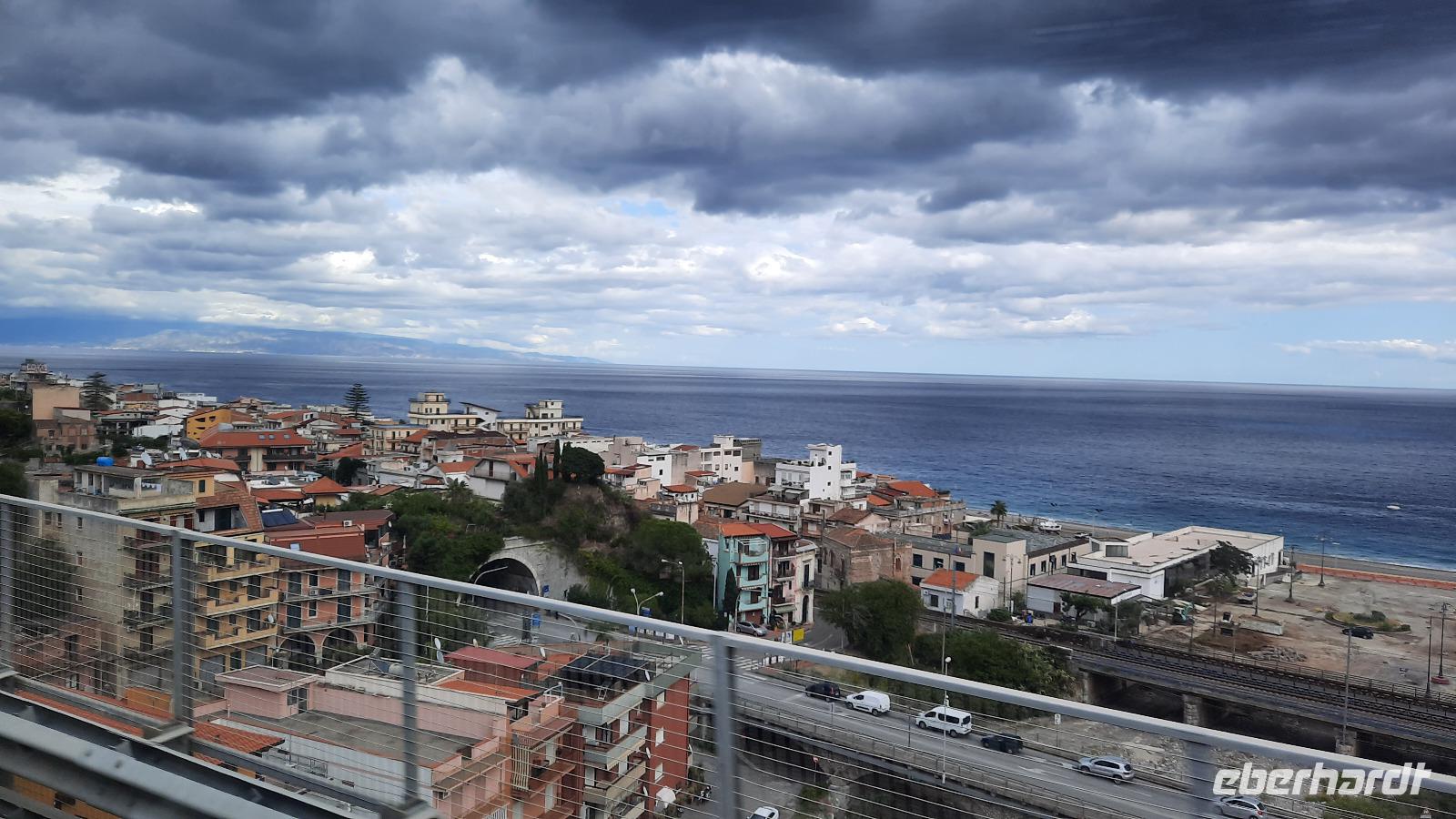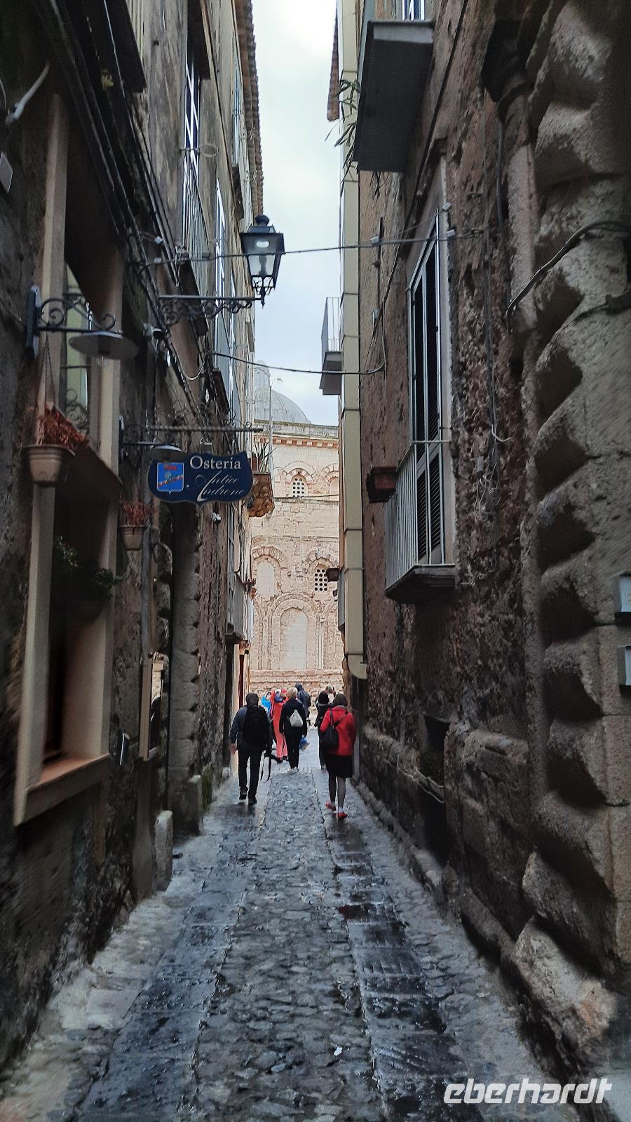Nach dem Frühstück starteten wir mit Claudia und Thomaso, das angrenzende Tropea zu erkunden. Die wunderbar wärmende Sonne vom Vortag hatte dicken Regenwolken Platz gemacht. Aber das störte uns kaum. Vorerst. Claudia spazierte mit und in der Altstadt von Tropea. Angefangen vom Platz Piazza del Cannone, von dem man aus einen unglaublich schönen Blick auf die Benediktinerwallfahrtskirche Santa Maria dell'Isola genießen konnte. Diese befindet sich auf der Spitze eines Sandsteinfelsens, der Altstadt Tropeas vorgelagert. Wir spazierten weiter durch schmale Gassen, vorbei an zahlreichen Cafés und Restaurants, besuchten die Jesuitenkirche von Gesu, sahen prächtige Portale, versteckte kleine Plätze und besuchten schließlich die Kathedrale von Tropea. Diese schlichte Kathedrale aus dem 12. Jahrhundert wurde ursprünglich auf einem byzantinischen Friedhof erbaut und beherbergt einen Sarkophag aus Marmor sowie ein weltbekanntes Bildnis der Maria von Romania, der Schutzpatronin der Stadt. In der anschließenden Freizeit, konnte jeder nach Lust und Laune die Altstadt erkunden oder sich bei einem italienischen Kaffee vor dem Regen schützen. Da es mittlerweile in Strömen regnete, beschlossen wir, eine längere Mittagspause im Hotel einzulegen. Kurz vorher erhielten wir auch die Nachricht, dass der geplante Ausflug zu den Liparischen Inseln wegen schlechten Wetters ausfallen würde. Eine Alternative musste jetzt gefunden werden. Claudia schlug uns einen Ausflug nach Sizilien vor. Nach dem Ende der Mittagspause sagten alle Eberhardt-Reisegäste der Alternative zu. Wir freuten uns sehr! Nun führten wir unsere Besichtigungstour weiter fort und wir erreichten die Höhlenkirche Piedigrotta, die bereits im 17. Jahrhundert als Dank neapolitanischer Schiffbrüchiger einen Altar aufgestellt bekam. Während wir den Erläuterungen Claudias lauschten, erkundeten wir die mystisch anmutende Höhle mit ihren biblischen Figuren, die alle durch das einstrahlende Licht verschieden angeleuchtet wurden. Wir steigen die Treppen wieder empor und Thomaso brachte uns weiter nach Pizzo. Der Regen holte uns erneut ein, daher besichtigten wir das Museum der Festung Murat, in dem der Schwager Napoleons und König von Neapel, Joachim Murat, 1815 hingerichtet wurde. Wir schlenderten weiter, sahen uns die Kathedrale von San Giorgio a Pizzo an und beschlossen, eine mächtig dunkle Regenwand auf uns zusteuern sehend, ein typisches Tartufo-Eis zu probieren. Wir besuchten das Eiscafé von Morino und kosteten das „Tarufo Moro" während draußen der Regen niederprasselte. Nachdem der Regen nachgelassen hatteund wir wieder den Bus erreichten, erzählte uns Claudia auf dem Rückweg mehr über Vulkanismus und das Leben mit Ausbrüchen des Stromboli.