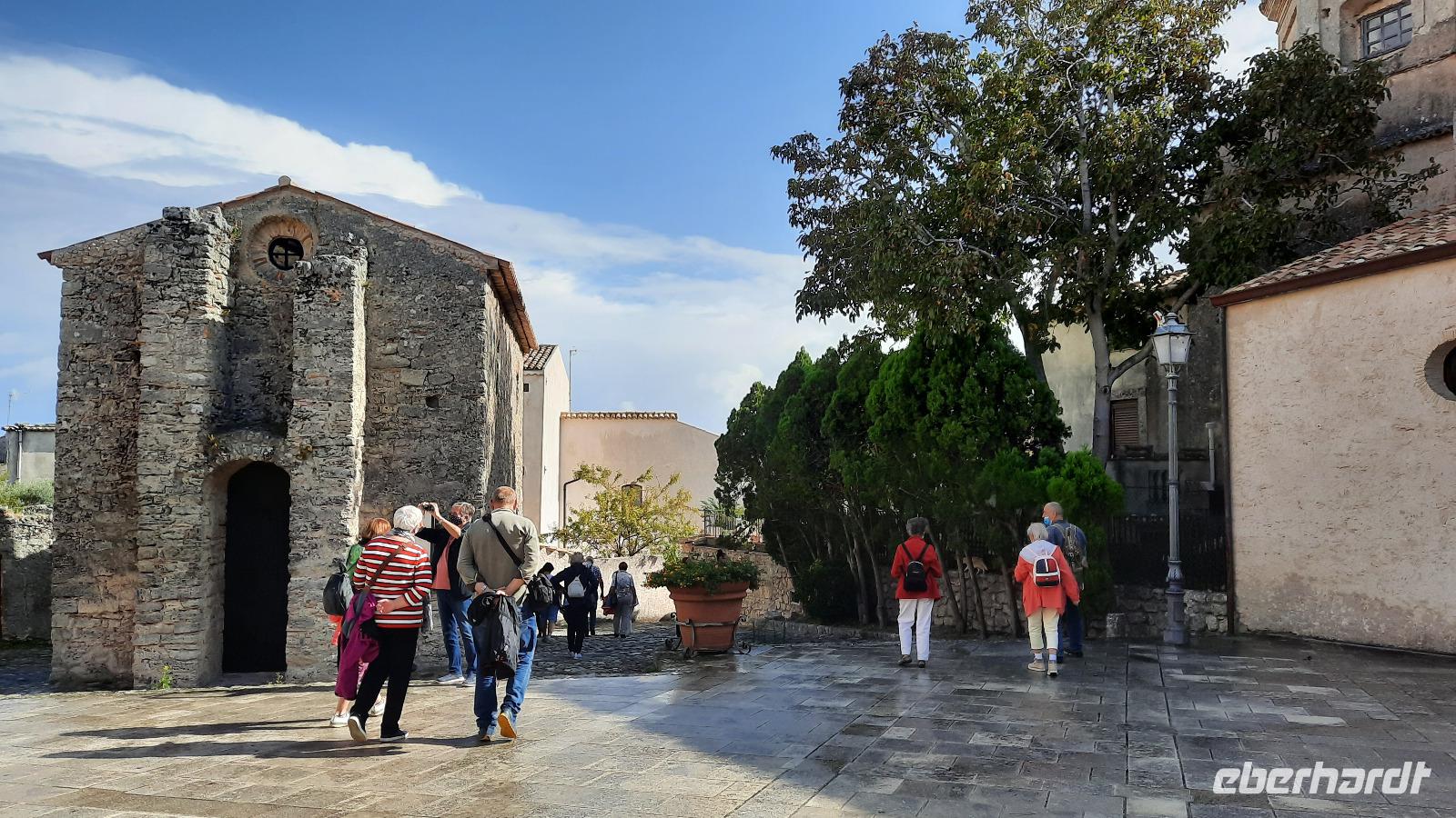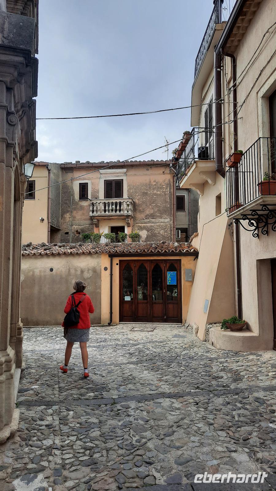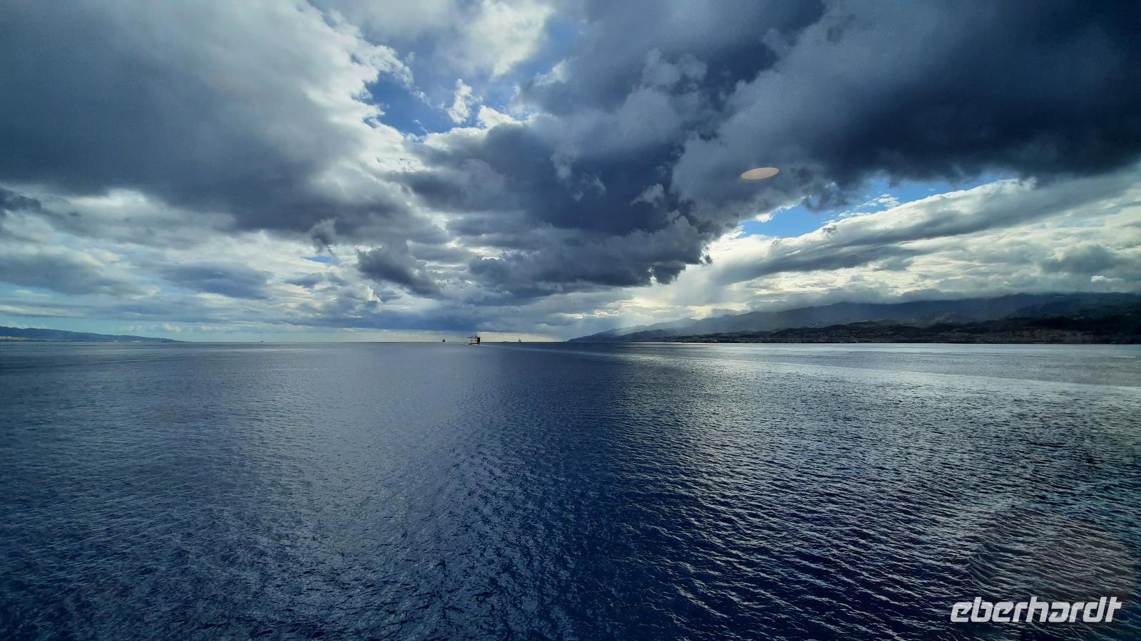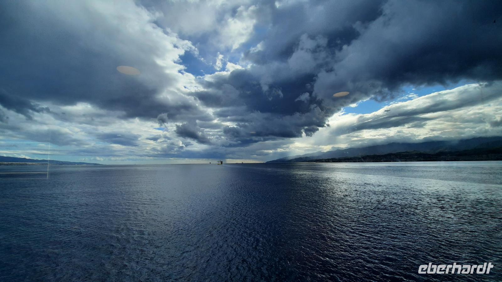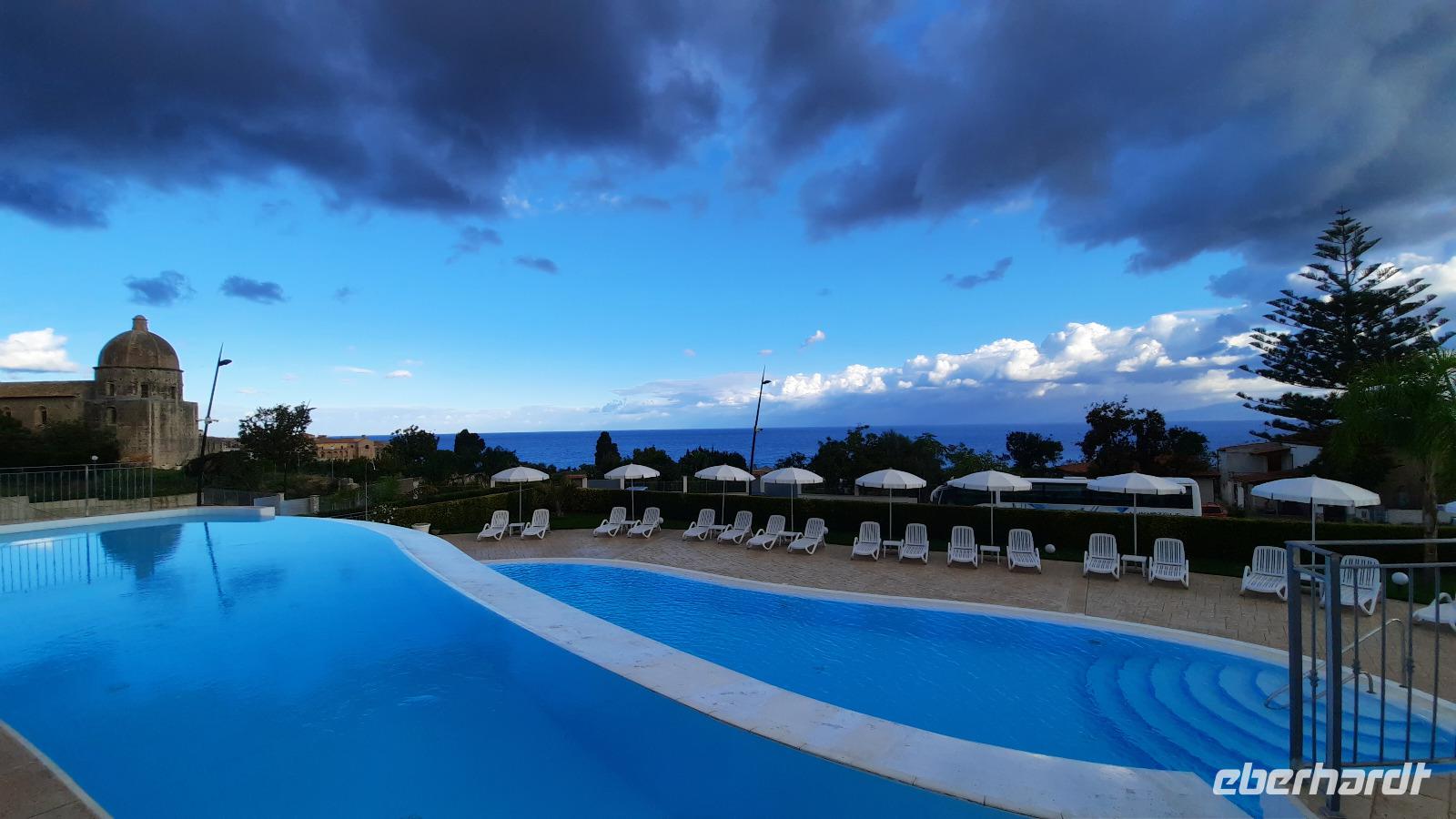 Nach dem Frühstück starteten wir mit Claudia und Thomaso, das angrenzende Tropea zu erkunden. Die wunderbar wärmende Sonne vom Vortag hatte dicken Regenwolken Platz gemacht. Aber das störte uns kaum. Vorerst. Claudia spazierte mit und in der Altstadt von Tropea. Angefangen vom Platz Piazza del Cannone, von dem man aus einen unglaublich schönen Blick auf die Benediktinerwallfahrtskirche Santa Maria dell'Isola genießen konnte. Diese befindet sich auf der Spitze eines Sandsteinfelsens, der Altstadt Tropeas vorgelagert. Wir spazierten weiter durch schmale Gassen, vorbei an zahlreichen Cafés und Restaurants, besuchten die Jesuitenkirche von Gesu, sahen prächtige Portale, versteckte kleine Plätze und besuchten schließlich die Kathedrale von Tropea. Diese schlichte Kathedrale aus dem 12. Jahrhundert wurde ursprünglich auf einem byzantinischen Friedhof erbaut und beherbergt einen Sarkophag aus Marmor sowie ein weltbekanntes Bildnis der Maria von Romania, der Schutzpatronin der Stadt. In der anschließenden Freizeit, konnte jeder nach Lust und Laune die Altstadt erkunden oder sich bei einem italienischen Kaffee vor dem Regen schützen. Da es mittlerweile in Strömen regnete, beschlossen wir, eine längere Mittagspause im Hotel einzulegen. Kurz vorher erhielten wir auch die Nachricht, dass der geplante Ausflug zu den Liparischen Inseln wegen schlechten Wetters ausfallen würde. Eine Alternative musste jetzt gefunden werden. Claudia schlug uns einen Ausflug nach Sizilien vor. Nach dem Ende der Mittagspause sagten alle Eberhardt-Reisegäste der Alternative zu. Wir freuten uns sehr! Nun führten wir unsere Besichtigungstour weiter fort und wir erreichten die Höhlenkirche Piedigrotta, die bereits im 17. Jahrhundert als Dank neapolitanischer Schiffbrüchiger einen Altar aufgestellt bekam. Während wir den Erläuterungen Claudias lauschten, erkundeten wir die mystisch anmutende Höhle mit ihren biblischen Figuren, die alle durch das einstrahlende Licht verschieden angeleuchtet wurden. Wir steigen die Treppen wieder empor und Thomaso brachte uns weiter nach Pizzo. Der Regen holte uns erneut ein, daher besichtigten wir das Museum der Festung Murat, in dem der Schwager Napoleons und König von Neapel, Joachim Murat, 1815 hingerichtet wurde. Wir schlenderten weiter, sahen uns die Kathedrale von San Giorgio a Pizzo an und beschlossen, eine mächtig dunkle Regenwand auf uns zusteuern sehend, ein typisches Tartufo-Eis zu probieren. Wir besuchten das Eiscafé von Morino und kosteten das „Tarufo Moro" während draußen der Regen niederprasselte. Nachdem der Regen nachgelassen hatteund wir wieder den Bus erreichten, erzählte uns Claudia auf dem Rückweg mehr über Vulkanismus und das Leben mit Ausbrüchen des Stromboli.
