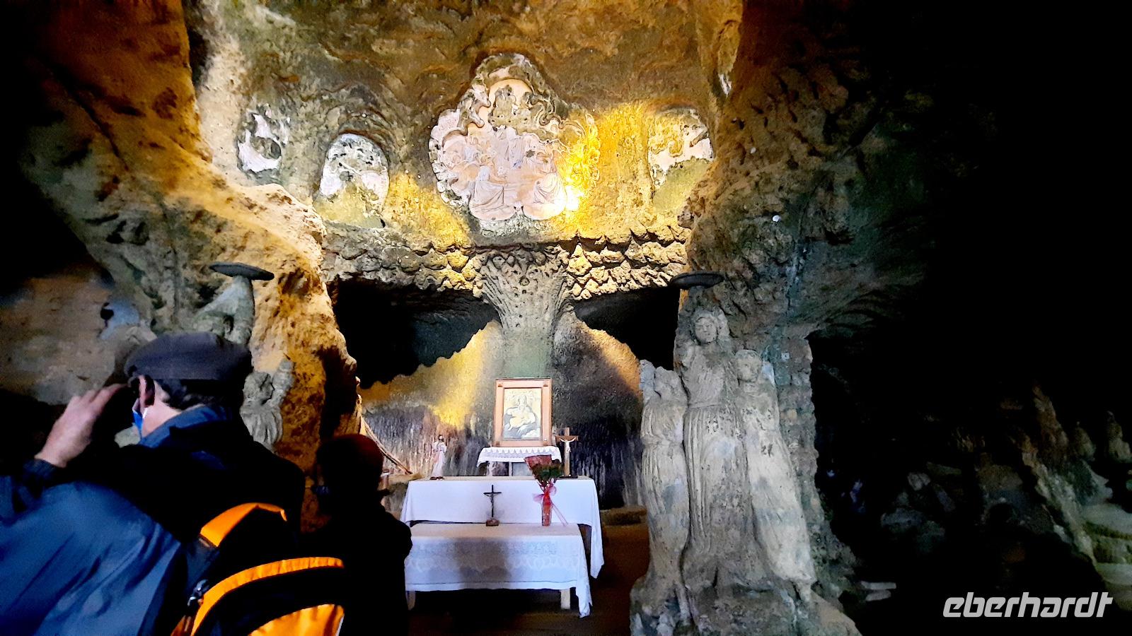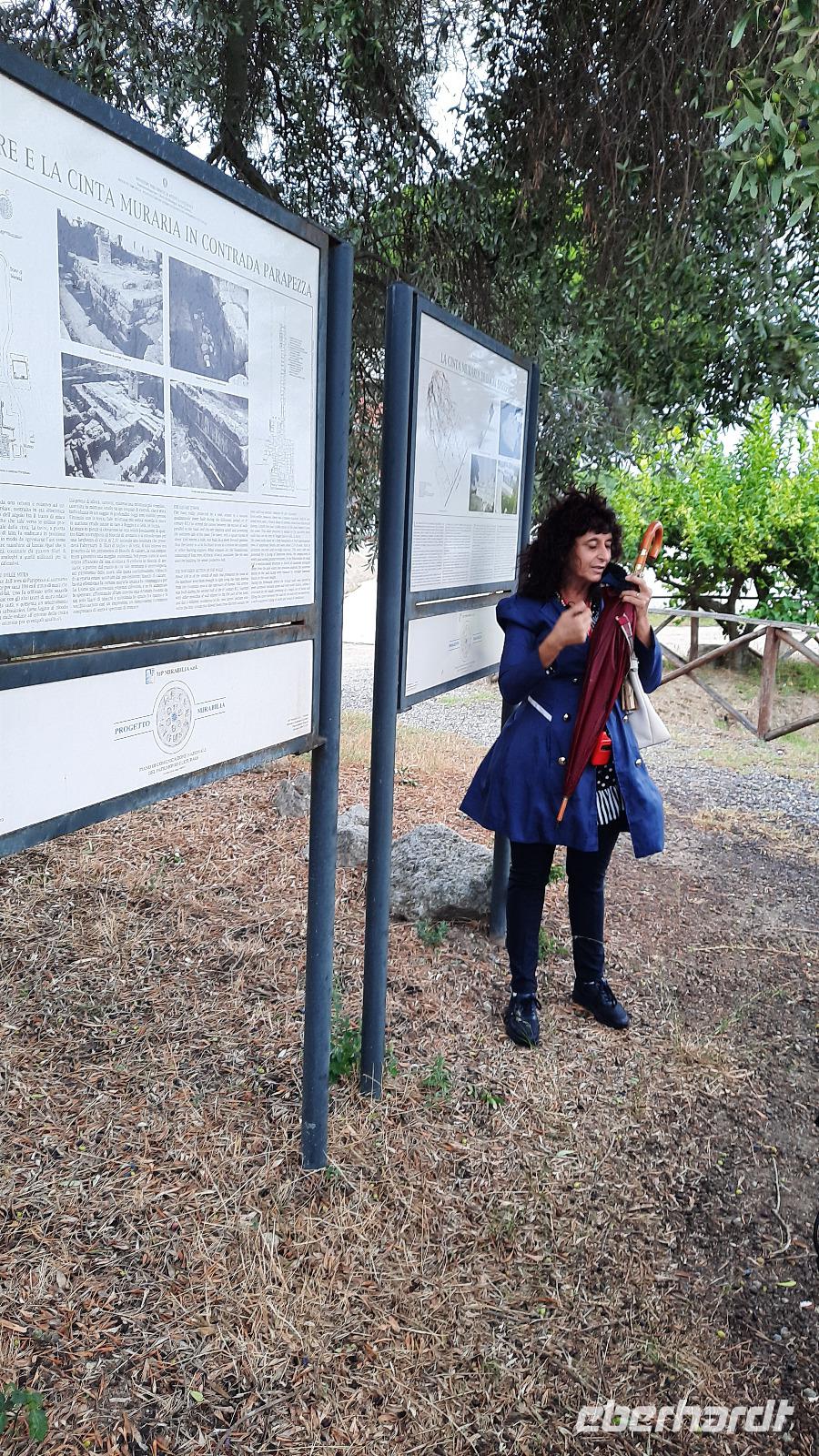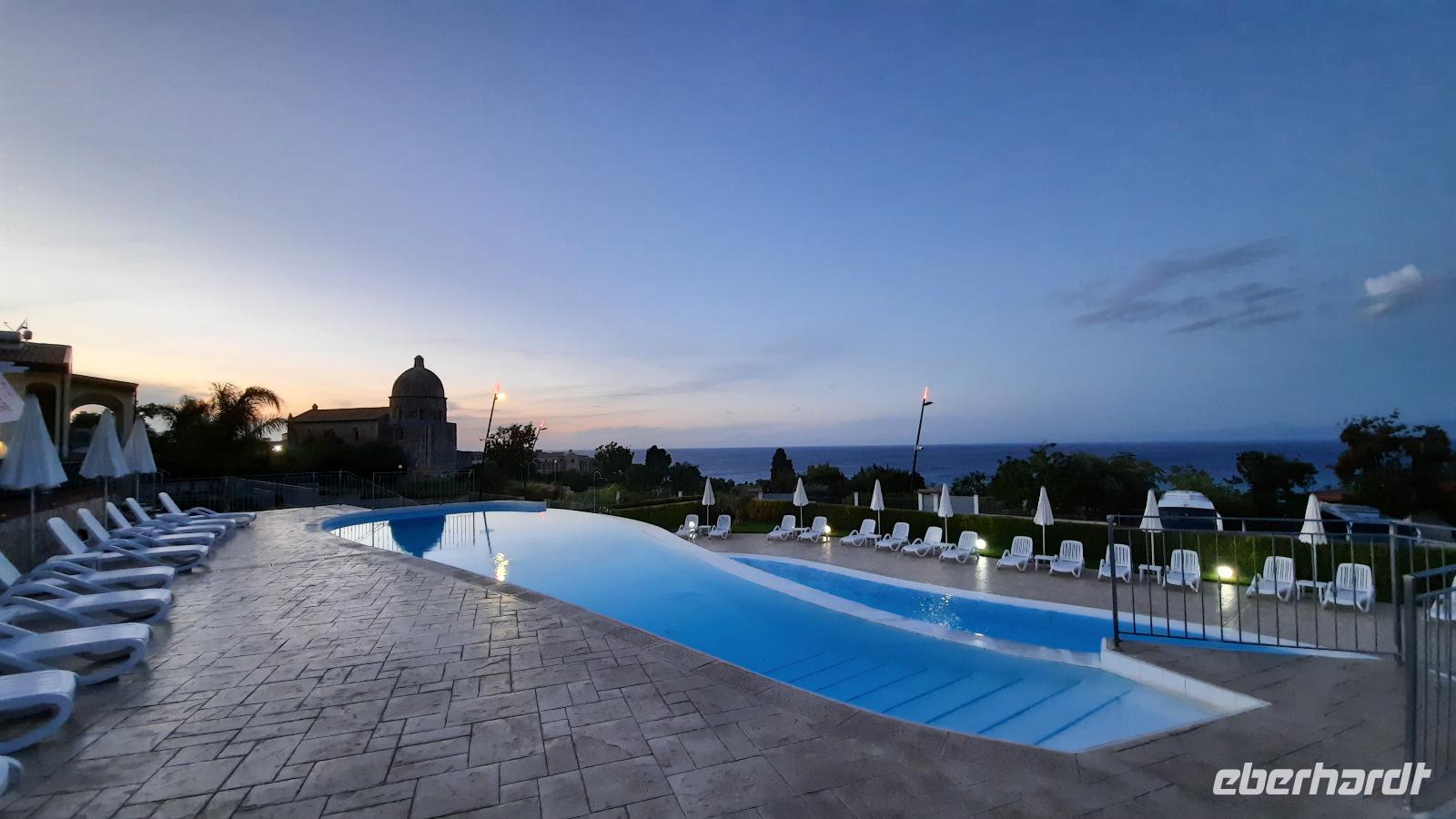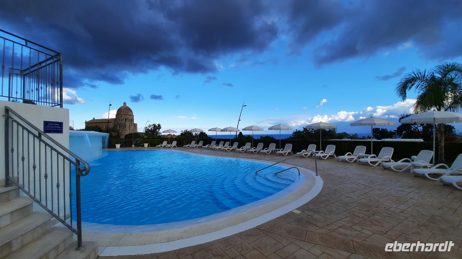 Nach dem Frühstück starteten wir mit Claudia und Thomaso, das angrenzende Tropea zu erkunden. Die wunderbar wärmende Sonne vom Vortag hatte dicken Regenwolken Platz gemacht. Aber das störte uns kaum. Vorerst. Claudia spazierte mit und in der Altstadt von Tropea. Angefangen vom Platz Piazza del Cannone, von dem man aus einen unglaublich schönen Blick auf die Benediktinerwallfahrtskirche Santa Maria dell'Isola genießen konnte. Diese befindet sich auf der Spitze eines Sandsteinfelsens, der Altstadt Tropeas vorgelagert. Wir spazierten weiter durch schmale Gassen, vorbei an zahlreichen Cafés und Restaurants, besuchten die Jesuitenkirche von Gesu, sahen prächtige Portale, versteckte kleine Plätze und besuchten schließlich die Kathedrale von Tropea. Diese schlichte Kathedrale aus dem 12. Jahrhundert wurde ursprünglich auf einem byzantinischen Friedhof erbaut und beherbergt einen Sarkophag aus Marmor sowie ein weltbekanntes Bildnis der Maria von Romania, der Schutzpatronin der Stadt. In der anschließenden Freizeit, konnte jeder nach Lust und Laune die Altstadt erkunden oder sich bei einem italienischen Kaffee vor dem Regen schützen. Da es mittlerweile in Strömen regnete, beschlossen wir, eine längere Mittagspause im Hotel einzulegen. Kurz vorher erhielten wir auch die Nachricht, dass der geplante Ausflug zu den Liparischen Inseln wegen schlechten Wetters ausfallen würde. Eine Alternative musste jetzt gefunden werden. Claudia schlug uns einen Ausflug nach Sizilien vor. Nach dem Ende der Mittagspause sagten alle Eberhardt-Reisegäste der Alternative zu. Wir freuten uns sehr! Nun führten wir unsere Besichtigungstour weiter fort und wir erreichten die Höhlenkirche Piedigrotta, die bereits im 17. Jahrhundert als Dank neapolitanischer Schiffbrüchiger einen Altar aufgestellt bekam. Während wir den Erläuterungen Claudias lauschten, erkundeten wir die mystisch anmutende Höhle mit ihren biblischen Figuren, die alle durch das einstrahlende Licht verschieden angeleuchtet wurden. Wir steigen die Treppen wieder empor und Thomaso brachte uns weiter nach Pizzo. Der Regen holte uns erneut ein, daher besichtigten wir das Museum der Festung Murat, in dem der Schwager Napoleons und König von Neapel, Joachim Murat, 1815 hingerichtet wurde. Wir schlenderten weiter, sahen uns die Kathedrale von San Giorgio a Pizzo an und beschlossen, eine mächtig dunkle Regenwand auf uns zusteuern sehend, ein typisches Tartufo-Eis zu probieren. Wir besuchten das Eiscafé von Morino und kosteten das „Tarufo Moro" während draußen der Regen niederprasselte. Nachdem der Regen nachgelassen hatteund wir wieder den Bus erreichten, erzählte uns Claudia auf dem Rückweg mehr über Vulkanismus und das Leben mit Ausbrüchen des Stromboli.