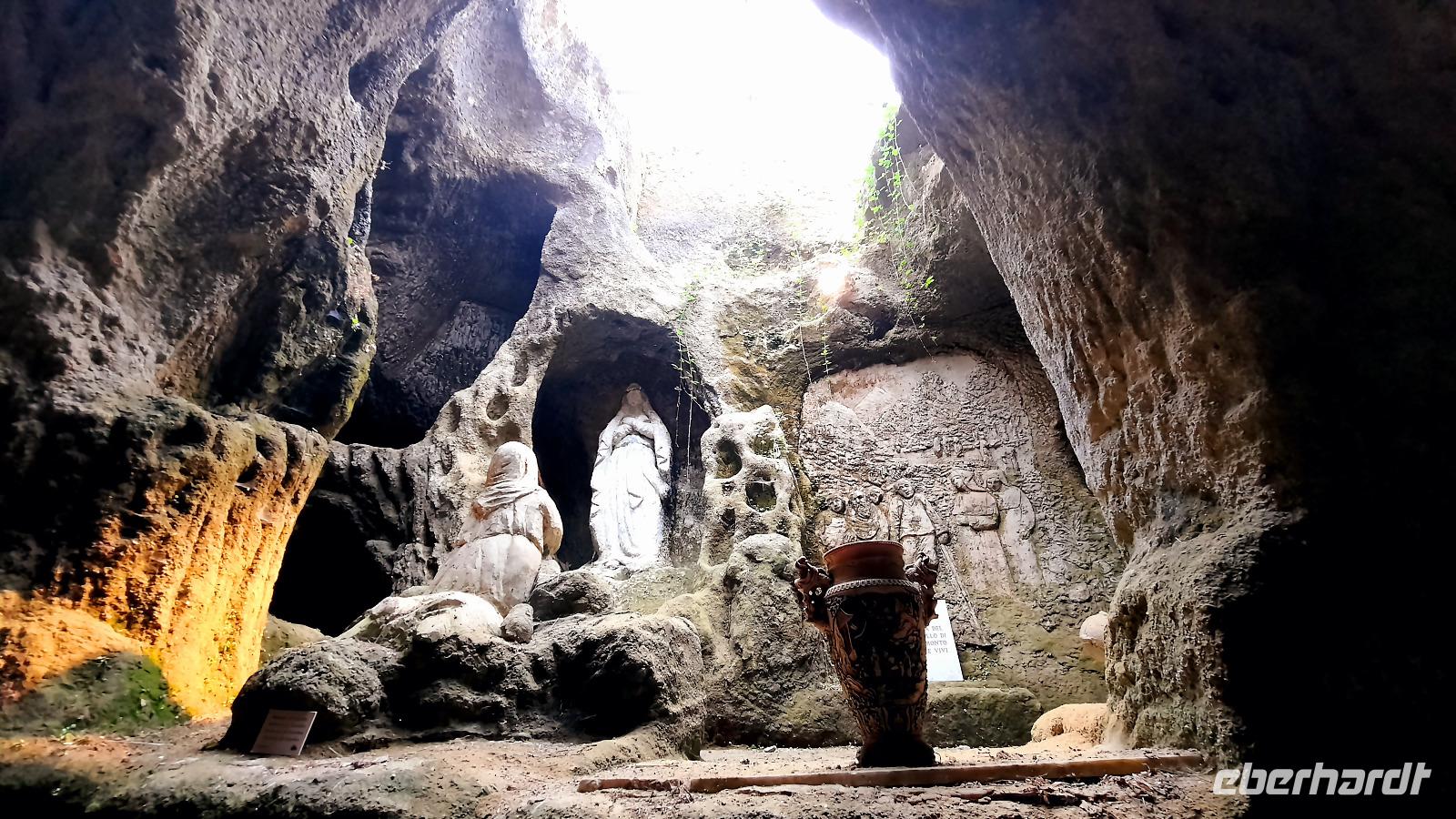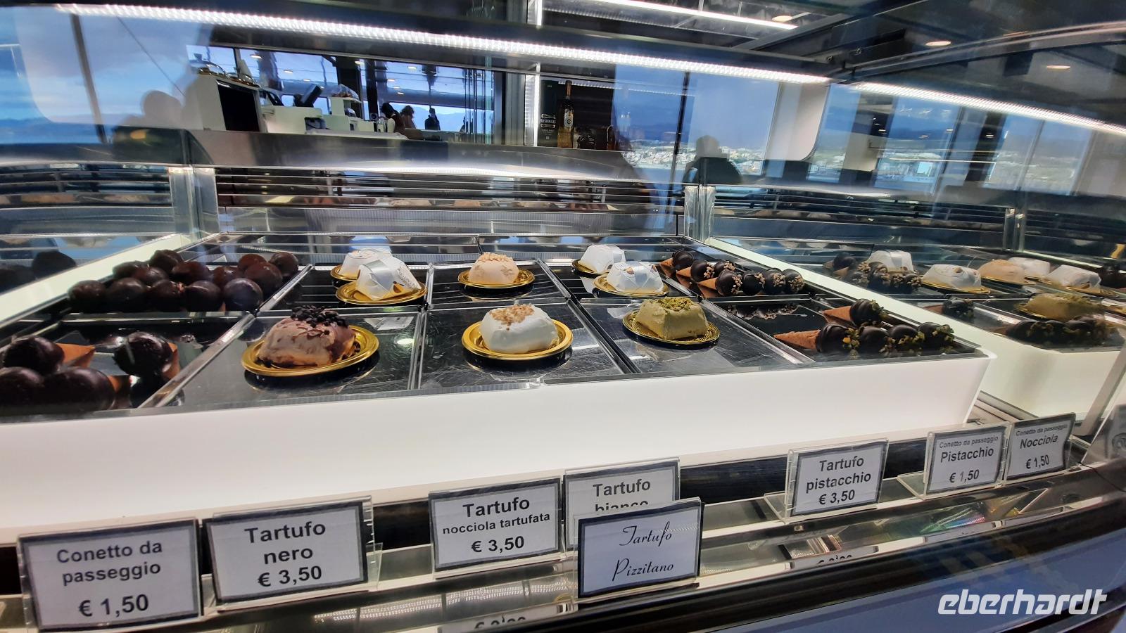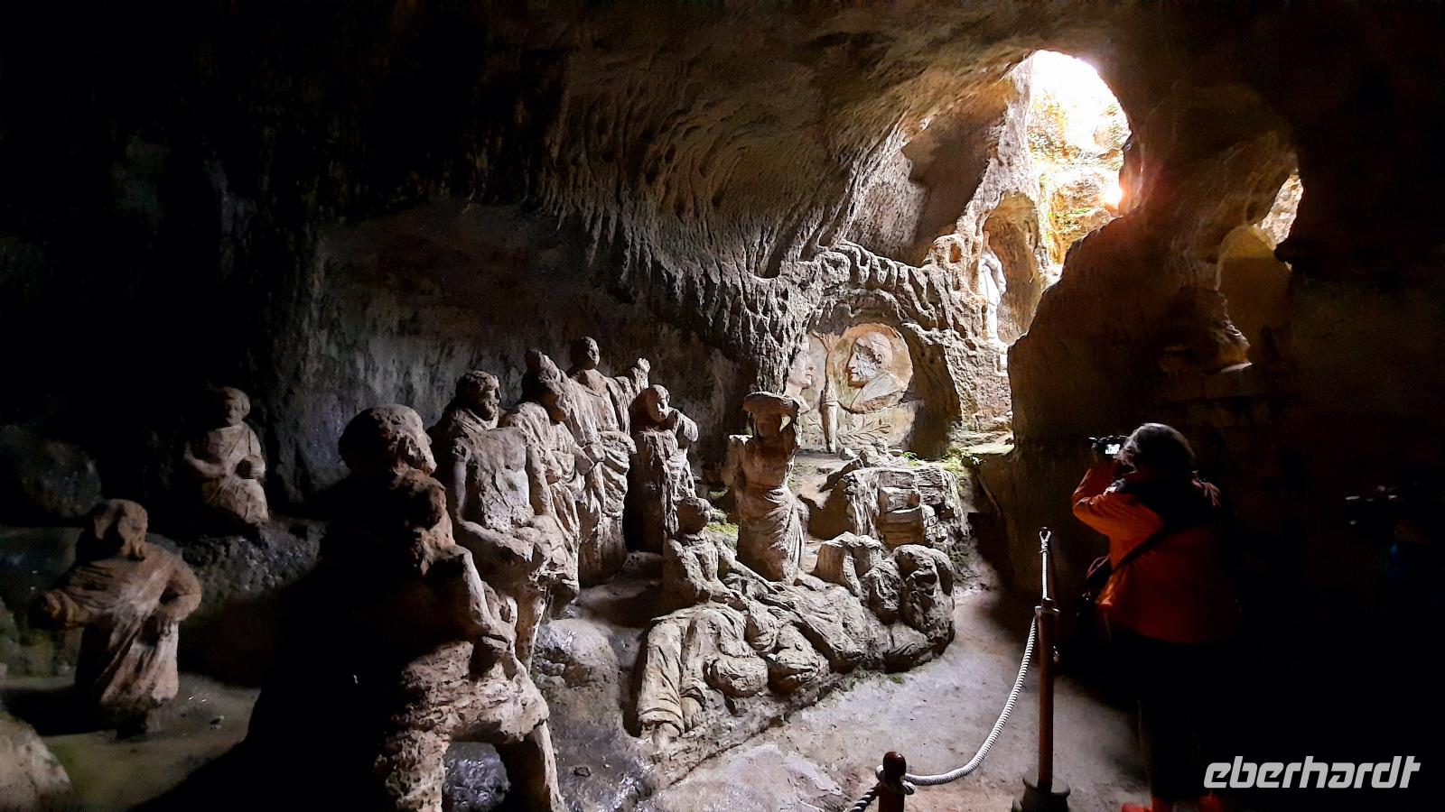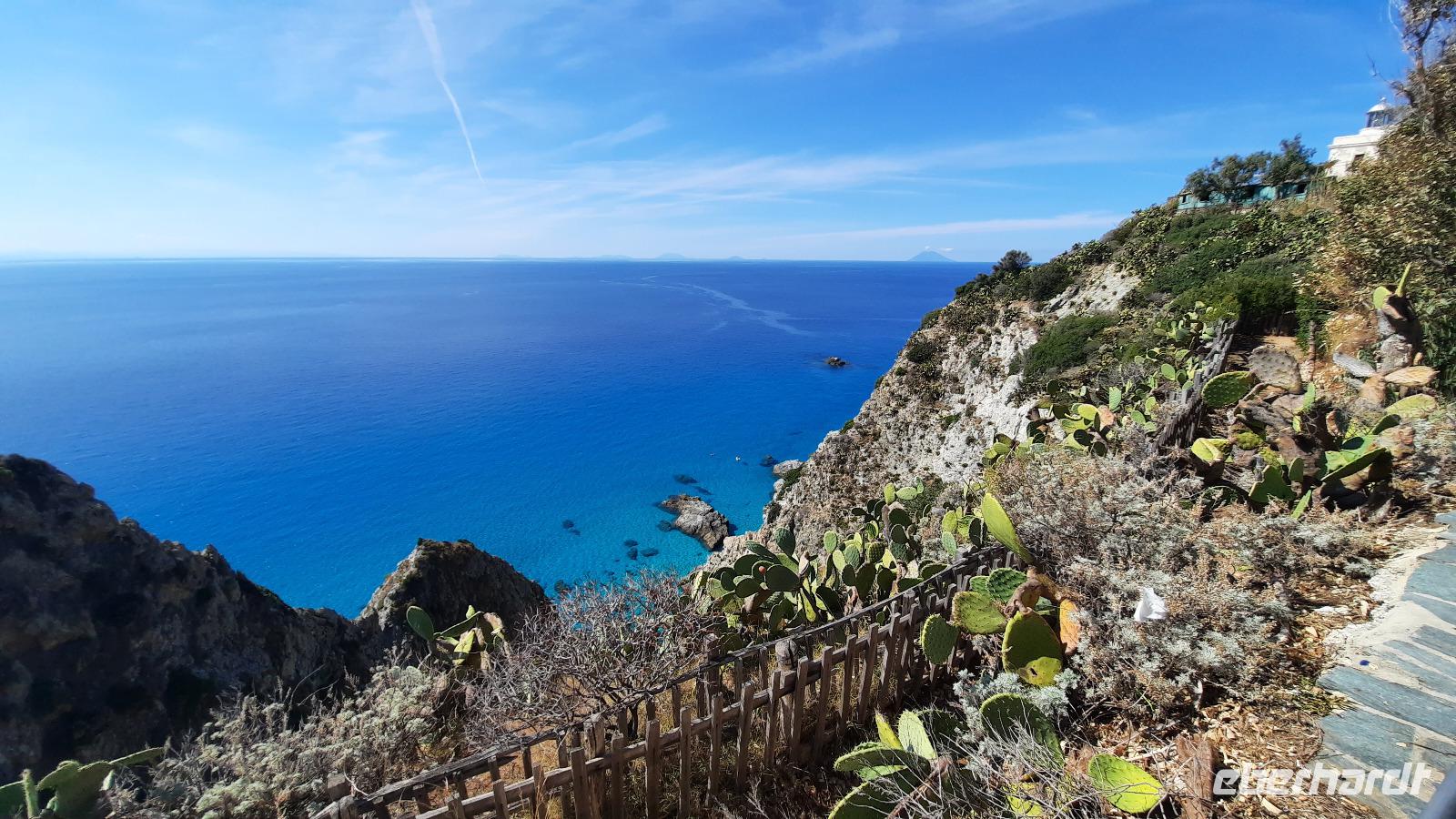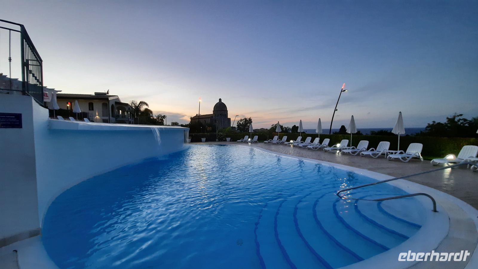 Nach dem Frühstück starteten wir mit Claudia und Thomaso, das angrenzende Tropea zu erkunden. Die wunderbar wärmende Sonne vom Vortag hatte dicken Regenwolken Platz gemacht. Aber das störte uns kaum. Vorerst. Claudia spazierte mit und in der Altstadt von Tropea. Angefangen vom Platz Piazza del Cannone, von dem man aus einen unglaublich schönen Blick auf die Benediktinerwallfahrtskirche Santa Maria dell'Isola genießen konnte. Diese befindet sich auf der Spitze eines Sandsteinfelsens, der Altstadt Tropeas vorgelagert. Wir spazierten weiter durch schmale Gassen, vorbei an zahlreichen Cafés und Restaurants, besuchten die Jesuitenkirche von Gesu, sahen prächtige Portale, versteckte kleine Plätze und besuchten schließlich die Kathedrale von Tropea. Diese schlichte Kathedrale aus dem 12. Jahrhundert wurde ursprünglich auf einem byzantinischen Friedhof erbaut und beherbergt einen Sarkophag aus Marmor sowie ein weltbekanntes Bildnis der Maria von Romania, der Schutzpatronin der Stadt. In der anschließenden Freizeit, konnte jeder nach Lust und Laune die Altstadt erkunden oder sich bei einem italienischen Kaffee vor dem Regen schützen. Da es mittlerweile in Strömen regnete, beschlossen wir, eine längere Mittagspause im Hotel einzulegen. Kurz vorher erhielten wir auch die Nachricht, dass der geplante Ausflug zu den Liparischen Inseln wegen schlechten Wetters ausfallen würde. Eine Alternative musste jetzt gefunden werden. Claudia schlug uns einen Ausflug nach Sizilien vor. Nach dem Ende der Mittagspause sagten alle Eberhardt-Reisegäste der Alternative zu. Wir freuten uns sehr! Nun führten wir unsere Besichtigungstour weiter fort und wir erreichten die Höhlenkirche Piedigrotta, die bereits im 17. Jahrhundert als Dank neapolitanischer Schiffbrüchiger einen Altar aufgestellt bekam. Während wir den Erläuterungen Claudias lauschten, erkundeten wir die mystisch anmutende Höhle mit ihren biblischen Figuren, die alle durch das einstrahlende Licht verschieden angeleuchtet wurden. Wir steigen die Treppen wieder empor und Thomaso brachte uns weiter nach Pizzo. Der Regen holte uns erneut ein, daher besichtigten wir das Museum der Festung Murat, in dem der Schwager Napoleons und König von Neapel, Joachim Murat, 1815 hingerichtet wurde. Wir schlenderten weiter, sahen uns die Kathedrale von San Giorgio a Pizzo an und beschlossen, eine mächtig dunkle Regenwand auf uns zusteuern sehend, ein typisches Tartufo-Eis zu probieren. Wir besuchten das Eiscafé von Morino und kosteten das „Tarufo Moro" während draußen der Regen niederprasselte. Nachdem der Regen nachgelassen hatteund wir wieder den Bus erreichten, erzählte uns Claudia auf dem Rückweg mehr über Vulkanismus und das Leben mit Ausbrüchen des Stromboli.