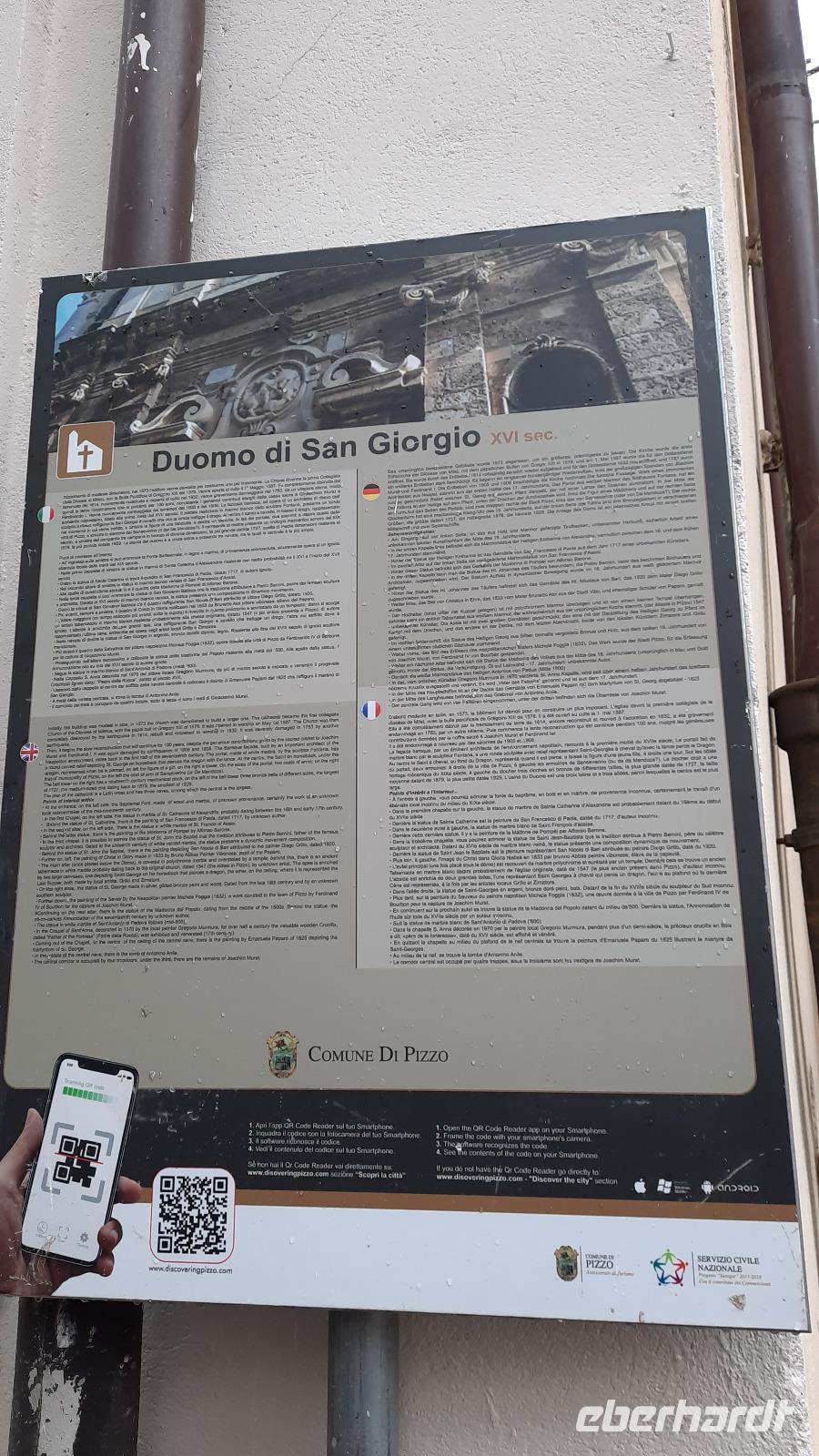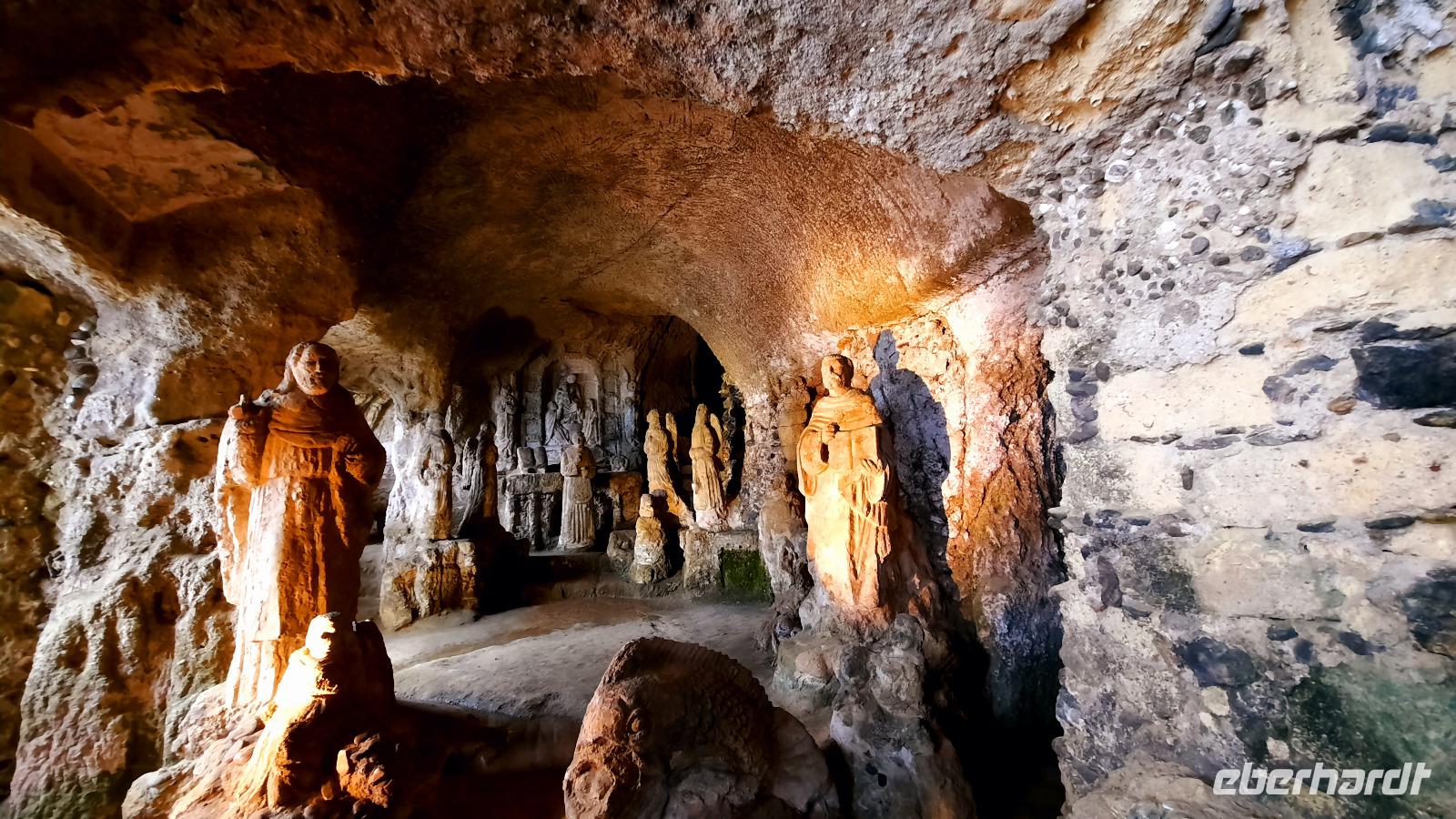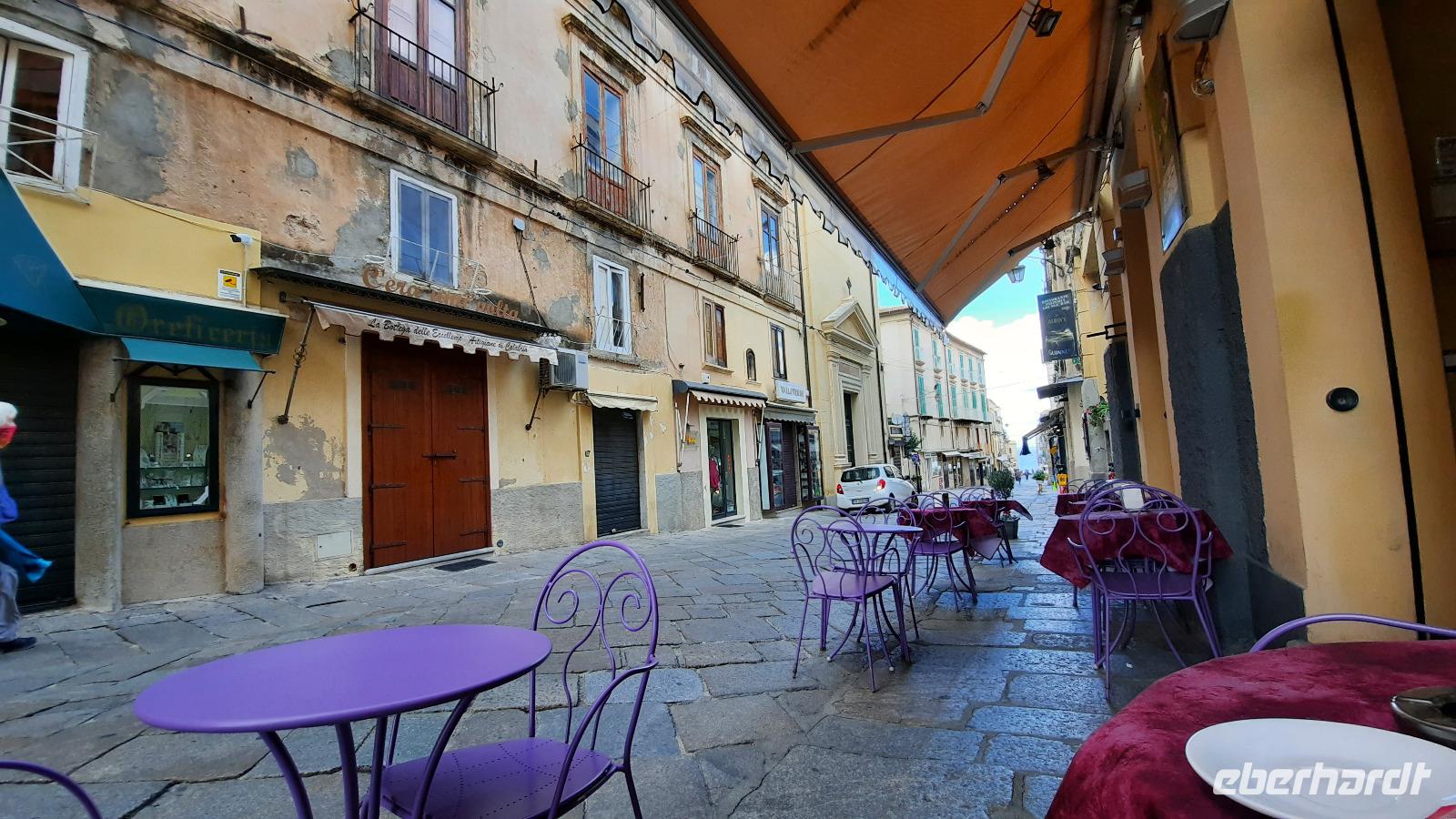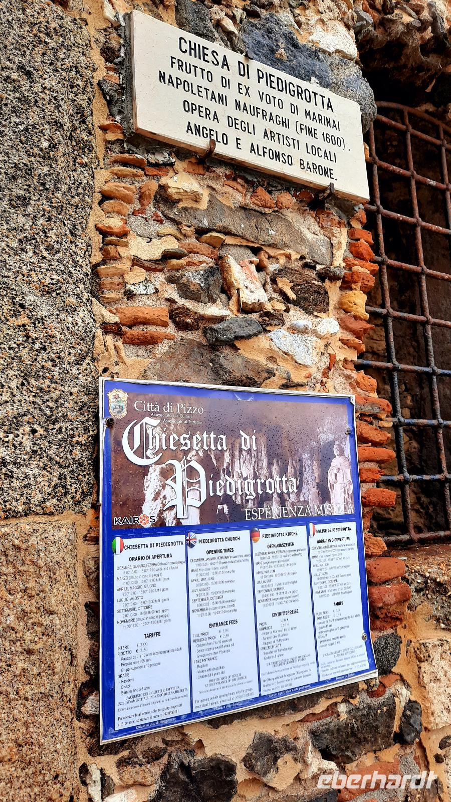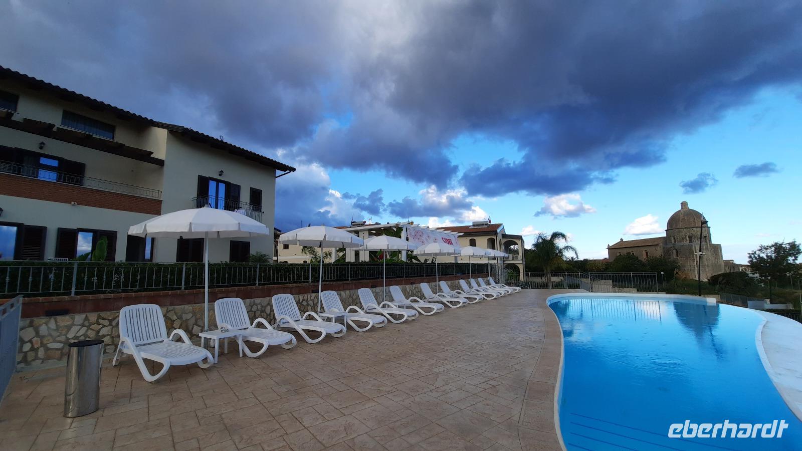 Nach dem Frühstück starteten wir mit Claudia und Thomaso, das angrenzende Tropea zu erkunden. Die wunderbar wärmende Sonne vom Vortag hatte dicken Regenwolken Platz gemacht. Aber das störte uns kaum. Vorerst. Claudia spazierte mit und in der Altstadt von Tropea. Angefangen vom Platz Piazza del Cannone, von dem man aus einen unglaublich schönen Blick auf die Benediktinerwallfahrtskirche Santa Maria dell'Isola genießen konnte. Diese befindet sich auf der Spitze eines Sandsteinfelsens, der Altstadt Tropeas vorgelagert. Wir spazierten weiter durch schmale Gassen, vorbei an zahlreichen Cafés und Restaurants, besuchten die Jesuitenkirche von Gesu, sahen prächtige Portale, versteckte kleine Plätze und besuchten schließlich die Kathedrale von Tropea. Diese schlichte Kathedrale aus dem 12. Jahrhundert wurde ursprünglich auf einem byzantinischen Friedhof erbaut und beherbergt einen Sarkophag aus Marmor sowie ein weltbekanntes Bildnis der Maria von Romania, der Schutzpatronin der Stadt. In der anschließenden Freizeit, konnte jeder nach Lust und Laune die Altstadt erkunden oder sich bei einem italienischen Kaffee vor dem Regen schützen. Da es mittlerweile in Strömen regnete, beschlossen wir, eine längere Mittagspause im Hotel einzulegen. Kurz vorher erhielten wir auch die Nachricht, dass der geplante Ausflug zu den Liparischen Inseln wegen schlechten Wetters ausfallen würde. Eine Alternative musste jetzt gefunden werden. Claudia schlug uns einen Ausflug nach Sizilien vor. Nach dem Ende der Mittagspause sagten alle Eberhardt-Reisegäste der Alternative zu. Wir freuten uns sehr! Nun führten wir unsere Besichtigungstour weiter fort und wir erreichten die Höhlenkirche Piedigrotta, die bereits im 17. Jahrhundert als Dank neapolitanischer Schiffbrüchiger einen Altar aufgestellt bekam. Während wir den Erläuterungen Claudias lauschten, erkundeten wir die mystisch anmutende Höhle mit ihren biblischen Figuren, die alle durch das einstrahlende Licht verschieden angeleuchtet wurden. Wir steigen die Treppen wieder empor und Thomaso brachte uns weiter nach Pizzo. Der Regen holte uns erneut ein, daher besichtigten wir das Museum der Festung Murat, in dem der Schwager Napoleons und König von Neapel, Joachim Murat, 1815 hingerichtet wurde. Wir schlenderten weiter, sahen uns die Kathedrale von San Giorgio a Pizzo an und beschlossen, eine mächtig dunkle Regenwand auf uns zusteuern sehend, ein typisches Tartufo-Eis zu probieren. Wir besuchten das Eiscafé von Morino und kosteten das „Tarufo Moro" während draußen der Regen niederprasselte. Nachdem der Regen nachgelassen hatteund wir wieder den Bus erreichten, erzählte uns Claudia auf dem Rückweg mehr über Vulkanismus und das Leben mit Ausbrüchen des Stromboli.