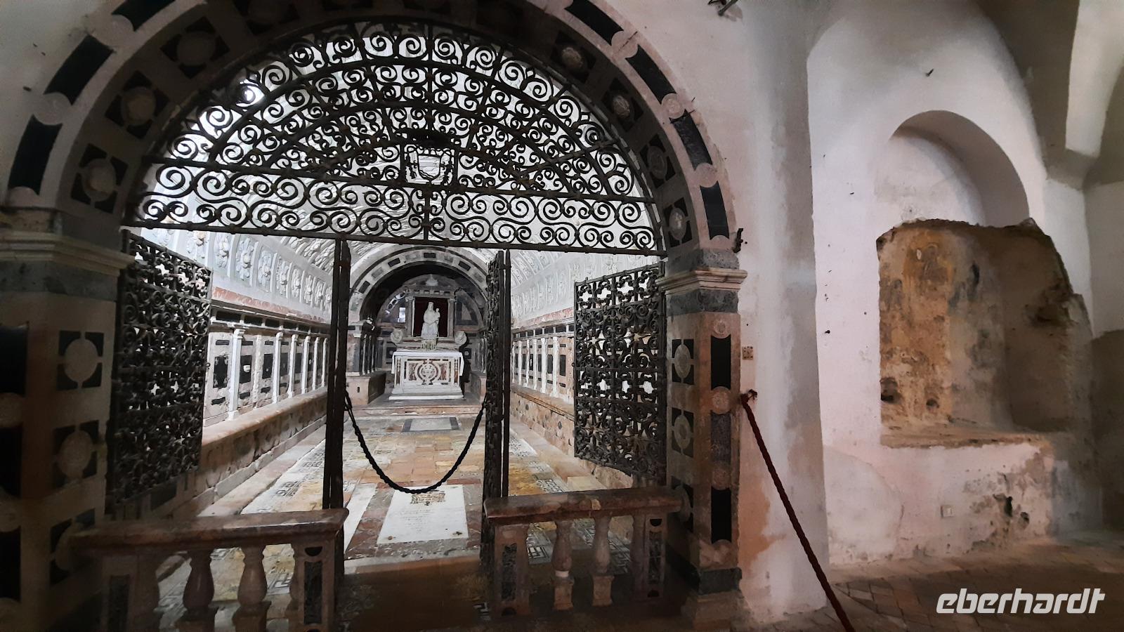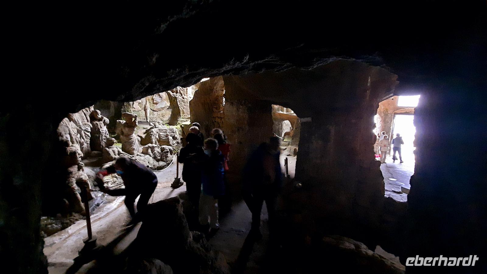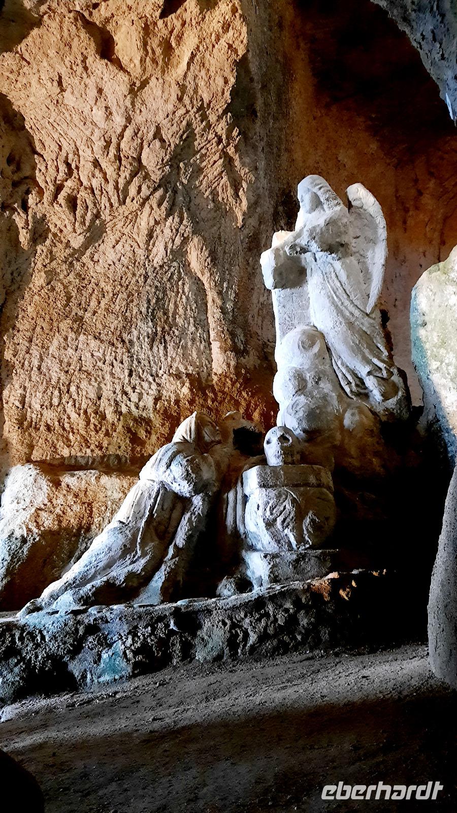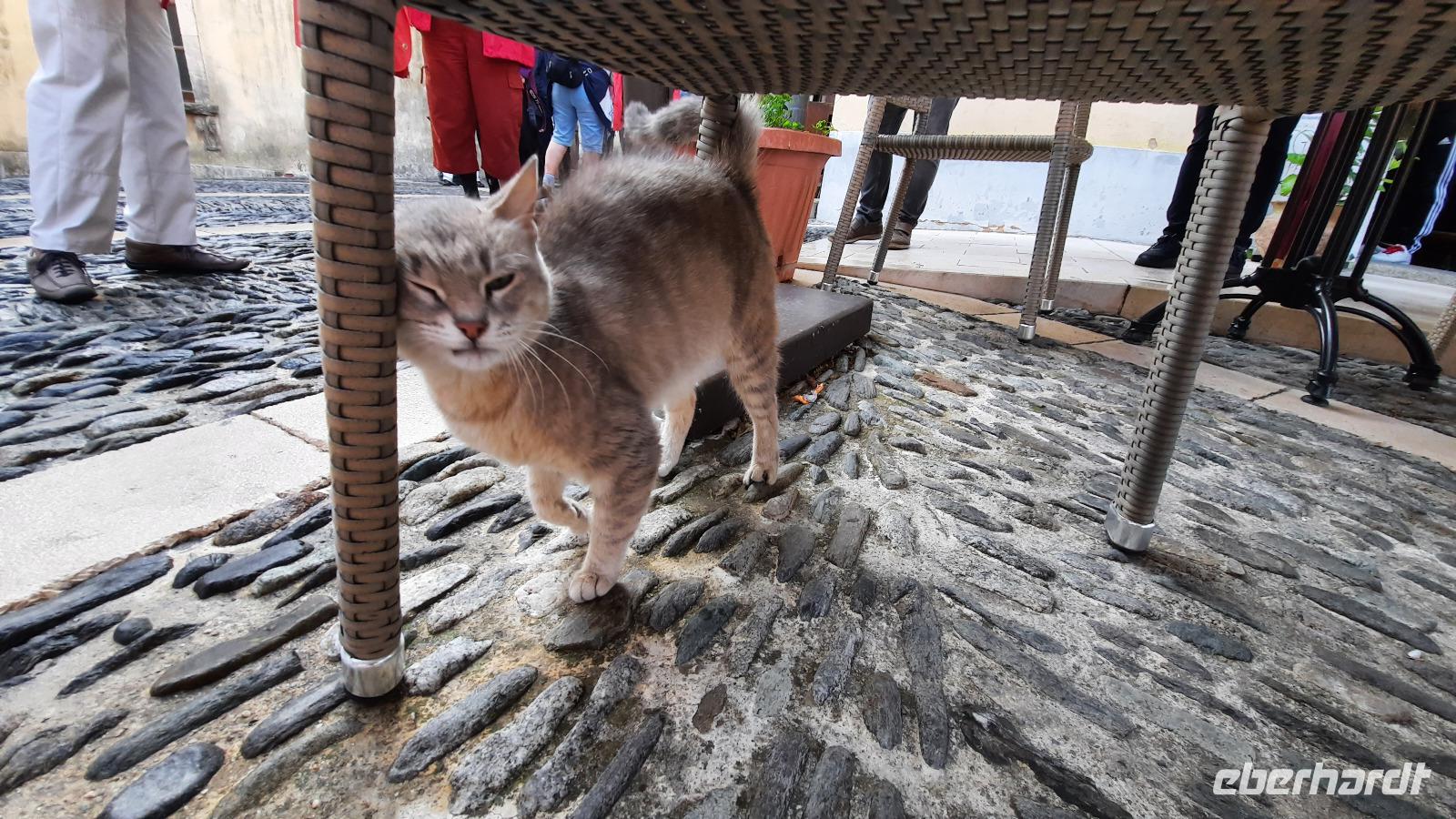 Nach dem Frühstück starteten wir mit Claudia und Thomaso, das angrenzende Tropea zu erkunden. Die wunderbar wärmende Sonne vom Vortag hatte dicken Regenwolken Platz gemacht. Aber das störte uns kaum. Vorerst. Claudia spazierte mit und in der Altstadt von Tropea. Angefangen vom Platz Piazza del Cannone, von dem man aus einen unglaublich schönen Blick auf die Benediktinerwallfahrtskirche Santa Maria dell'Isola genießen konnte. Diese befindet sich auf der Spitze eines Sandsteinfelsens, der Altstadt Tropeas vorgelagert. Wir spazierten weiter durch schmale Gassen, vorbei an zahlreichen Cafés und Restaurants, besuchten die Jesuitenkirche von Gesu, sahen prächtige Portale, versteckte kleine Plätze und besuchten schließlich die Kathedrale von Tropea. Diese schlichte Kathedrale aus dem 12. Jahrhundert wurde ursprünglich auf einem byzantinischen Friedhof erbaut und beherbergt einen Sarkophag aus Marmor sowie ein weltbekanntes Bildnis der Maria von Romania, der Schutzpatronin der Stadt. In der anschließenden Freizeit, konnte jeder nach Lust und Laune die Altstadt erkunden oder sich bei einem italienischen Kaffee vor dem Regen schützen. Da es mittlerweile in Strömen regnete, beschlossen wir, eine längere Mittagspause im Hotel einzulegen. Kurz vorher erhielten wir auch die Nachricht, dass der geplante Ausflug zu den Liparischen Inseln wegen schlechten Wetters ausfallen würde. Eine Alternative musste jetzt gefunden werden. Claudia schlug uns einen Ausflug nach Sizilien vor. Nach dem Ende der Mittagspause sagten alle Eberhardt-Reisegäste der Alternative zu. Wir freuten uns sehr! Nun führten wir unsere Besichtigungstour weiter fort und wir erreichten die Höhlenkirche Piedigrotta, die bereits im 17. Jahrhundert als Dank neapolitanischer Schiffbrüchiger einen Altar aufgestellt bekam. Während wir den Erläuterungen Claudias lauschten, erkundeten wir die mystisch anmutende Höhle mit ihren biblischen Figuren, die alle durch das einstrahlende Licht verschieden angeleuchtet wurden. Wir steigen die Treppen wieder empor und Thomaso brachte uns weiter nach Pizzo. Der Regen holte uns erneut ein, daher besichtigten wir das Museum der Festung Murat, in dem der Schwager Napoleons und König von Neapel, Joachim Murat, 1815 hingerichtet wurde. Wir schlenderten weiter, sahen uns die Kathedrale von San Giorgio a Pizzo an und beschlossen, eine mächtig dunkle Regenwand auf uns zusteuern sehend, ein typisches Tartufo-Eis zu probieren. Wir besuchten das Eiscafé von Morino und kosteten das „Tarufo Moro" während draußen der Regen niederprasselte. Nachdem der Regen nachgelassen hatteund wir wieder den Bus erreichten, erzählte uns Claudia auf dem Rückweg mehr über Vulkanismus und das Leben mit Ausbrüchen des Stromboli.