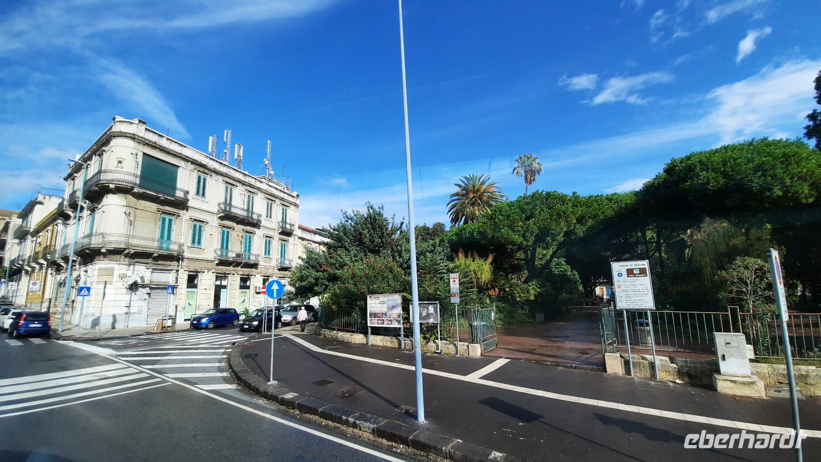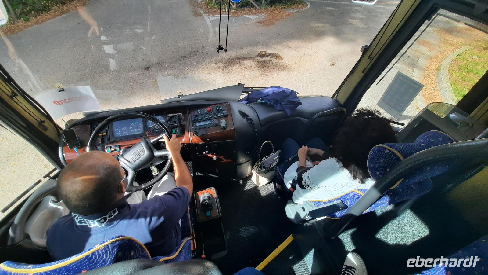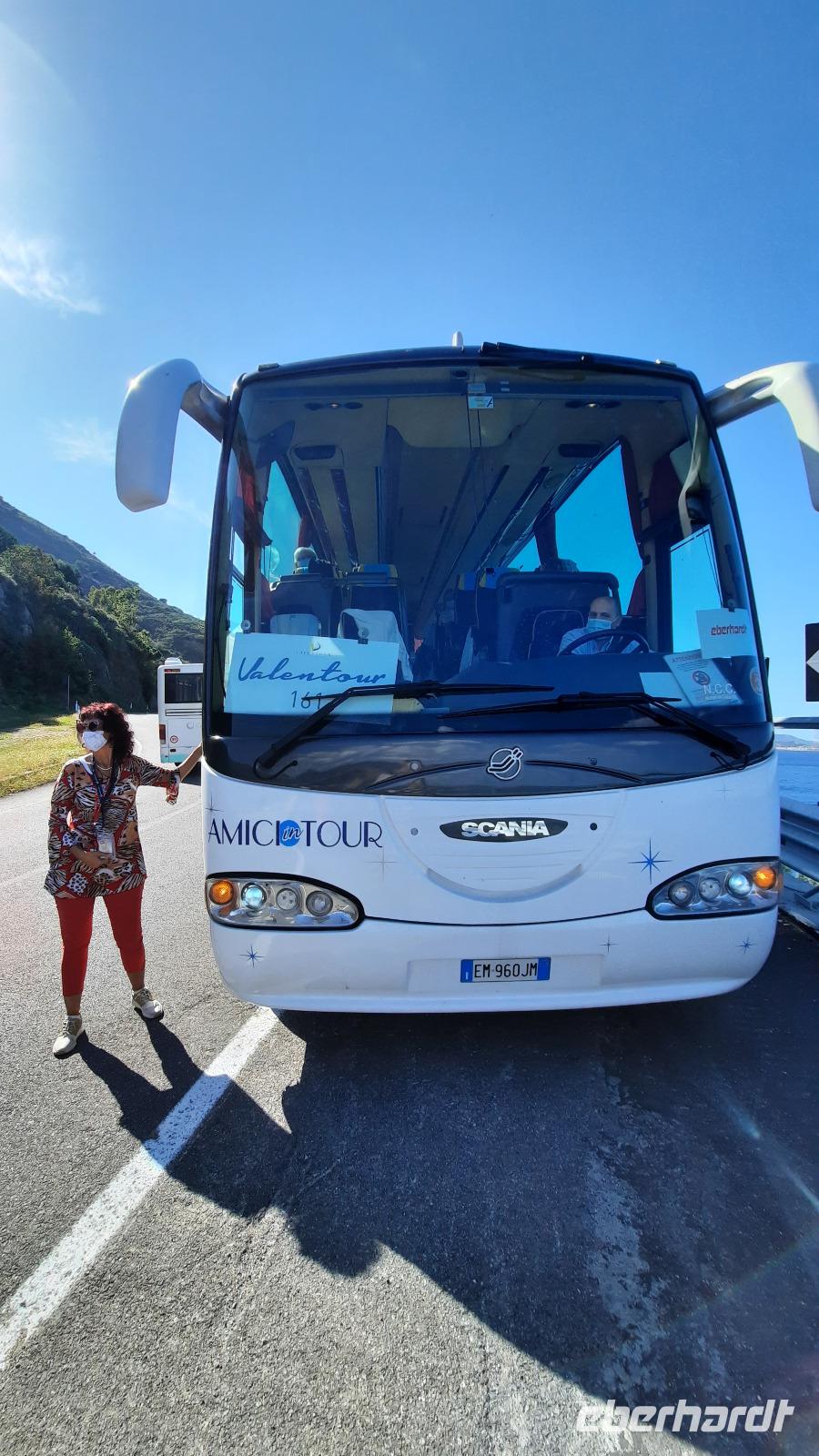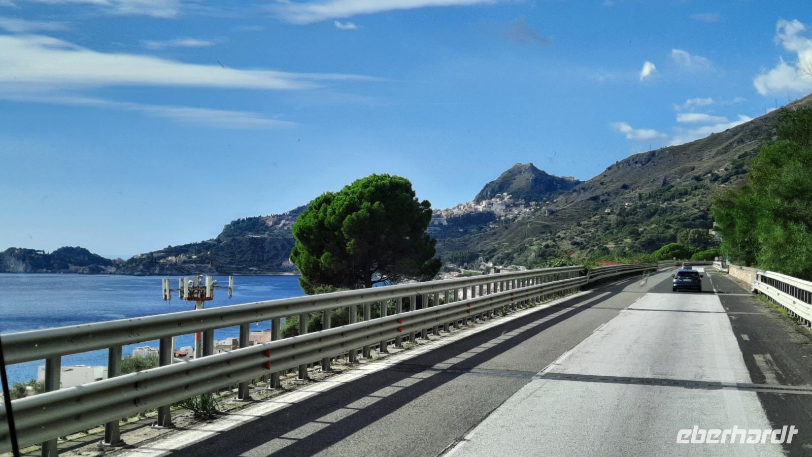 Der Tag begann sehr zeitig für uns, da wir eine lange Strecke vor uns hatten. Wir fuhren Richtung Süden nach Reggio Calabria und erhaschten immer wieder tolle Ausblicke auf das morgendliche Mittelmeer und Kiwi- und Orangenplantagen. Während der Fahrt erzählt uns Claudia mehr über Schule, das Schulsystem, verschiedene Schularten und wie das mit dem Schulbus funktioniert. Und natürlich auch von ihrer Schwiegermutter. Unsere örtliche Reiseleiterin ist gebürtige Schweizerin und mit einem Calabresen verheiratet. Natürlich prallen da ein paar kleine Welten aufeinander. Das Leben der Calabresen ist sehr traditionell und das Familienleben ist sehr wichtig. Wir fahren über die zweithöchste Brücke Italiens und sehen Messina. Wir überquerten die Straße von Messina mit der Fähre und konnten sogar ein Kreuzfahrtschiff der Reederei MSC im Hafen entdecken. Willkommen auf Sizilien, der Sonneninsel und dem Tor zum Orient. Nachdem wir die Hügelstadt Taormina erreichten, zeigte uns Claudia bei einem gemeinsamen Rundgang die Schönheiten des Ortes. Wir erkundeten den Botanischen Garten und konnten sogar die weltgrößte Jacht in der Bucht liegen sehen. Der Ätna allerdings versteckte sich immer wieder in einem Wolkenkranz. Nur wenige Momente ließ er uns einen Blick auf den schneebedeckten Gipfel erhaschen. Nach dem Rundgang konnte jeder individuell Taormina erkunden, Essen gehen, Kaffee trinken oder das berühmte römisch-griechische Theater besuchen. Als eines der wichtigsten Touristenzentren Siziliens, war der Ort erschreckend leer. Diejenigen unter uns, die bereits Taormina vor Corona besucht haben, erkannten den kleinen Ort nicht wieder. Keine Massen drängten sich durch die Gassen und man bekam, wo immer man wollte, einen Platz in den Restaurants. Vergnügt vom Erlebten, trafen wir uns am Nachmittag am vereinbarten Treffpunkt und traten die Rückreise mit Fährüberfahrt in Messina und Fahrt durch die Obstplantagen bis nach Tropea an.