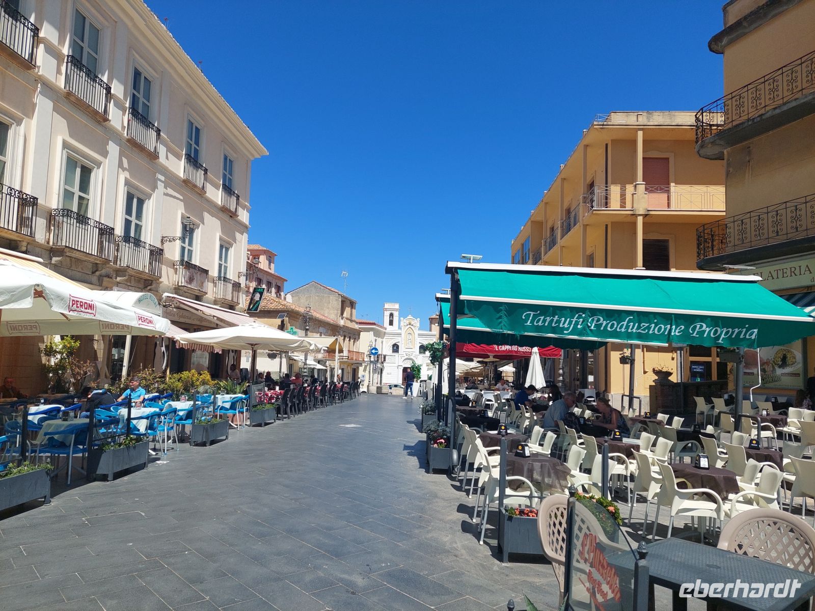 Unser Busfahrer hat uns eine Bar reserviert und Aperitifo bestellt, das sind kleine Häppchen und ein Getränk nach Wahl. Wir genießen die kalabrischen Spezialitäten und anschließend lädt uns Eberhardt Reisebegleitung Peggy noch auf eine Kostprobe von Tartufo ein.