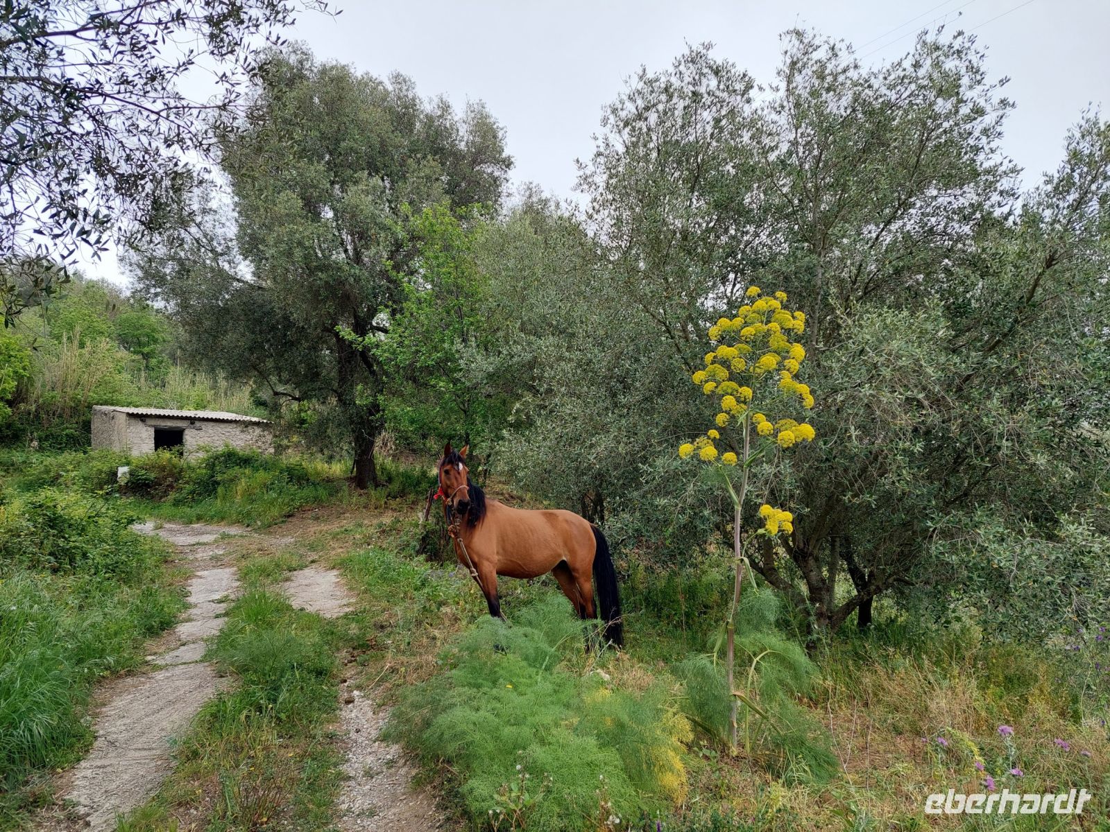 Fast in der Höhe des Sant’Elia angekommen bringt diese Wanderung einige Abenteuer mit sich, wir treffen auf Pferde, erst angeseilt, dann aber überholen uns zwei Kräftige auf freier Flur.