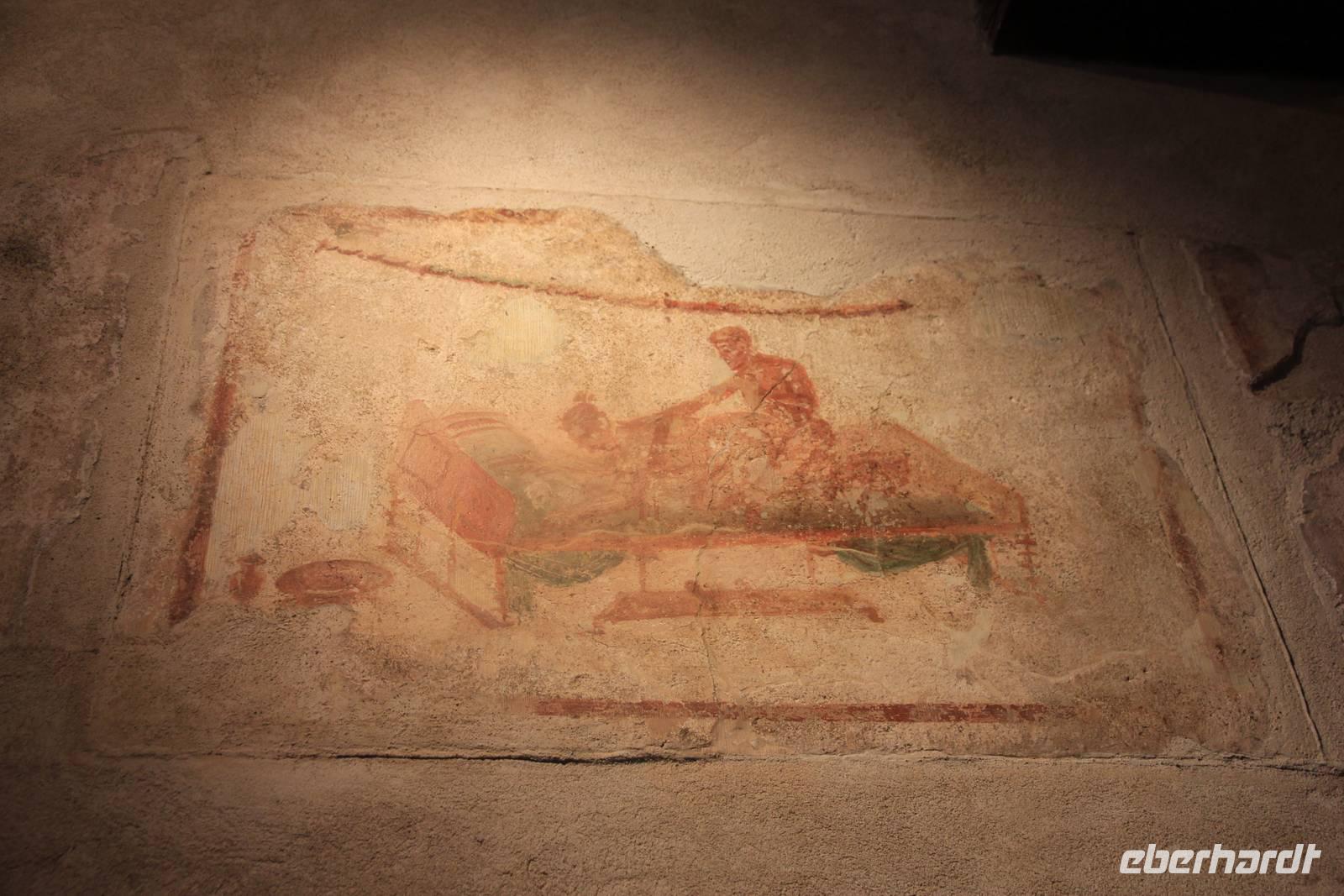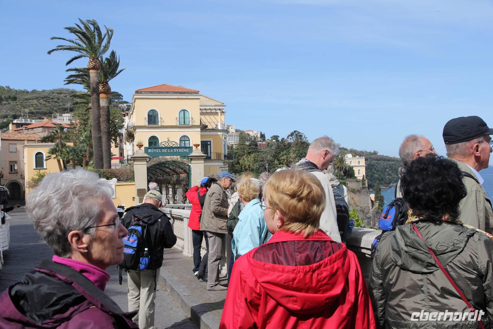 Von den Flughäfen Dresden, Leipzig und Hamburg fliegen wir - gestärkt von einem Frühstücks-Snack - in den frühen Morgenstunden mit Lufthansa-Maschinen nach München, wo wir uns alle treffen und gemeinsam den Flug den Neapel antreten. Fast alle Reisenden kennen sich schon von besonderen Rundreisen auf Zypern, durch Andalusien und Marokko. Das Besondere der vor uns liegenden Reise ist ein dreitägiger Aufenthalt auf Capri, um diese Insel in all ihren Facetten kennenlernen zu können und nicht nur mit einem Tagesauflug zu streifen. Vorerst geht es aber erst zu einem Wander- und Besichtungsprogramm auf der sorrentinischen Halbinsel. In Neapel erwarten uns der ersten Sonnenstrahlen nach dem langen und dunklen Winter in der Heimat und unsere Reiseleiterin Esther. Unsere erste Station ist Pompeji: Nach einer Mittagessenspause durchwandern wir mit Angelo die im Jahre 79 unter Vulkanasche versunkene römische Stadt. Angelo macht uns sachkundig mit den an den Ausgrabungen ablesbaren Lebensverhältnissen in der Antike bekannt. Über drei Stunden durchstreifen wir die eindrucksvollen Überreste des Amphitheaters, des Odeions - eines damals überdachten Theaters mit 1000 Sitzplatzen -, des Venus-Tempels, der Basilika, des Apollon-Tempels, einer Therme. Überrascht sind wir von den Wohnhäusern der Pompejaner, ihrer Funktionalität und den gut erhaltenen und doch so ungeschützten Fresken. Anschließend fahren wir noch eine Stunde auf den „Rücken" der Monte Lattari, der sorrentinischen Halbinsel, nach Agerola. Das Grand Hotel S. Orsola empfängt uns mit der untergehenden Sonne und einem traumhaften Blick auf die über 600 Meter unter uns liegende Küste von Amalfi, Atrani, Conca dei Marini und Praiano. Alle freuen sich über die schönen Zimmer und das weiß-saubere Ambiente unseres Hotels. An einer großen Tafel genießen wir gemeinsam ein reichliches Abendmenü und werden wir von Hotelchef Stefano herzlich willkommen geheißen. Nach dem langen Tag fallen wir dann aber todmüde ins Bett.