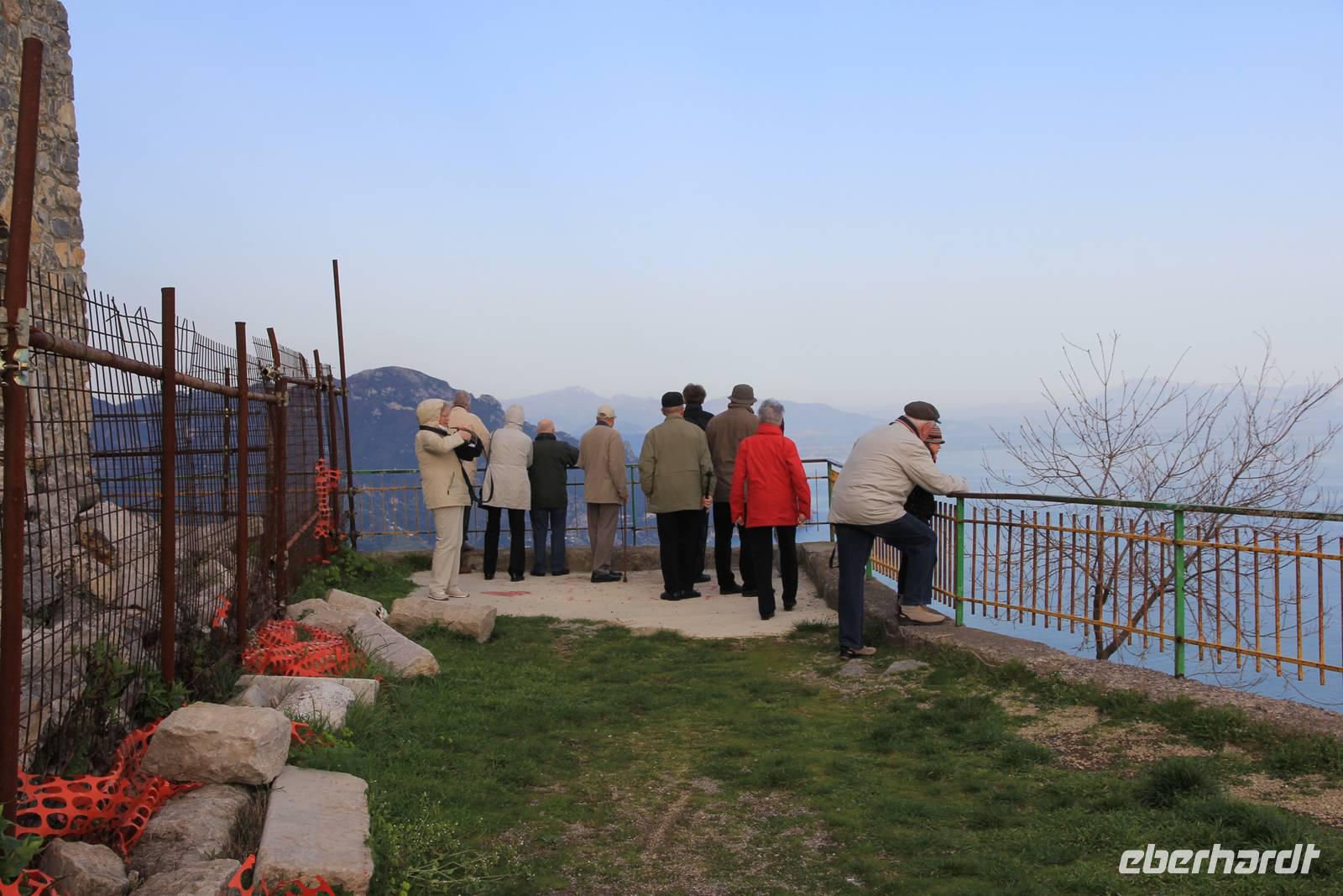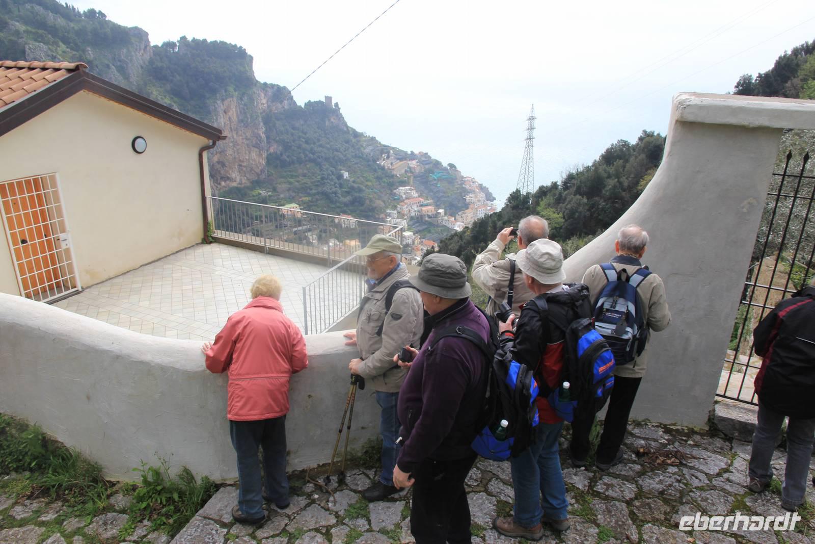 Heute steht ein erstes Wanderabenteuer auf dem Programm: Mit dem Bus geht es die Serpentinen von Furore zur Amalfitana hinunter und kurz vor Amalfi wieder in den höher gelegenen Ort Pogerola hinauf. Von dort steigen wir reichlich 300 Höhenmeter ins Valle die Mulini (Tal der Mühlen) herab, in dem über Jahrhunderte Büttenpapier geschöpft und von Amalfi aus in alle Welt verschifft und verkauft wurde. Der Weg führt über gut ausgebaute Treppen, erlaubt immer wieder tolle Blicke auf Amalfi und die vor der Stadt liegende Bucht. Vor den Resten einer bis vor wenigen Jahren noch betriebenen Papiermühle gibt es eine Stärkung mit Limoncello und Schokoladenkuchen, den Sylvia Lorenz dem Reisebegleiter-Duo Sophia und Uwe Lorenz mitgegeben hatte. Während die eine Hälfte der Gruppe den Treppenweg auf der anderen Seite des Tales ins Bergdorf Pontone wählt, entscheiden sich die anderen für den Spaziergang nach Amalfi, um mit dem Linienbus diese Strecke bewältigen zu können. Auf der kleinen Piazza des Bergdorfes Pontone vereinigen sich wieder Wanderer und Busfahrer, genießen wir die Sonne und stärken wir uns gemeinsam bei einem Picknick mit Käse, Wurst und Wein. Die Wanderer haben insgesamt eine Strecke von knapp 7 km zurückgelegt und zweimal ca. 250 Meter Höhenunterschied überwunden. Mit dem Bus kurven wir ins mondäne Ravello. Im Gelände der berühmten Villa Rufolo bestaunen wir den maurischen Hof der mittelalterlichen Palastanlage und von der Gartenterrasse haben wir einen herrlichen Blick auf das fast 400 Meter tiefer liegende Meer und die Küstenorte Minori und Maiori. Wir versuchen uns vorzustellen, wie hier Richard Wagner Inspiration für das Bühnenbild zu Klingsors Garten seiner Oper Parsival gefunden haben soll. Wir sind nicht zu spät zurück im Hotel. In der Abendsonne spazieren wir durch das ländliche Agerola zum Castello Lauritano, einer Festungsruine, die gerade restauriert wird. Wir haben von hier einen wundervollen Blick auf Amalfi und die Bucht von Salerno. Wir stoßen hier mit einem Gläschen Limoncello auf das sonnige Wetter an und wünsche uns noch weitere so schöne Tage. Den Tag beschließen wir mit einem Abendessen nehmen im urigen Restaurant des Pferdegestüts Casale Paradiso: Die Mama des Hauses hat vorzüglich gekocht und sorgt sich, dass es auch wirklich allen schmeckt.