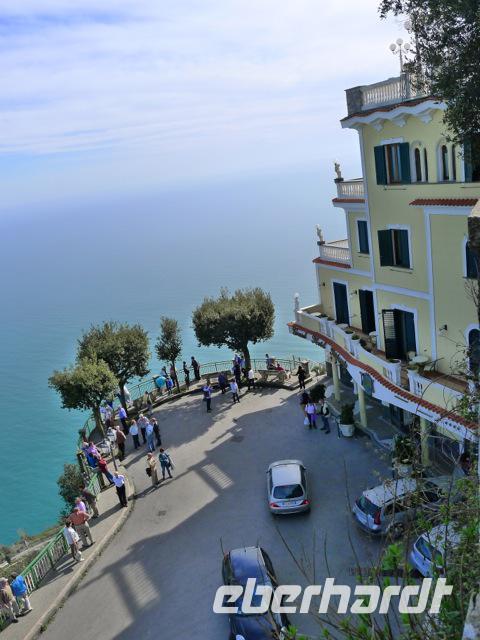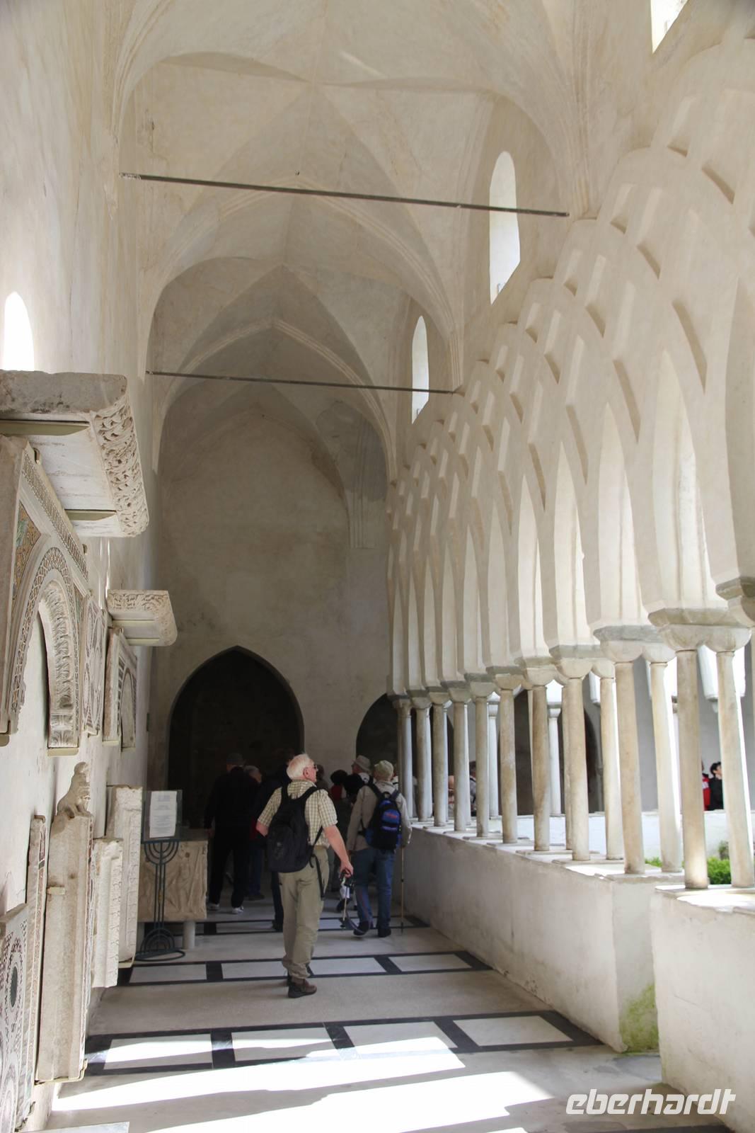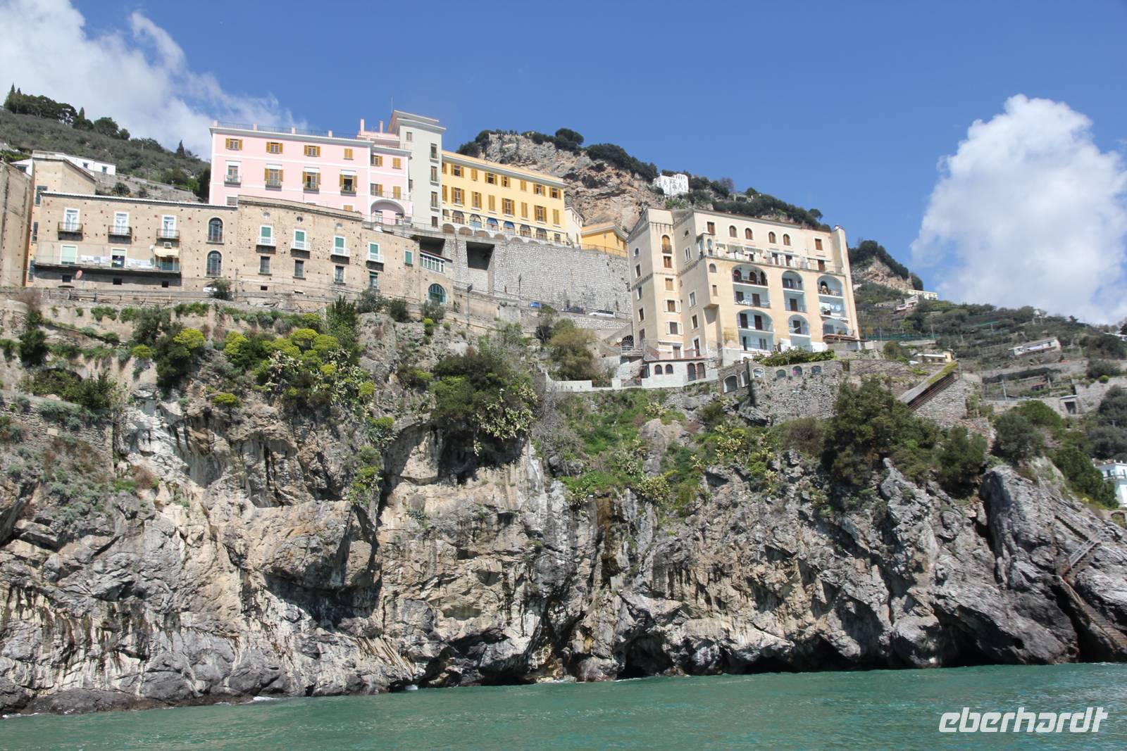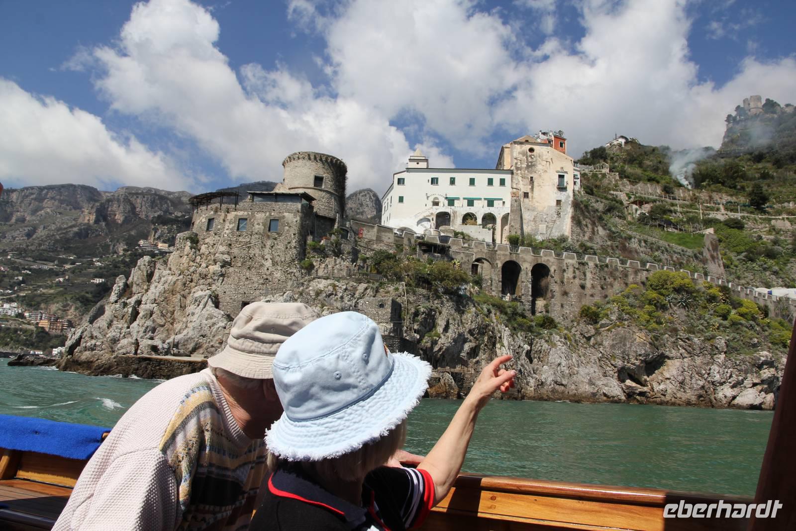 Bei schönstem Sonnenschein fahren wir Richtung Amalfi und besichtigen wir zuerst den Dom Sant' Andrea mit seinem maurisch anmutendem Kreuzgang des Paradieses (Chiostro del Paradiso), der Krypta, dem Aufbewahrungsort des Totenschädels des Heiligen Andreas. Aufgrund des hohen Seegangs können wir nicht das Boot bis Positano fahren lassen, beschränken wir uns bei der Bootsfahrt auf jeweils kurze Abstecher in nordwestlicher bzw. südöstlicher Richtung von Amalfi aus. Wir bewundern vom Wasser aus die Villa von Sophia Loren und schauen auch weit hinauf zur Villa Cimbrone und zur Villa Rufolo von Ravello. Anschließend bummeln wir zu unserem Restaurant Lo Smeraldino, in dem wir auf der Terasse für uns Tische, eingedeckt mit Wasser und kühlem Weißwein, finden. Bei Pasta und Goldbarsch genießen wir die Sonne und den herrlichen Blick auf den Hafen und Stadt Amalfi. Endlich haben wir unsere lang ersehnten Frühling!