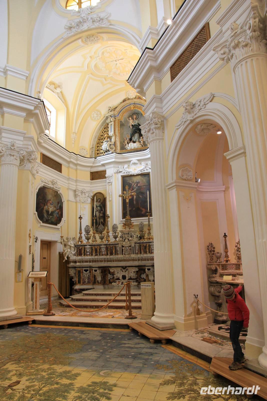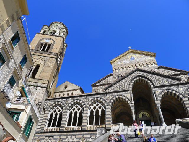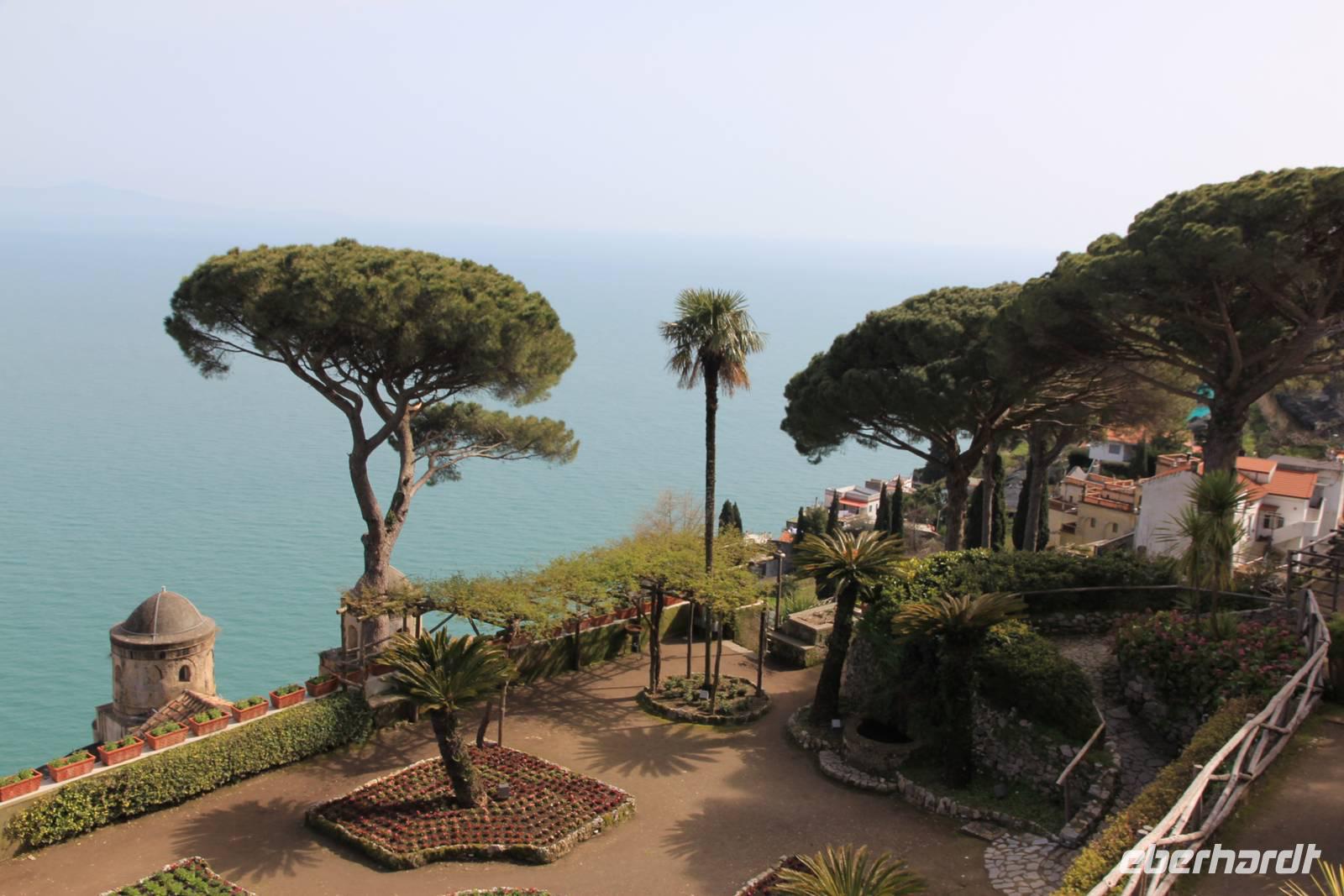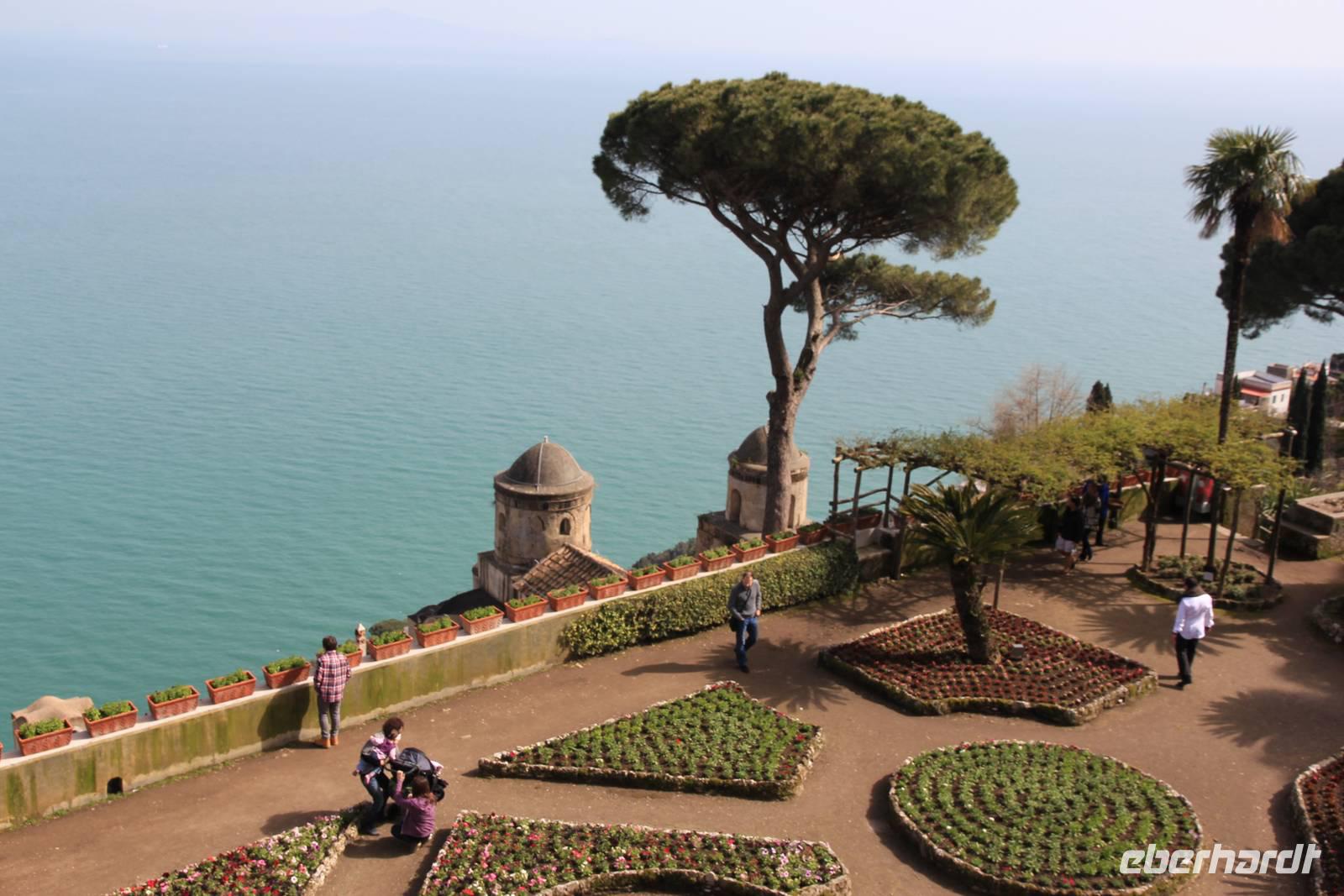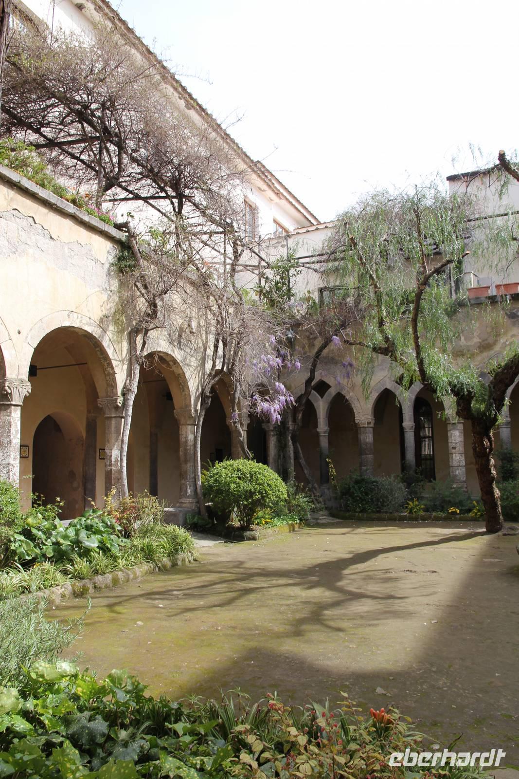 Bei schönstem Sonnenschein fahren wir Richtung Amalfi und besichtigen wir zuerst den Dom Sant' Andrea mit seinem maurisch anmutendem Kreuzgang des Paradieses (Chiostro del Paradiso), der Krypta, dem Aufbewahrungsort des Totenschädels des Heiligen Andreas. Aufgrund des hohen Seegangs können wir nicht das Boot bis Positano fahren lassen, beschränken wir uns bei der Bootsfahrt auf jeweils kurze Abstecher in nordwestlicher bzw. südöstlicher Richtung von Amalfi aus. Wir bewundern vom Wasser aus die Villa von Sophia Loren und schauen auch weit hinauf zur Villa Cimbrone und zur Villa Rufolo von Ravello. Anschließend bummeln wir zu unserem Restaurant Lo Smeraldino, in dem wir auf der Terasse für uns Tische, eingedeckt mit Wasser und kühlem Weißwein, finden. Bei Pasta und Goldbarsch genießen wir die Sonne und den herrlichen Blick auf den Hafen und Stadt Amalfi. Endlich haben wir unsere lang ersehnten Frühling!