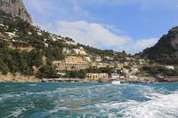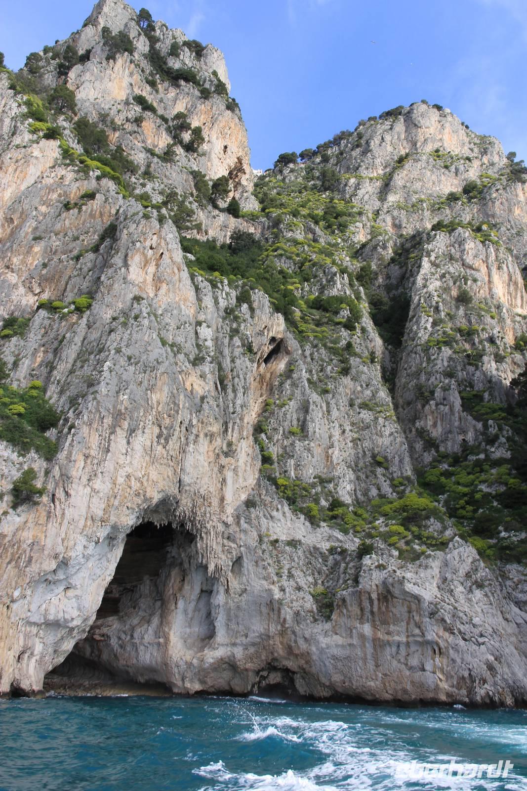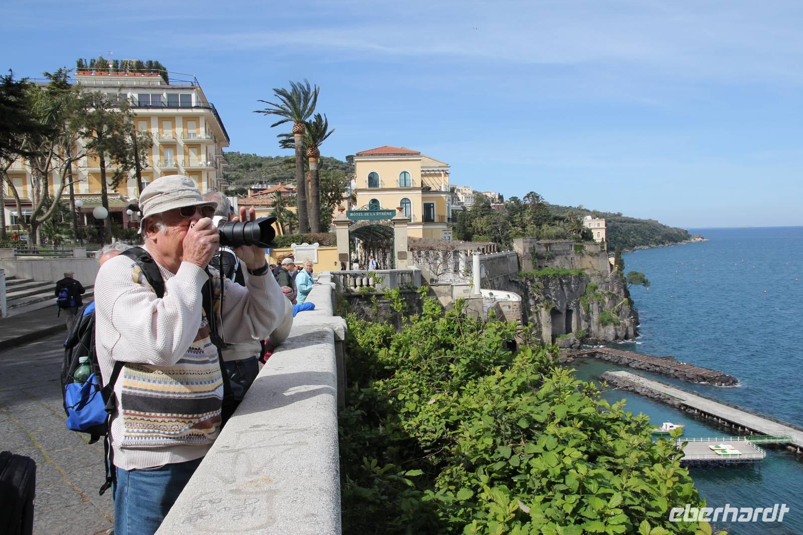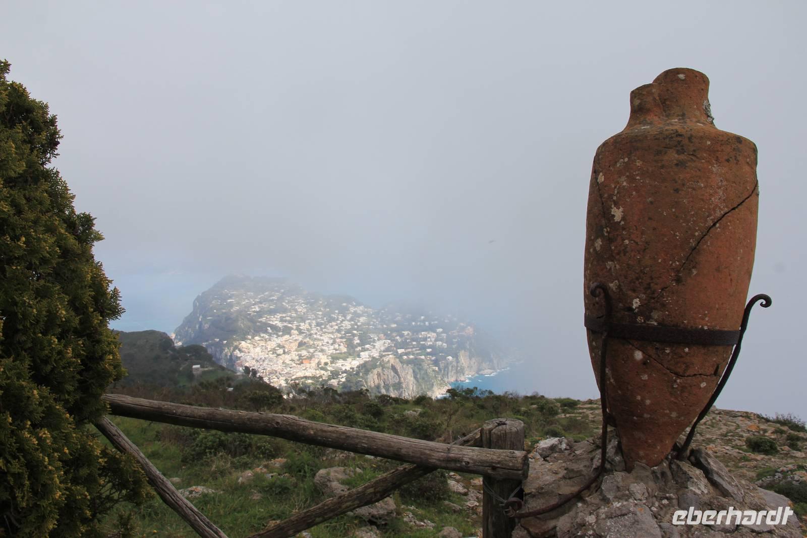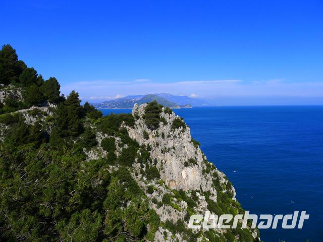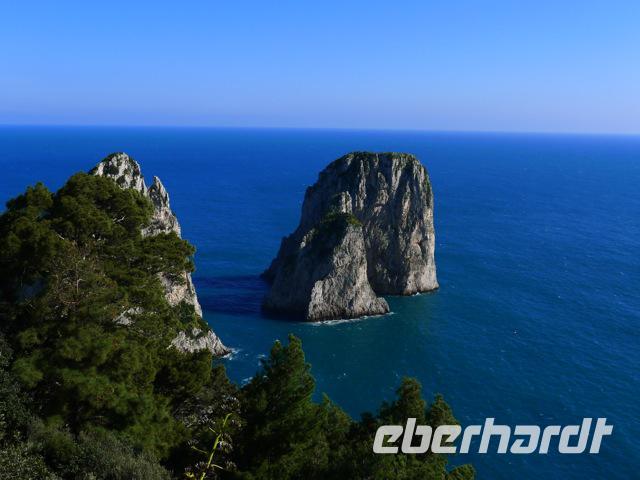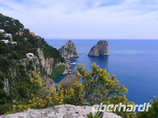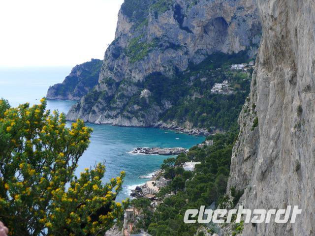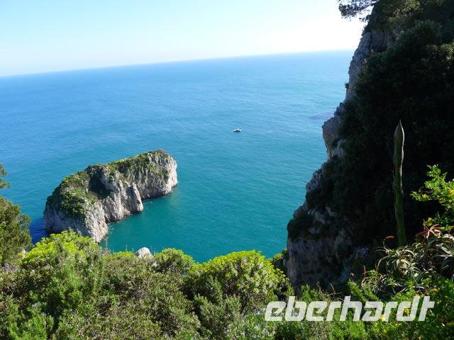 Das sonnige Wetter verführt uns zur Bootsfahrt um die ganze Insel. Vom Hafen Marina Grande geht es im Uhrzeigersinn an den Steilküsten von Capri entlang um die ganze Insel herum: Die schönsten Blicke - z.B. auf die Grotten Bianca und Matermania, die Villa Malaparte, die Faraglioni, zum Monte Solaro, den Leuchtturm Faro di Punta Carena und die Sarazenen-Wachtürme - werden mit den Fotoapparaten festgehalten. Die Blaue Grotte ist aufgrund der bewegten See nicht befahrbar. Wieder im Marina Grande angekommen, fahren wir wieder mit der Funicolare nach Capri-Stadt. Nach einem Gläschen Limoncello - diesmal gereicht in Tonbechern aus Amalfi, die wir als Souvenirs mit nach Hause nehmen können - teilen wir uns wieder in eine Wander- und eine Spaziergänger-Gruppe. Die Spaziergänger gehen mit Reisebegleiter Dr. Uwe Lorenz zum Belvedere di Tragera, genießen dort den Blick auf die Faraglioni und die südliche Inselküste, wandern dann an der deutschen evangelischen Kirche vorbei zur Certosa die S. Giacomo und wieder nach Capri Stadt. Die Wanderer begeben sich unter sachkundiger Führung von Esther auf den Weg zum Monte Tiberio und besichtigen die Villa Fersen und die Villa Jovis. Ein uriges Restaurant freut sich über die hungrigen Mittagsgäste. Dann geht es auf gut ausgebauten Wegen und über hunderte Treppen und immer wieder von überwältigenden Ausblicken unterbrochen zum Arco Naturale und von dort wieder nach Capri zurück. Diese Wanderung bei schönstem Wetter ist einer der Höhepunkte dieser Reise.