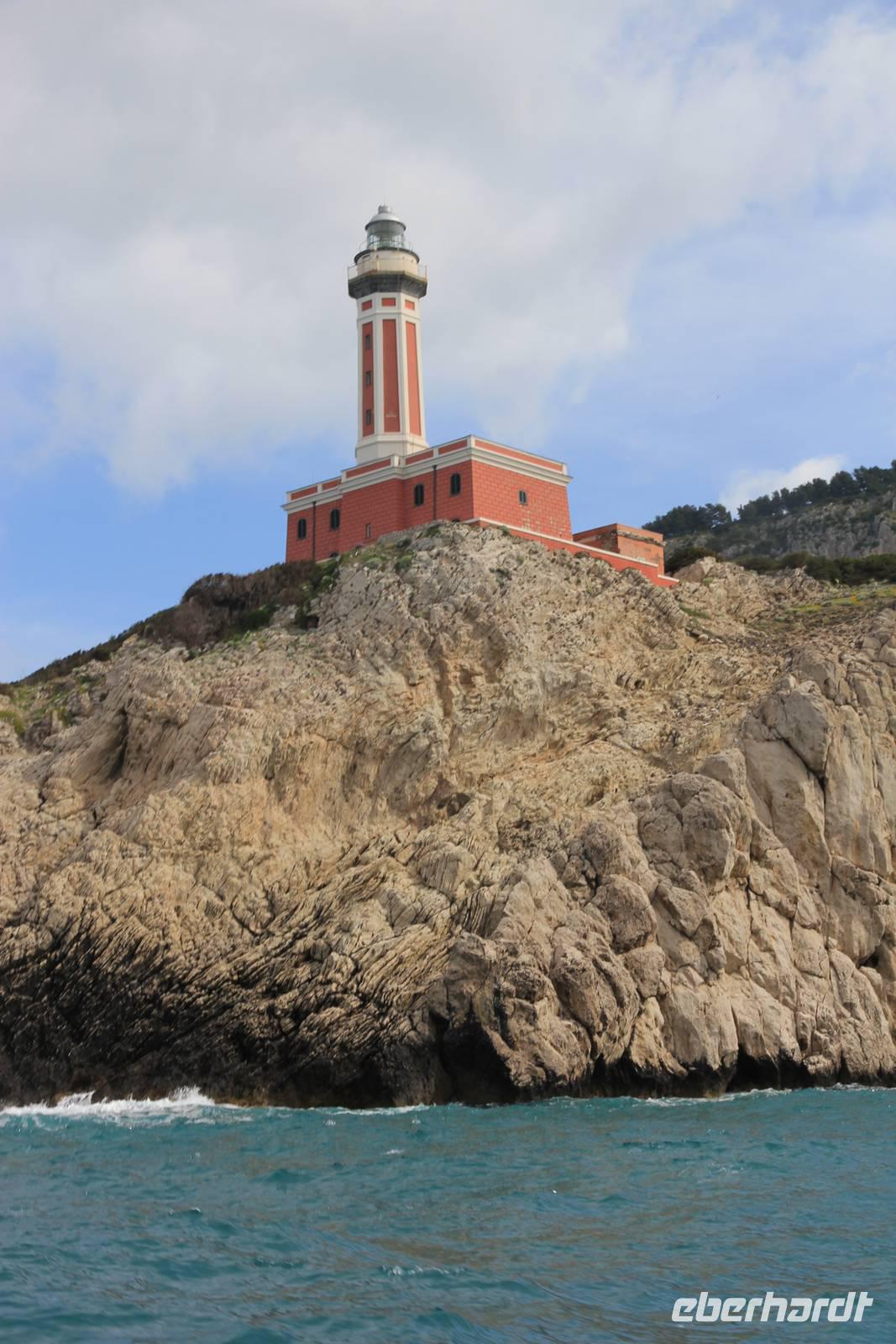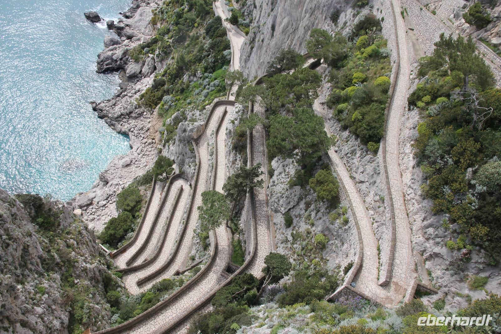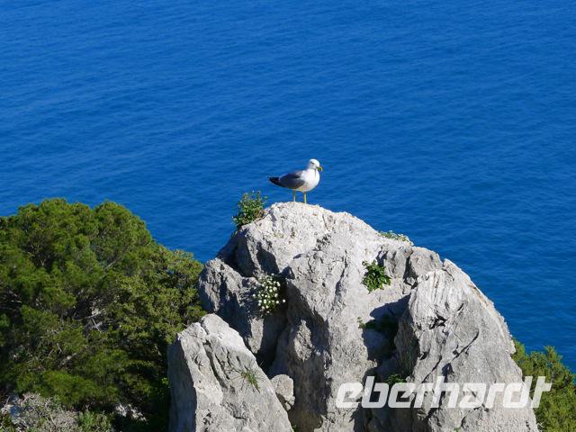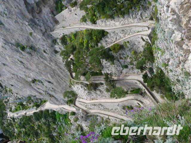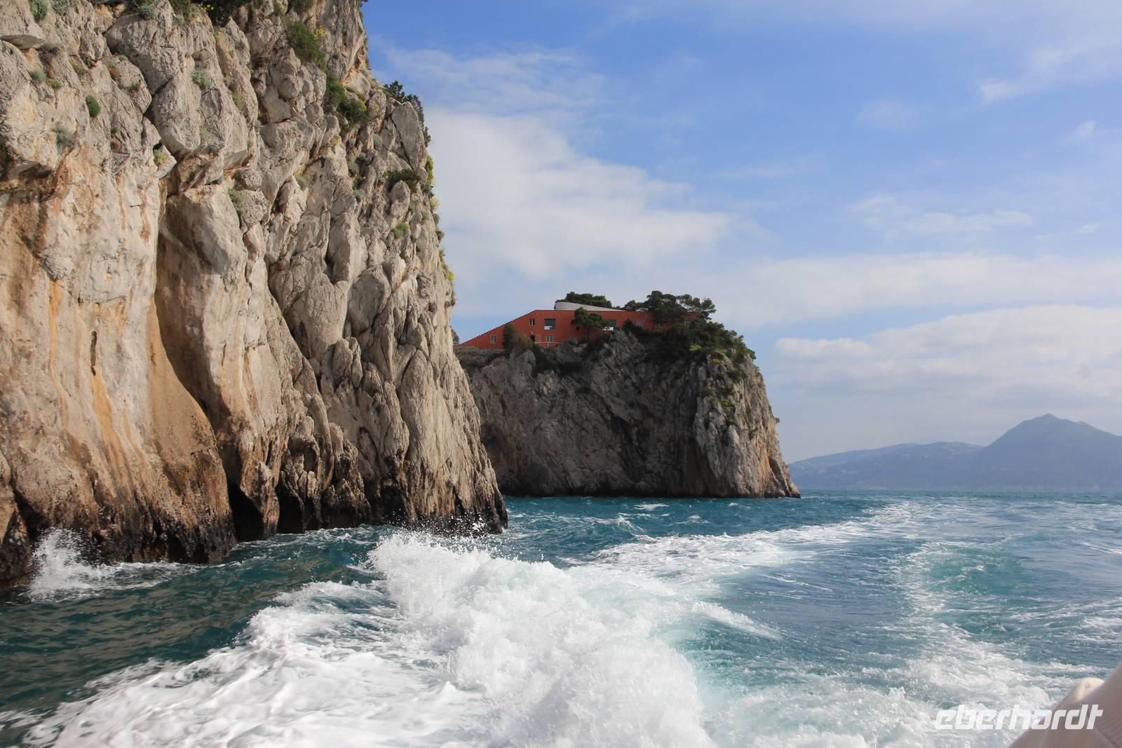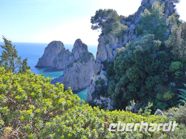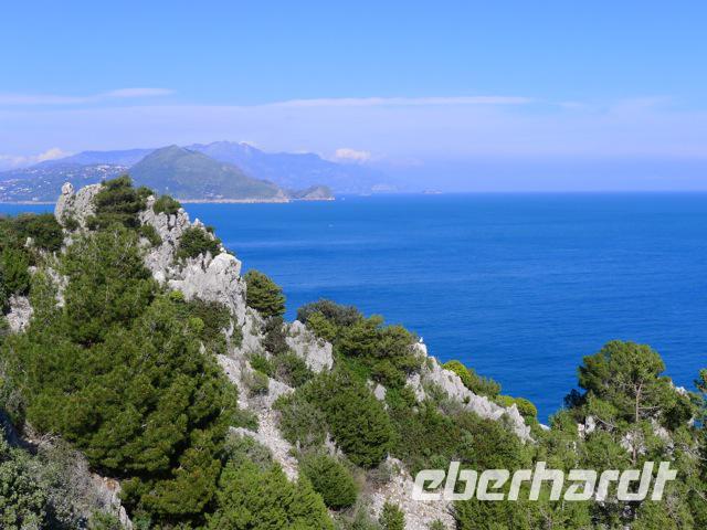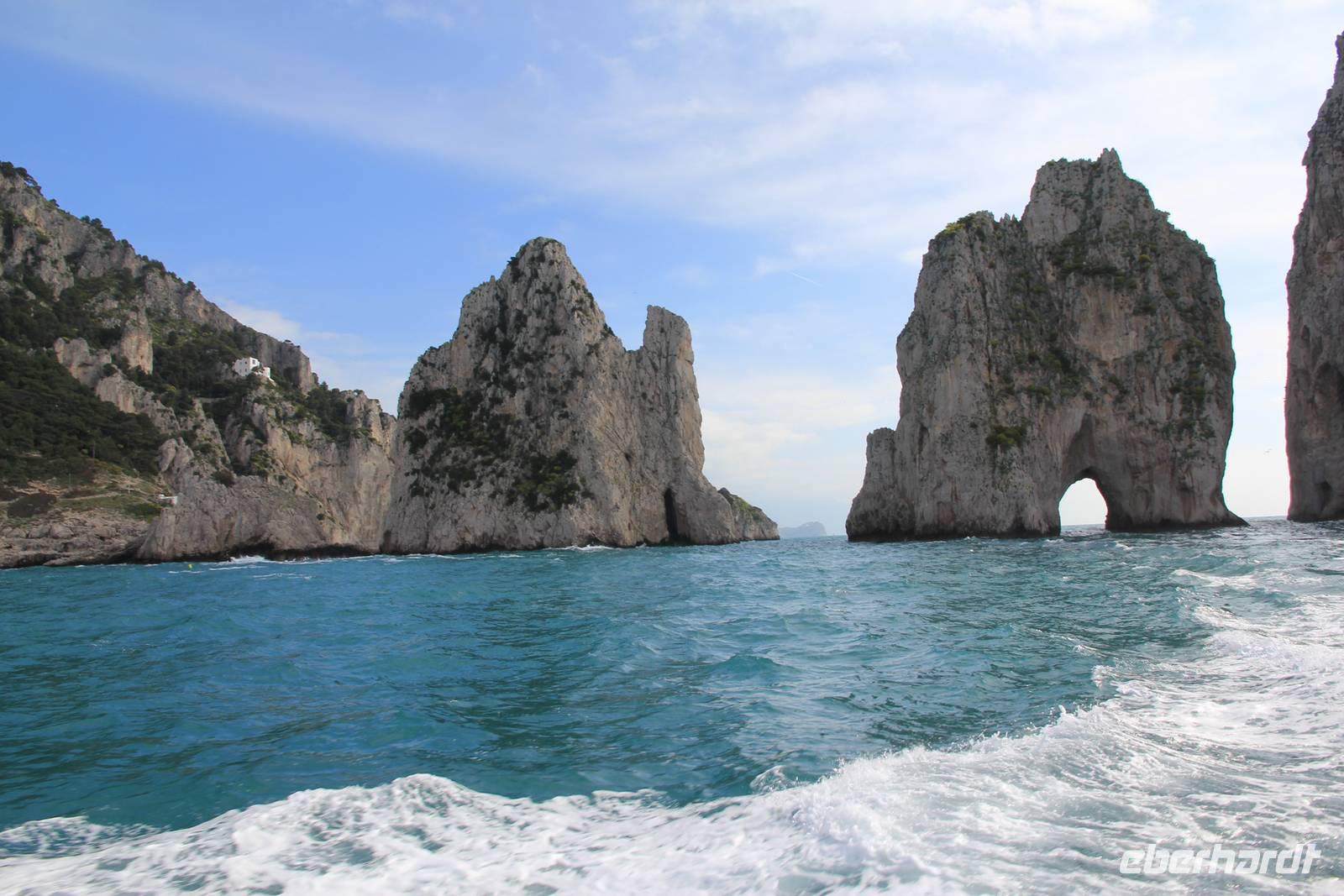 Das sonnige Wetter verführt uns zur Bootsfahrt um die ganze Insel. Vom Hafen Marina Grande geht es im Uhrzeigersinn an den Steilküsten von Capri entlang um die ganze Insel herum: Die schönsten Blicke - z.B. auf die Grotten Bianca und Matermania, die Villa Malaparte, die Faraglioni, zum Monte Solaro, den Leuchtturm Faro di Punta Carena und die Sarazenen-Wachtürme - werden mit den Fotoapparaten festgehalten. Die Blaue Grotte ist aufgrund der bewegten See nicht befahrbar. Wieder im Marina Grande angekommen, fahren wir wieder mit der Funicolare nach Capri-Stadt. Nach einem Gläschen Limoncello - diesmal gereicht in Tonbechern aus Amalfi, die wir als Souvenirs mit nach Hause nehmen können - teilen wir uns wieder in eine Wander- und eine Spaziergänger-Gruppe. Die Spaziergänger gehen mit Reisebegleiter Dr. Uwe Lorenz zum Belvedere di Tragera, genießen dort den Blick auf die Faraglioni und die südliche Inselküste, wandern dann an der deutschen evangelischen Kirche vorbei zur Certosa die S. Giacomo und wieder nach Capri Stadt. Die Wanderer begeben sich unter sachkundiger Führung von Esther auf den Weg zum Monte Tiberio und besichtigen die Villa Fersen und die Villa Jovis. Ein uriges Restaurant freut sich über die hungrigen Mittagsgäste. Dann geht es auf gut ausgebauten Wegen und über hunderte Treppen und immer wieder von überwältigenden Ausblicken unterbrochen zum Arco Naturale und von dort wieder nach Capri zurück. Diese Wanderung bei schönstem Wetter ist einer der Höhepunkte dieser Reise.