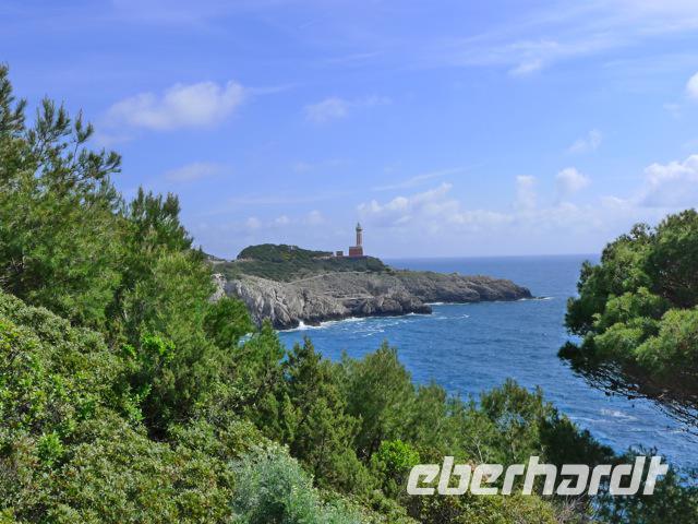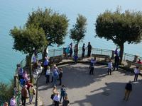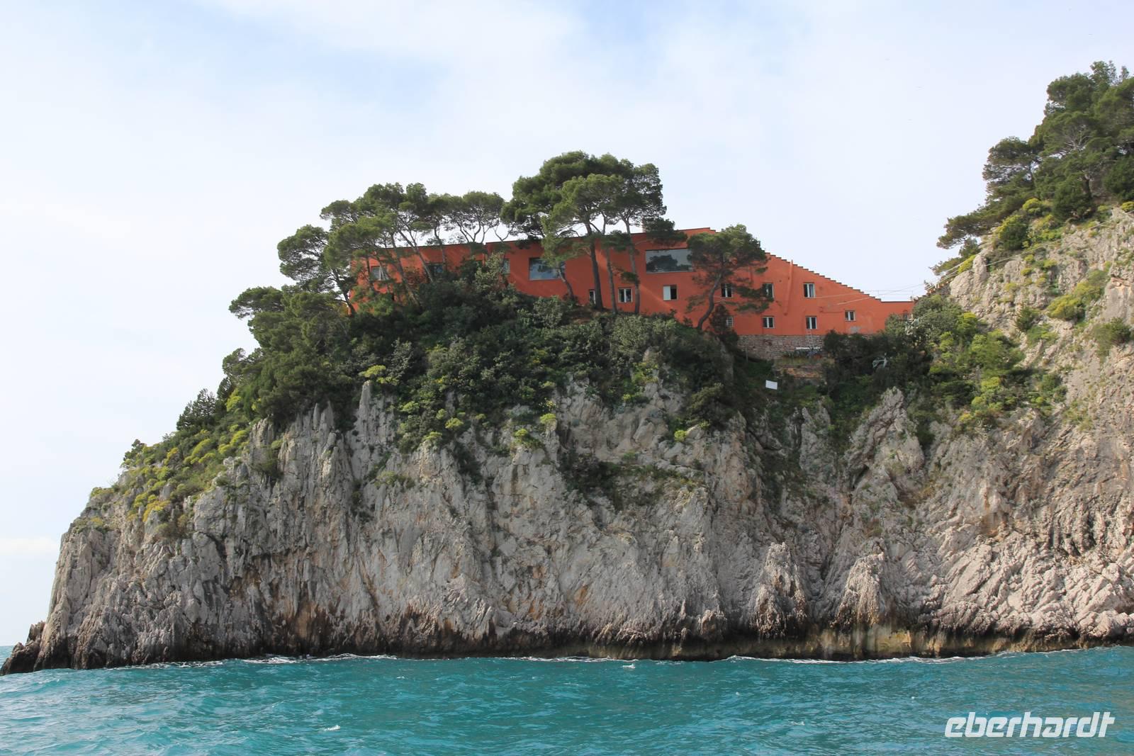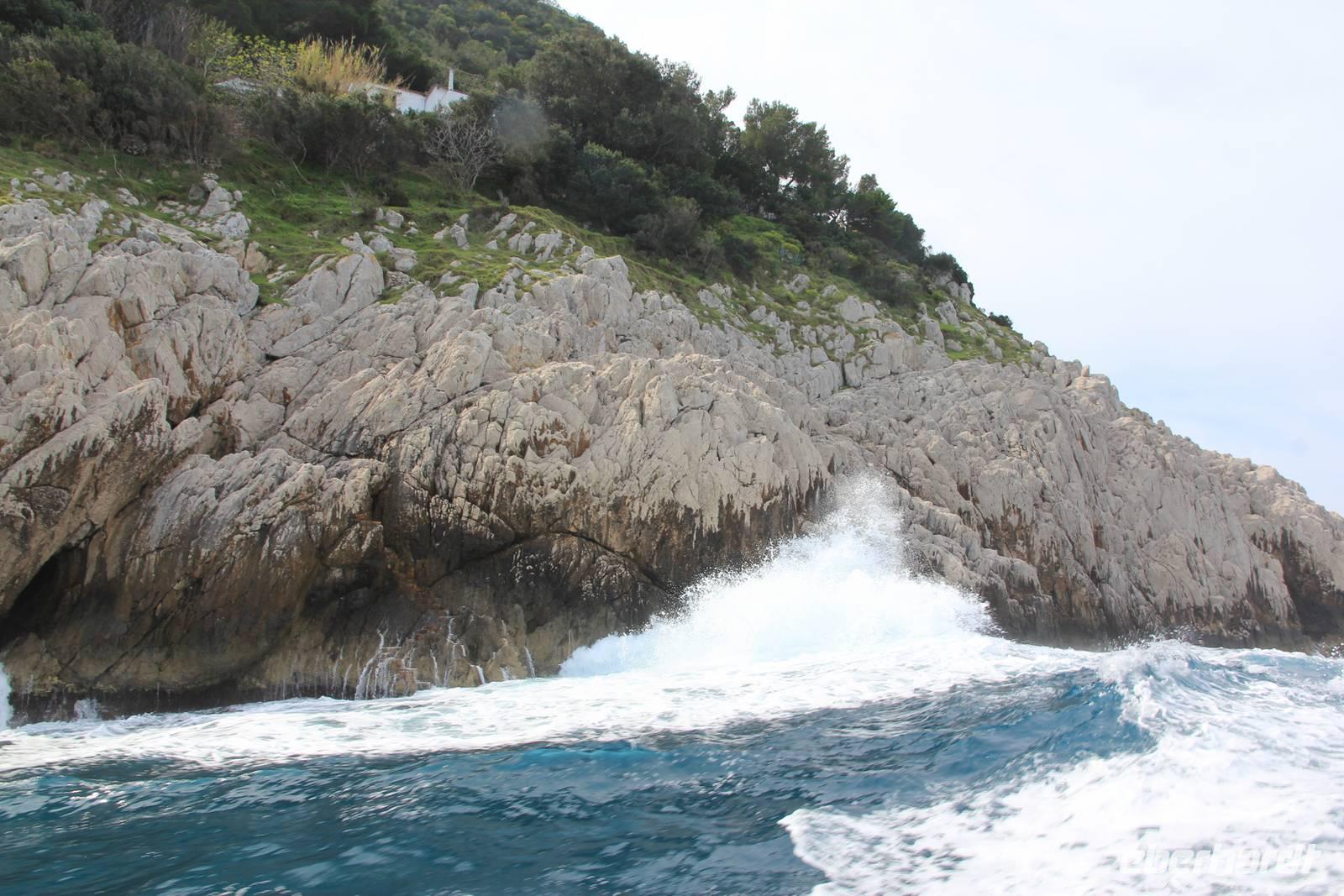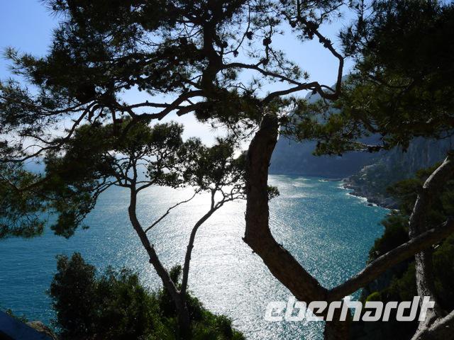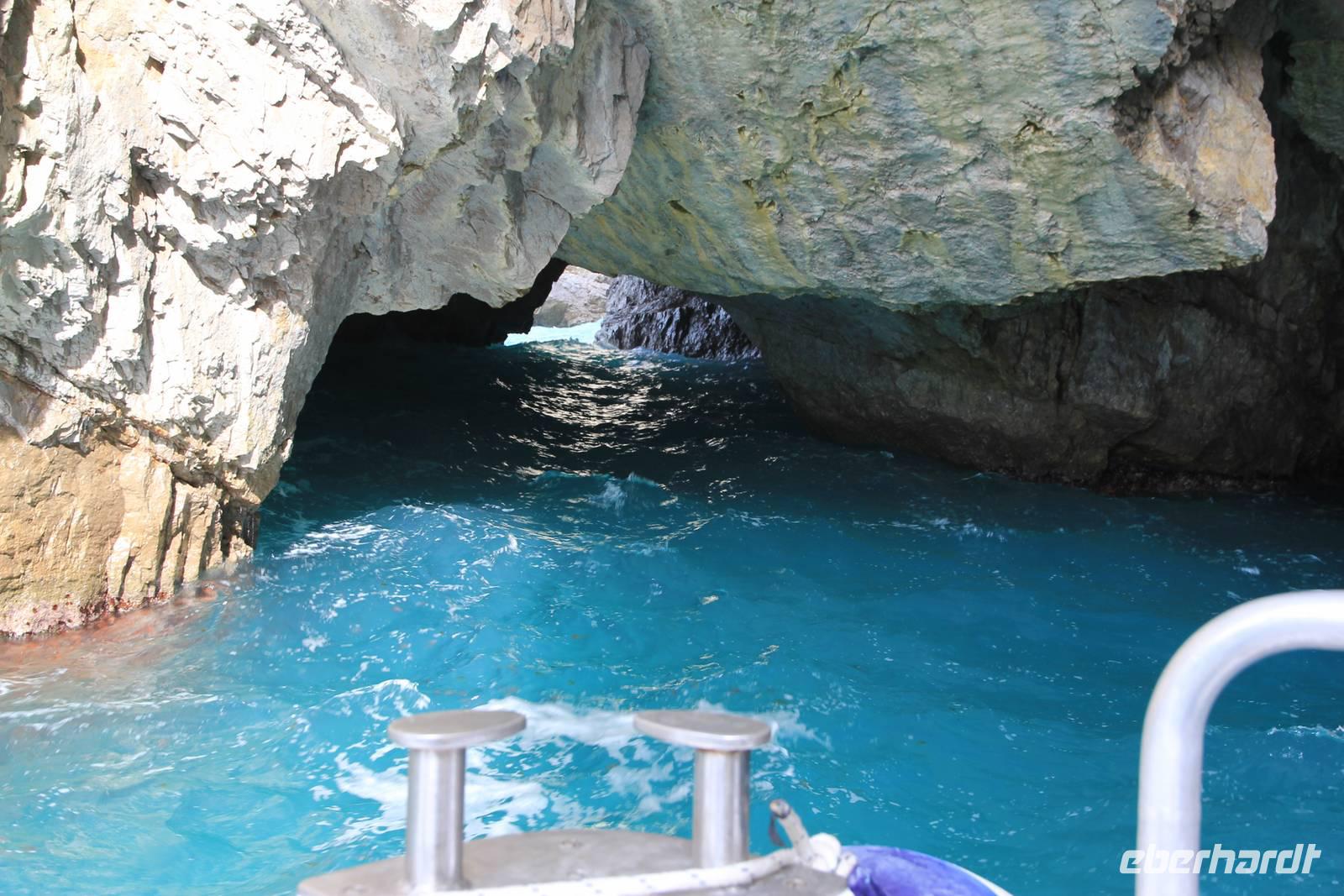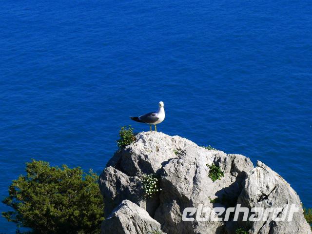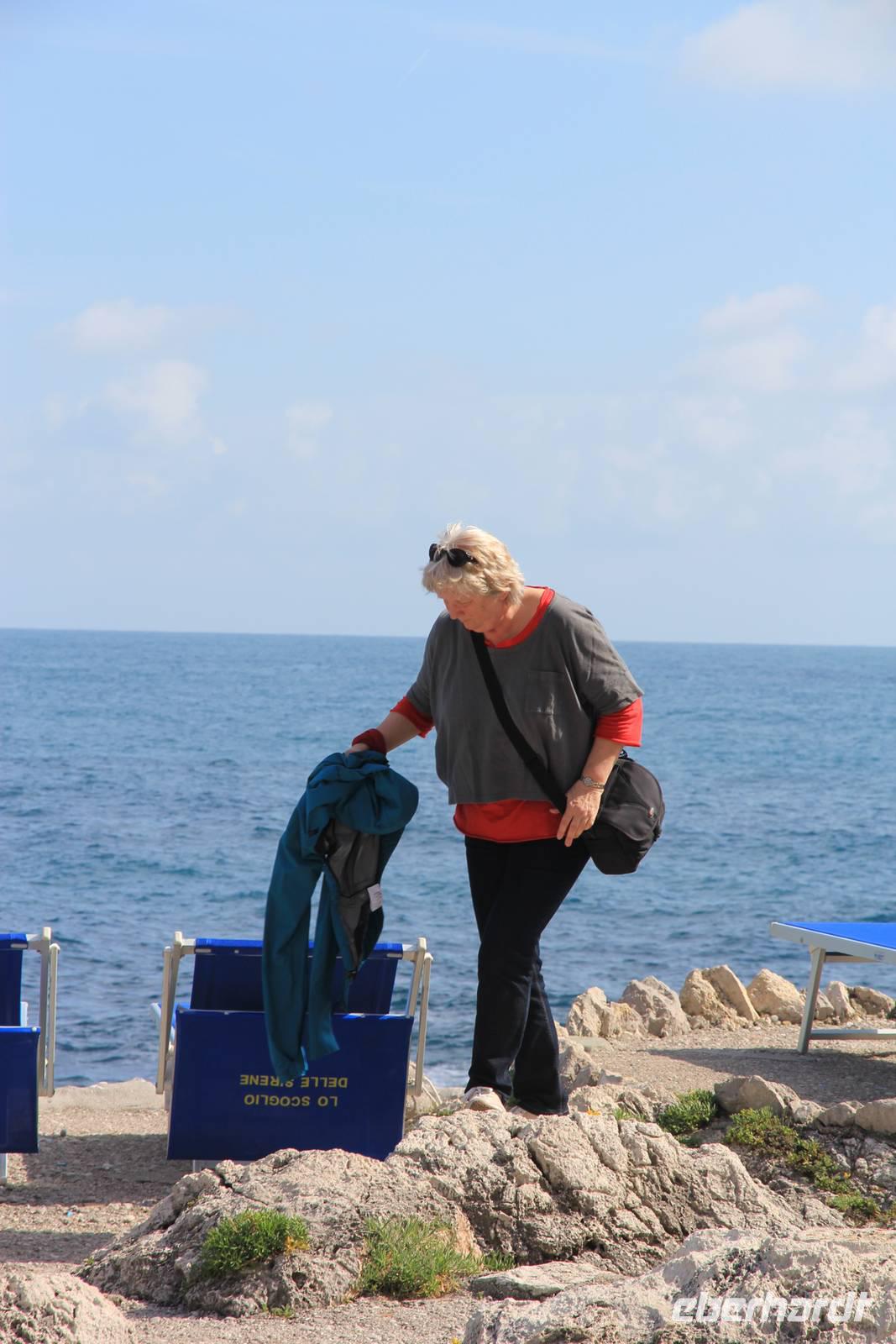 Das sonnige Wetter verführt uns zur Bootsfahrt um die ganze Insel. Vom Hafen Marina Grande geht es im Uhrzeigersinn an den Steilküsten von Capri entlang um die ganze Insel herum: Die schönsten Blicke - z.B. auf die Grotten Bianca und Matermania, die Villa Malaparte, die Faraglioni, zum Monte Solaro, den Leuchtturm Faro di Punta Carena und die Sarazenen-Wachtürme - werden mit den Fotoapparaten festgehalten. Die Blaue Grotte ist aufgrund der bewegten See nicht befahrbar. Wieder im Marina Grande angekommen, fahren wir wieder mit der Funicolare nach Capri-Stadt. Nach einem Gläschen Limoncello - diesmal gereicht in Tonbechern aus Amalfi, die wir als Souvenirs mit nach Hause nehmen können - teilen wir uns wieder in eine Wander- und eine Spaziergänger-Gruppe. Die Spaziergänger gehen mit Reisebegleiter Dr. Uwe Lorenz zum Belvedere di Tragera, genießen dort den Blick auf die Faraglioni und die südliche Inselküste, wandern dann an der deutschen evangelischen Kirche vorbei zur Certosa die S. Giacomo und wieder nach Capri Stadt. Die Wanderer begeben sich unter sachkundiger Führung von Esther auf den Weg zum Monte Tiberio und besichtigen die Villa Fersen und die Villa Jovis. Ein uriges Restaurant freut sich über die hungrigen Mittagsgäste. Dann geht es auf gut ausgebauten Wegen und über hunderte Treppen und immer wieder von überwältigenden Ausblicken unterbrochen zum Arco Naturale und von dort wieder nach Capri zurück. Diese Wanderung bei schönstem Wetter ist einer der Höhepunkte dieser Reise.