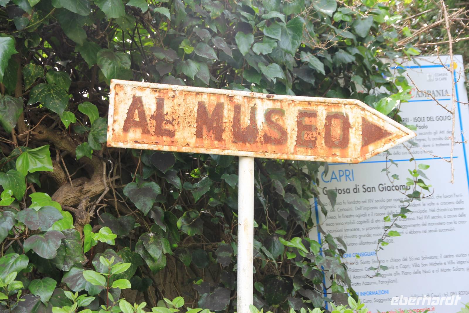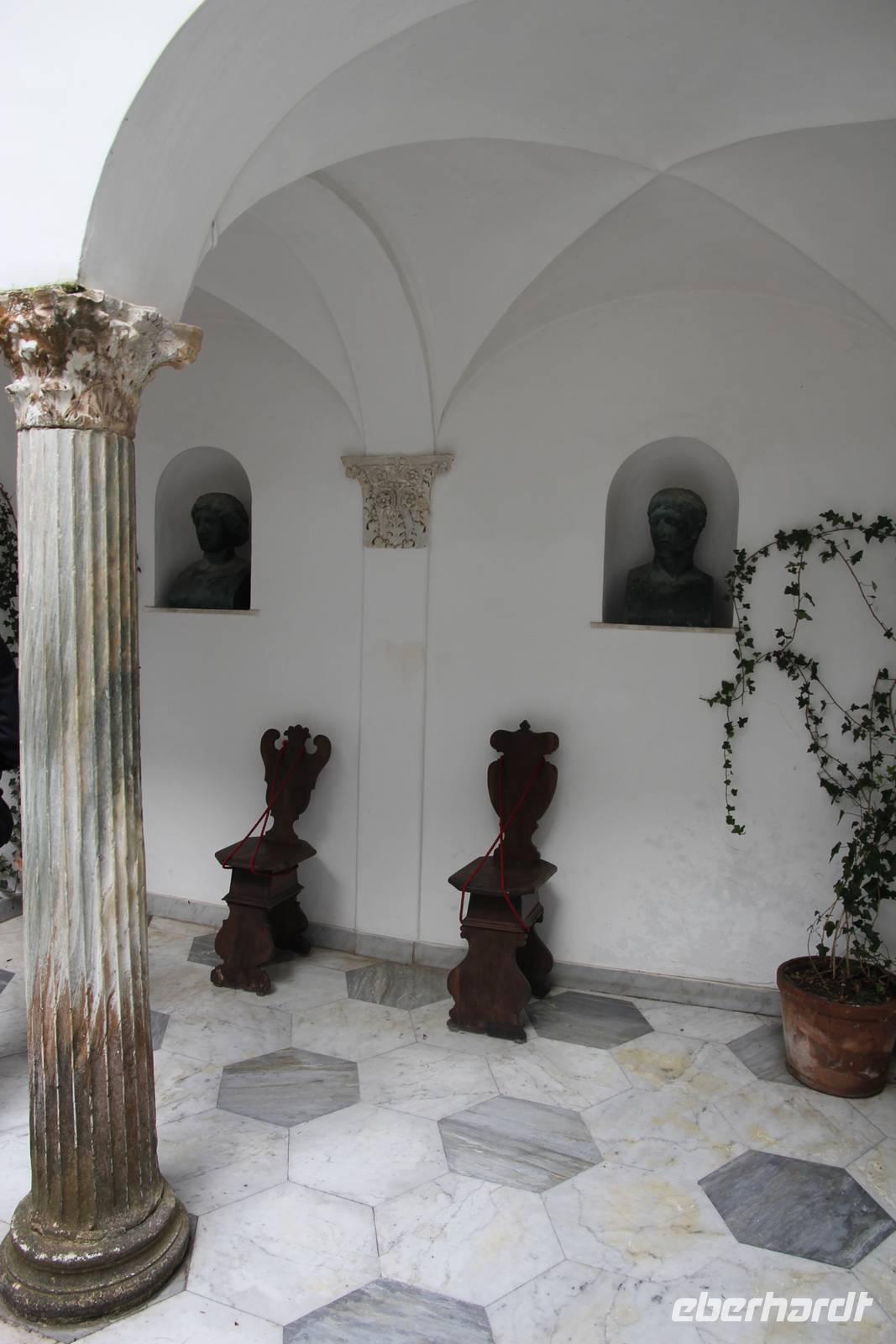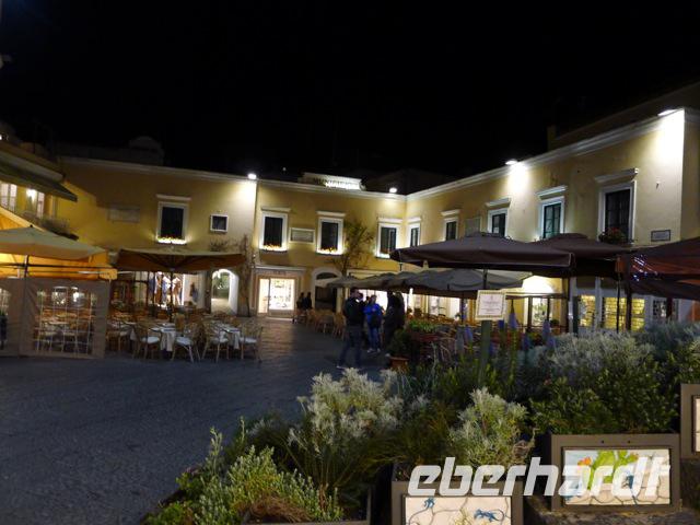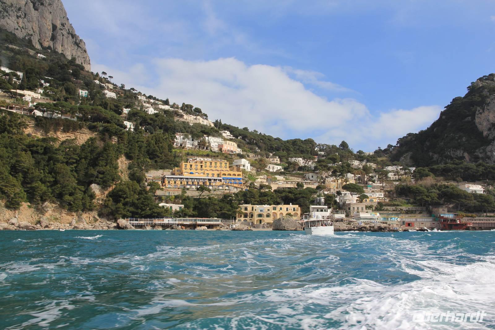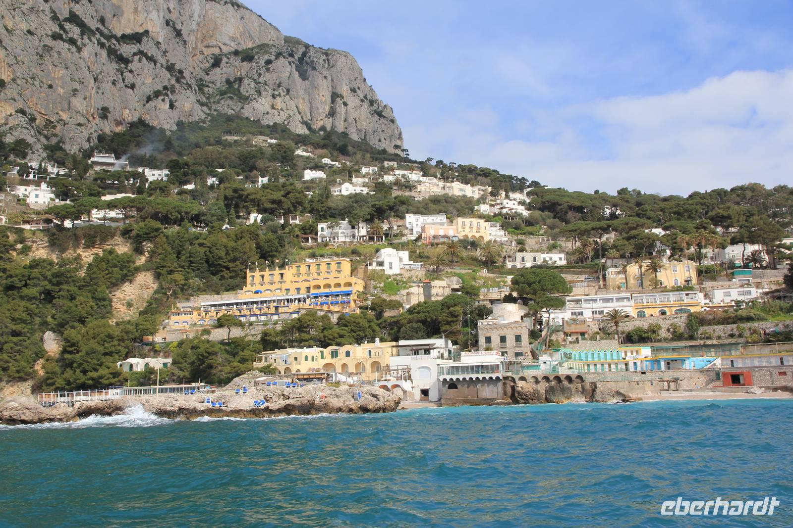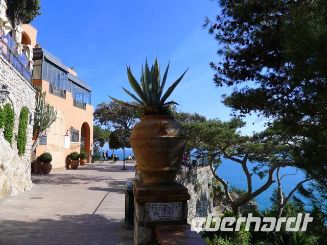 Wir nehmen Abschied von Agerola und machen uns auf den Weg nach Capri. Heute ist Sonntag und da erreichen wir ohne Staus die Innenstadt von Sorrent. Unser Gepäck wird etwas unsanft in einen Kleintransporter geladen, der es dann in den Hafen zur Abfahrt unserer Fähre bringt. Esther führt uns durch die Innenstadt: Piazza Torquato Tasso, auf antiken Grundmauern stehende Reste der mittelalterlichen Stadtmauer, Dom Santi Filippo e Giacomo, die Renaissance-Loggia Sedile Dominova, in der ältere Herren die Tagespolitik diskutieren, Konvent San Francesco u.a.. Vom Plateau über der Marina Grande haben wir einen schönen Blick auf den Golf von Neapel und den Fährverkehr ab/an Sorrent. Zu Fuß oder mit dem Fahrstuhl gelangen wir zum Hafen hinunter, nehmen wir unser Gepäck auf und besteigen wir unsere Fähre nach Capri. Nach einer reichlichen halben Stunde landen wir im Hafen Marina Grande der Unterstadt von Capri an, wird unser Gepäck verladen und bummeln wir zur Funicolare, die uns ins in die Oberstadt zur Piazzetta bringt. Uns umfängt sofort das geschäftige Treiben des Tagestourismus auf Capri. Nach wenigen Schritten sind wir aber aus dem Trubel raus und gelangen wir über eine Treppe und einen schmalen Weg zur unserem ruhig und wie in einem Garten gelegenen Hotel della Piccola Marina. Es dauert nicht lange, dann sind die Zimmer fertig, das Gepäck angekommen und wir können unsere großen und schön eingerichteten Zimmer beziehen. Fast alle kommen zu einem ersten Rundgang durch Capri mit: an den mondänen Geschäften vorbei, die aus Rücksicht auf unser Empfinden auf Preisschilder verzichten, gelangen wir zu den Augustus-Gärten (Giardini di Augusto), haben wir einen ersten Blick auf die Felseninseln Farglioni. Die Via Krupp ist aus Sicherheitsgründen nicht begehbar, dafür erzählt uns Esther von den Berühmtheiten, die in den letzten 150 Jahren Capri als Ort des Urlaubs und des Vergnügena oder der Konspiration und Inspiration genutzt haben: Alfred Krupp, Rainer Maria Rilke, Maxim Gorki, Lenin, Karl Wilhelm Diefenbach, Curzio Malaparte u.a. Am Abend dinieren wir vorzüglich im Restaurante Buca di Bacco: es gibt wie gewünscht Fisch.
