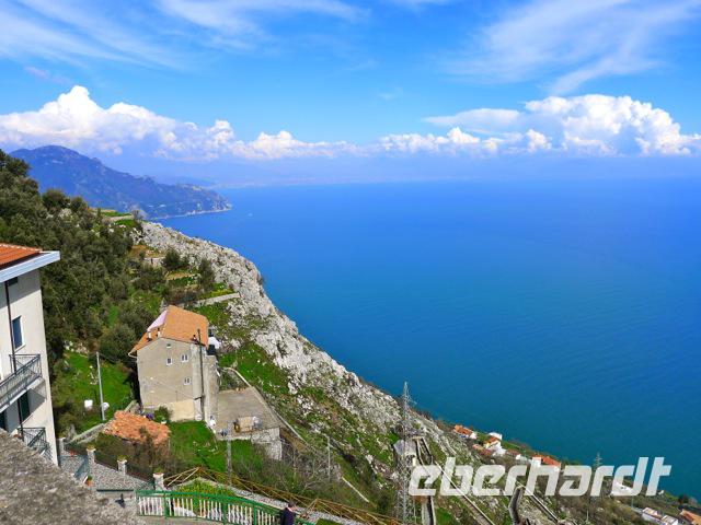 Der „Sentiero degli Dei" - der Weg der Götter - gilt als einer der schönsten Wanderwege im Süden Italiens. Die Wander-Freunde unter uns lassen sich nicht von dem undurchdringlichen Nebel abbringen und starten mit ihrer Wanderung in Bomerano-Agerola. Der Weg führt durch kleine Bergdörfer. Die Strecke verläuft auf nassen, teils schmalen, steil nach unten abfallenden Pfaden. Wir meistern steinige Auf- und Abstiege und warten nach jeder Kurve auf die Auflösung des Nebels, um die grandiosen Aussichten auf die unter uns liegende, traumhaften Amalfiküste genießen zu können. Das erleben wir aber erst zum Abschluss unserer Wanderung, als wir in urigen Berglokal La Tagliata in Montepertuso einkehren, in dem Ex-Kanzler Schröder bereits die herrliche Aussicht auf Positano genossen haben soll. Uns erwarten hier schon die Nichtwanderer und wir schlemmen hier Antipasti und reichlich gegrilltes Fleisch. Der Rotwein ist gut und regt unsere Gemüter an, wir plaudern über zwei Stunden am Mittagstisch. Wir steigen weiter ab oder kurven mit dem kleinen Linienbus hinunter, um in Positano noch Zeit für einen Einkaufsbummel zu haben. Mit dem Bus fahren wir dann am späten Nachmittag von Positano entlang der Amalfiküste bis zu unserem Hotel in Agerola. Wir lernen so den schönsten Abschnitt dieser Panoramastraße noch kennen.